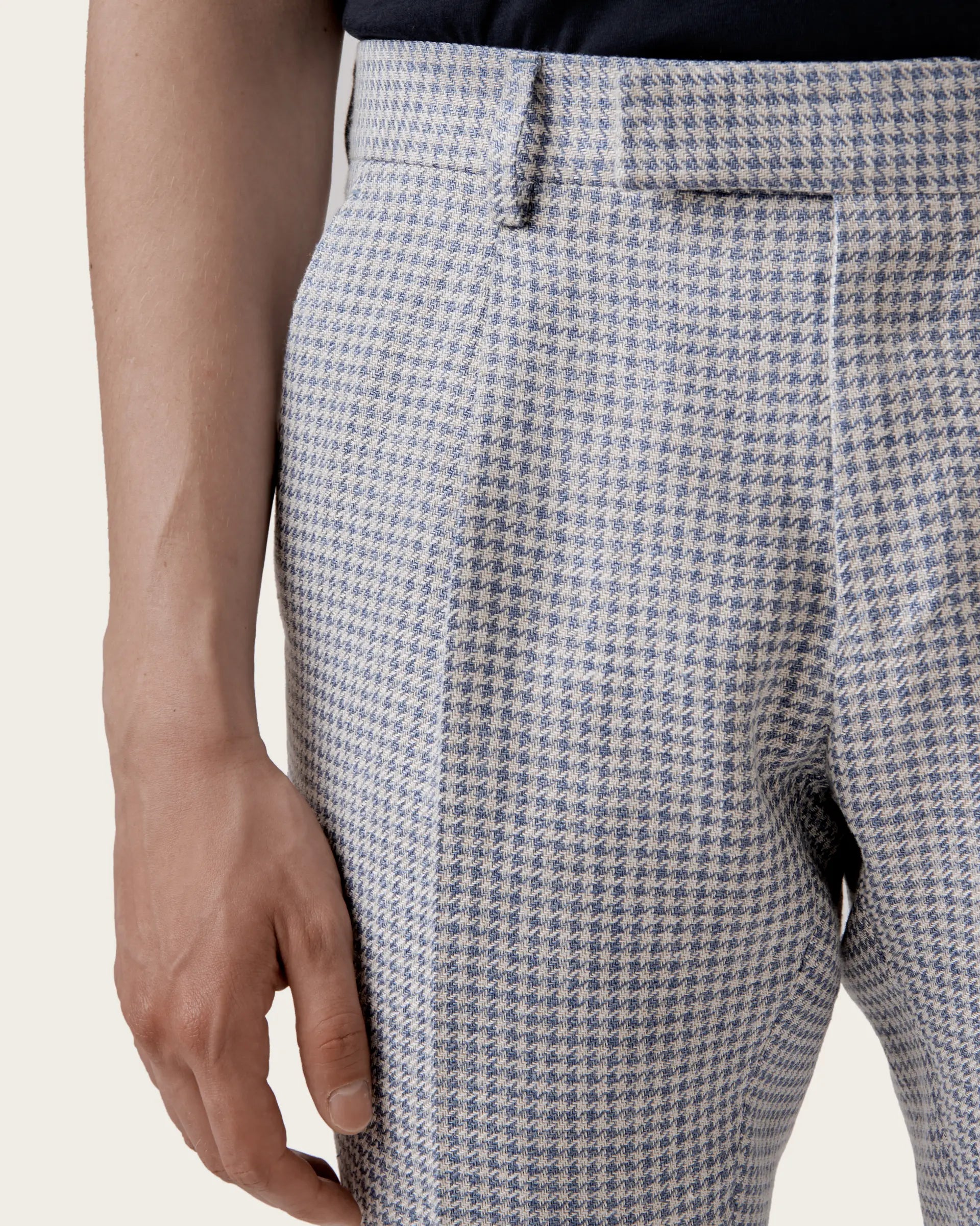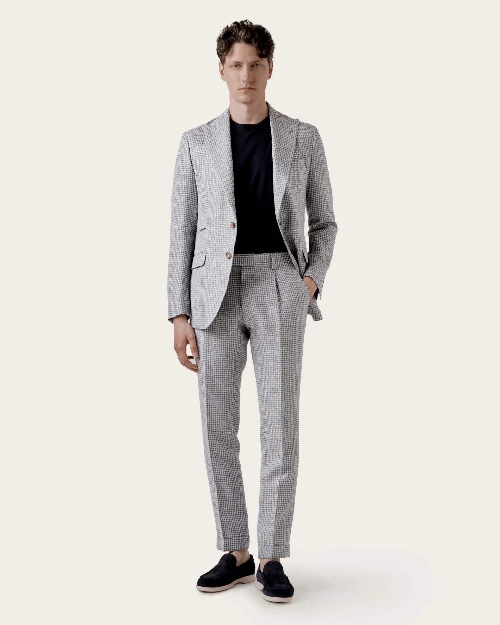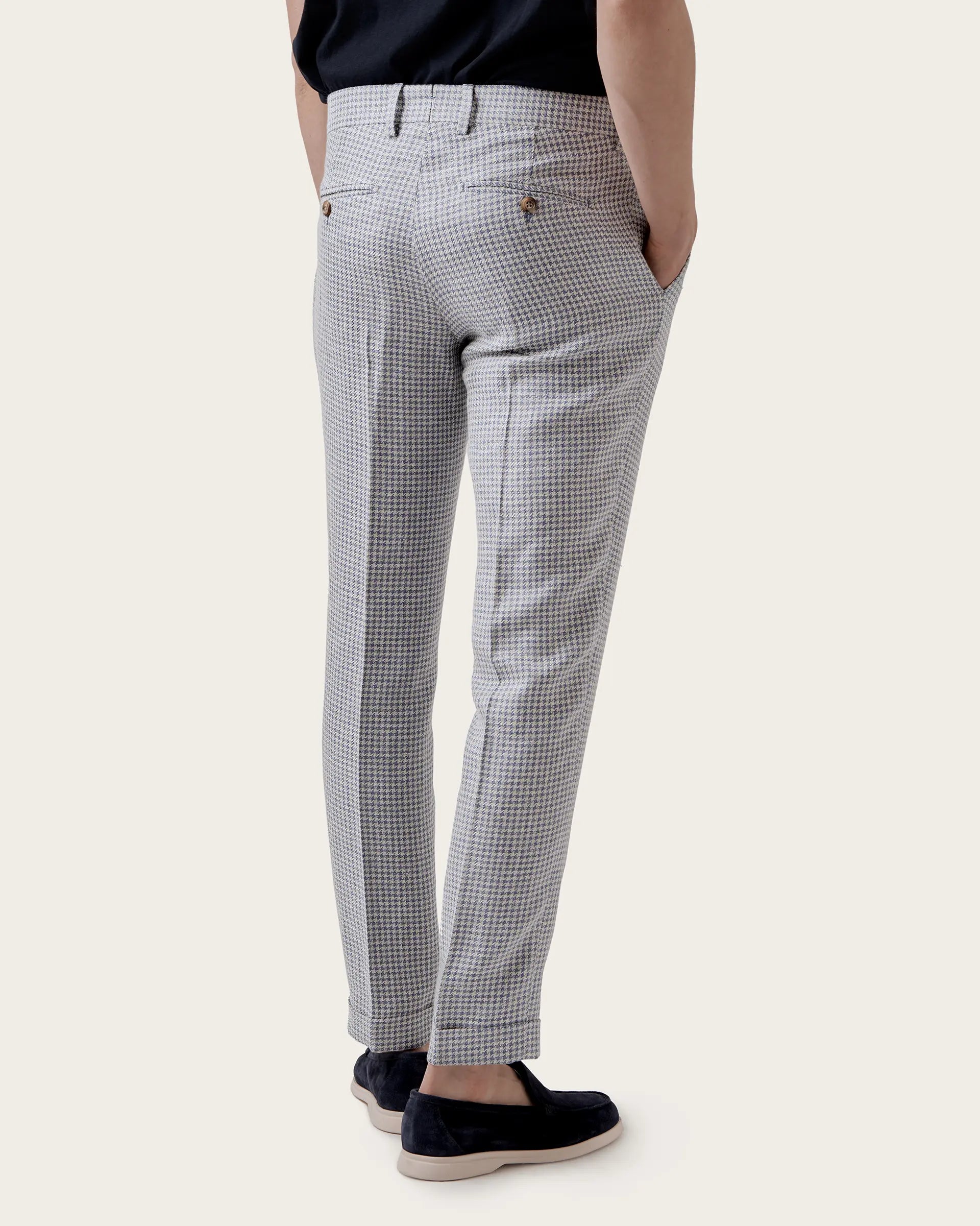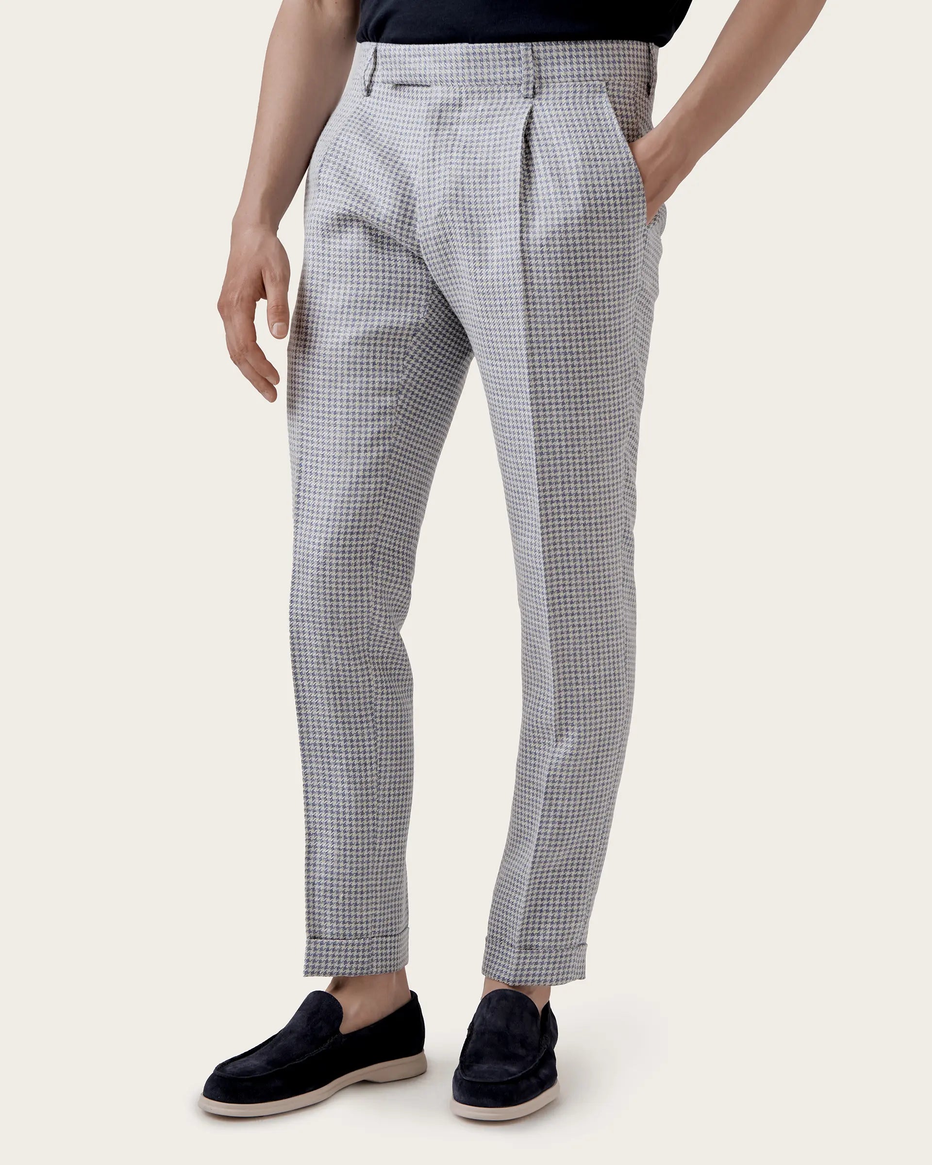 A balance of classic and sporty elements defines the classic and contemporary style of these trousers made from a blend of fine natural fibres that give life to a lightweight fabric with the traditional pied de poule motif reinterpreted in a modern key and which, thanks to the special composition, takes on a shiny - opaque effect and unusual colours. The construction with deep pleats guarantees maximum comfort and freedom of movement for a bold, comfortable garment that does not go unnoticed. An exclusive pair of trousers to combine in different seasonal looks.