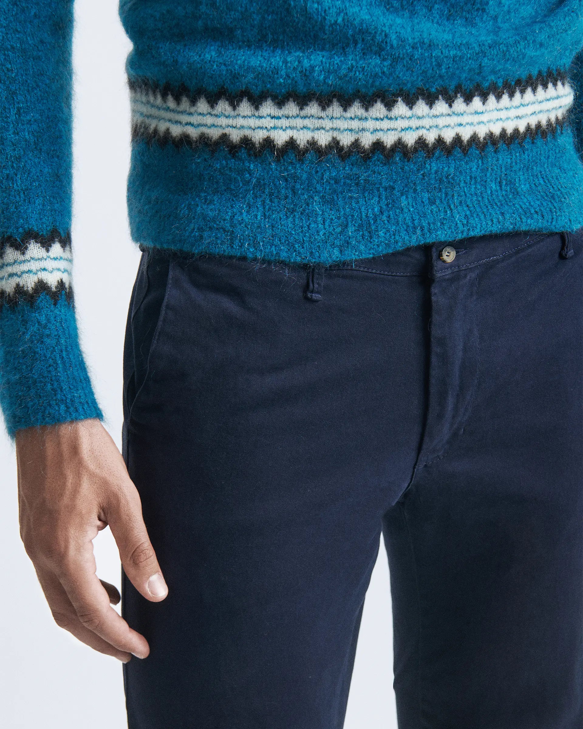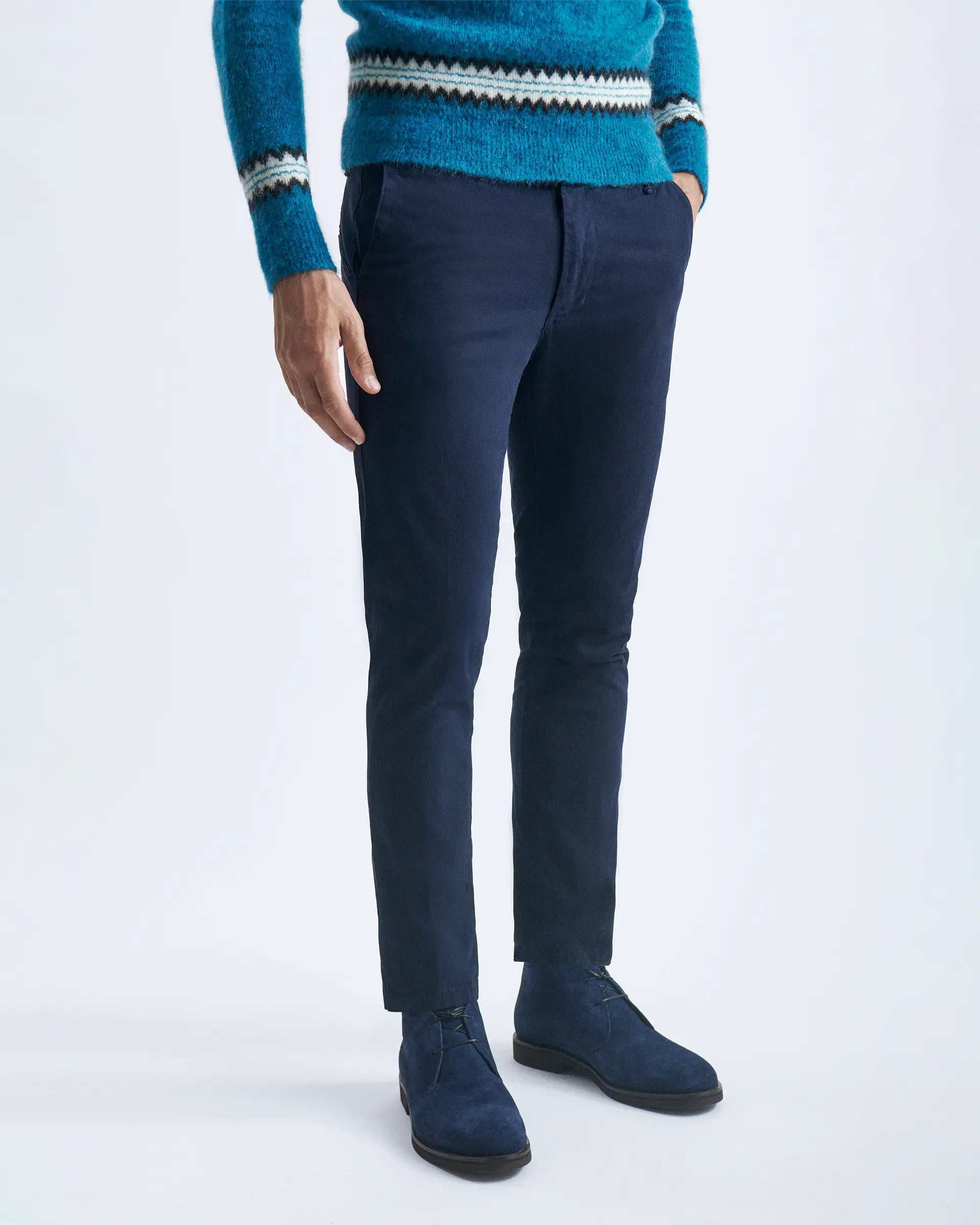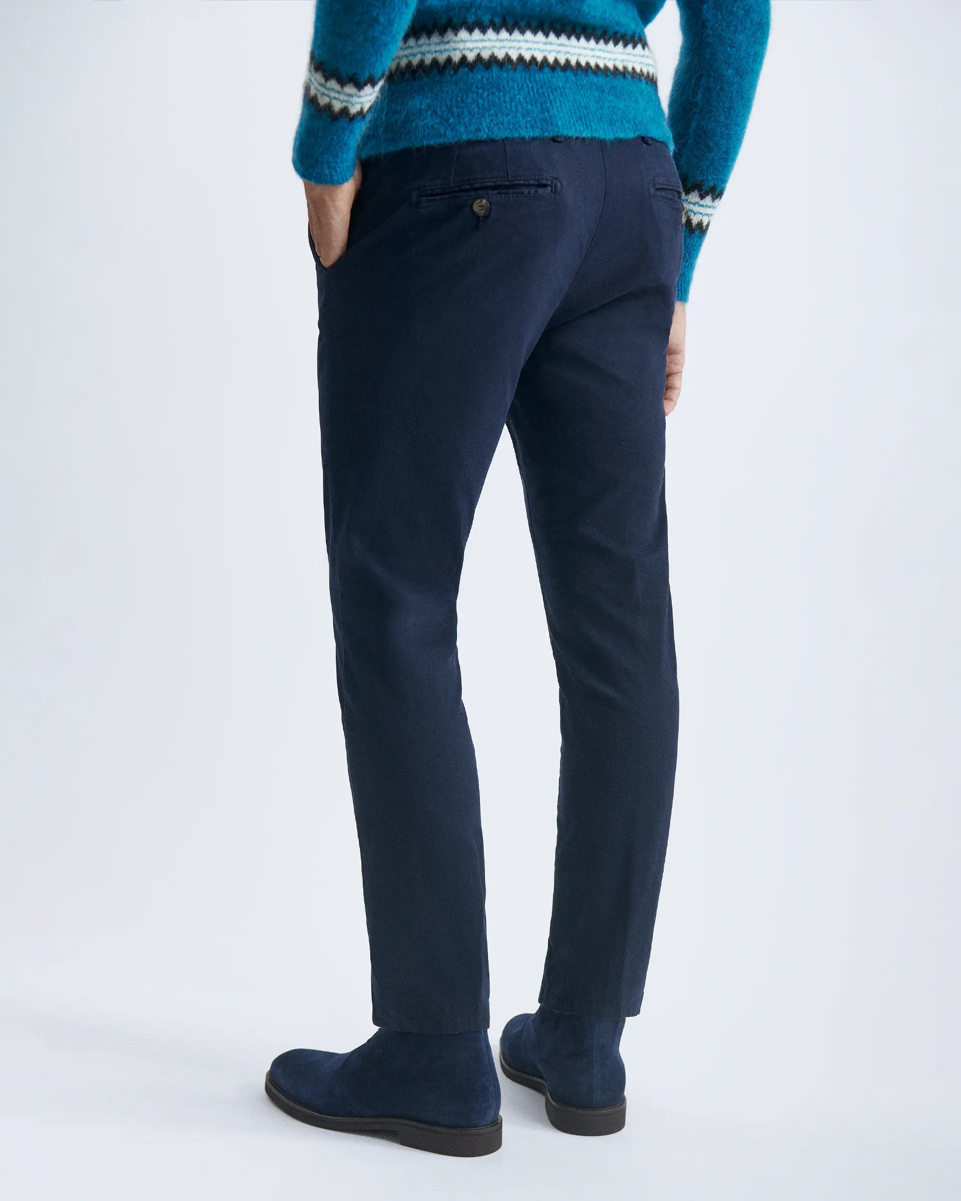 A timeless classic that reinvents itself according to the different possible combinations perfect for everyday wear in the city or for weekends. Made of structured stretch cotton, which is durable and comfortable in movement, they are enriched by the dyeing carried out directly on the garment, which gives it a slightly nuanced shade.