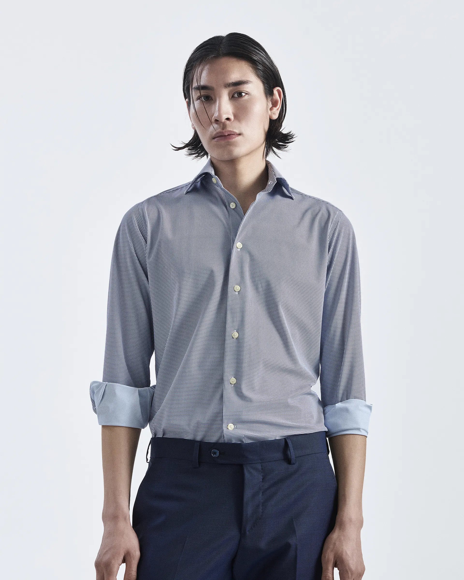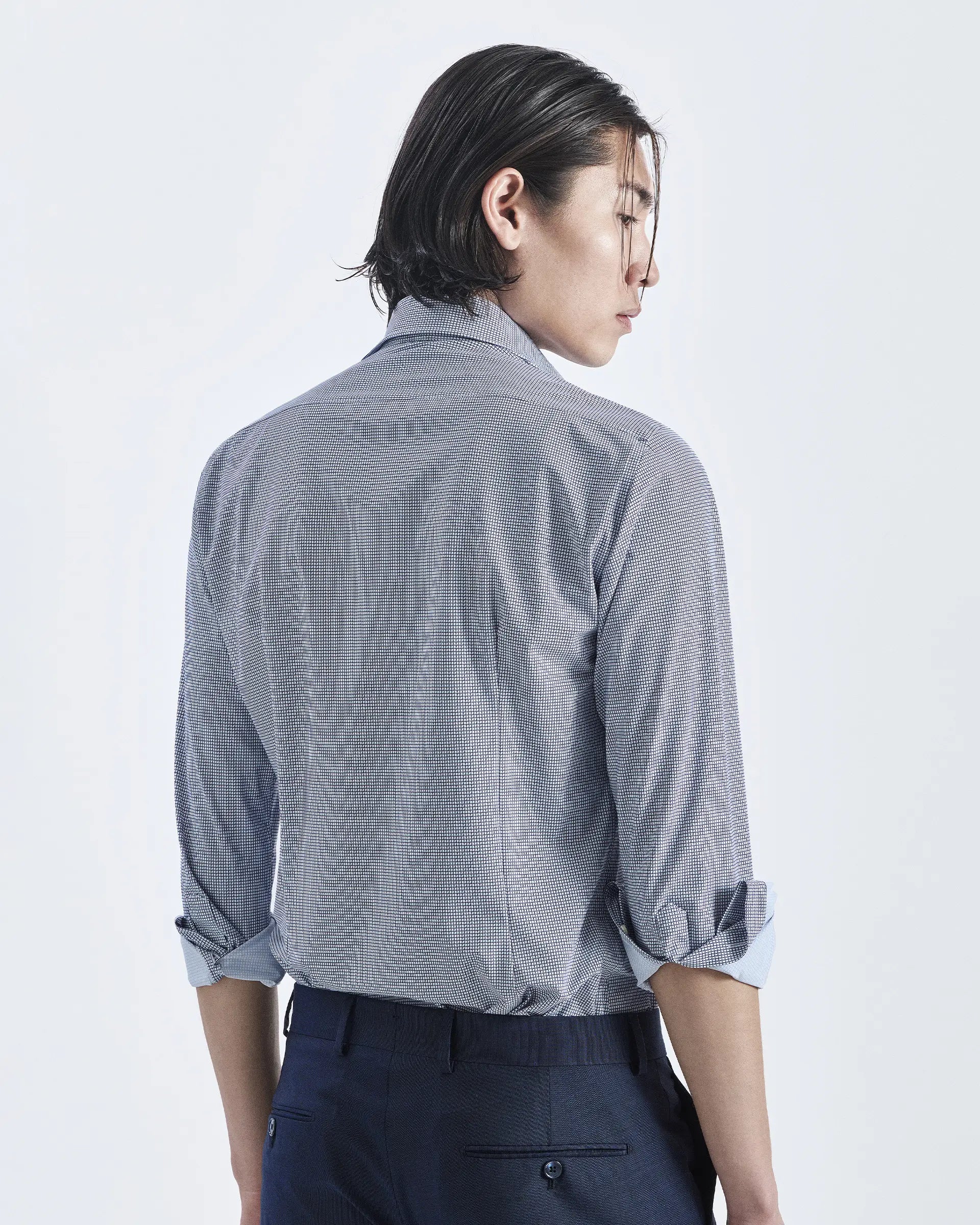 Shirt made of a blend of technical yarns where the casual elegance of its sports texture combines with the tailored cut to create a garment suitable for different urban and working environments. The fabric, which is pleasant to the touch and to wear, offers all the comfort and freedom of movement of a sports shirt, while maintaining a discreet refinement. Perfect for those looking for a versatile garment that can be worn with ease in different contexts.