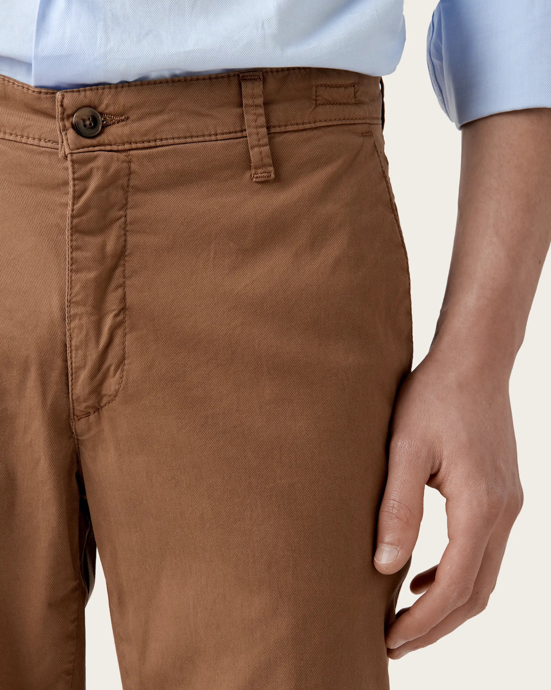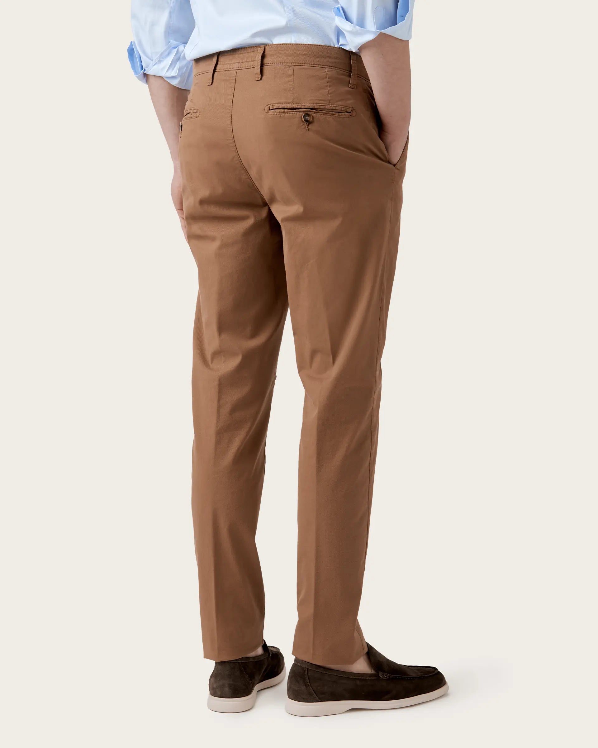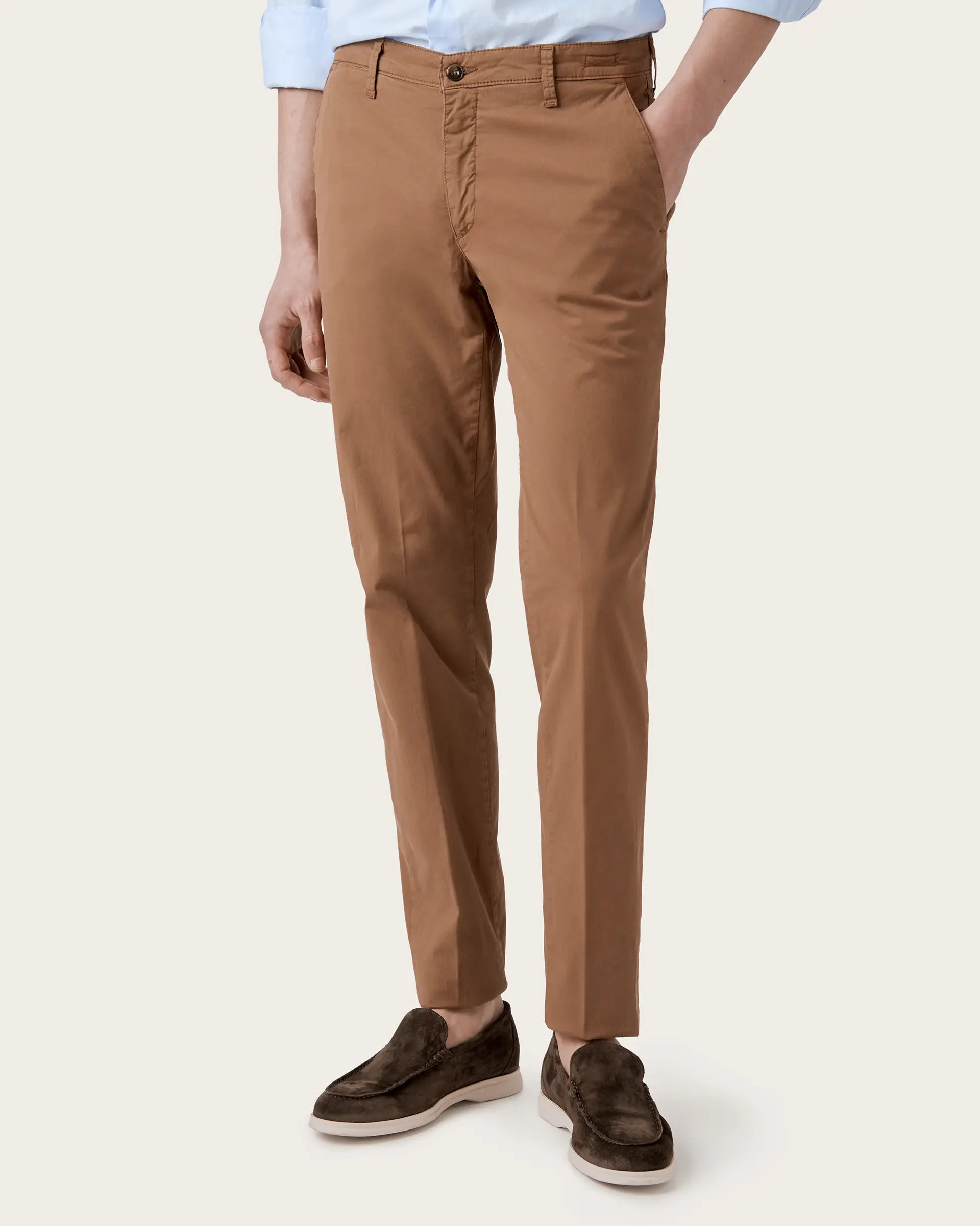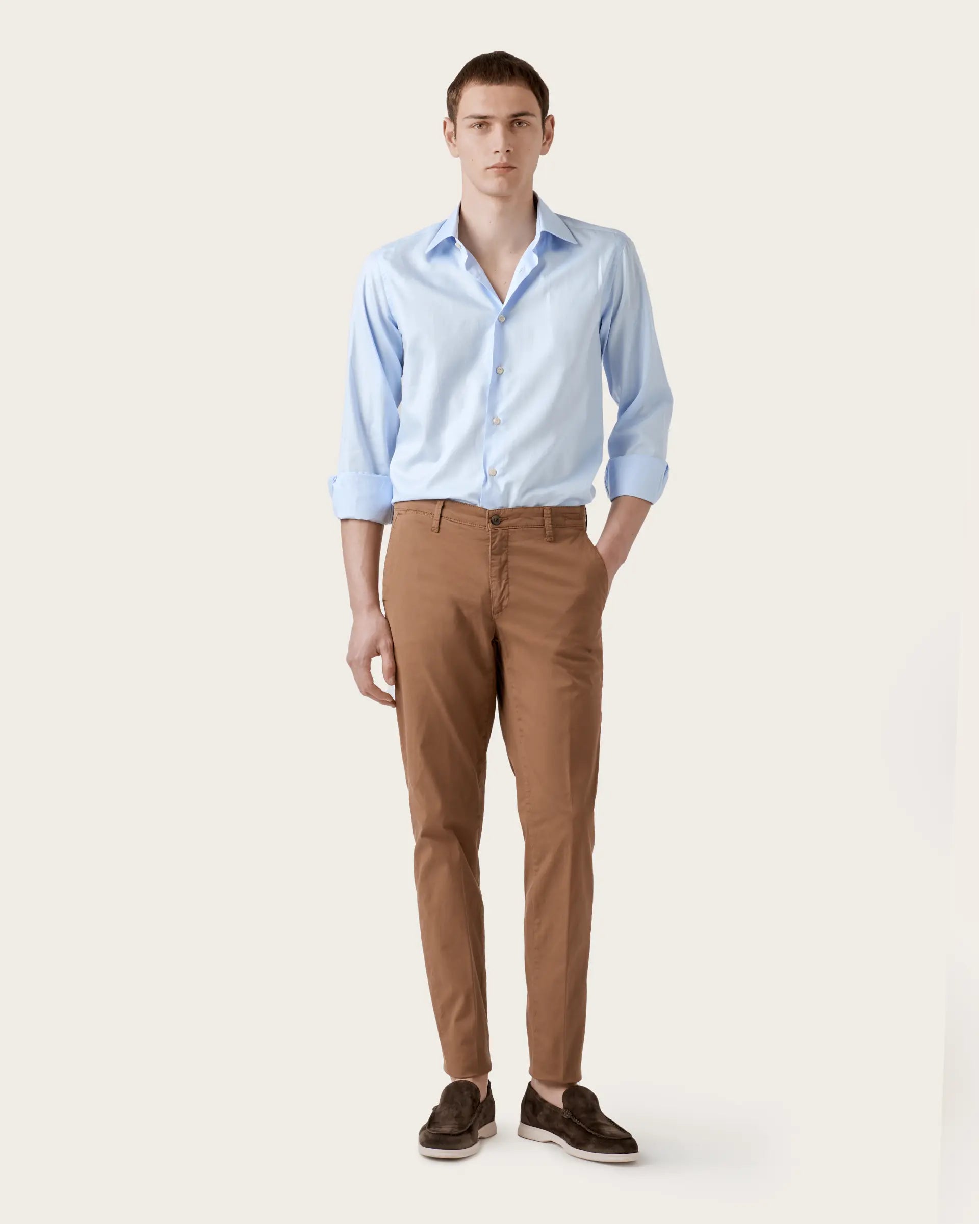 Iconic piece of the male wardrobe made of medium weight stretch cotton that combines a pleasant worked texture with resistance and elasticity. Essential and with a contemporary cut, it is presented with a “regular slim” fit for a dry but not tight fit that defines its refined appearance. The particular wash guarantees a soft feel and natural color shades.