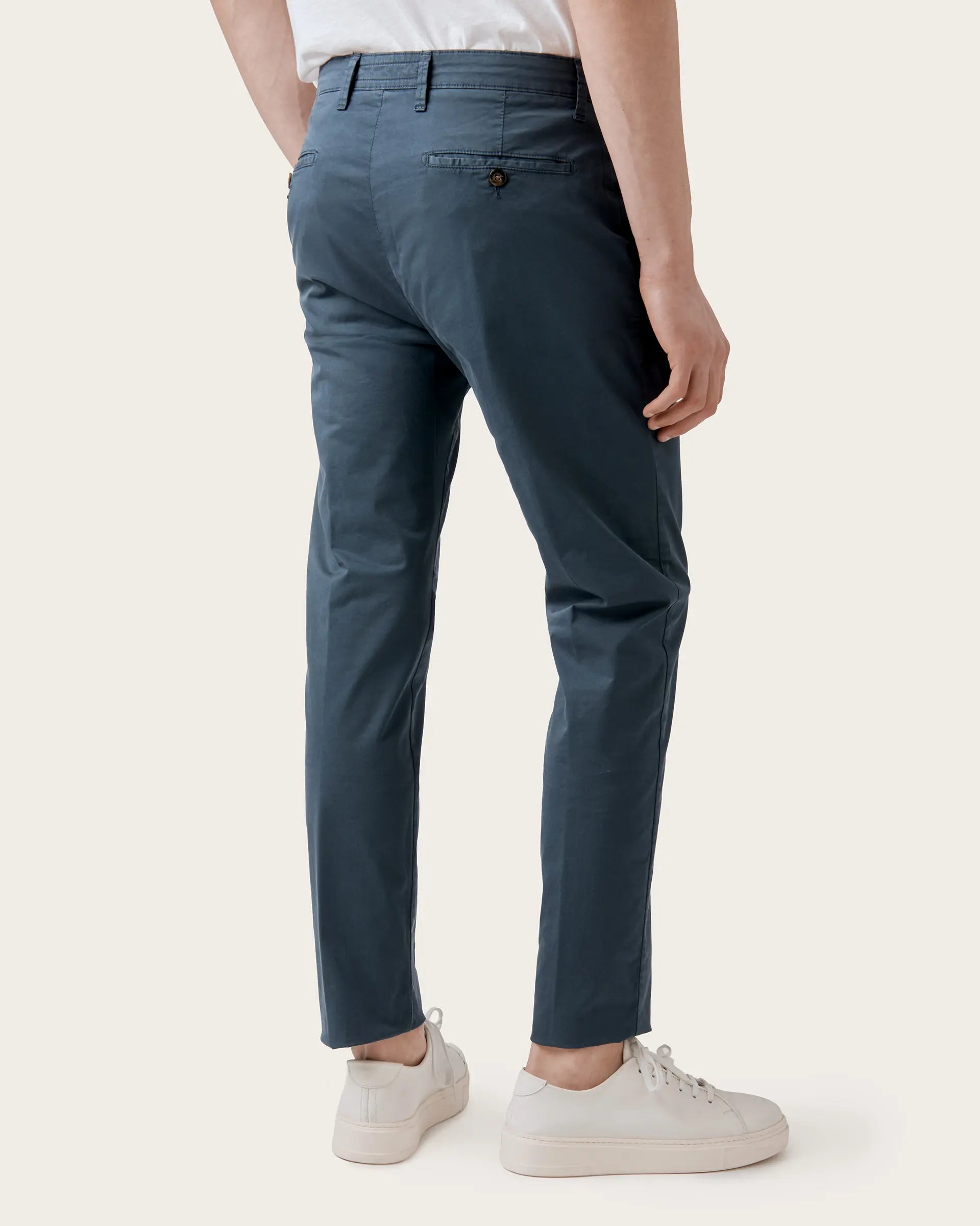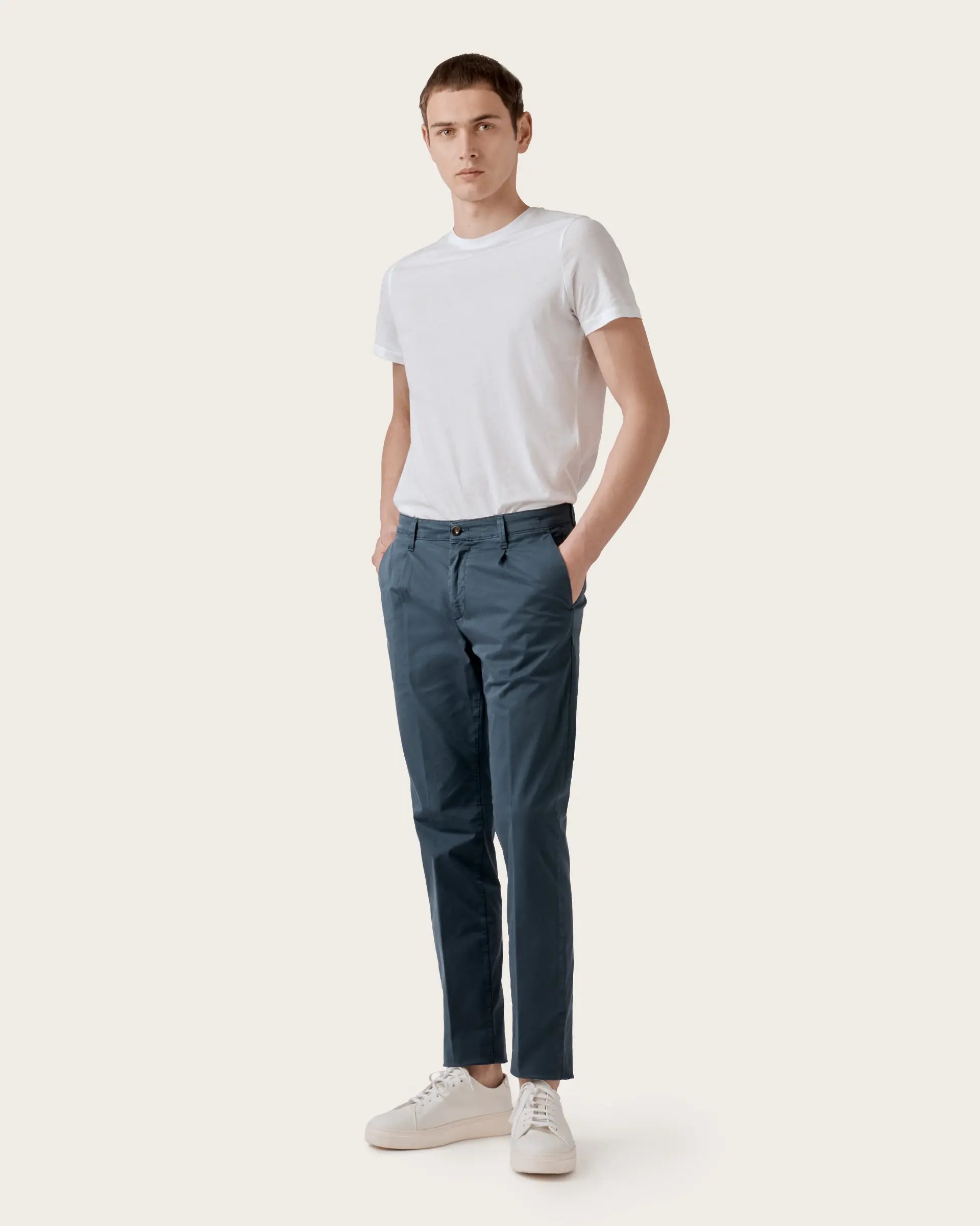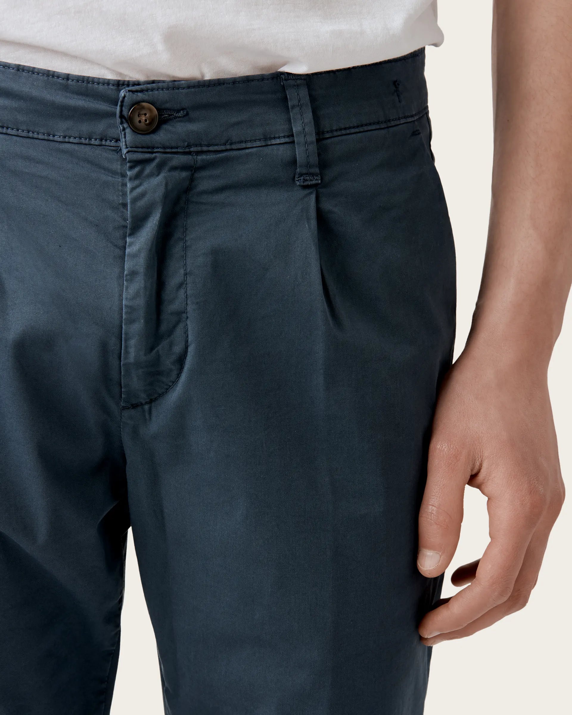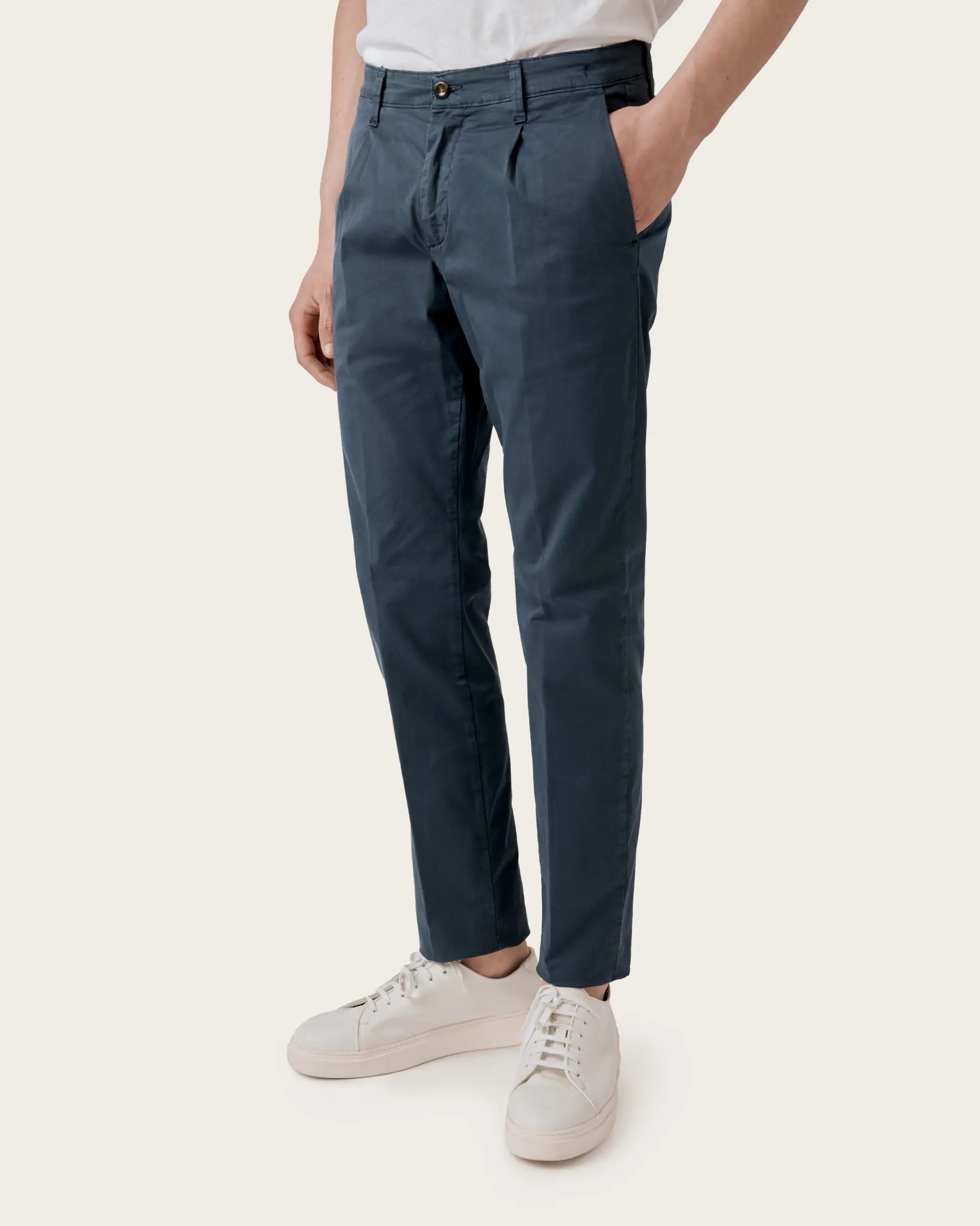 Chino trousers with pleats made of a very light stretch cotton gabardine canvas. A model with a sporty vocation that combines a leisure line with sartorial-inspired details, giving life to an original and refined garment. The fit that distinguishes it is regular, made even more comfortable by the width given by the pleat fold. The garment dyeing gives the trousers a unique and distinctive look.