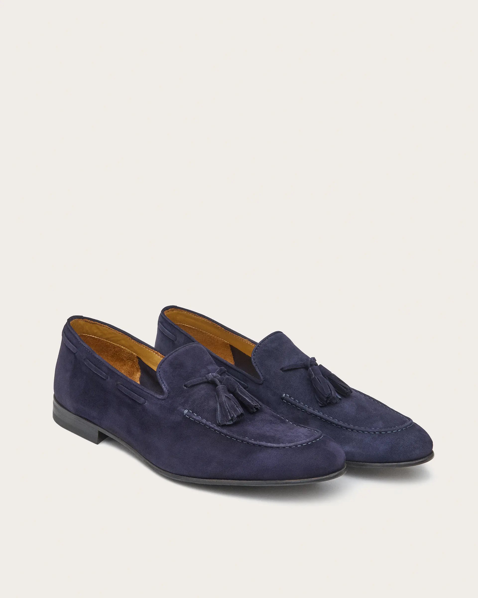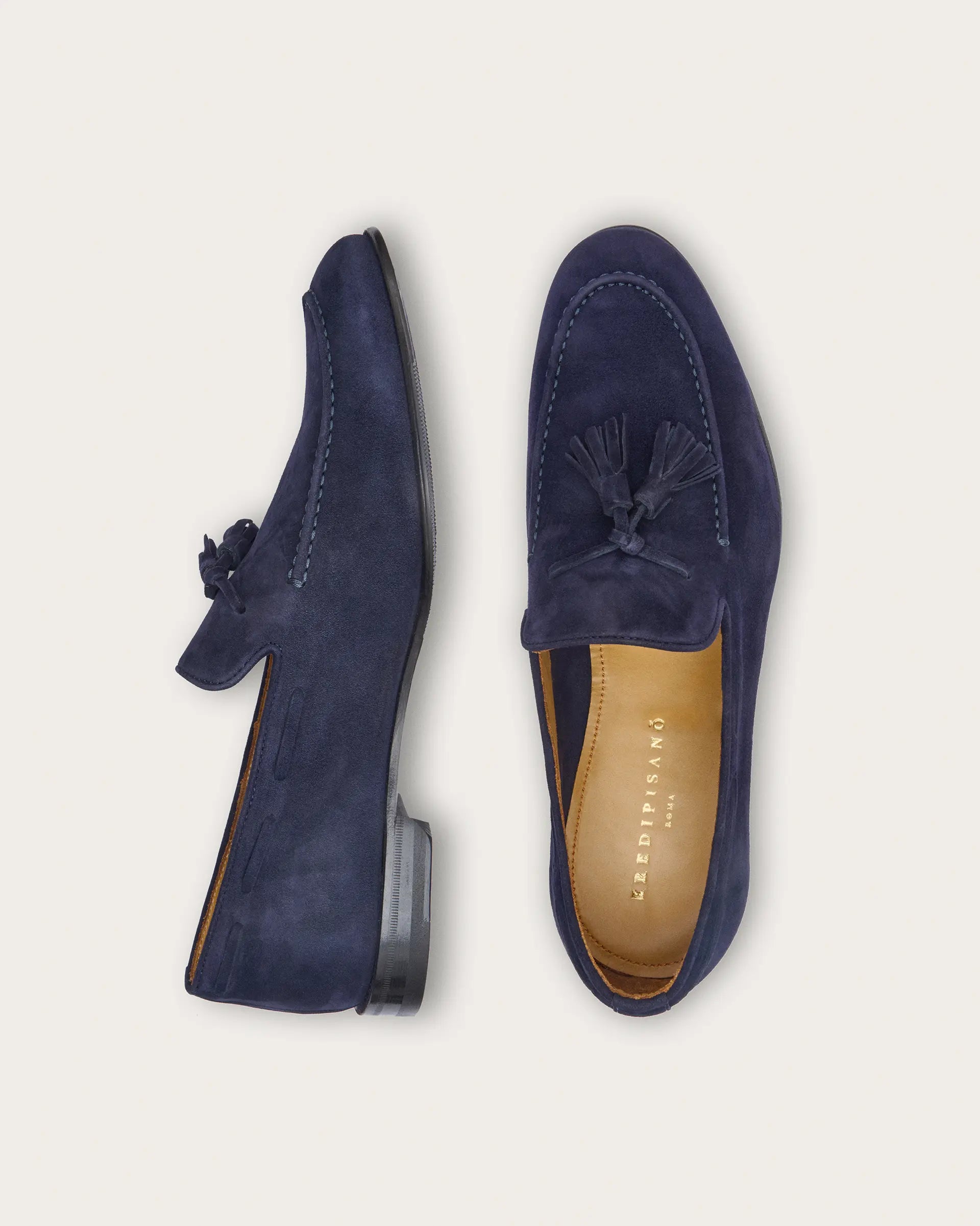 Unlined moccasin with an elegant and functional line enhanced by elegant finishes such as classic tassels. Made of a soft light suede, it is characterized by the leather sole with Blake workmanship with non-slip rubber island combining the charm of the classic shoe with the appeal of a modern and original model.