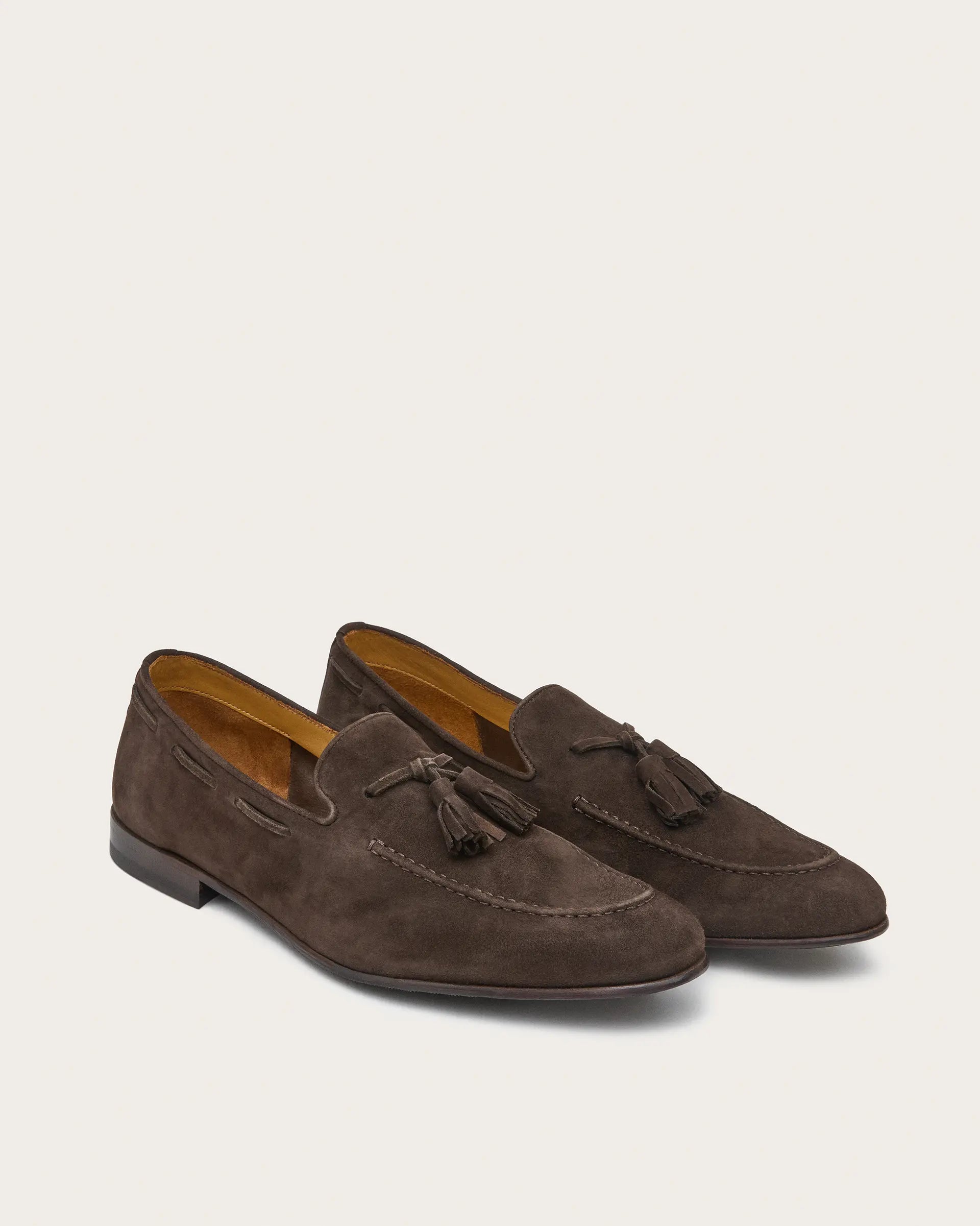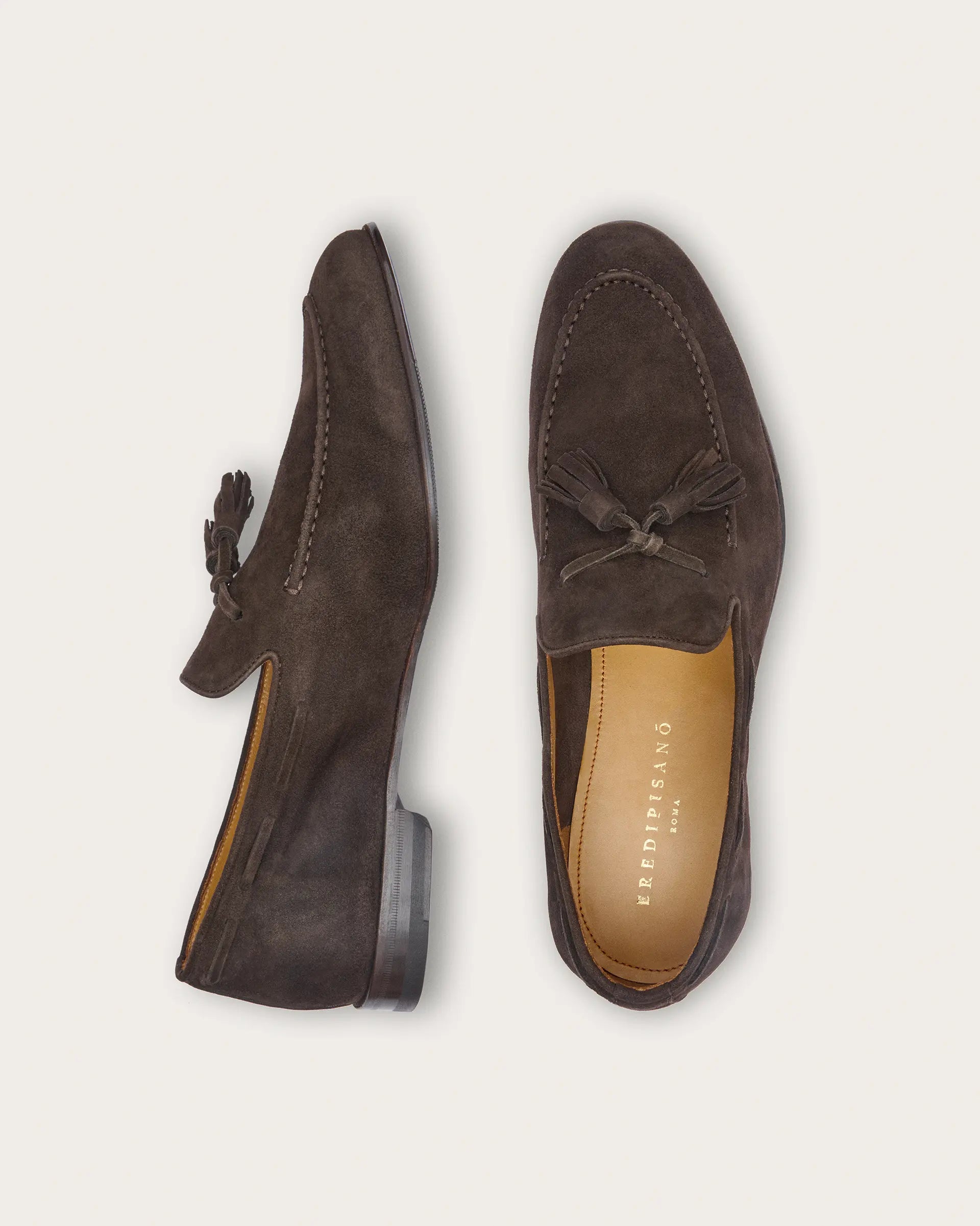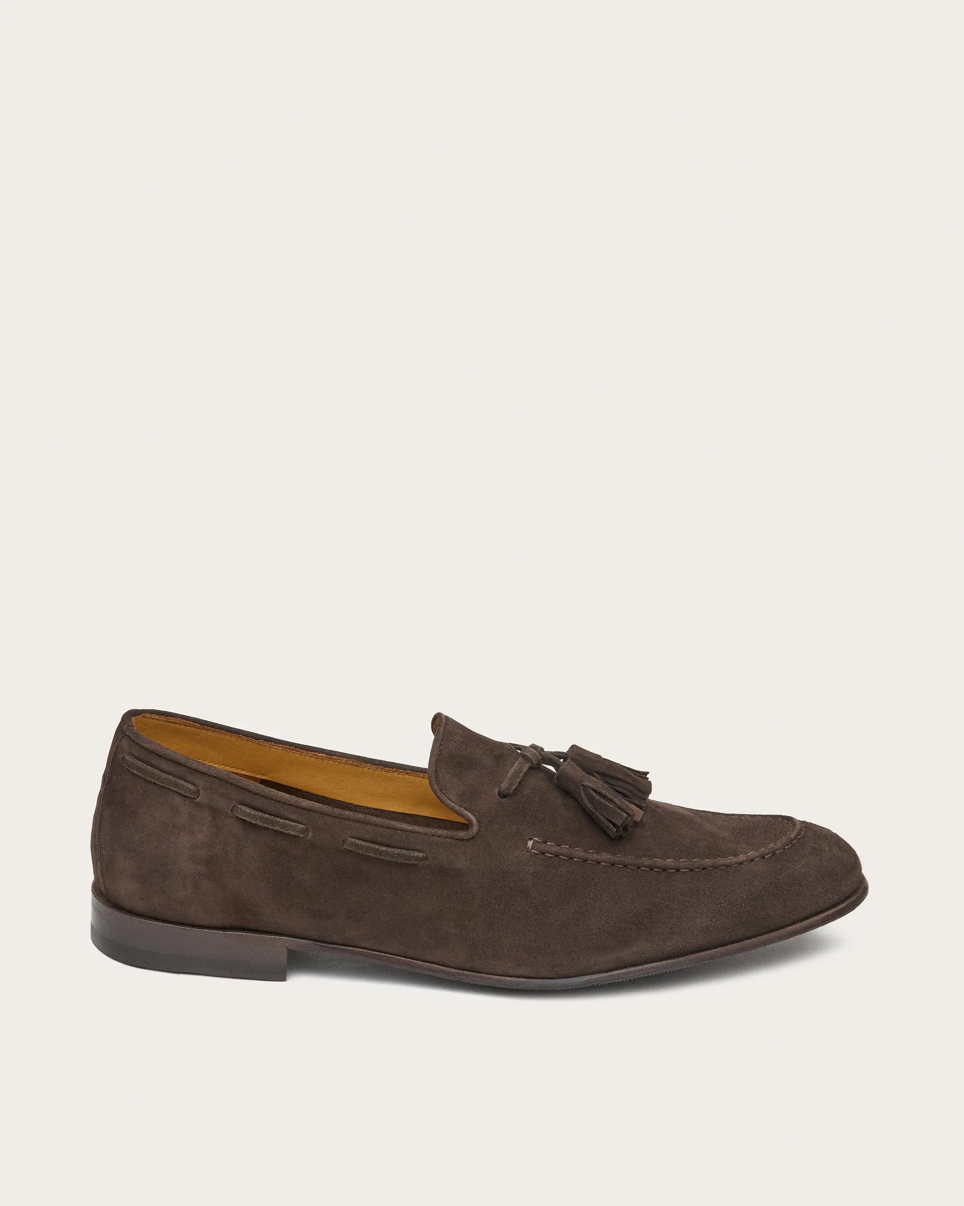 Unlined moccasin with an elegant and functional line enhanced by elegant finishes such as classic tassels. Made of a soft light suede, it is characterized by the leather sole with Blake workmanship with non-slip rubber island combining the charm of the classic shoe with the appeal of a modern and original model.