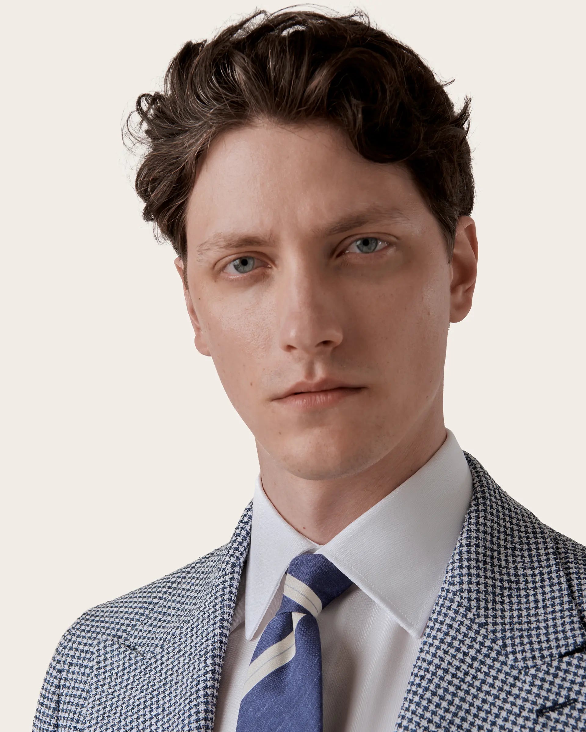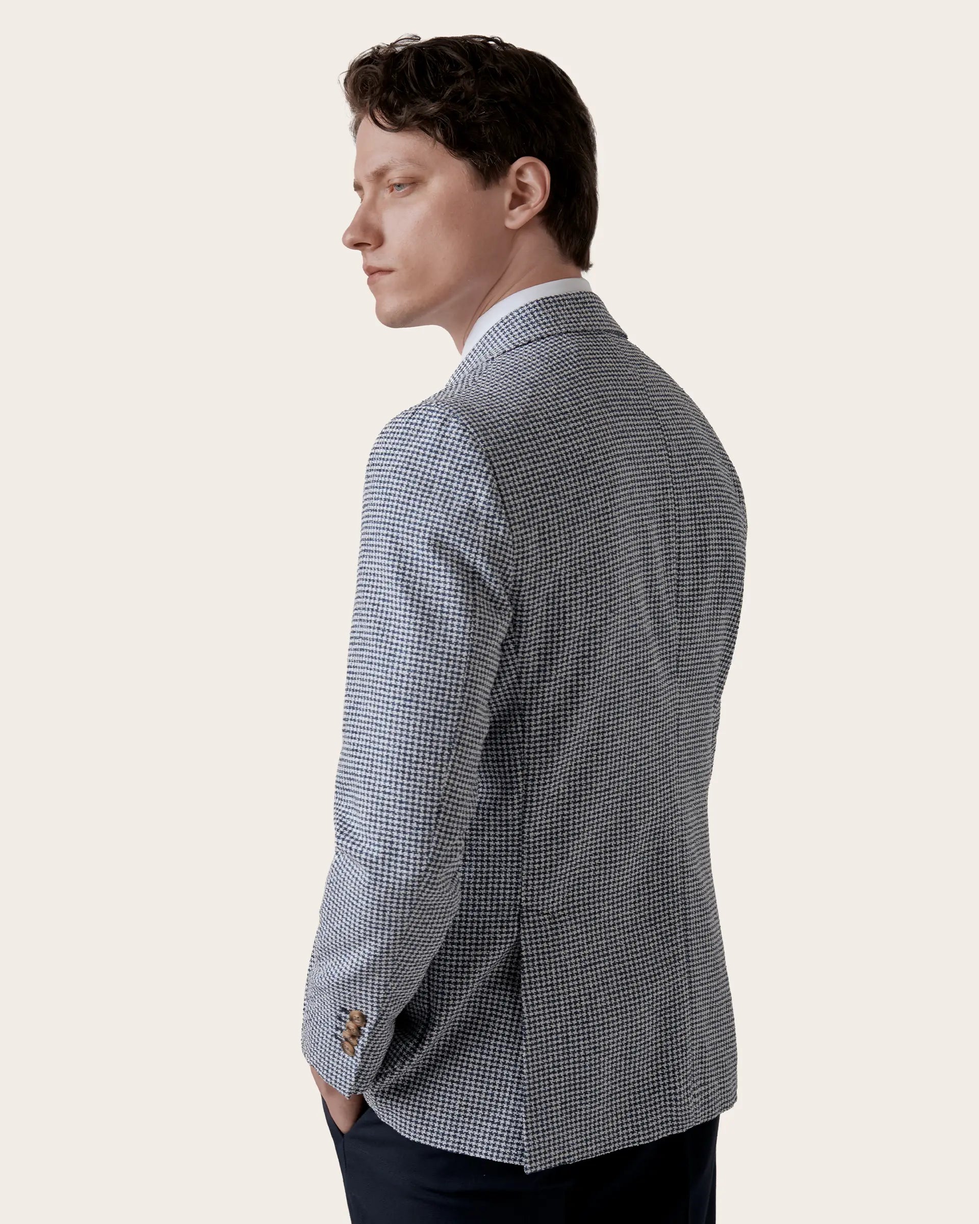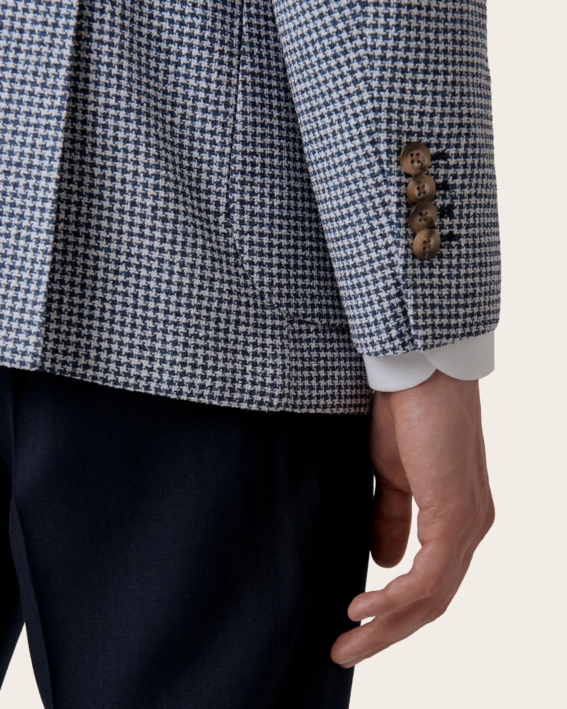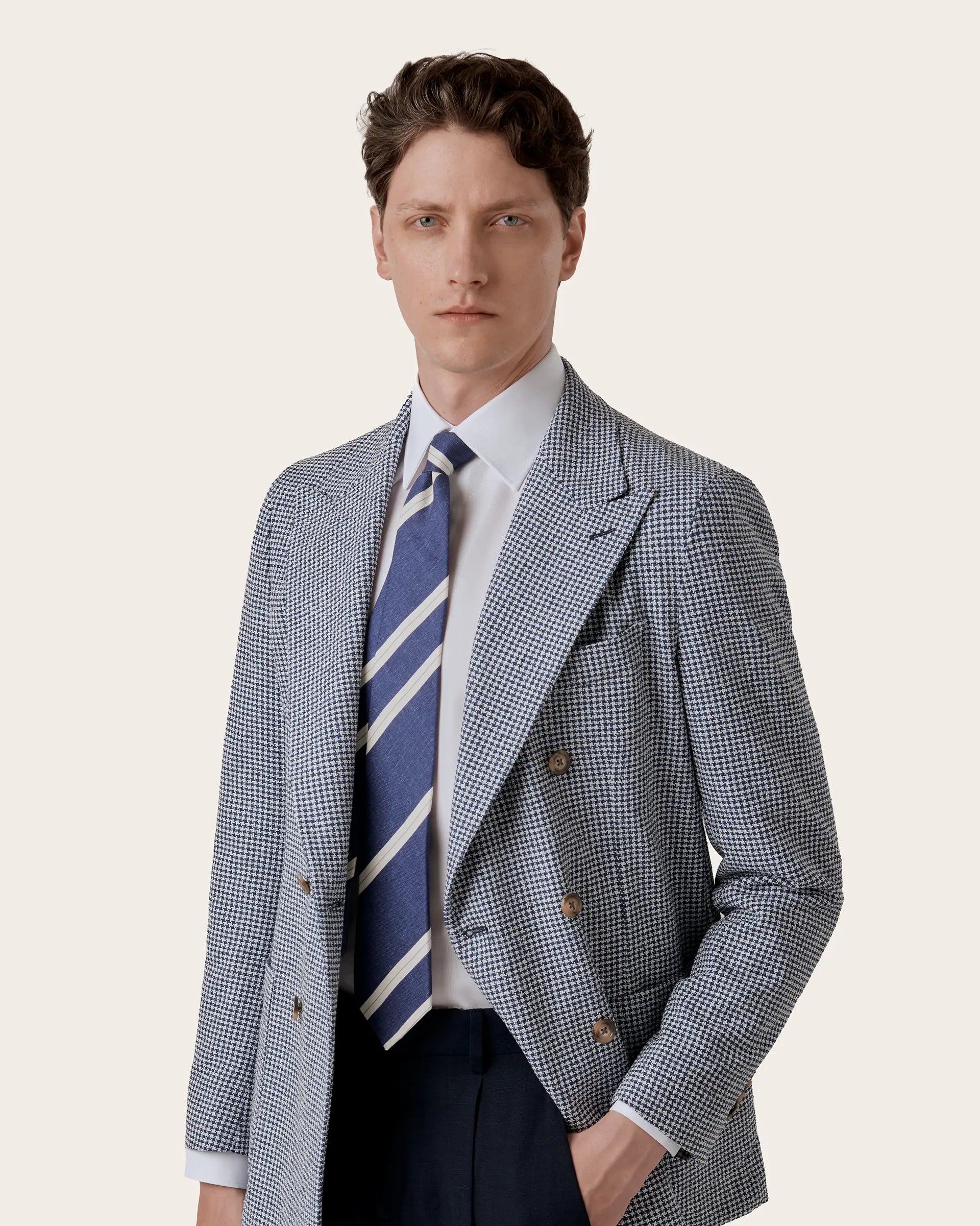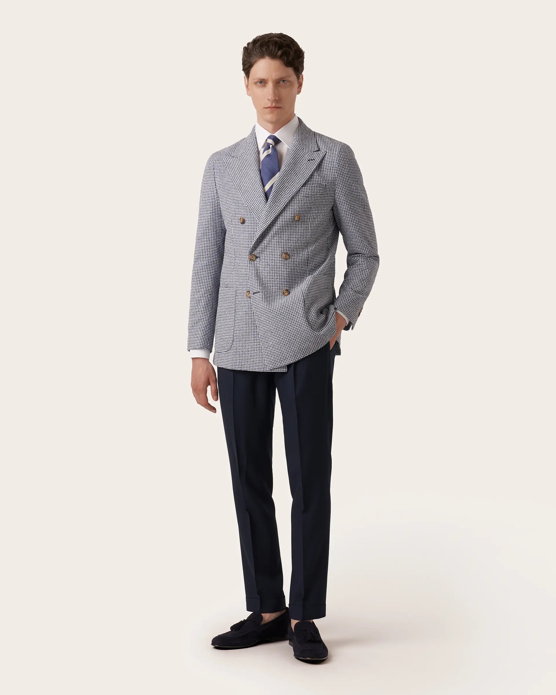 Unlined double-breasted jacket made from a fine blend of cotton and wool from Lanificio Vitale Barberis & Canonico where the timeless charm of the pied de poule pattern marries a tailored and sophisticated model creating an exclusive mix of style and refinement. The peak lapels and patch pockets make this garment an elegant must-have for those who never want to go unnoticed.