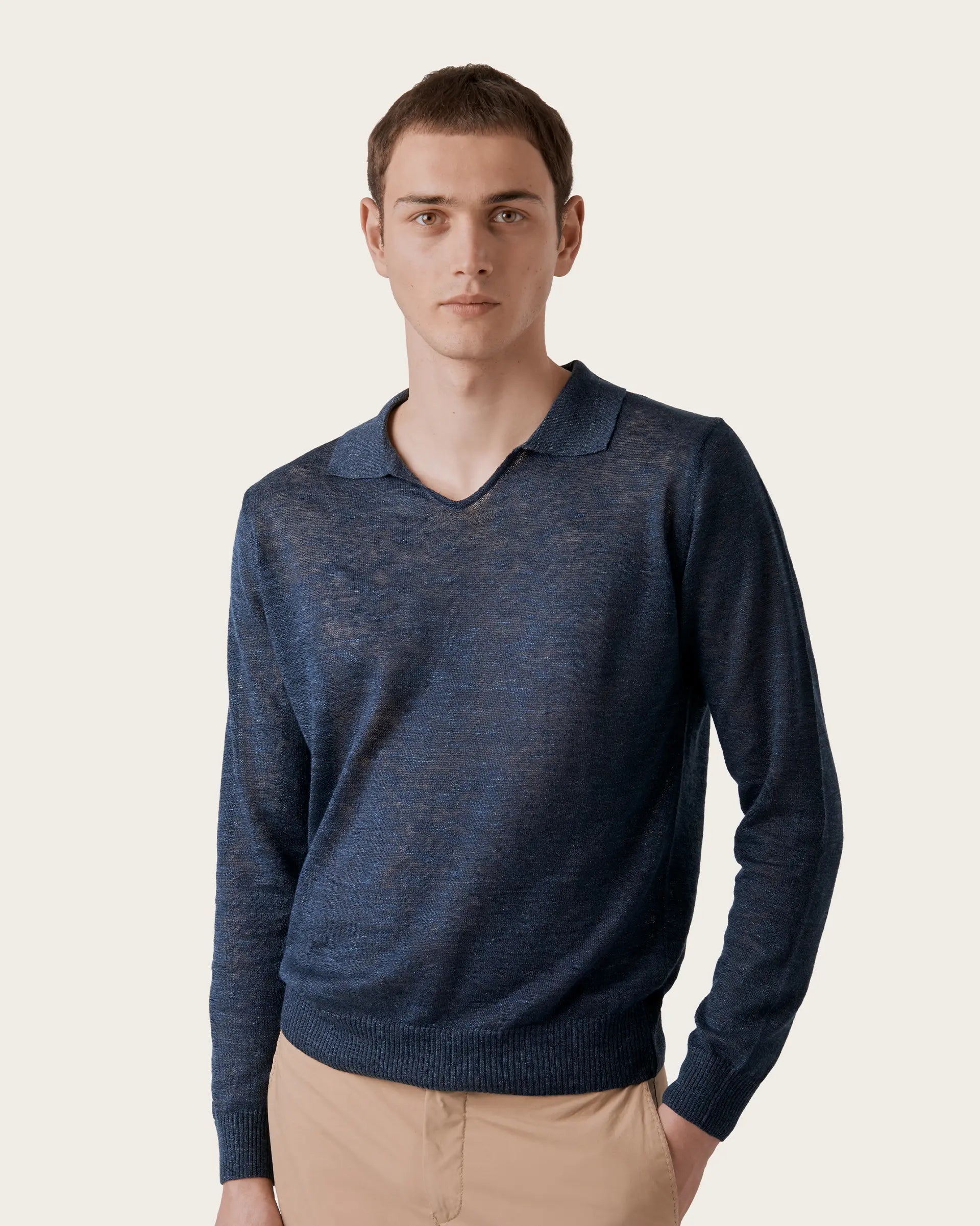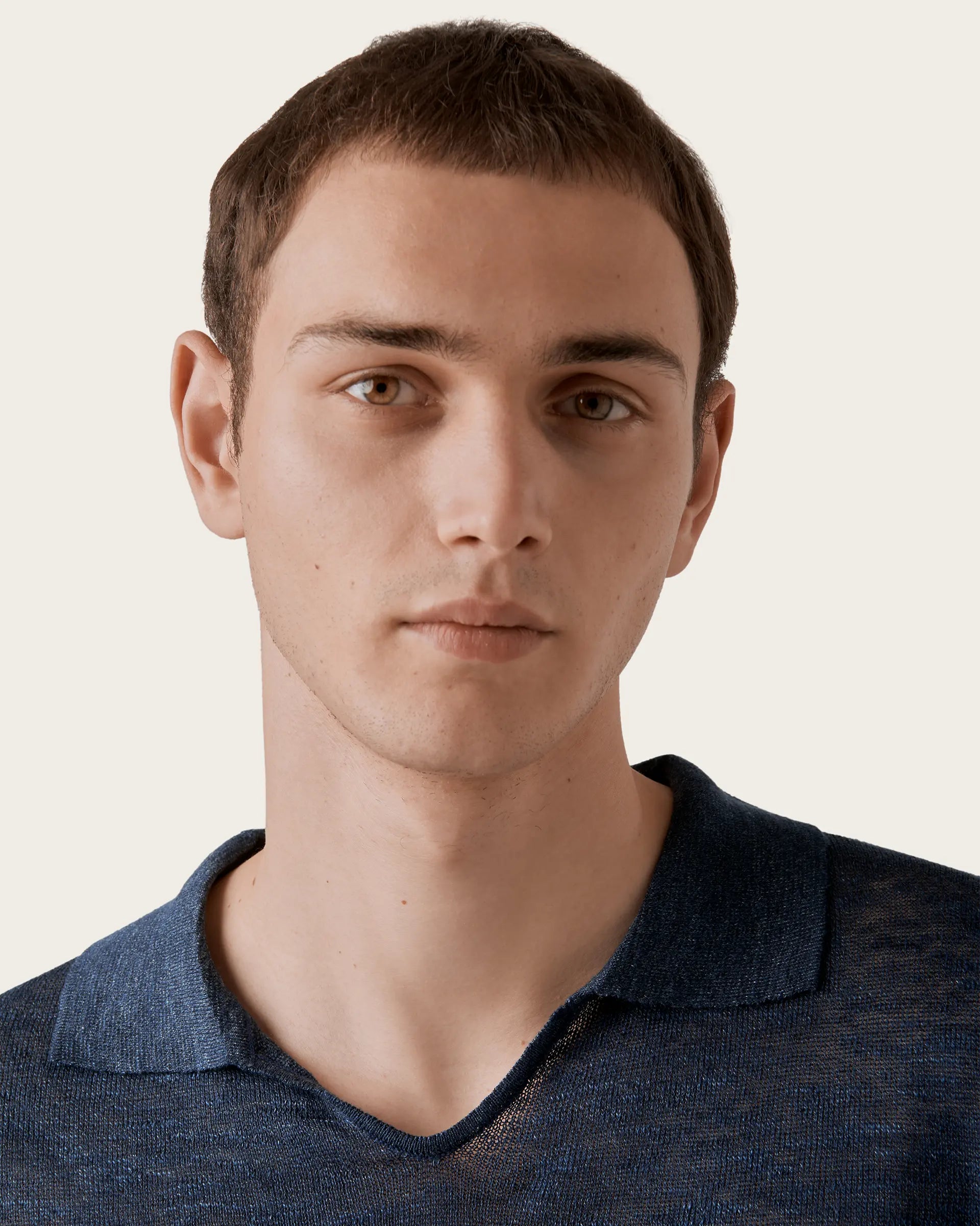 An elegant and modern cut polo shirt featuring a buttonless closure that revisits a classic garment in a completely new version. Crafted from a fine blend of linen and extra-fine 14-gauge shaved cotton to offer an unparalleled sensation of freshness and comfort, this shirt embodies casual elegance in an absolutely natural way. It is the perfect mix between classic and modern, perfect for the summer season.