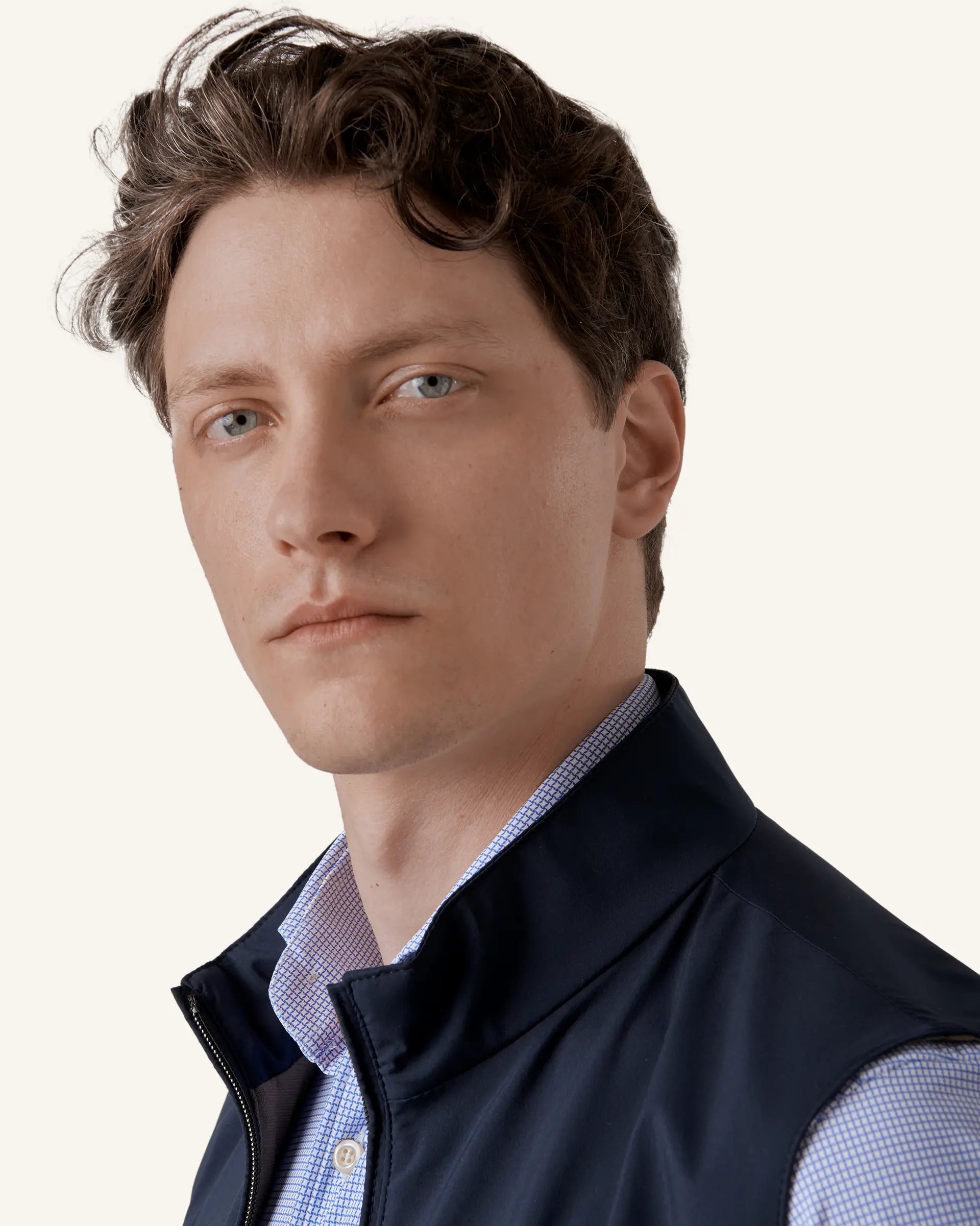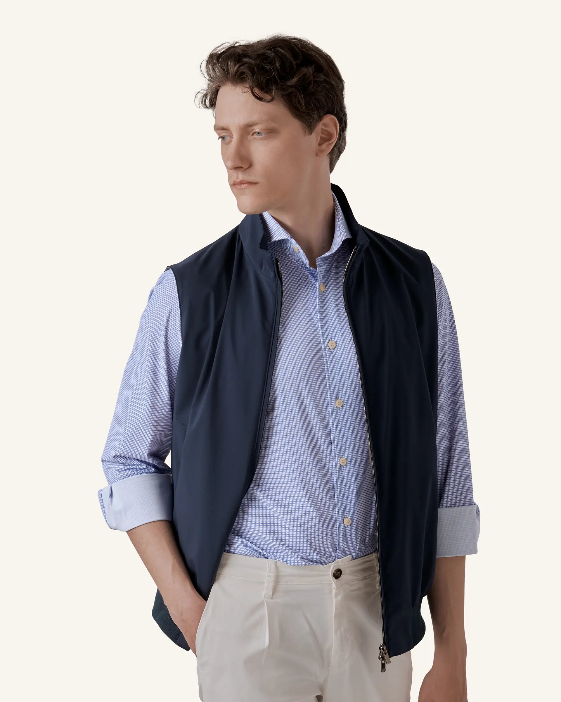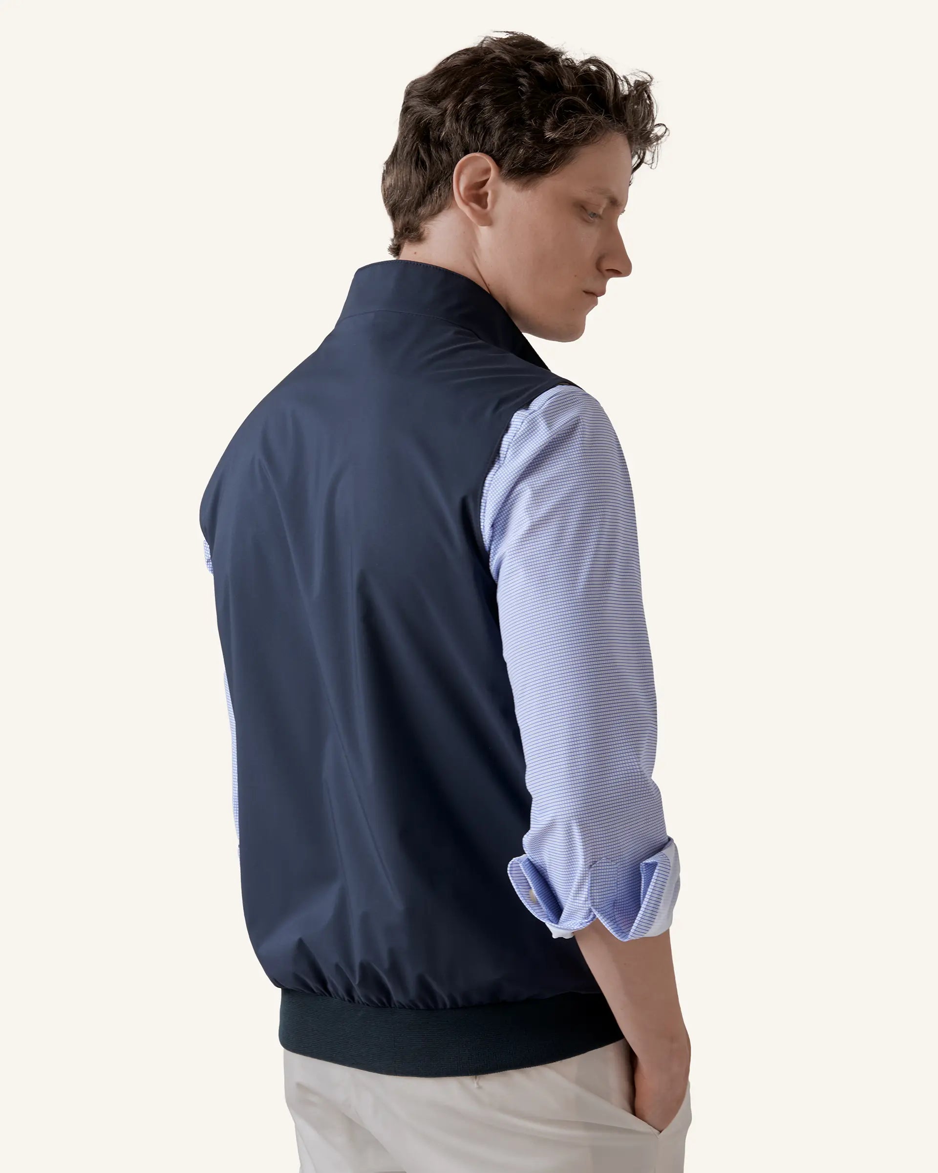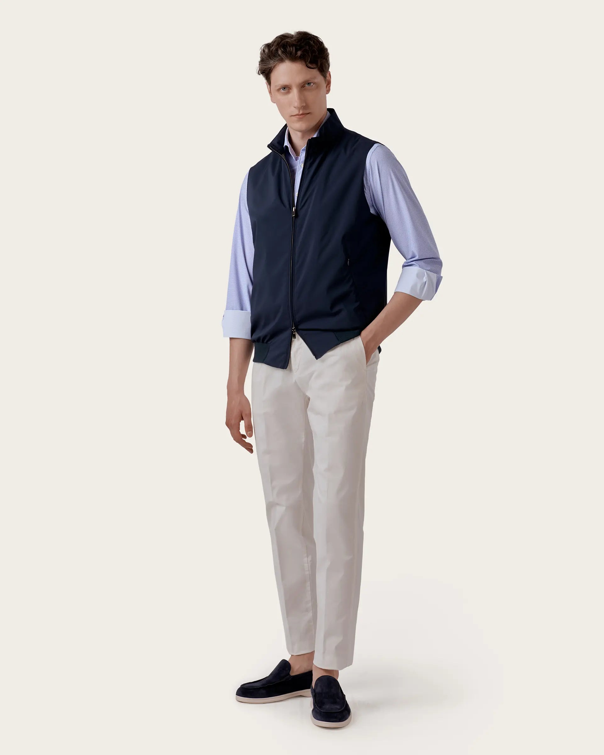 Outdoor garment with a sporty and contemporary mood made with the innovative and sustainable Olmetex technical fabric finished with an internal lining in pure cotton. A garment that combines the functionality of an ultra-light and breathable material with a practical, versatile model with a refined design ideal for the change of season.