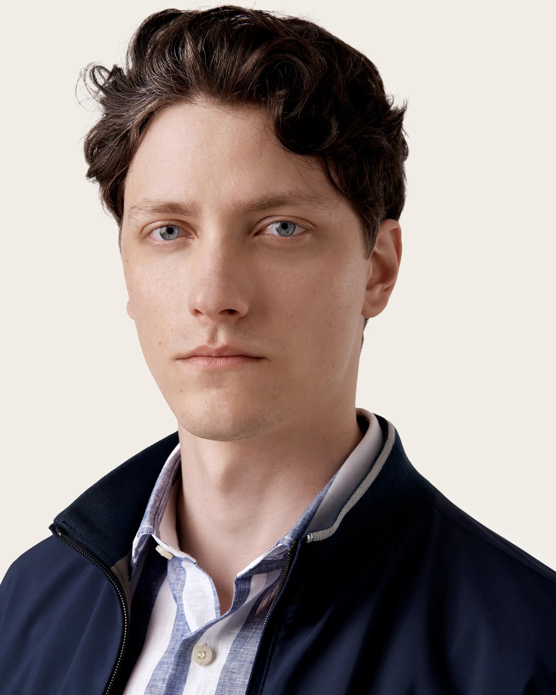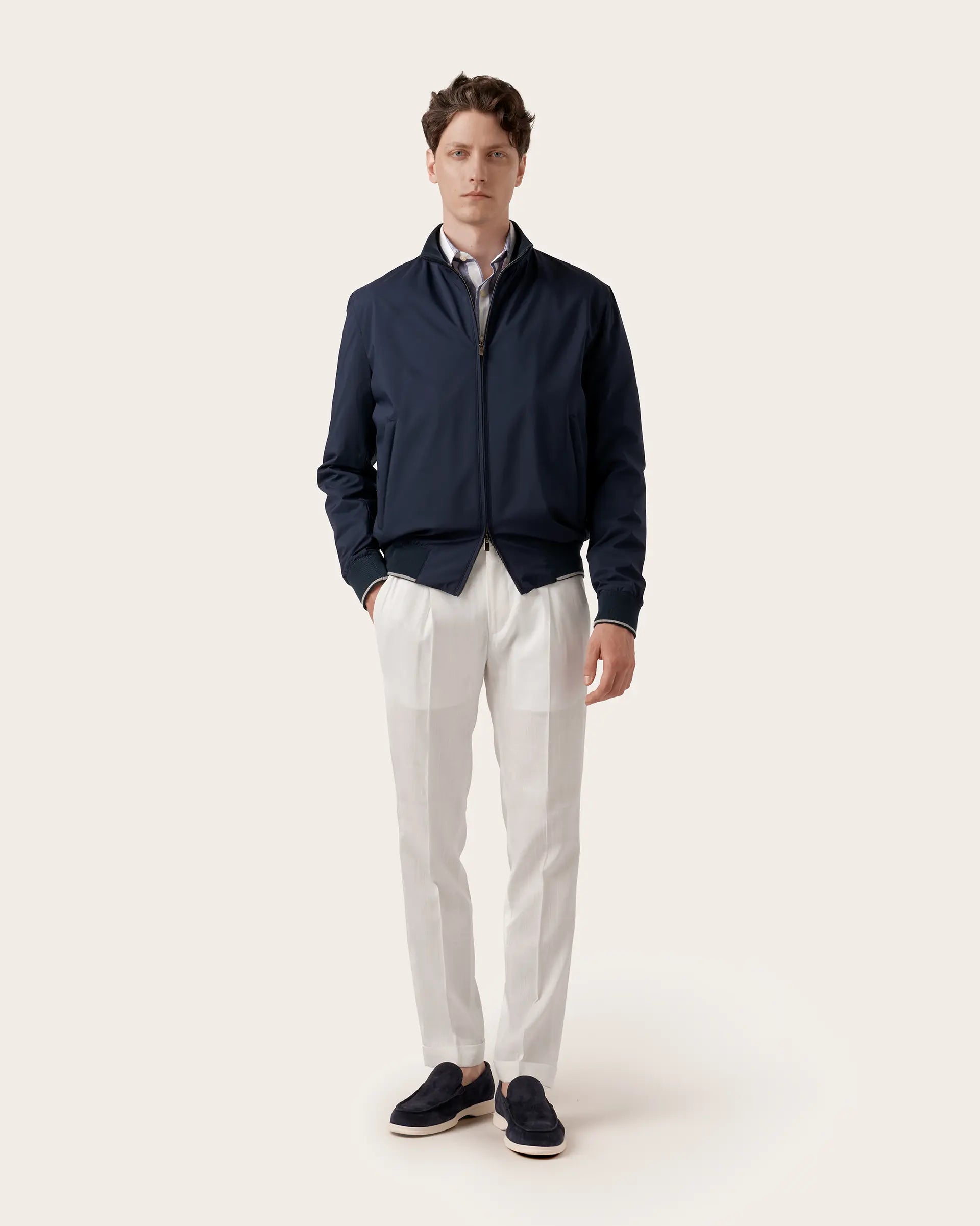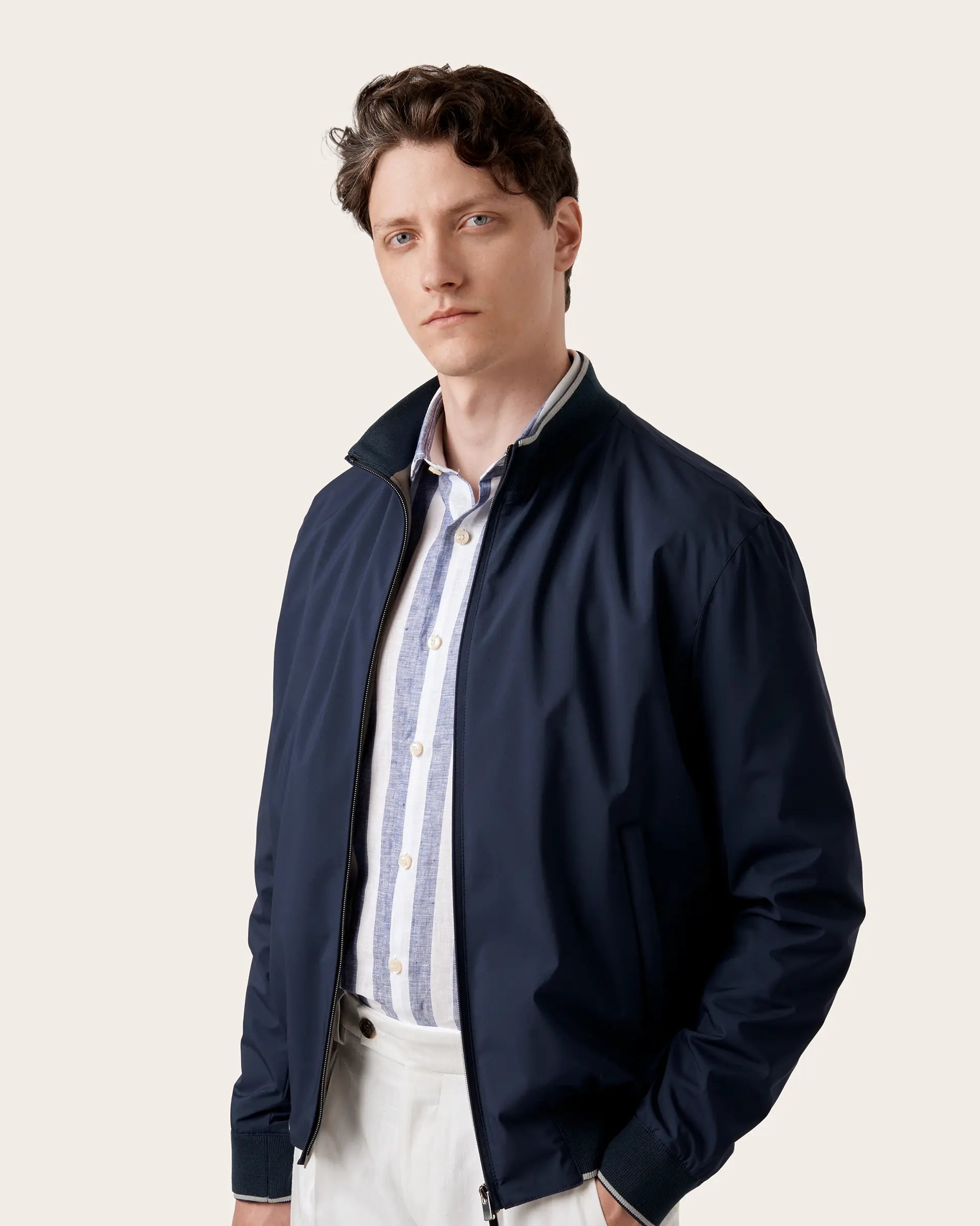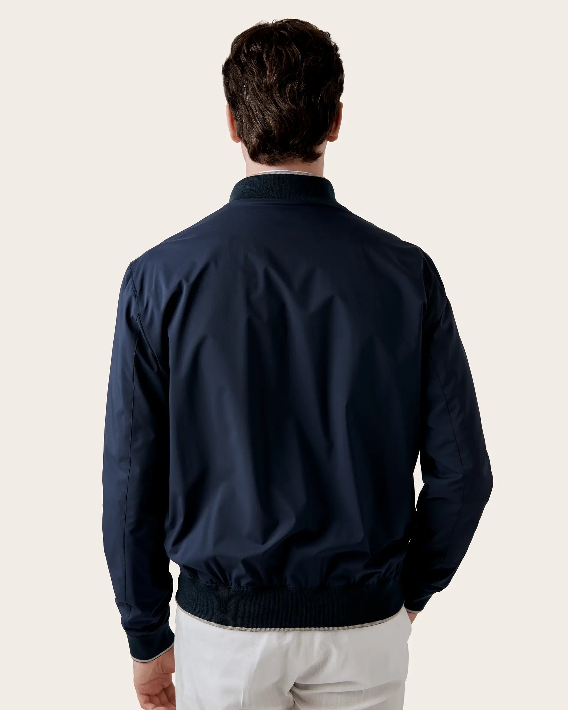 Timeless jacket with modern and contemporary shapes made of innovative and sustainable Olmetex technical fabric finished with pure cotton inner lining. A garment that combines the functionality of an ultra-light and breathable material with a refined design. The seasonal nuances and refined contrasts on the edges give this bomber a refined touch of style to outdoor looks.
