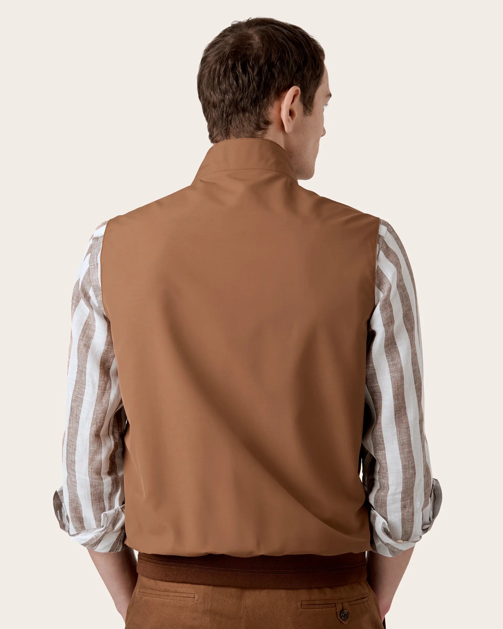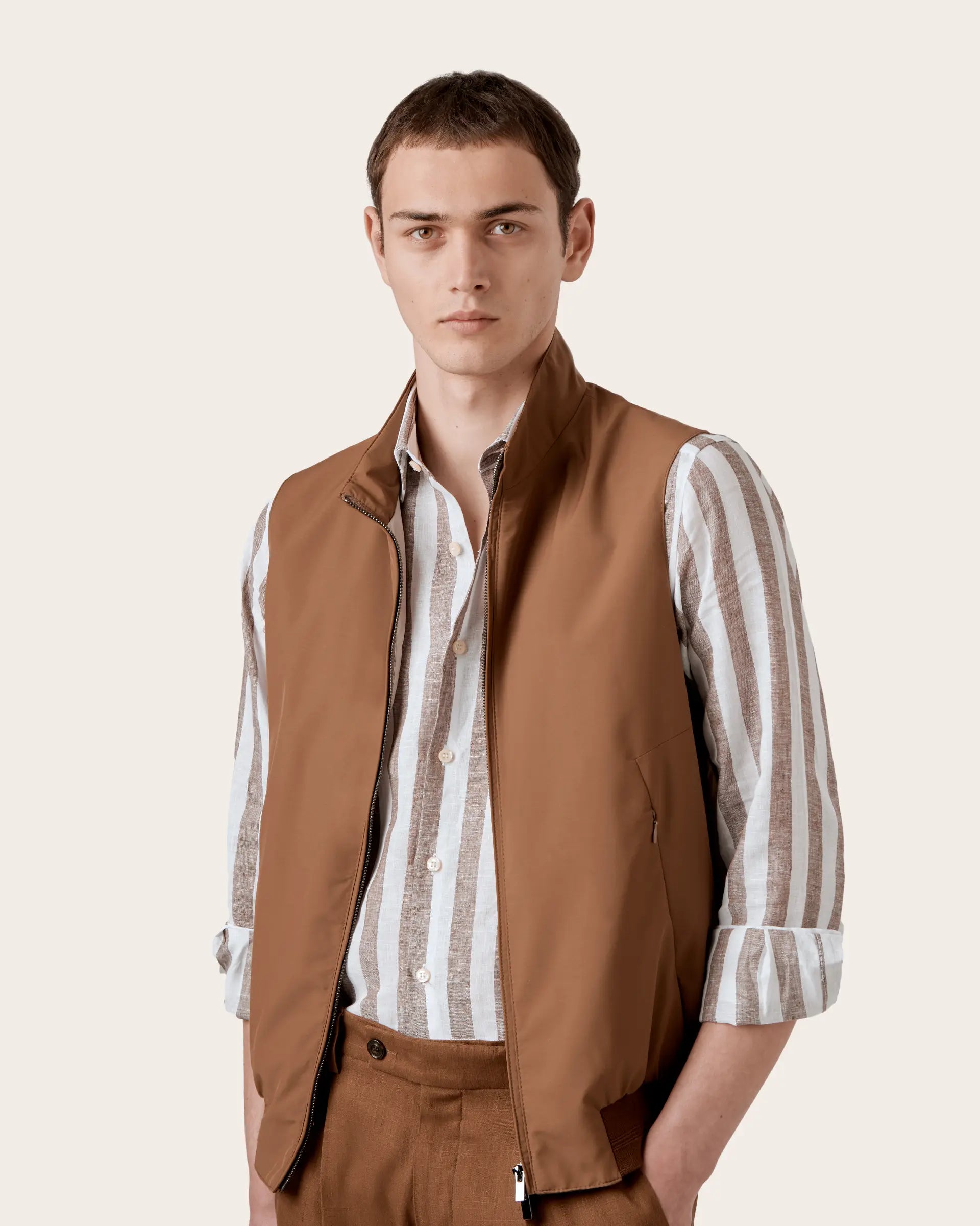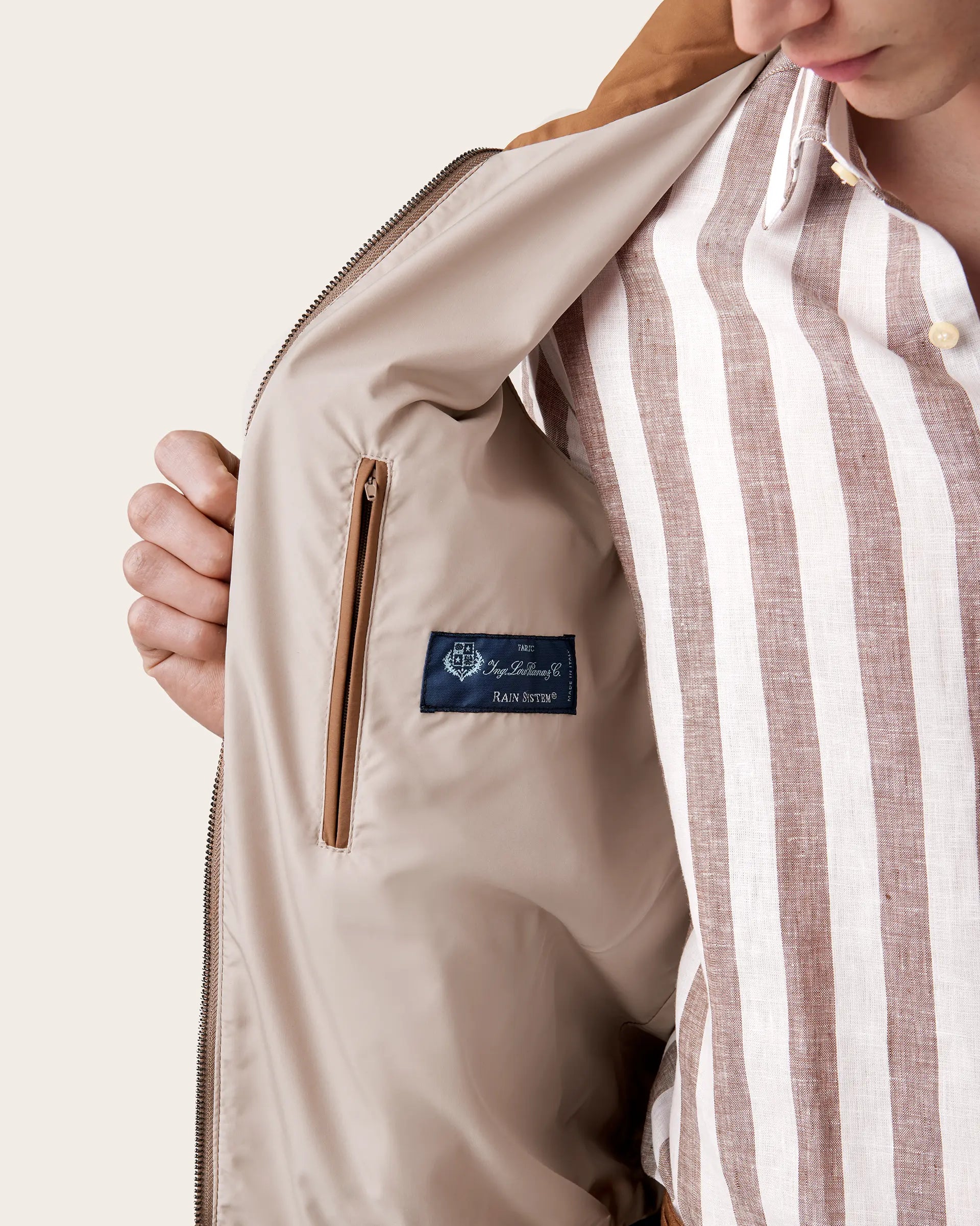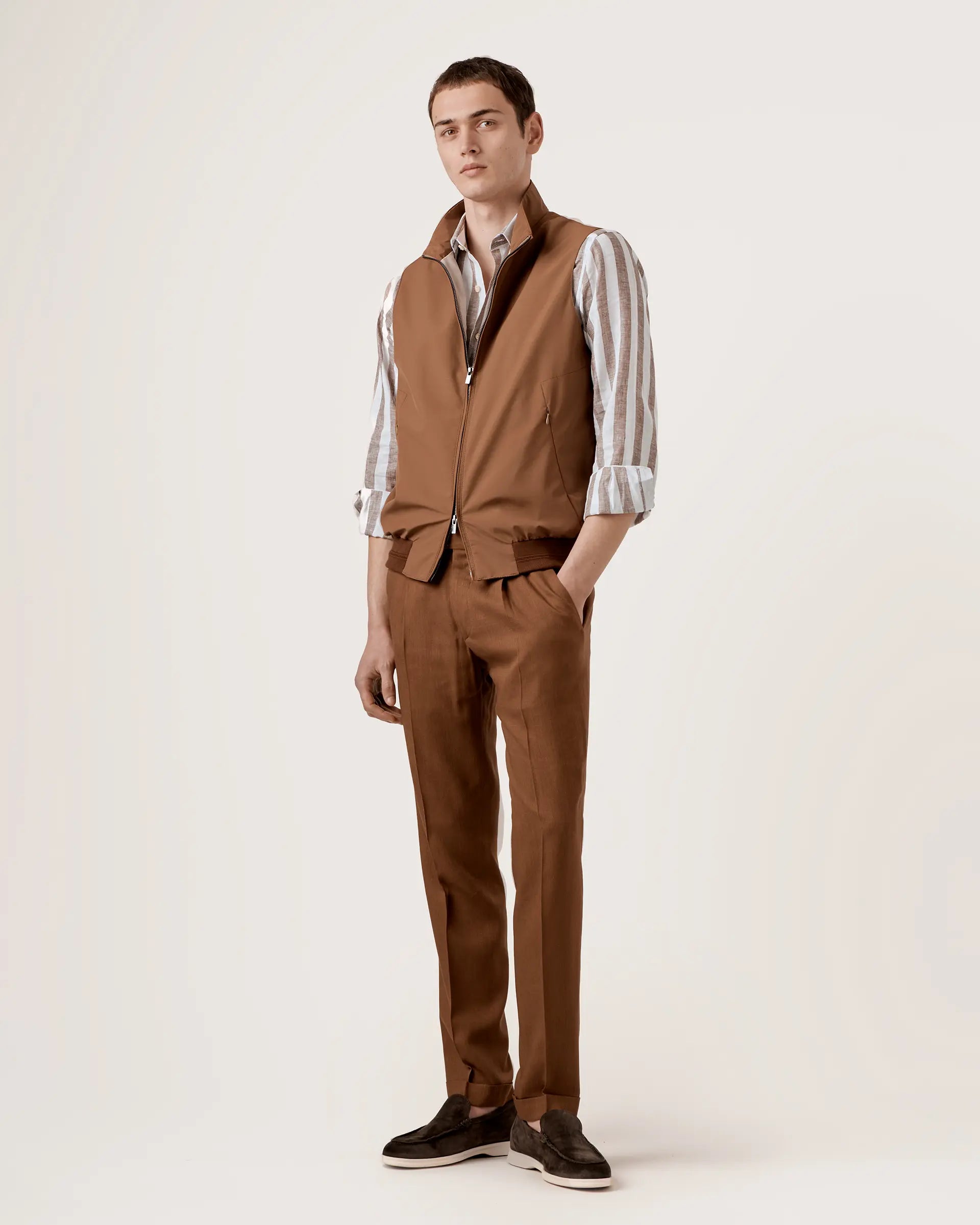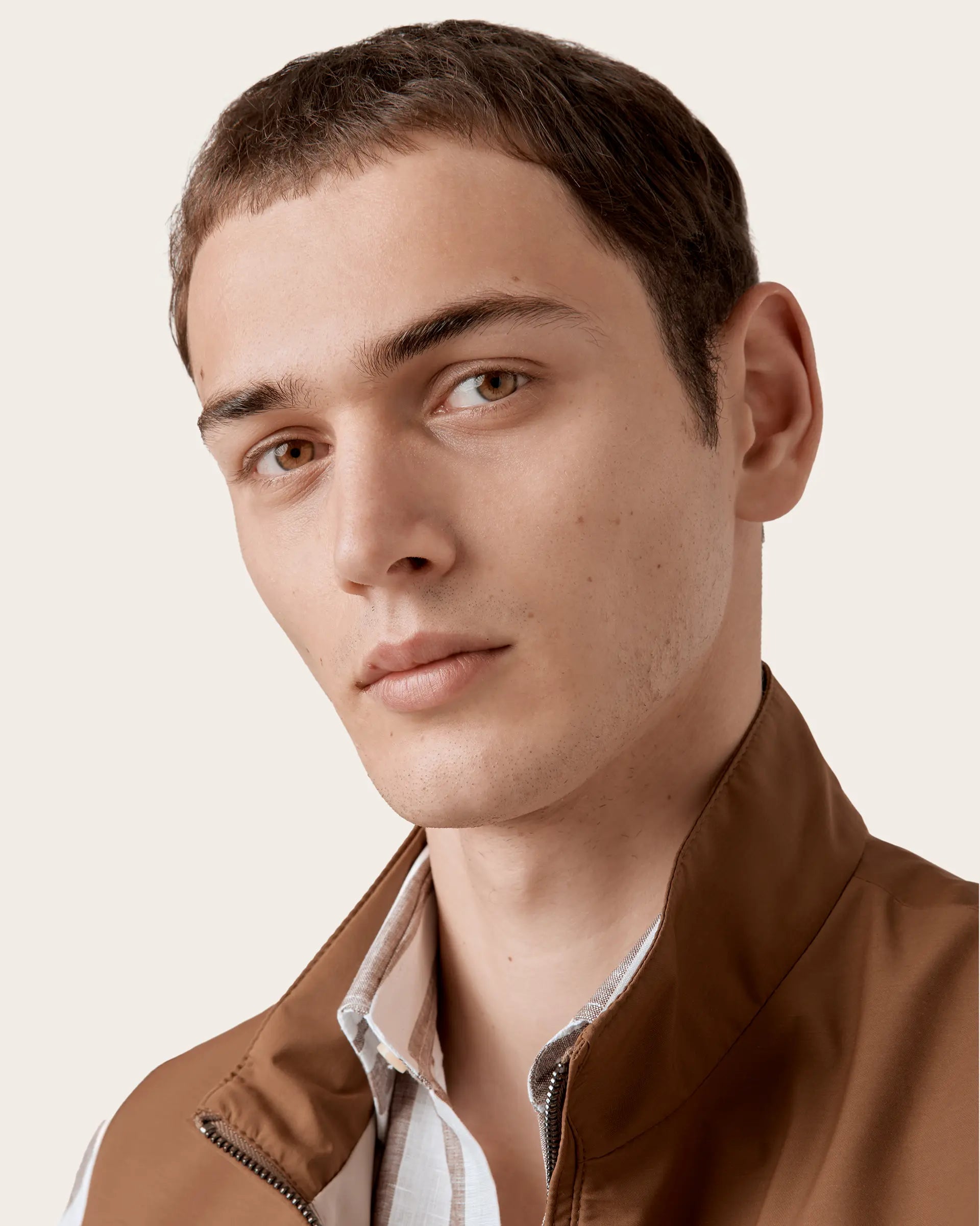 Outdoor garment with a sporty mood embellished with high-quality breathable and water-repellent fabric from the Loro Piana wool mill with a light lining in technical fabric. Made in a versatile and timeless color, it is enhanced by refined details such as the double-slider zip and the slanted pockets with concealed zips. The contrasting details make it perfect for the metropolitan look and for refined layering.