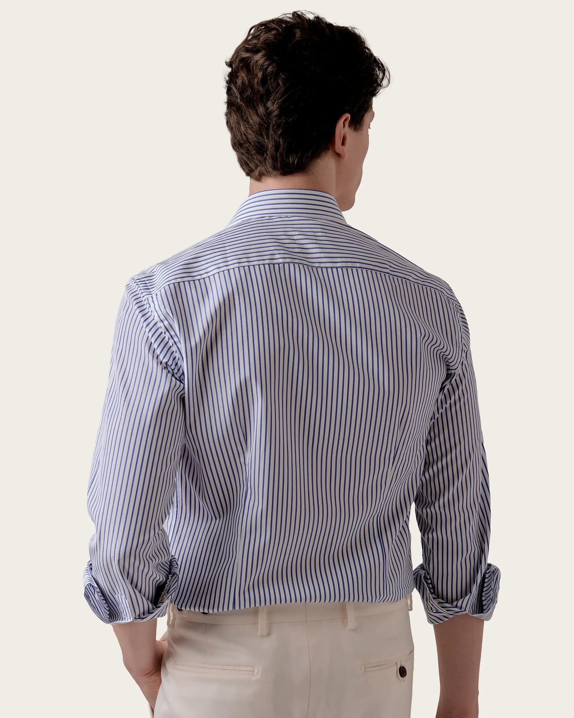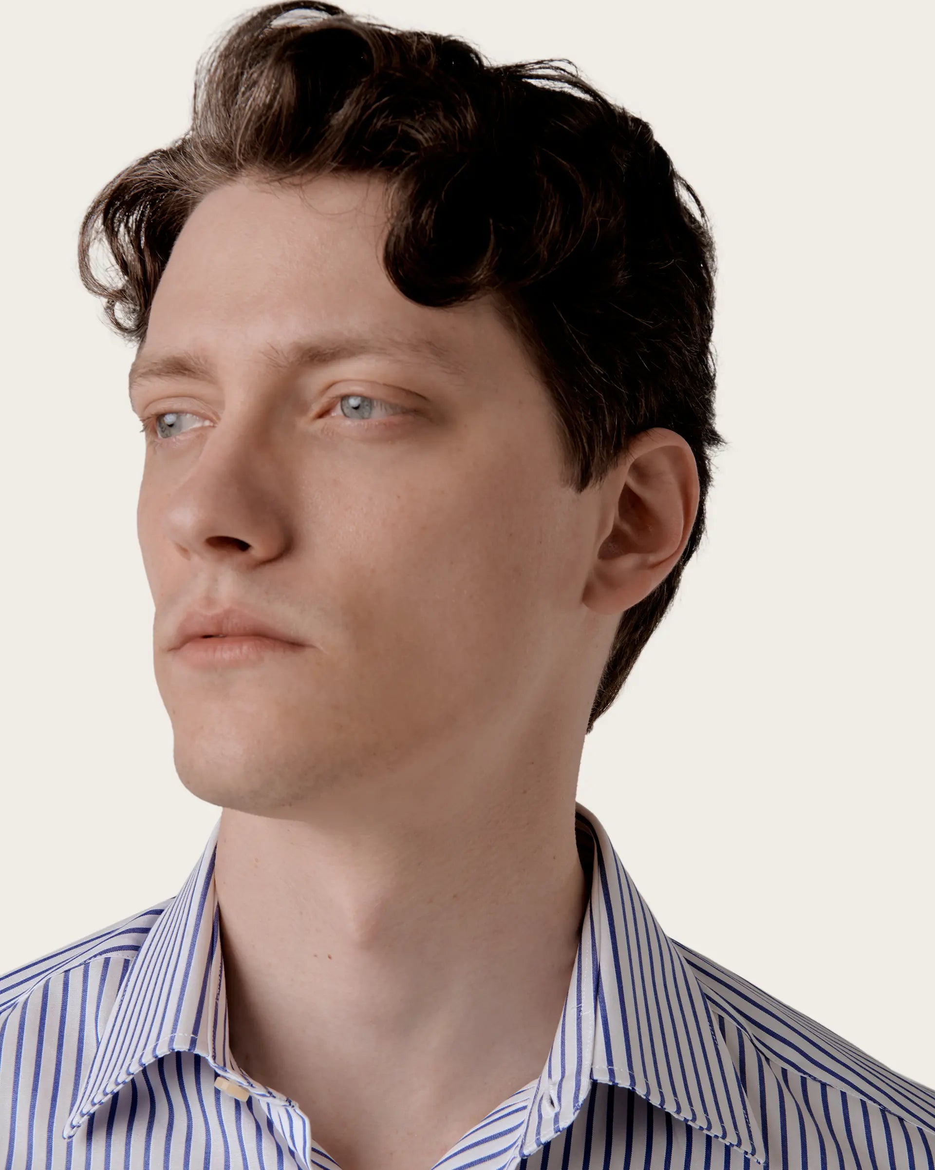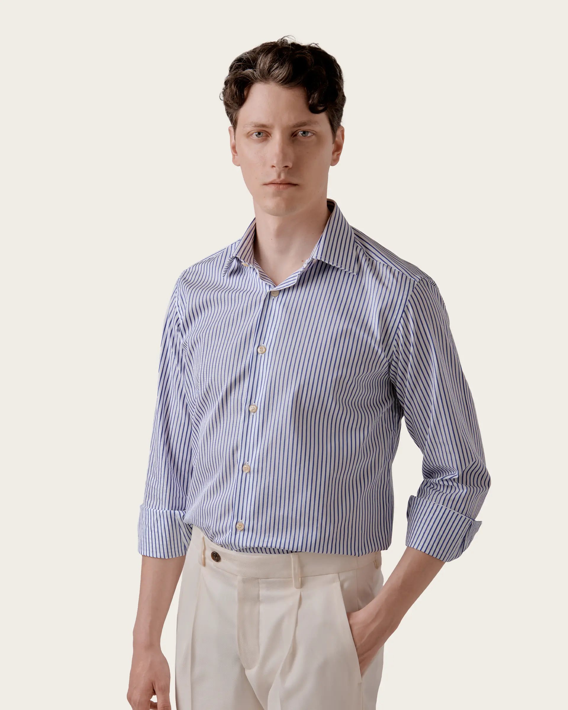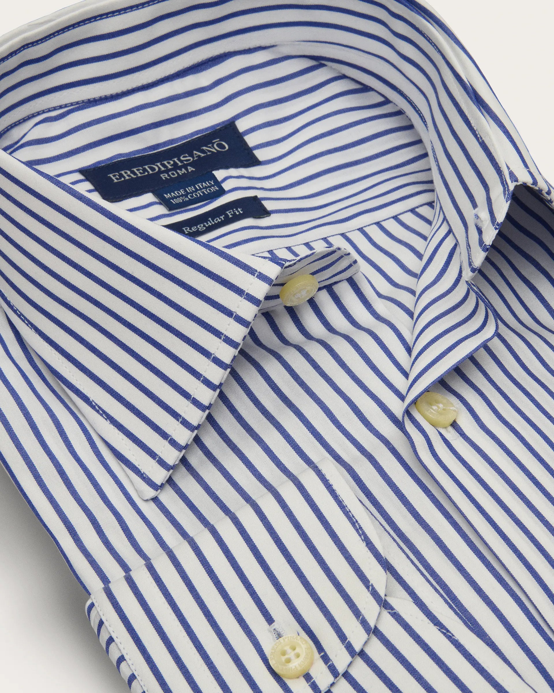 Tailored shirt made of pure double twisted cotton with a renewed Italian collar, a great classic presented in an updated version suitable for more formal occasions but also for everyday life. It is proposed in the comfortable regular fit with a vertical striped pattern alternating with white and is perfect for free time or to liven up more formal looks.