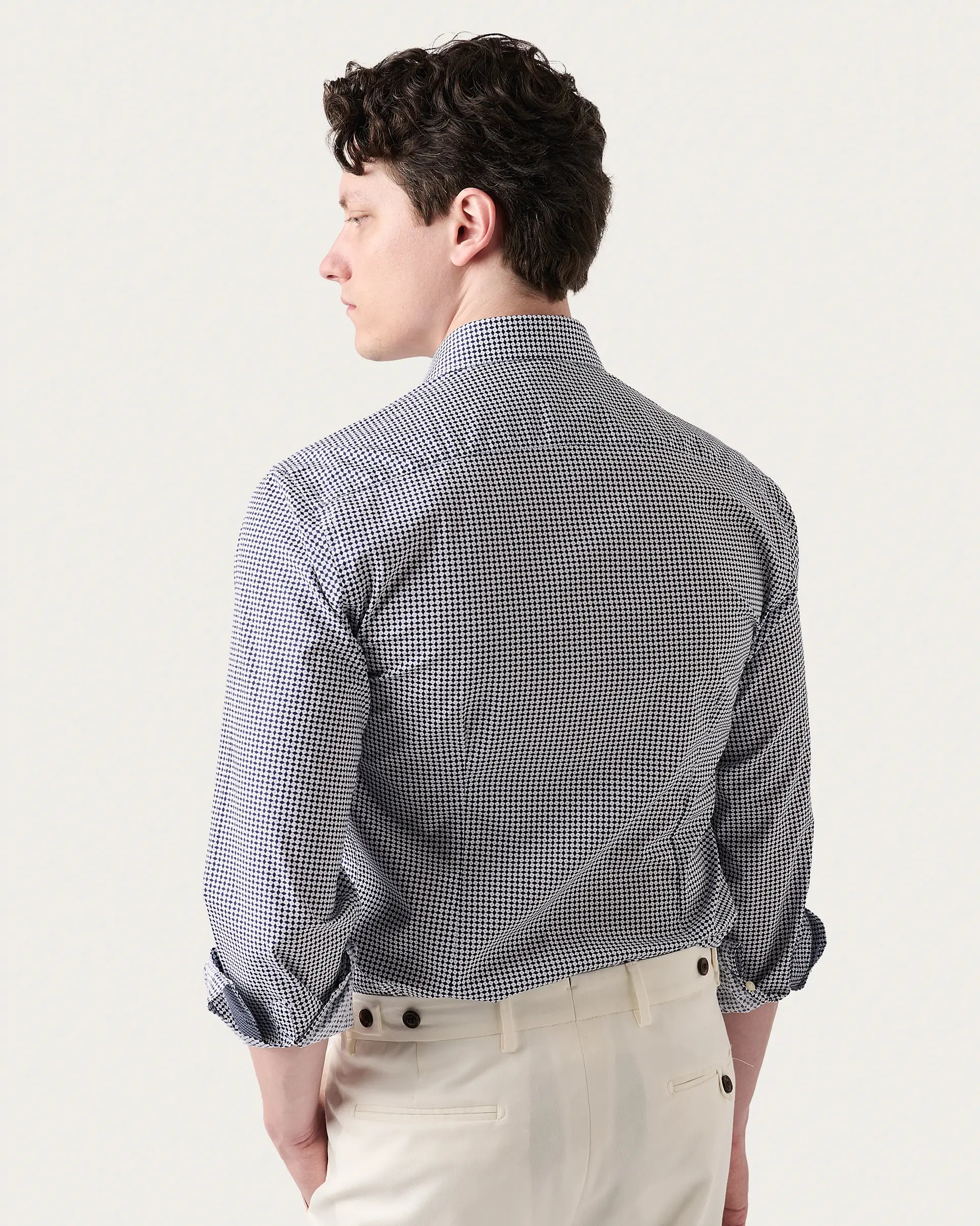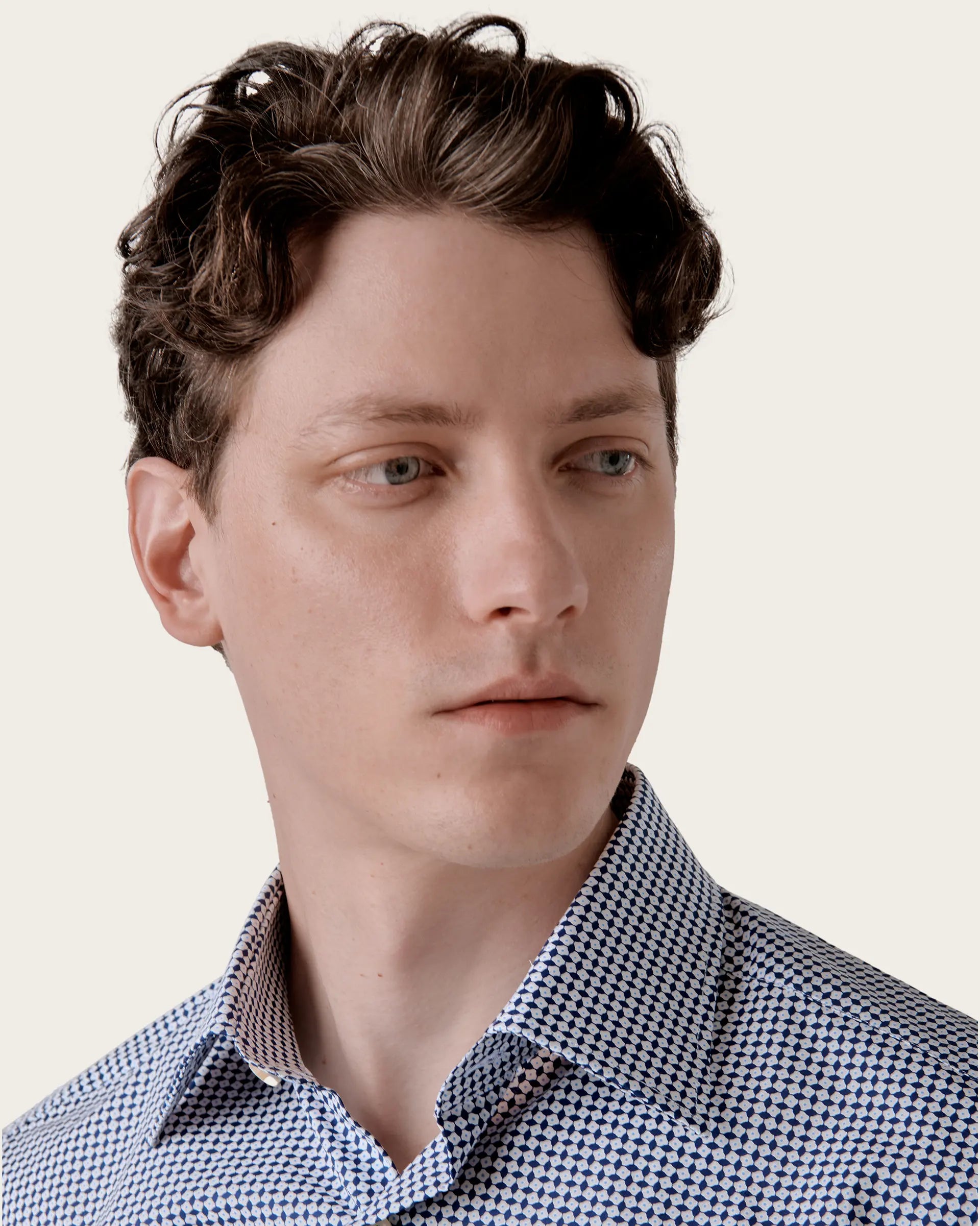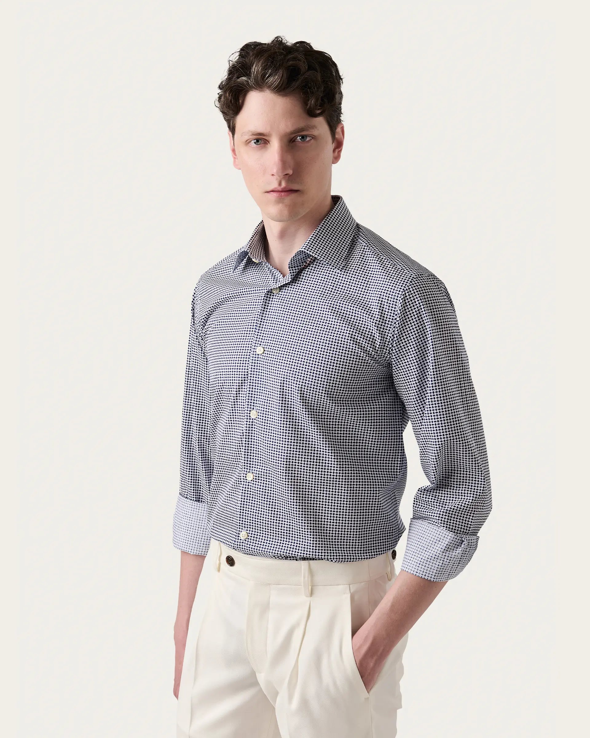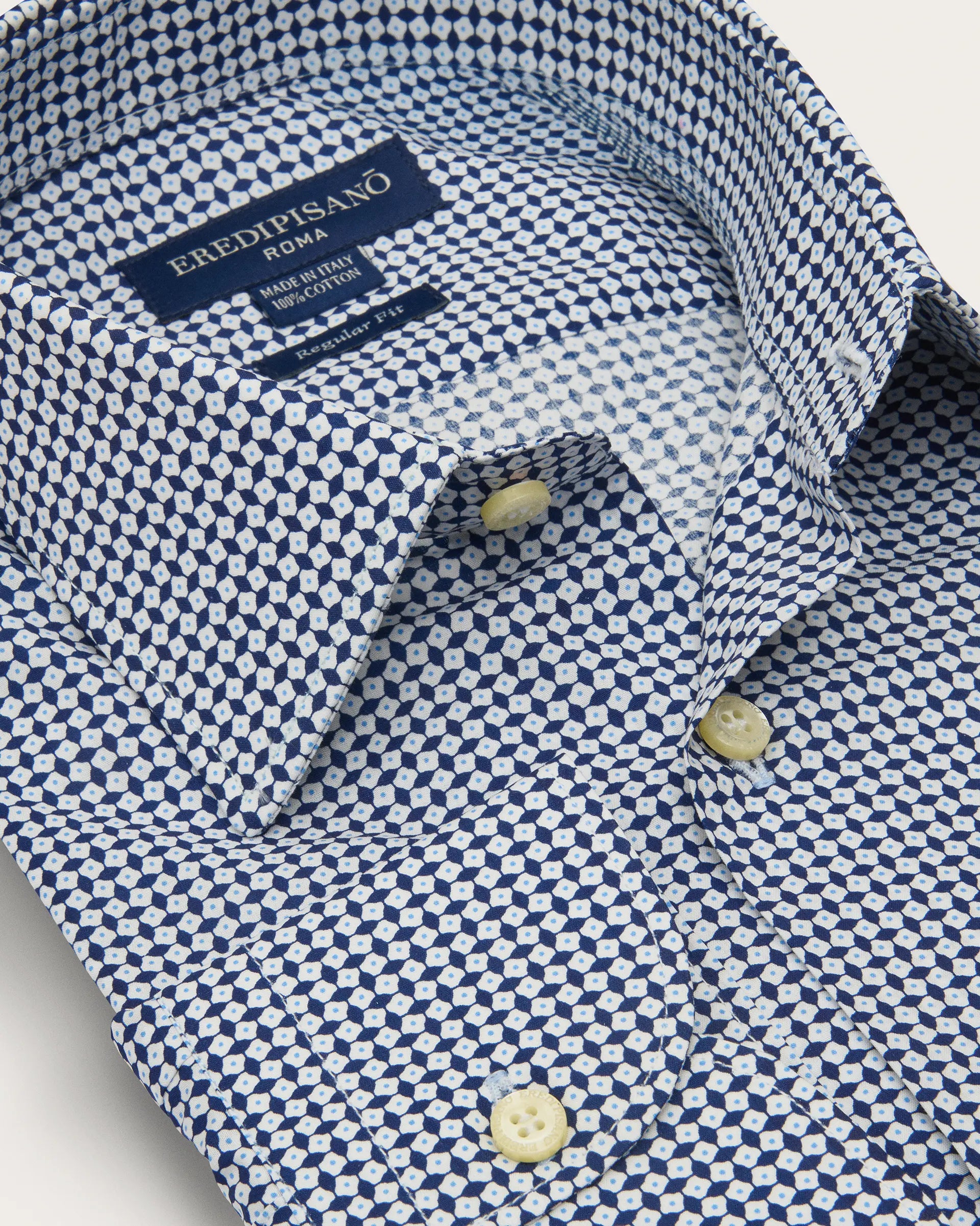 Tailored shirt made of pure double twisted cotton with a renewed Italian collar, a great classic presented in an updated version suitable for more formal occasions but also for everyday life. It is proposed in the comfortable regular fit in a pattern with a geometric motif that gives a touch of originality and elegance without sacrificing sobriety.