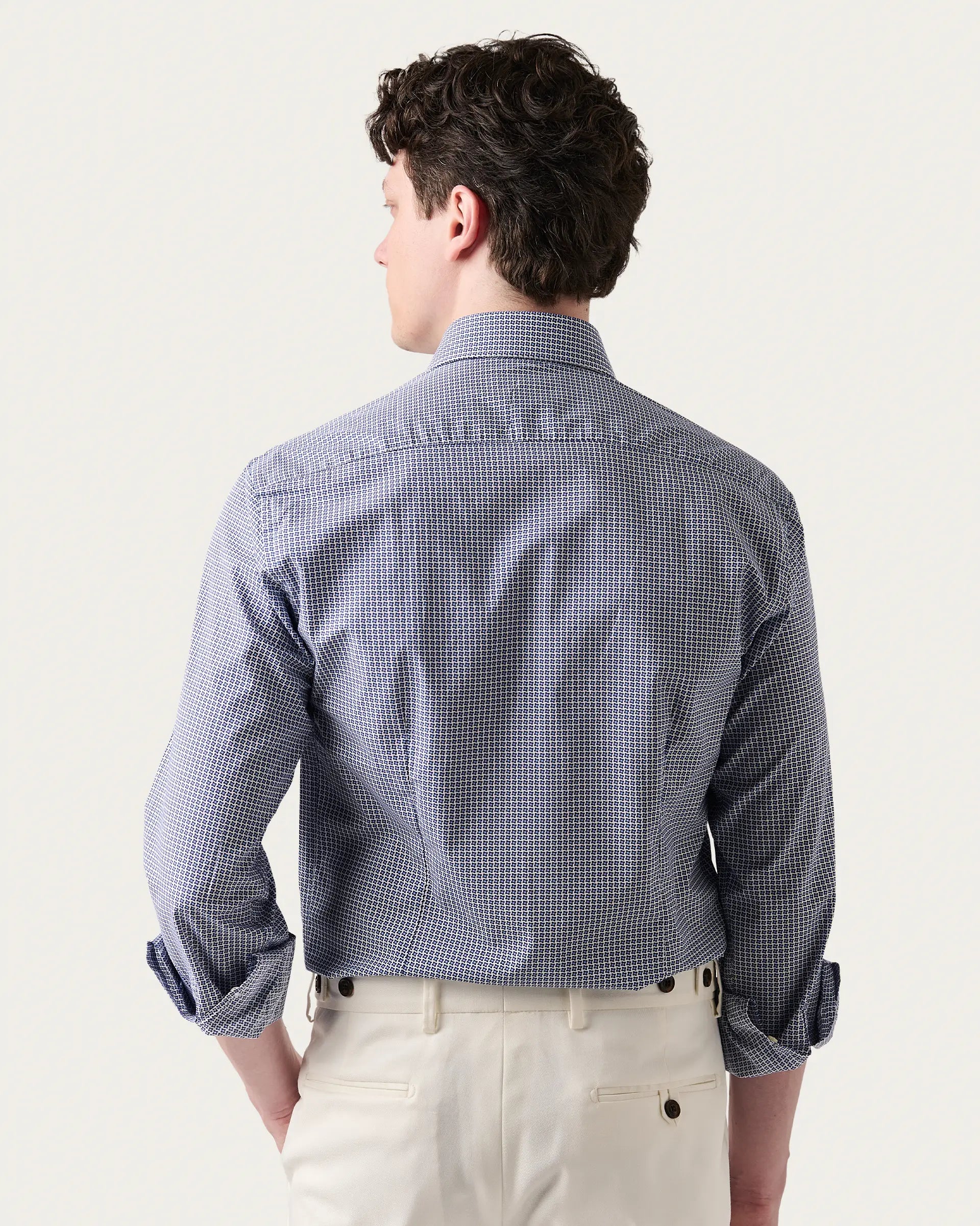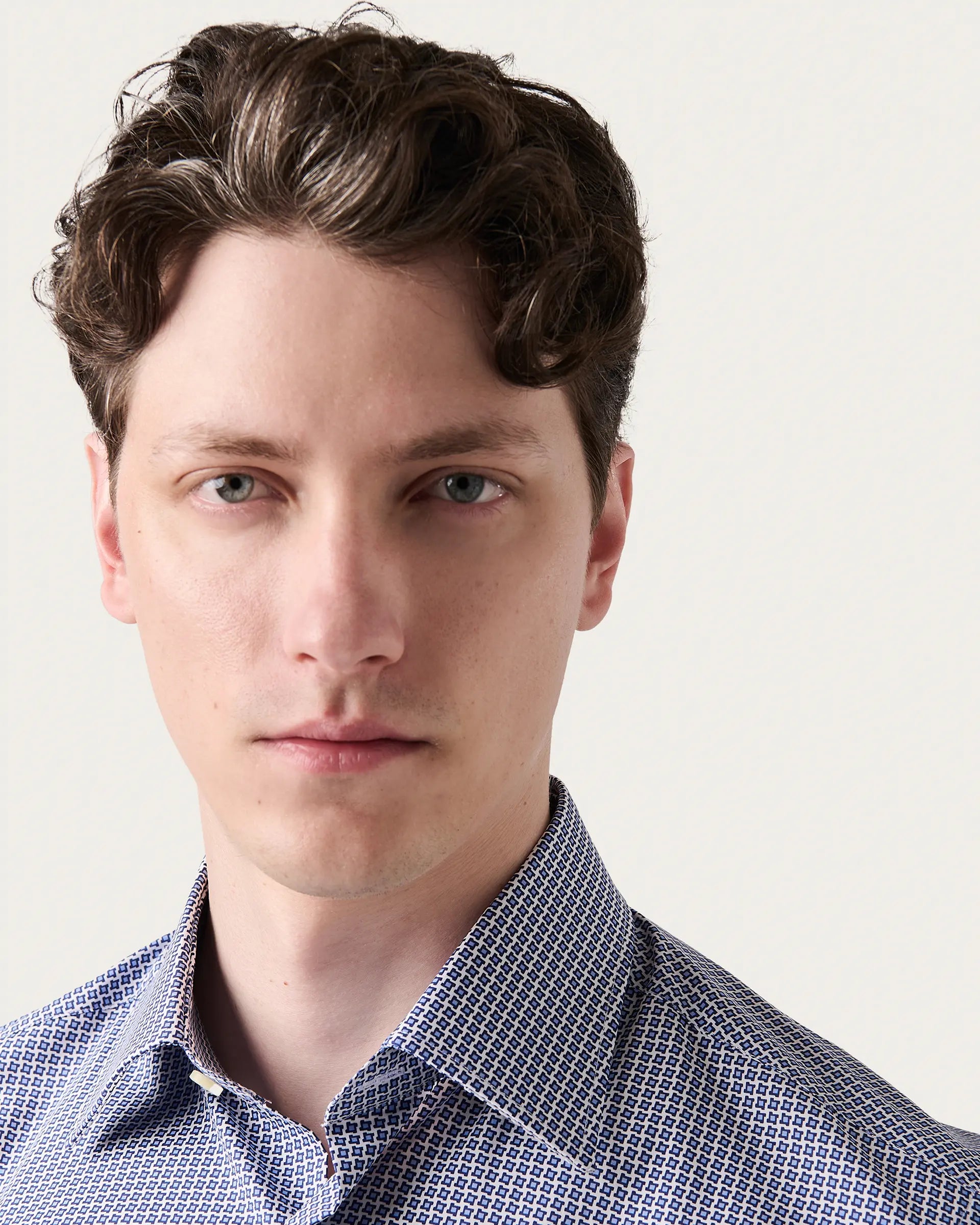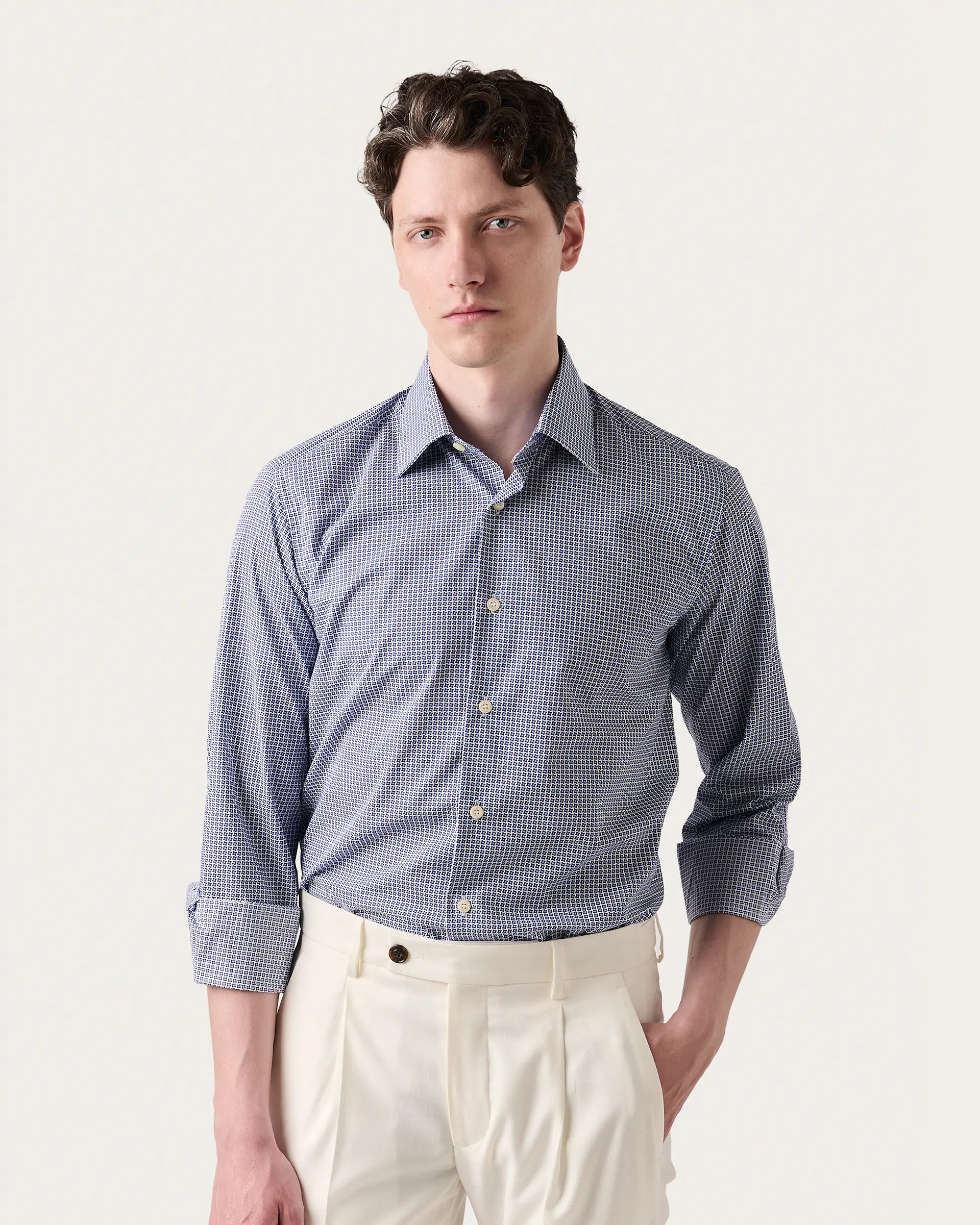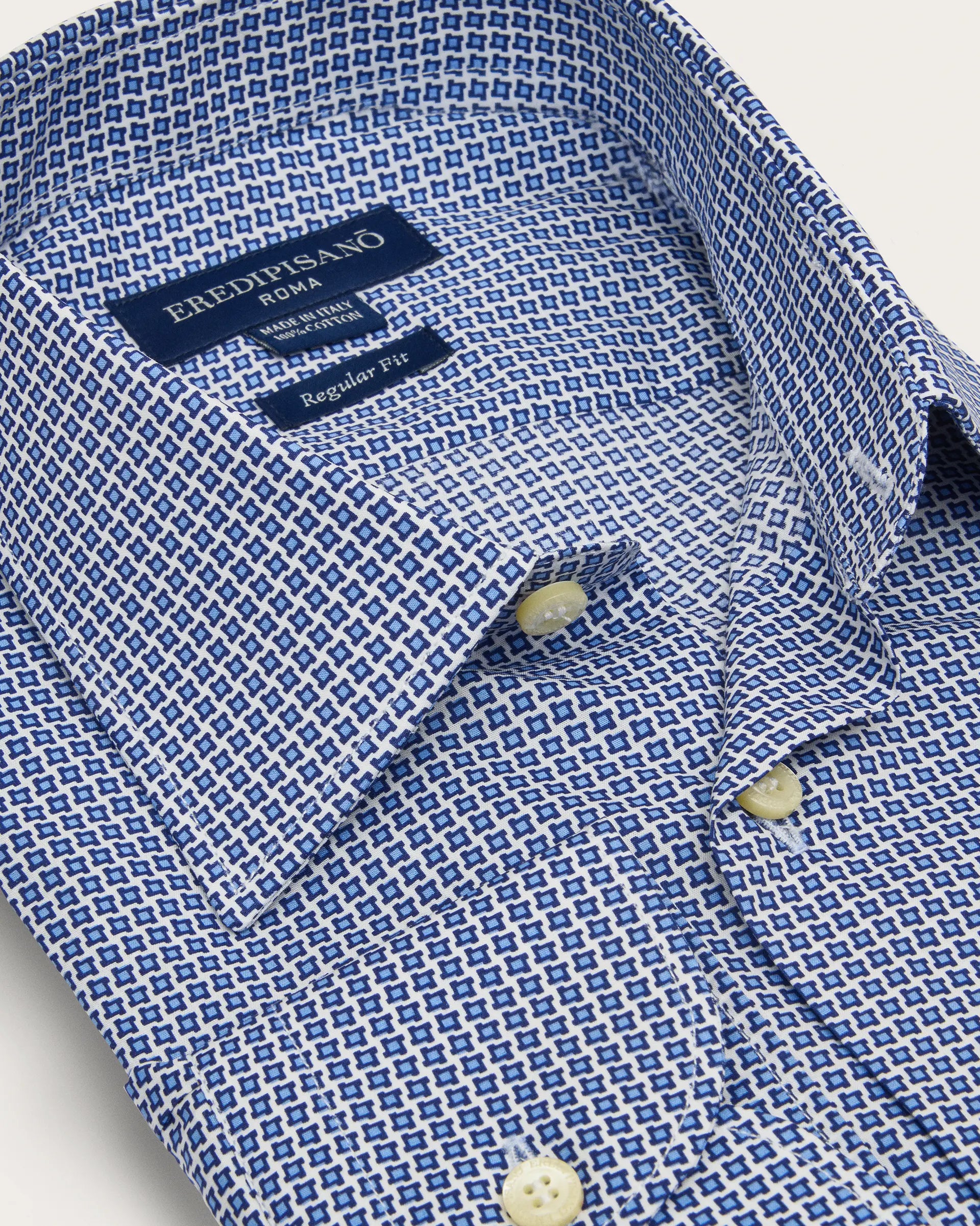 Tailored shirt made of pure double twisted cotton with a renewed Italian collar, a great classic presented in an updated version suitable for more formal occasions but also for everyday life. It is proposed in the comfortable regular fit in a pattern with a geometric motif that gives a touch of originality and elegance without sacrificing sobriety.