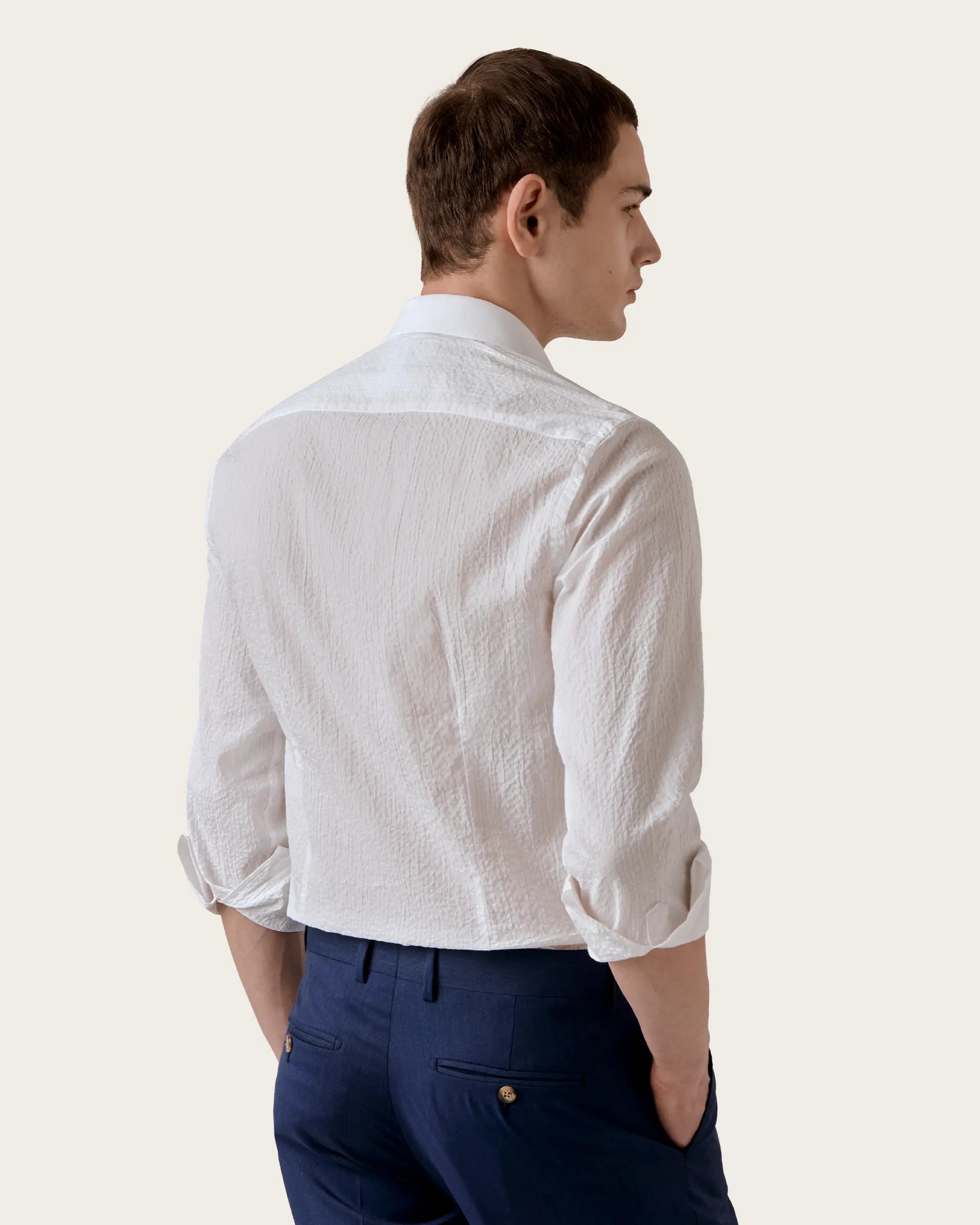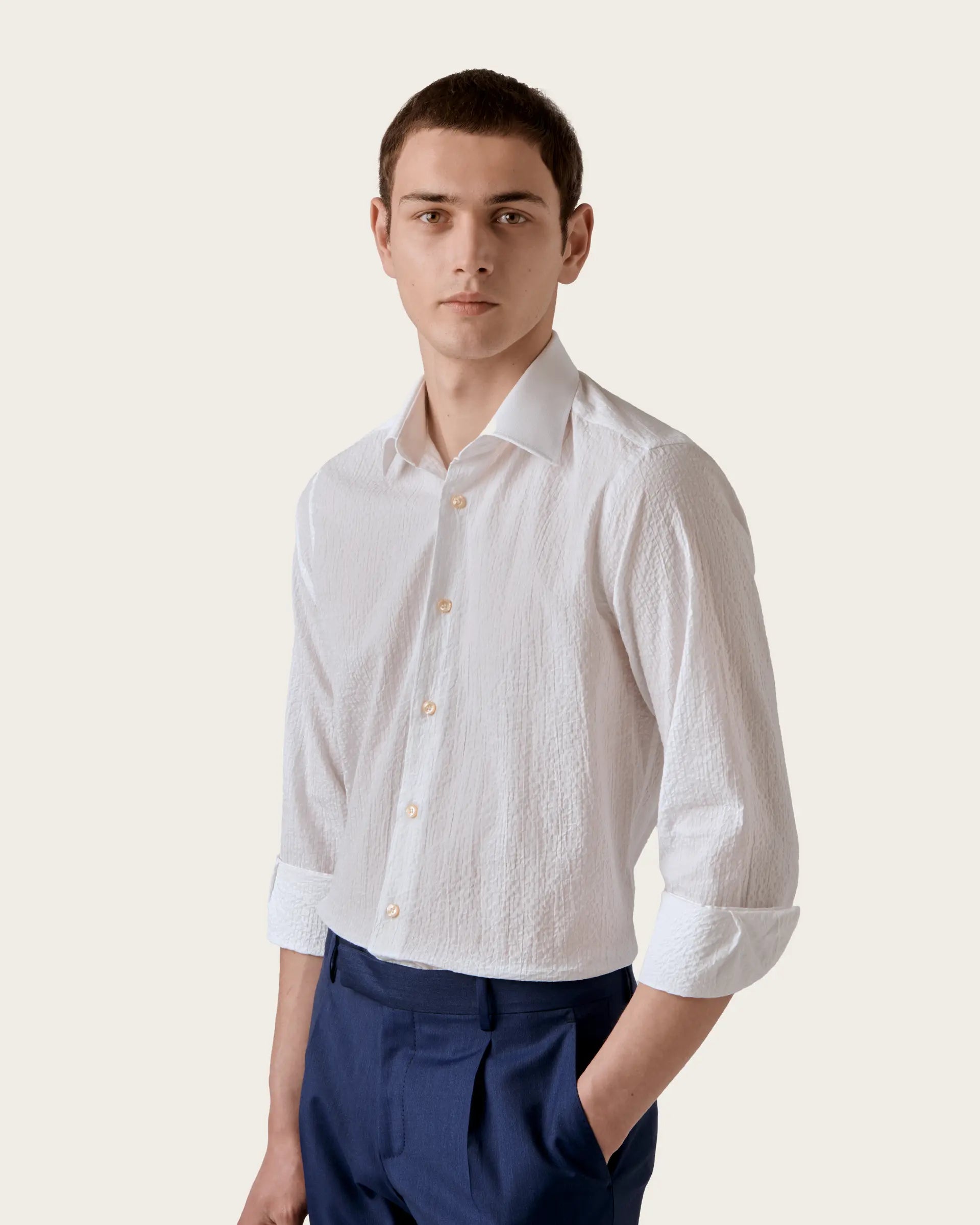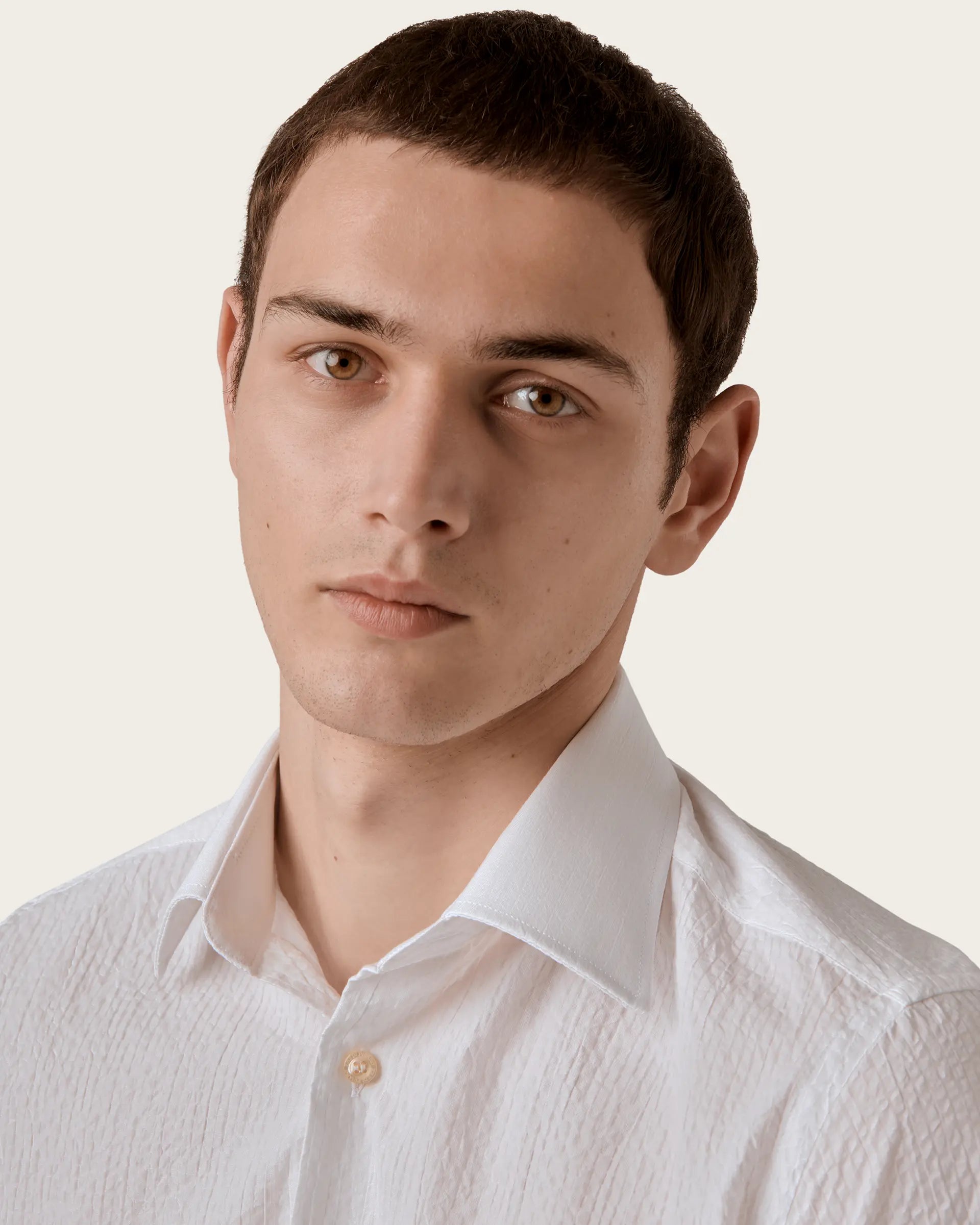 Tailored shirt made of pure double twisted cotton with a renewed Italian collar, a great classic presented in an updated version suitable for more formal occasions but also for everyday life. The surface of the fabric, slightly corrugated, promotes transpiration and makes this garment particularly light and fresh. Offered in the regular tailored version in a single color, this shirt represents an obligatory choice for the male wardrobe.