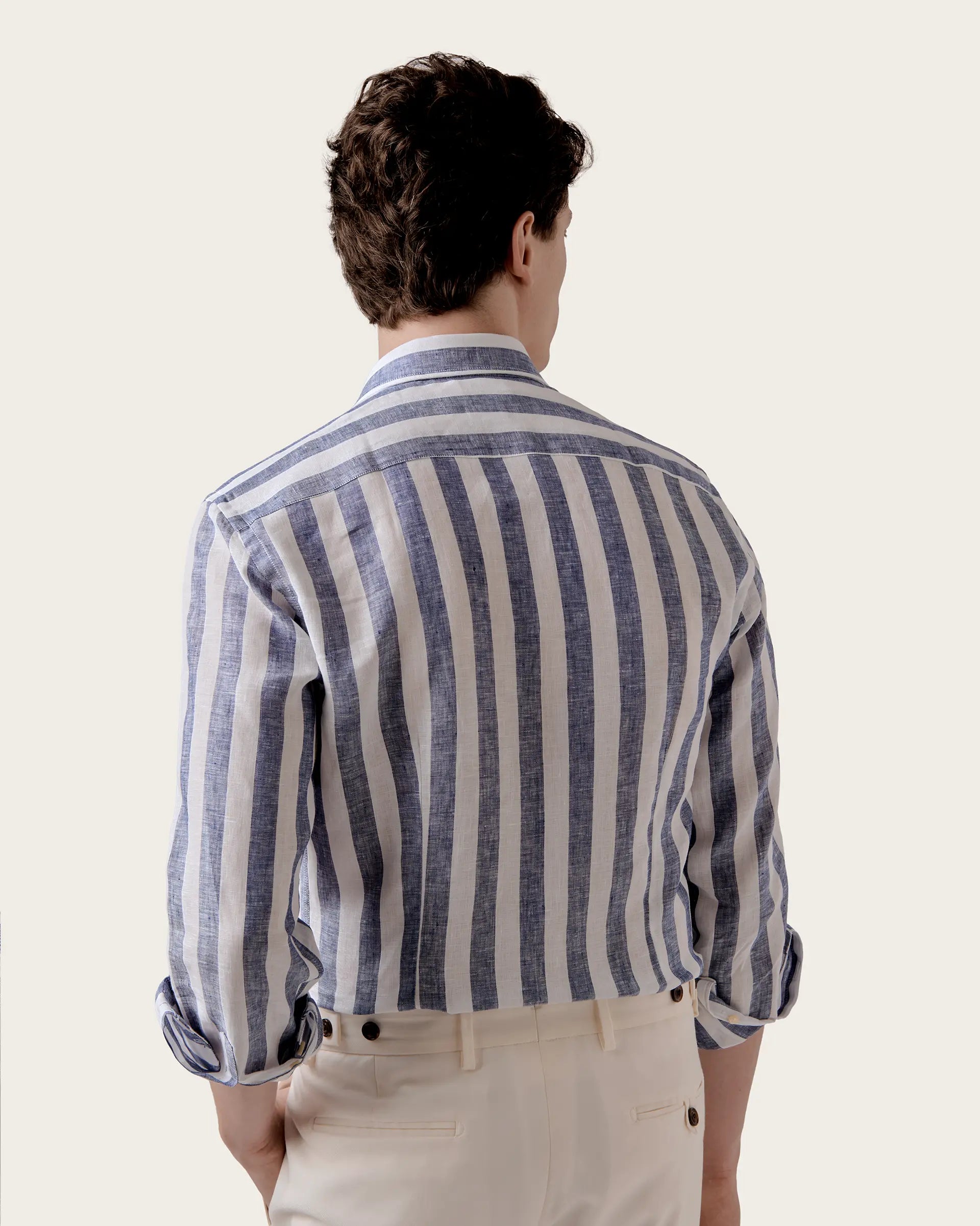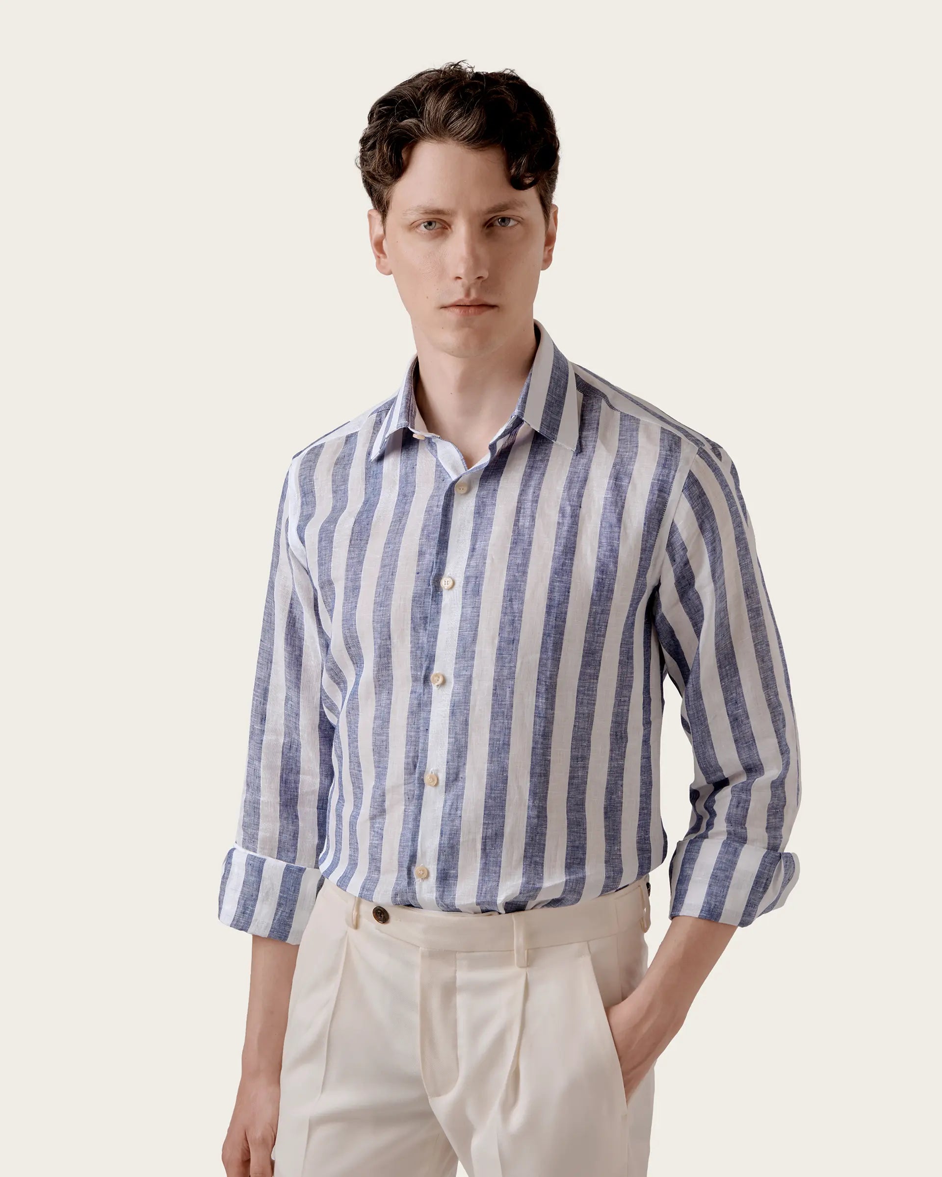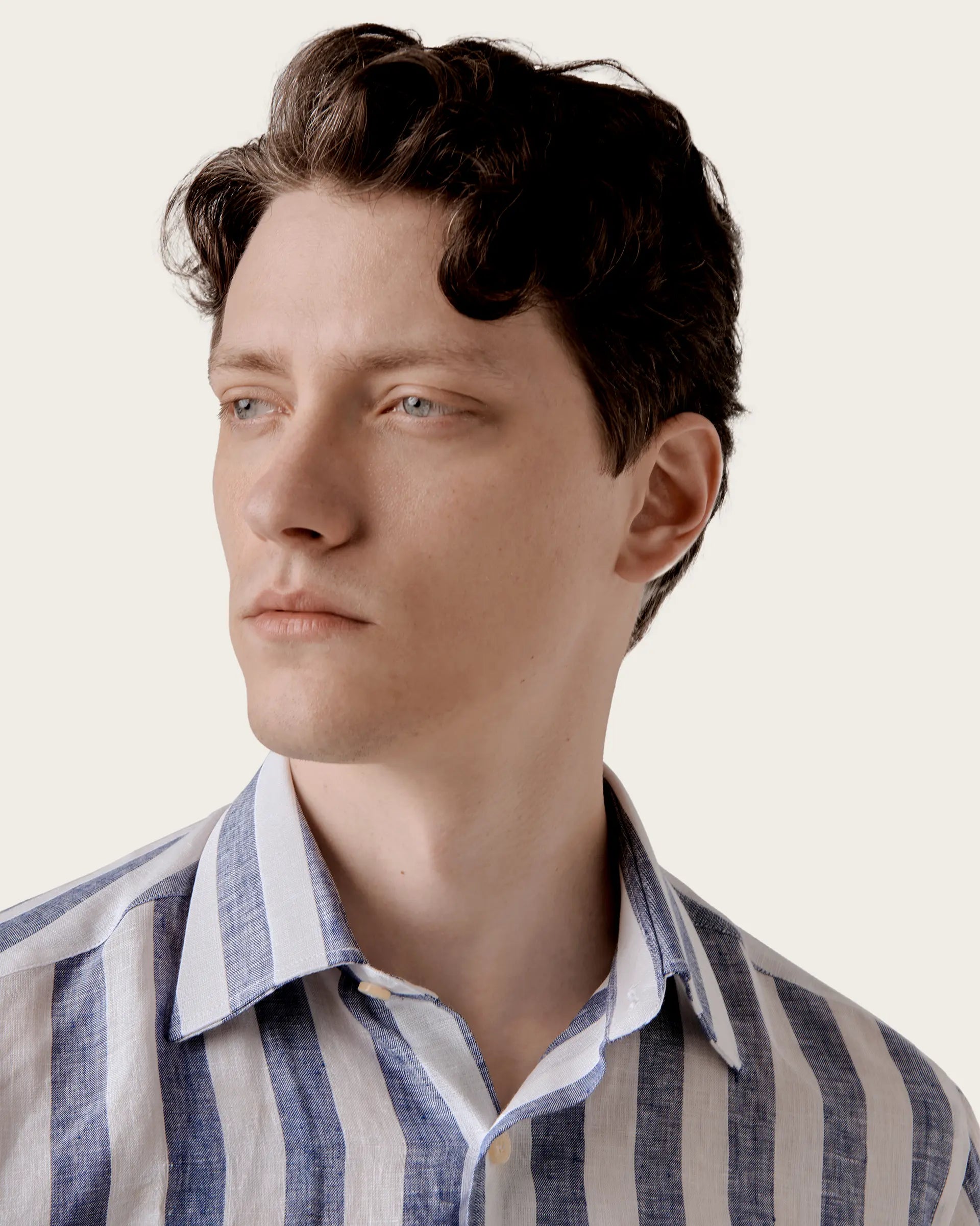 Tailored shirt made of pure linen with a renewed Italian collar, a great classic presented in an updated version suitable for more formal occasions but also for everyday life. It is proposed in the comfortable regular fit in a fresh and light fabric characterized by the summery taste of a refined rather wide striped pattern declined in seasonal nuances.