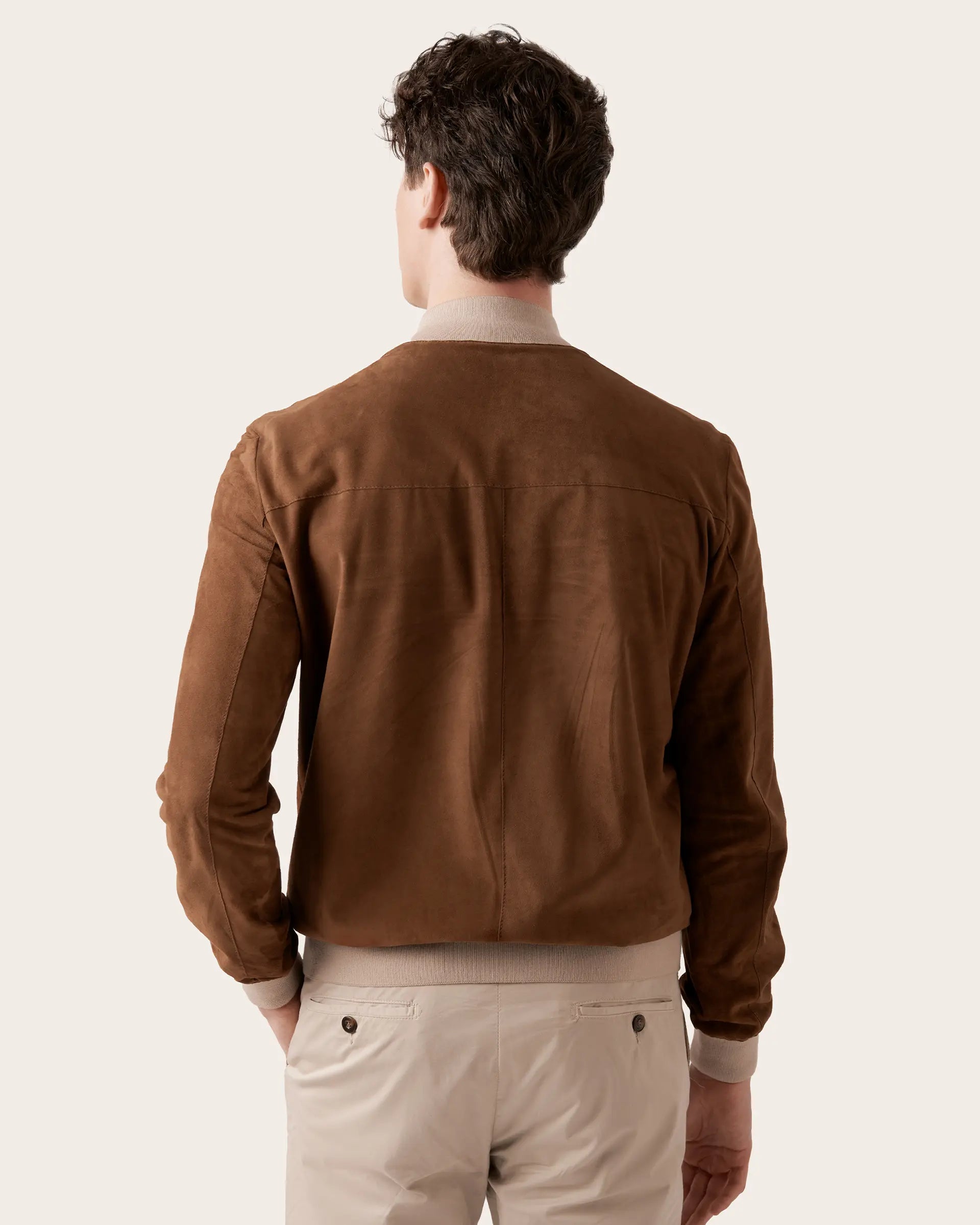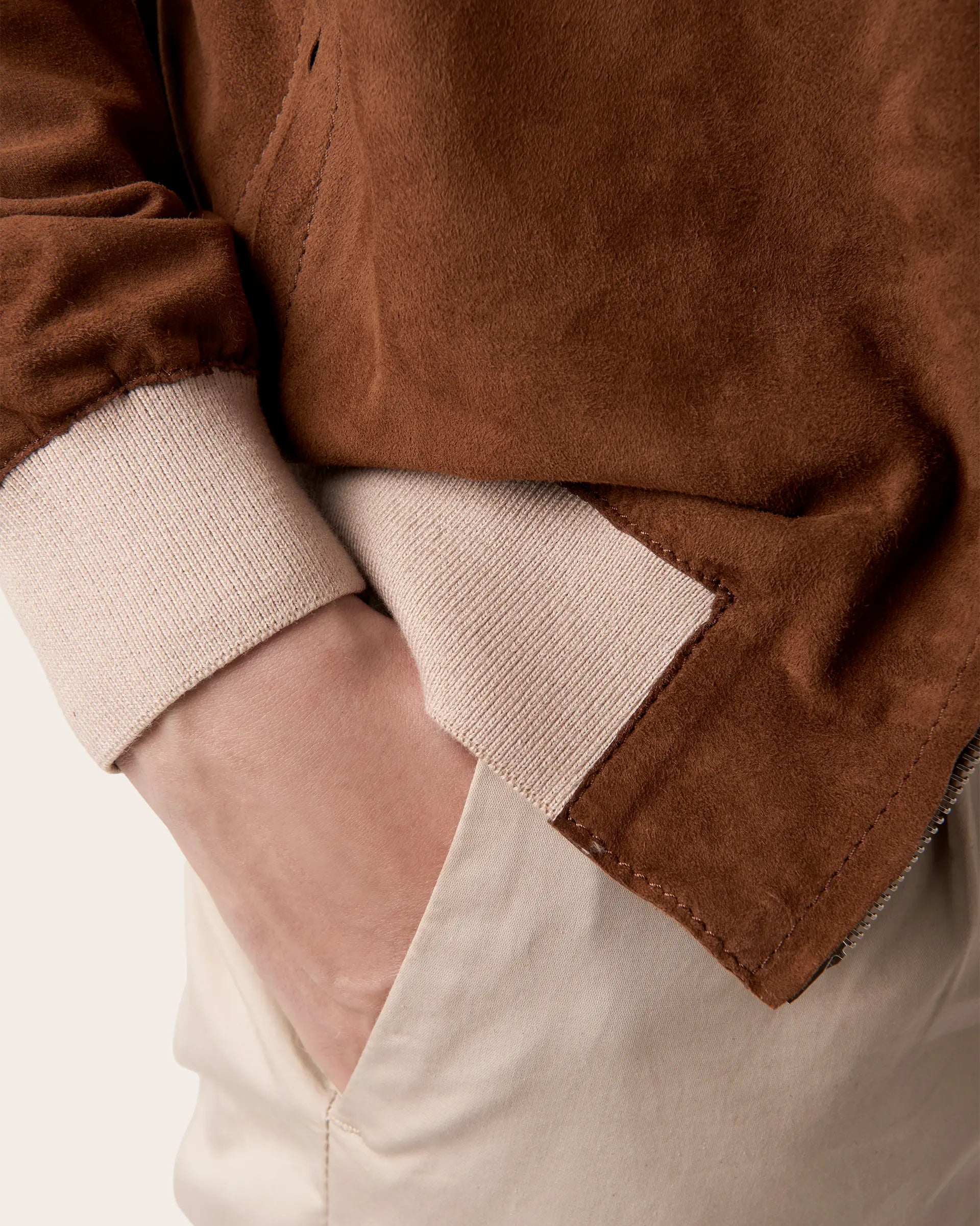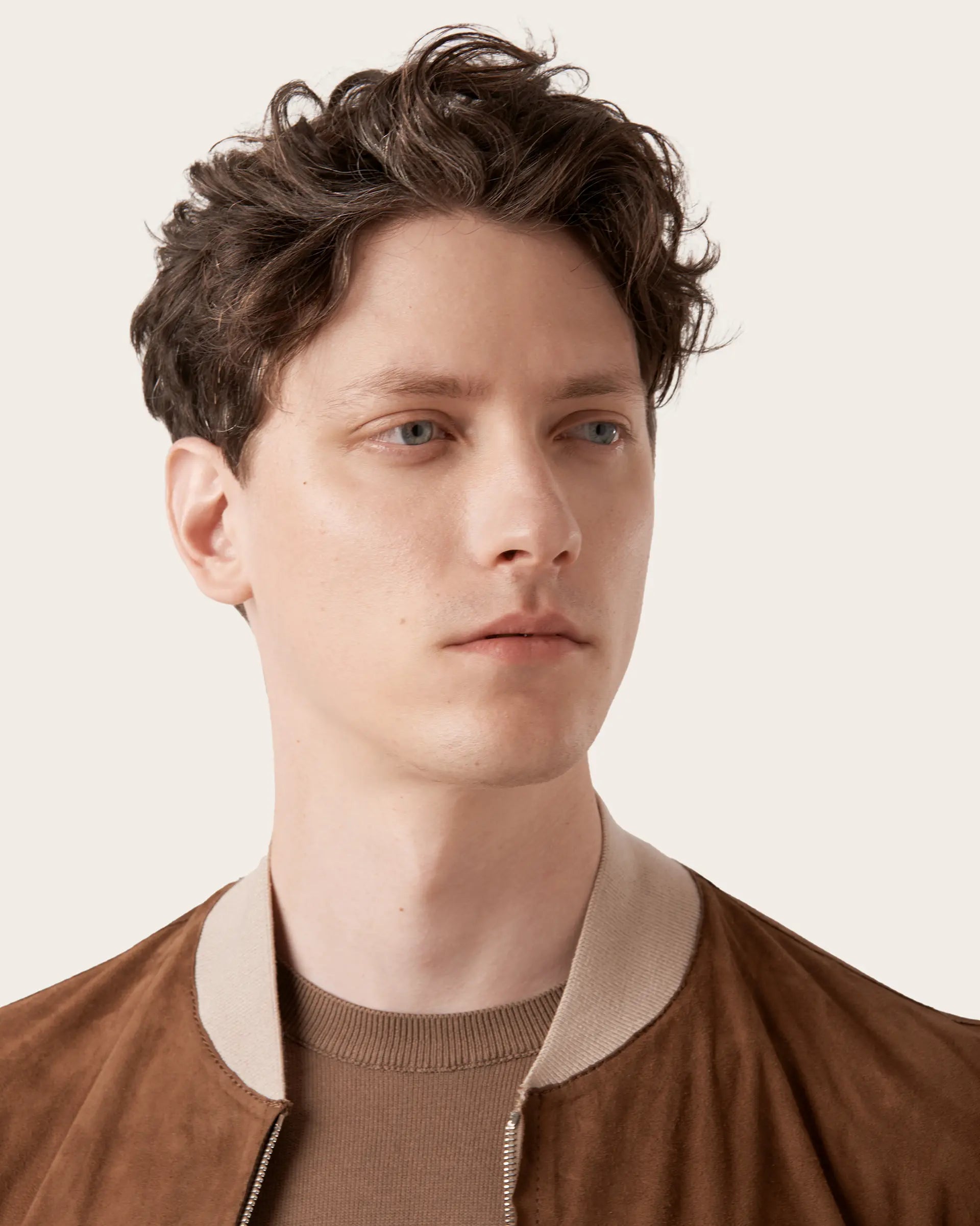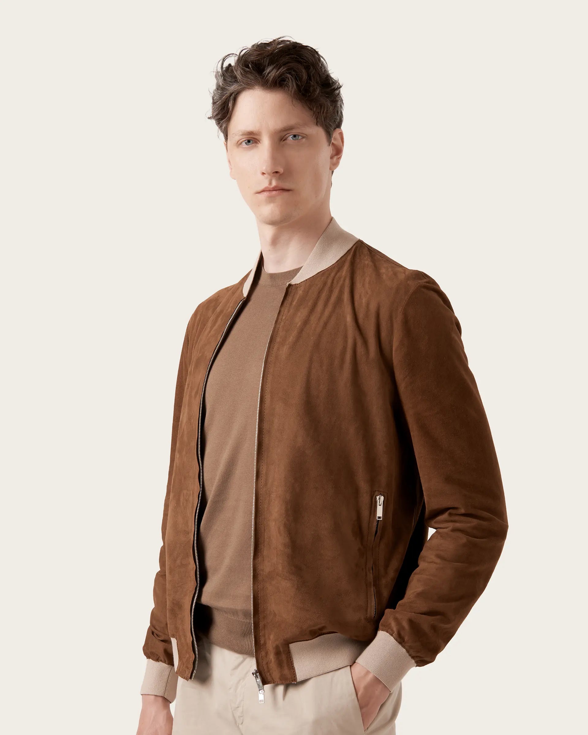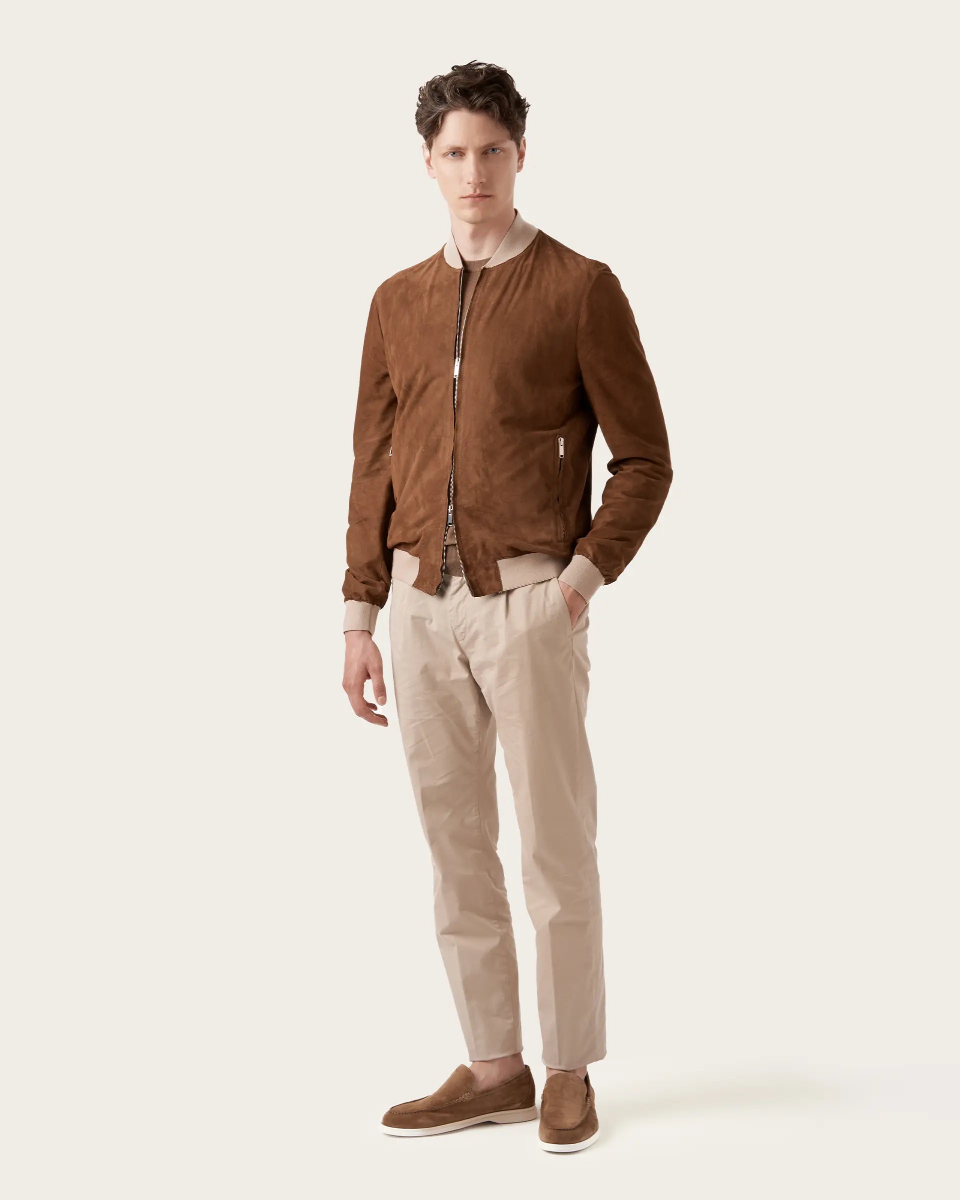 Bomber with a sophisticated and timeless charm made of a fine nappa and unlined suede. The refined design is enhanced by the refined contrasts on the edges, on the collar and on the cuffs and by practical elements such as the central double-slider zip, the slanted pockets. A contemporary piece of clothing, which does not go unnoticed, where luxury and practicality meet. Designed for the man who makes exclusivity his distinctive feature.