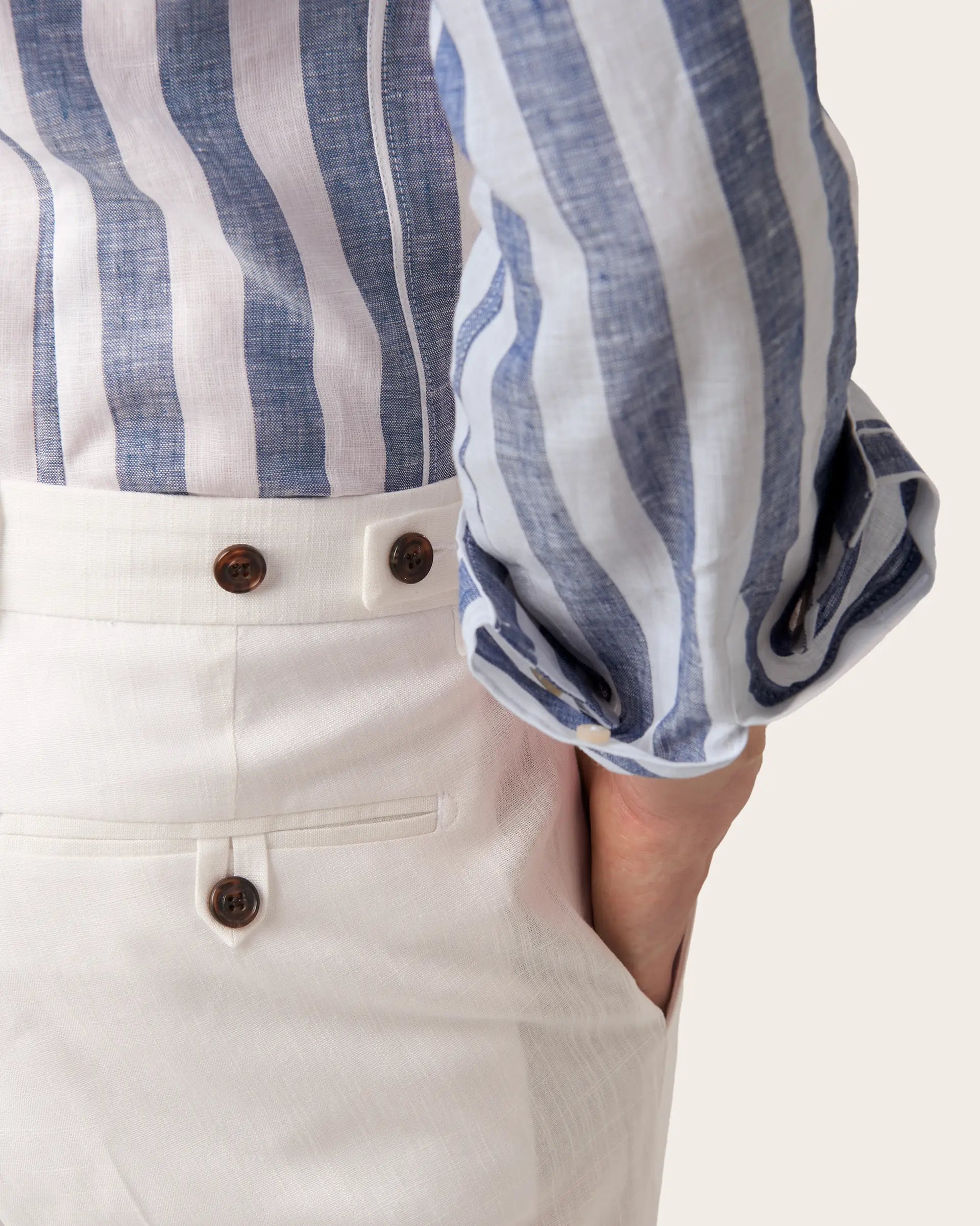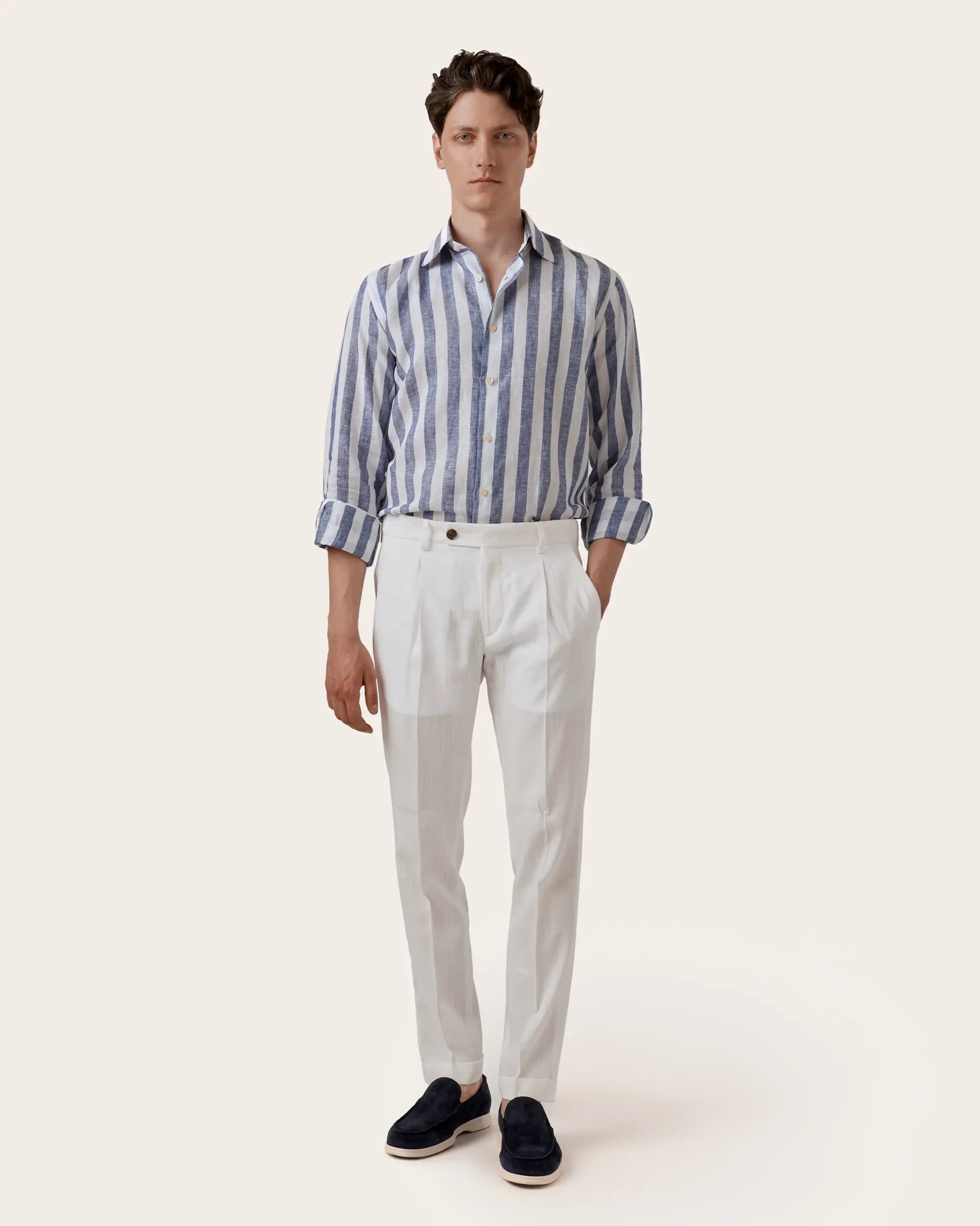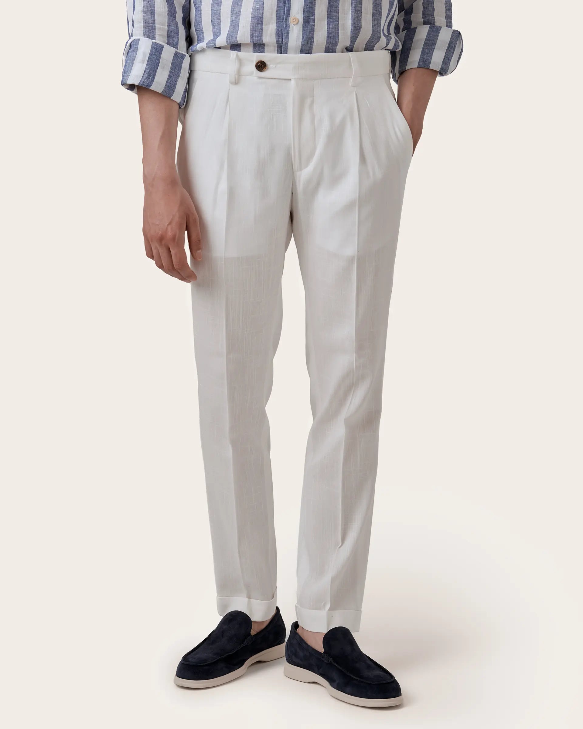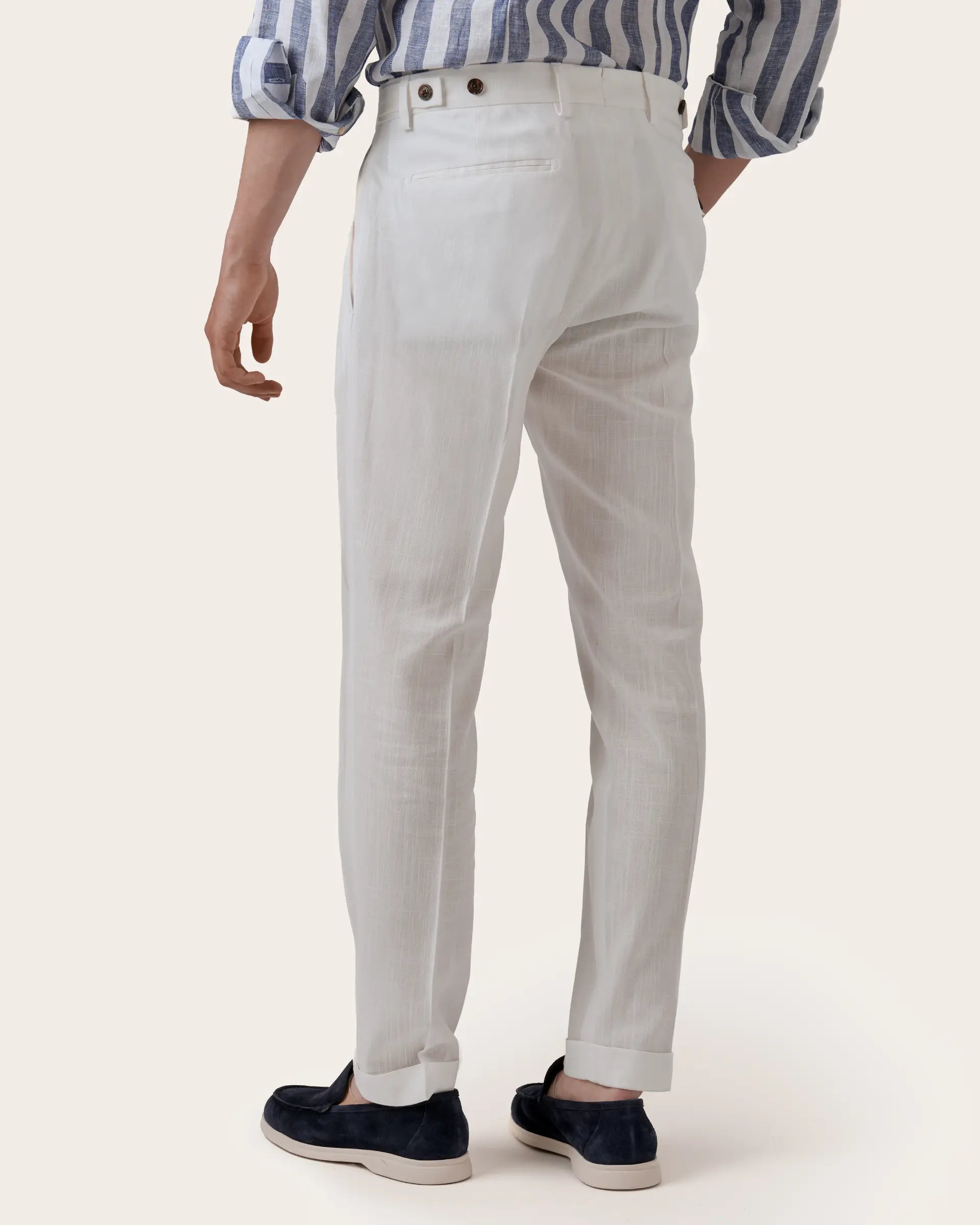 From a balanced blend of linen and viscose with the combination of elastane that guarantees superior comfort, these tailored-inspired trousers with a characteristic uneven texture are born. Modern style and refined lines with soft volumes on the hips and a leg line close to the body. The leisure fit is enriched by the deep pleat and the button placket on the belt for a modern and refined style. An exclusive pair of trousers to combine in different seasonal looks.