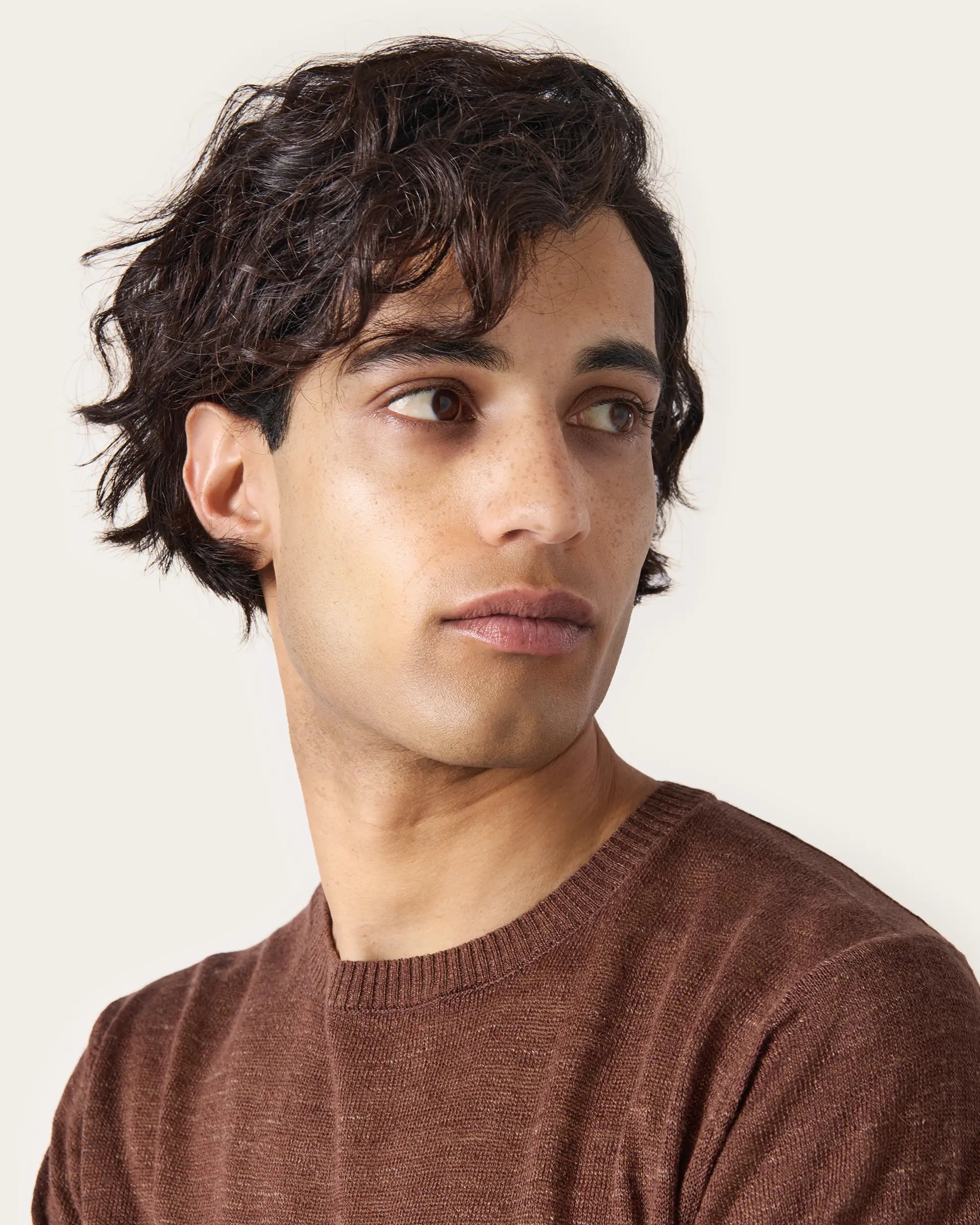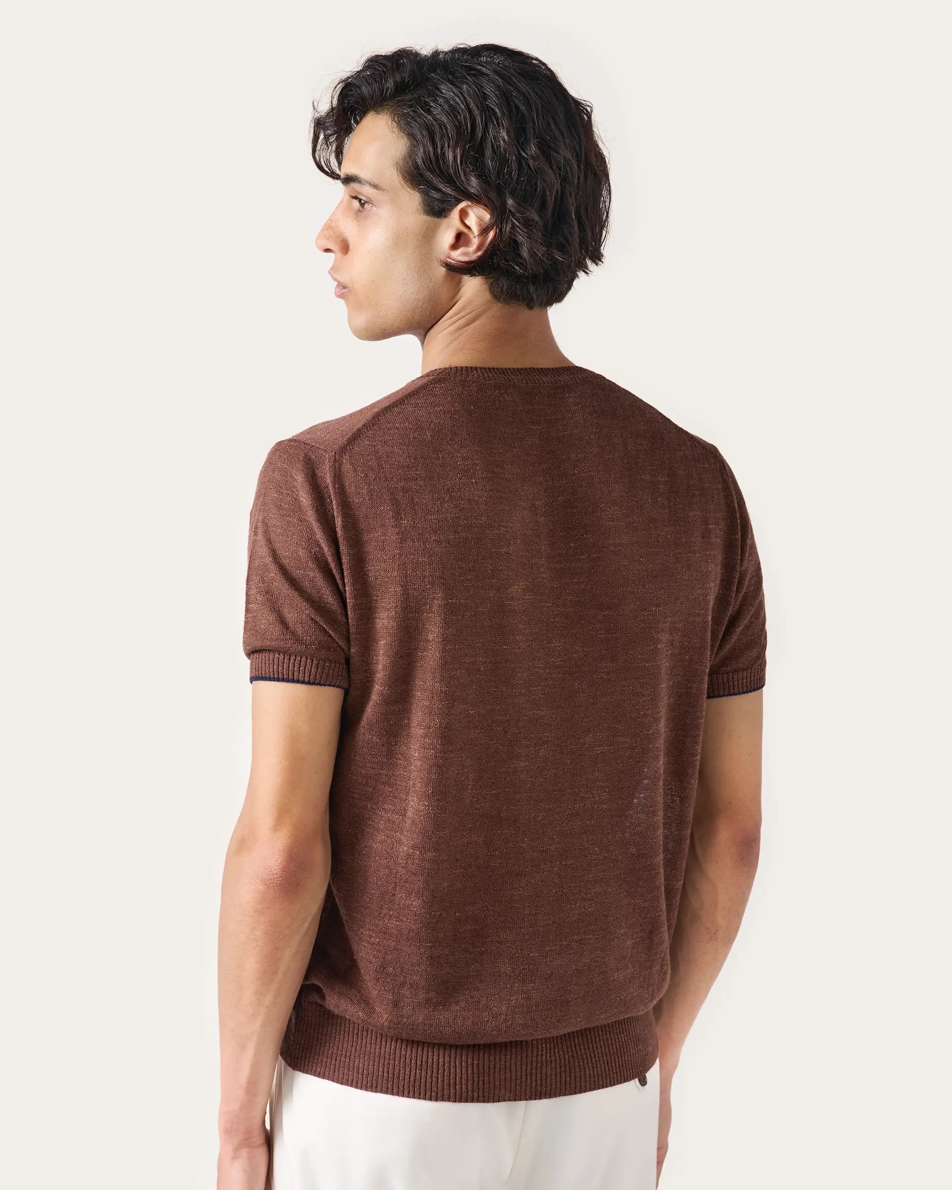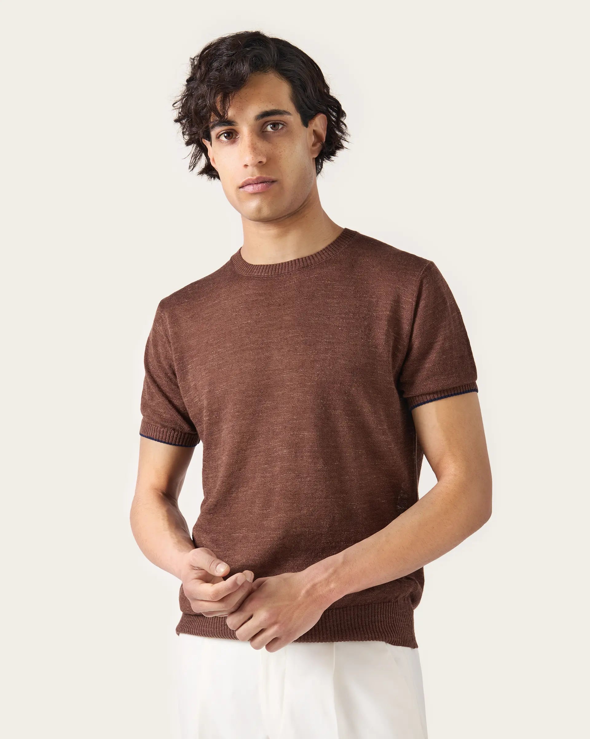 Short-sleeved sweater made with a fine blend of linen and extra-fine 14-gauge shaved cotton to guarantee a sensation of freshness perfect for summer days. The melange effect gives three-dimensionality to the garment while maintaining a classic elegance revisited in a contemporary key. To be worn under a jacket as an alternative to a shirt or alone with a pair of casual trousers.