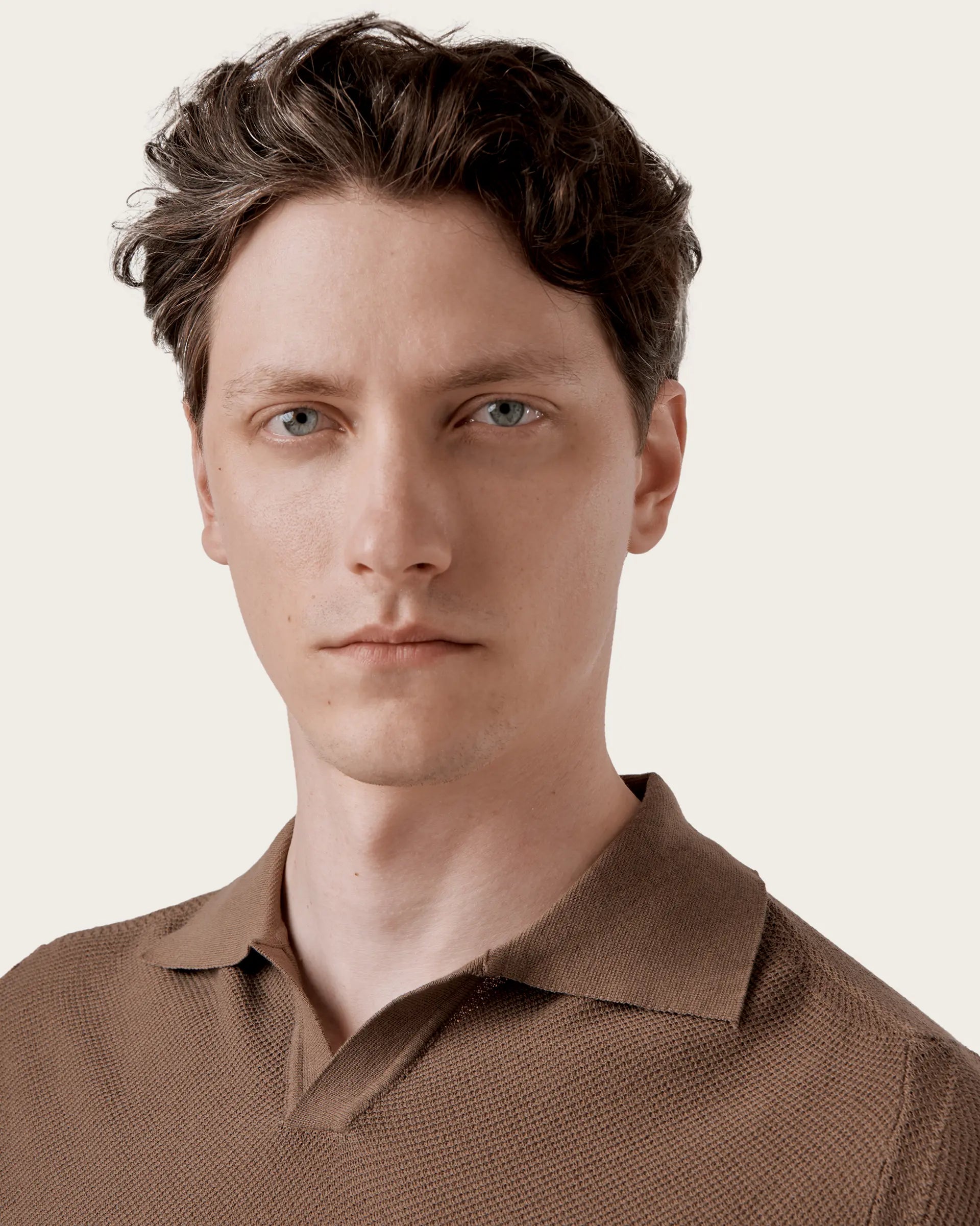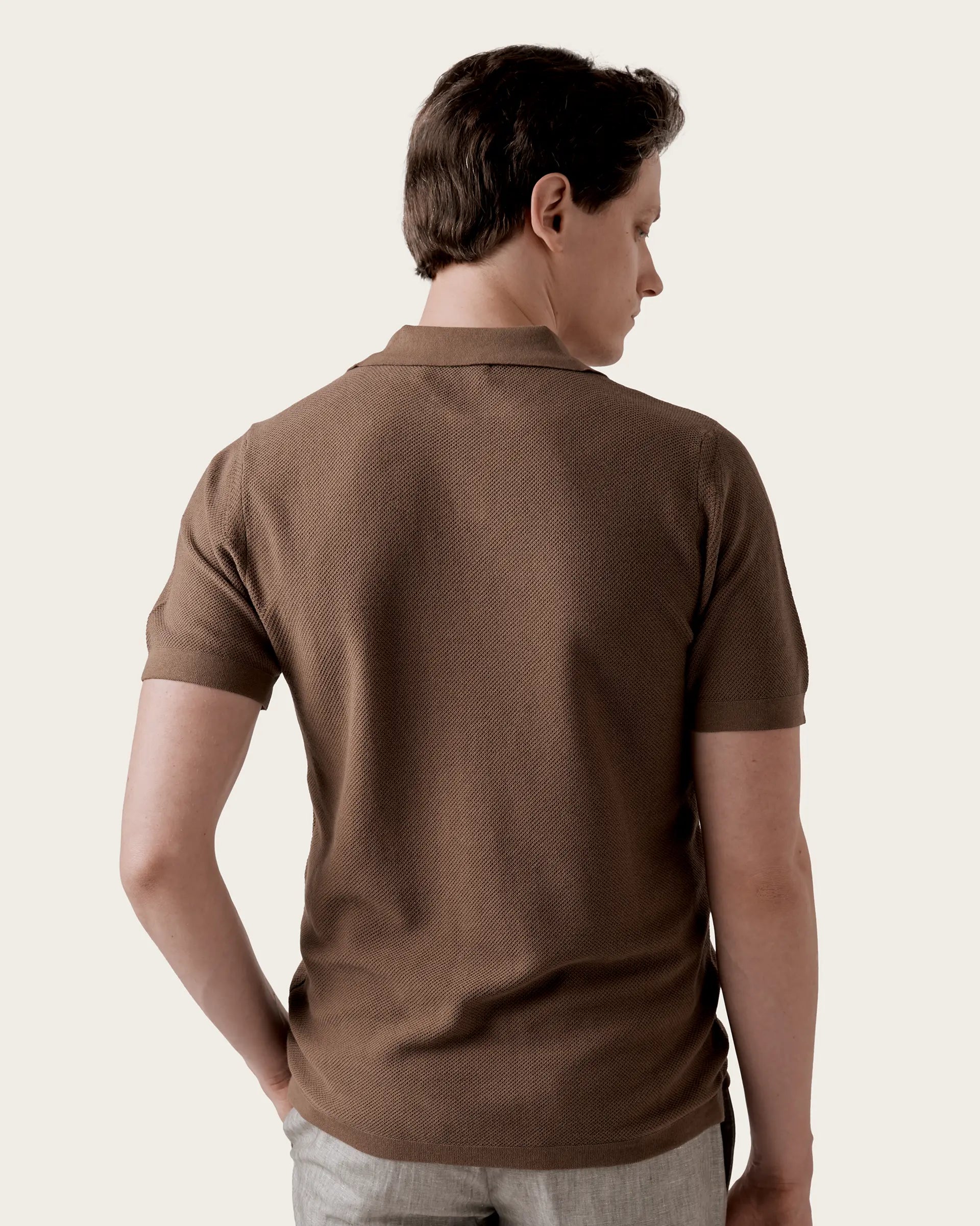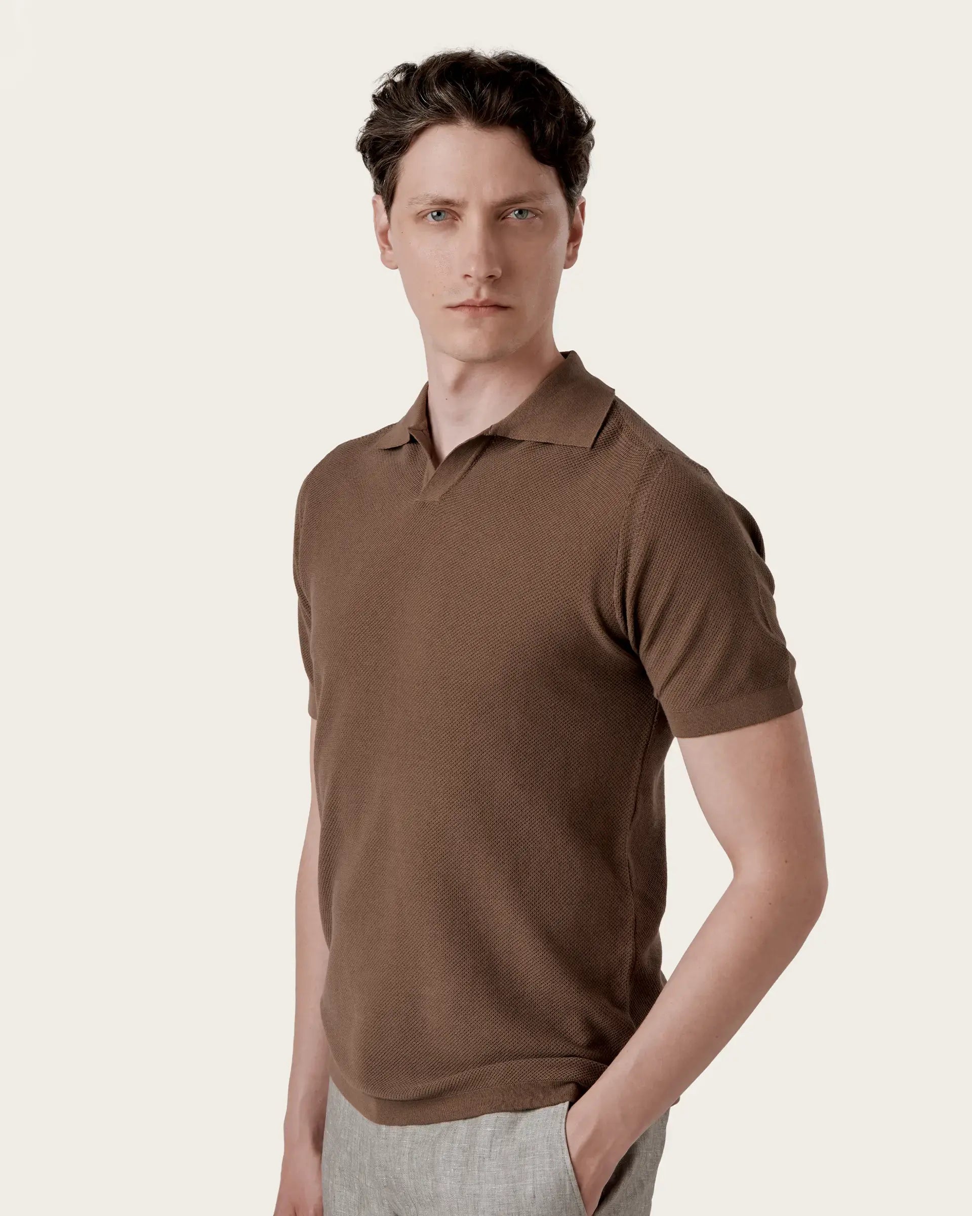Short-sleeved polo characterized by a v-neck that revisits a classic garment in a modern perspective. The style is defined by a honeycomb workmanship that gives character and softness to the shirt while the garment dyeing guarantees unique and intense shades of color. Perfect expression of a sporty but refined garment that adds a little lightness to spring summer outfits.