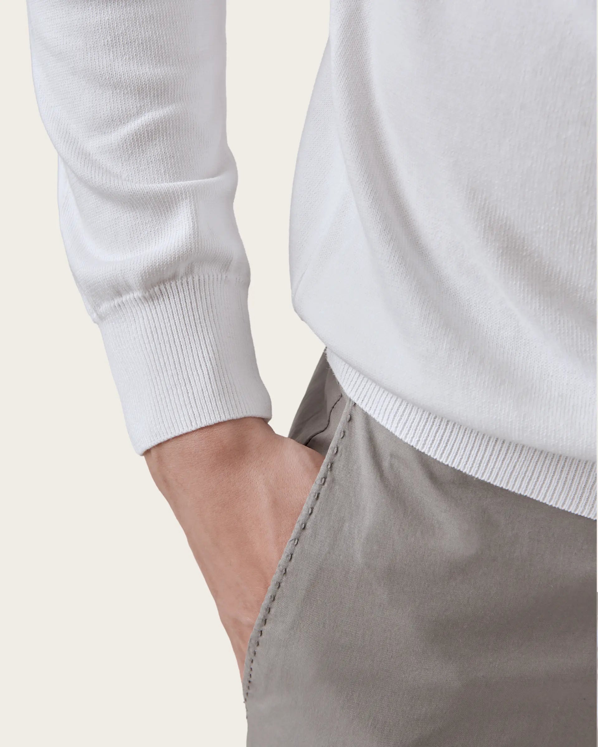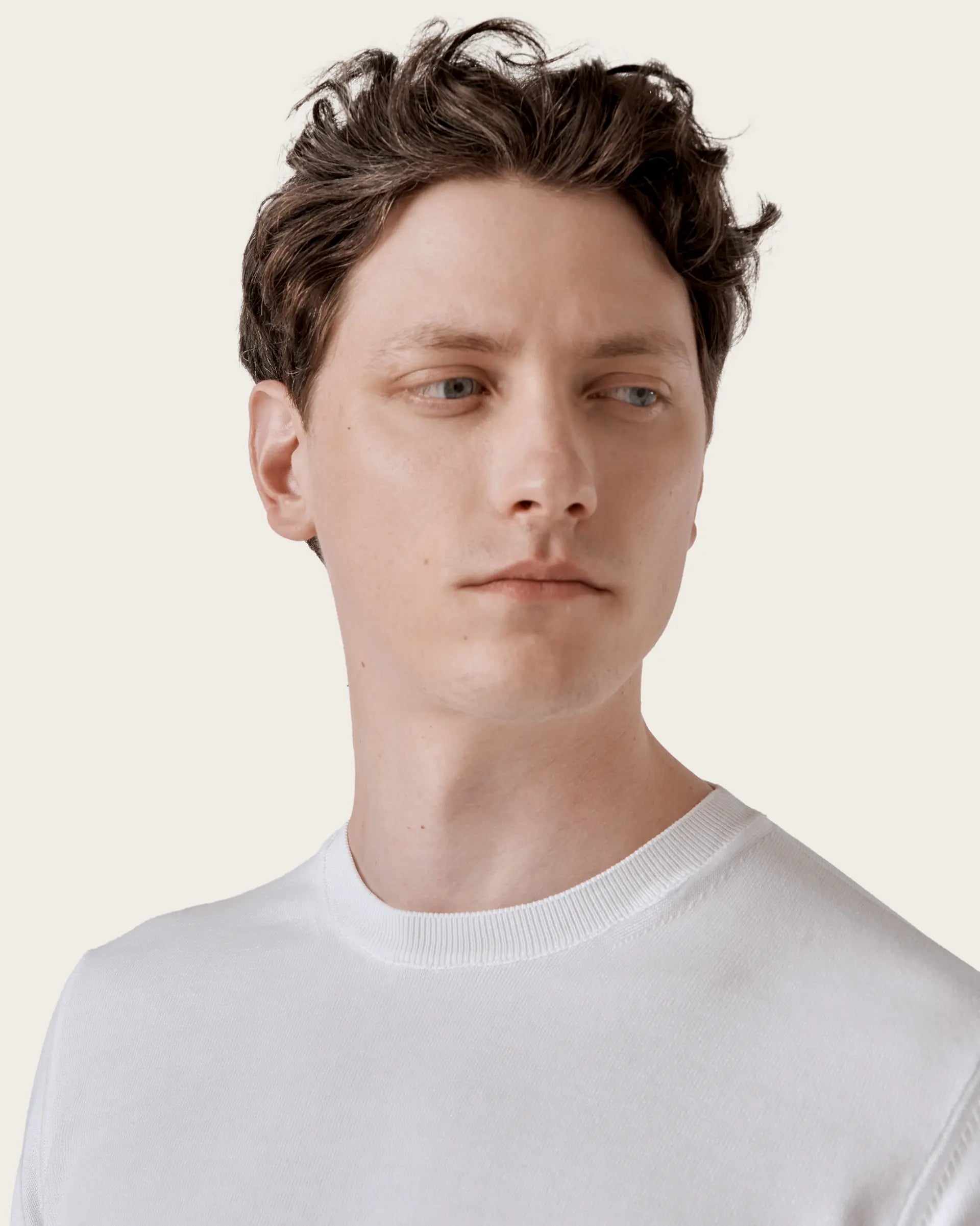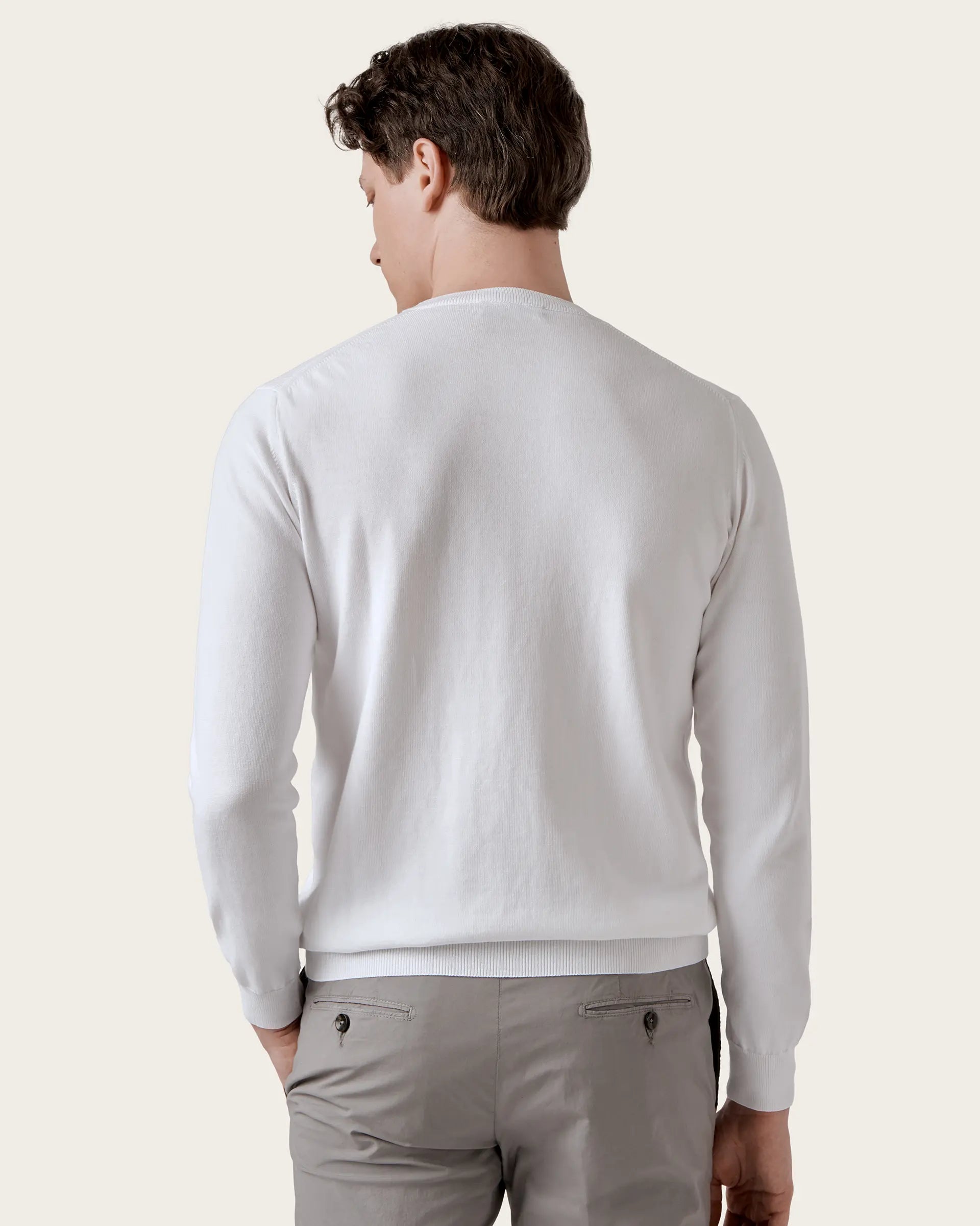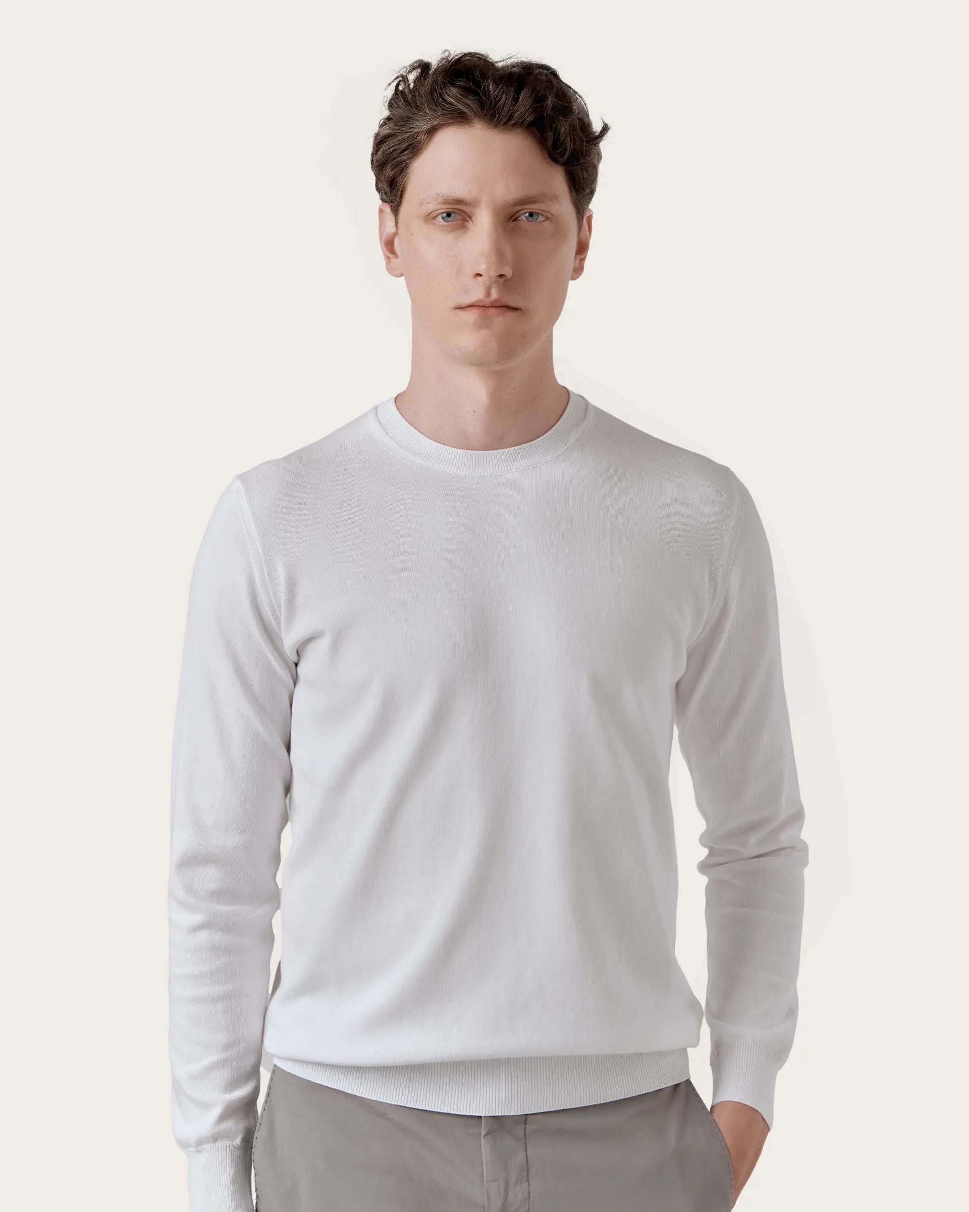 Crew neck, long-sleeved sweater made of extra-fine single-thread cotton in 14 gauge. A garment with an essential style, comfortable and light, embellished by the garment dyeing that gives it softness to the touch and unique and intense shades of color and by the characteristic texture that gives it the right weight to face the change of season.