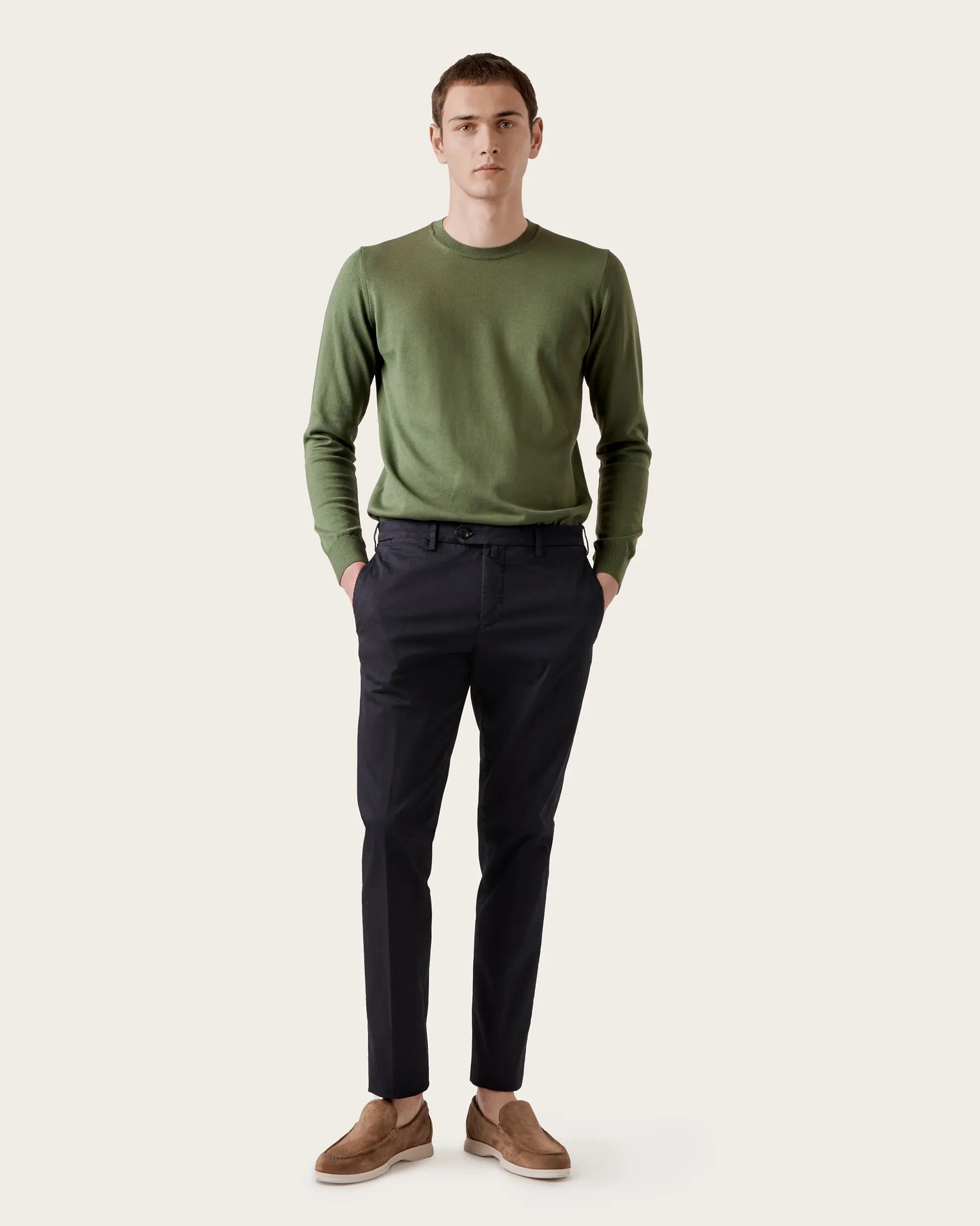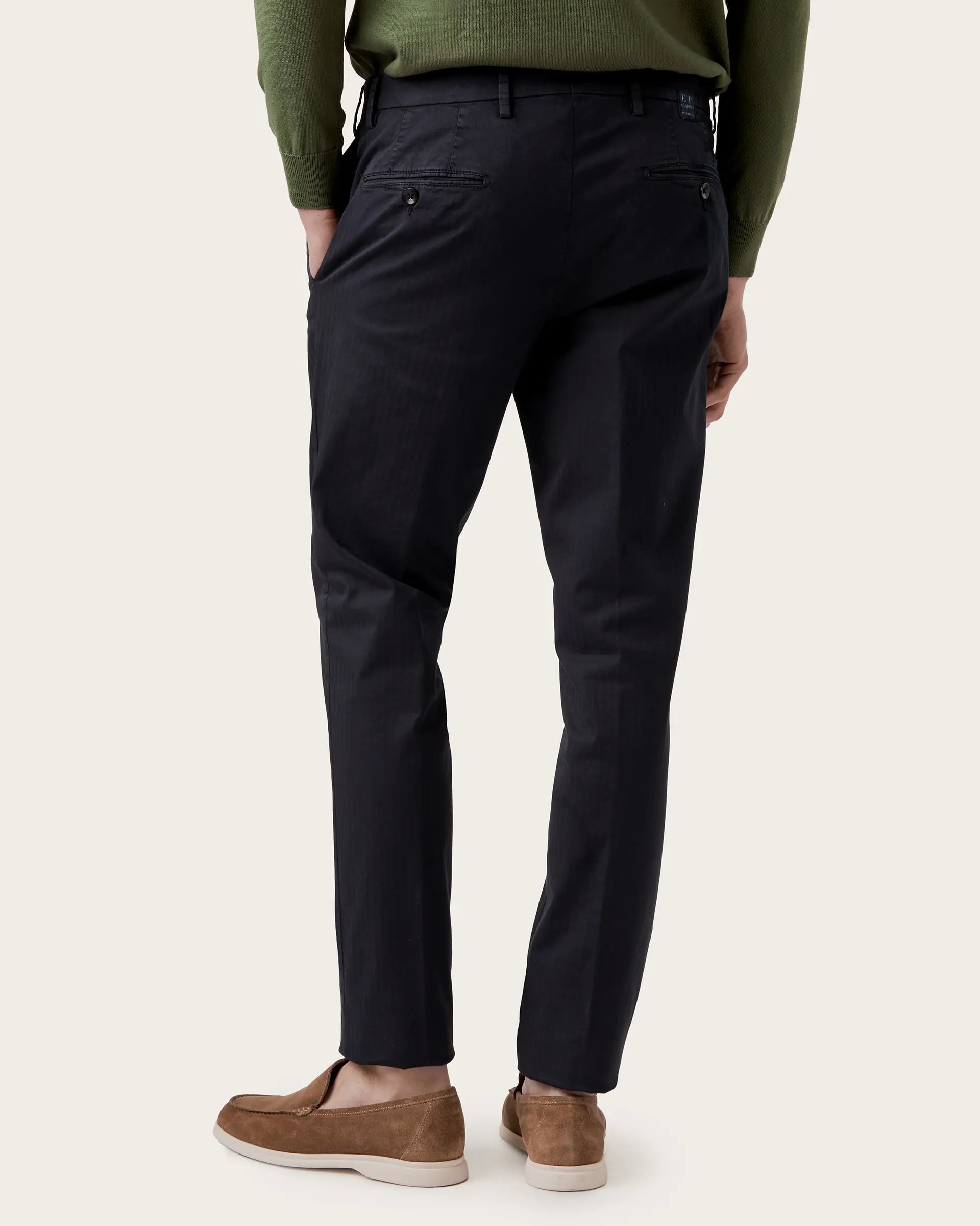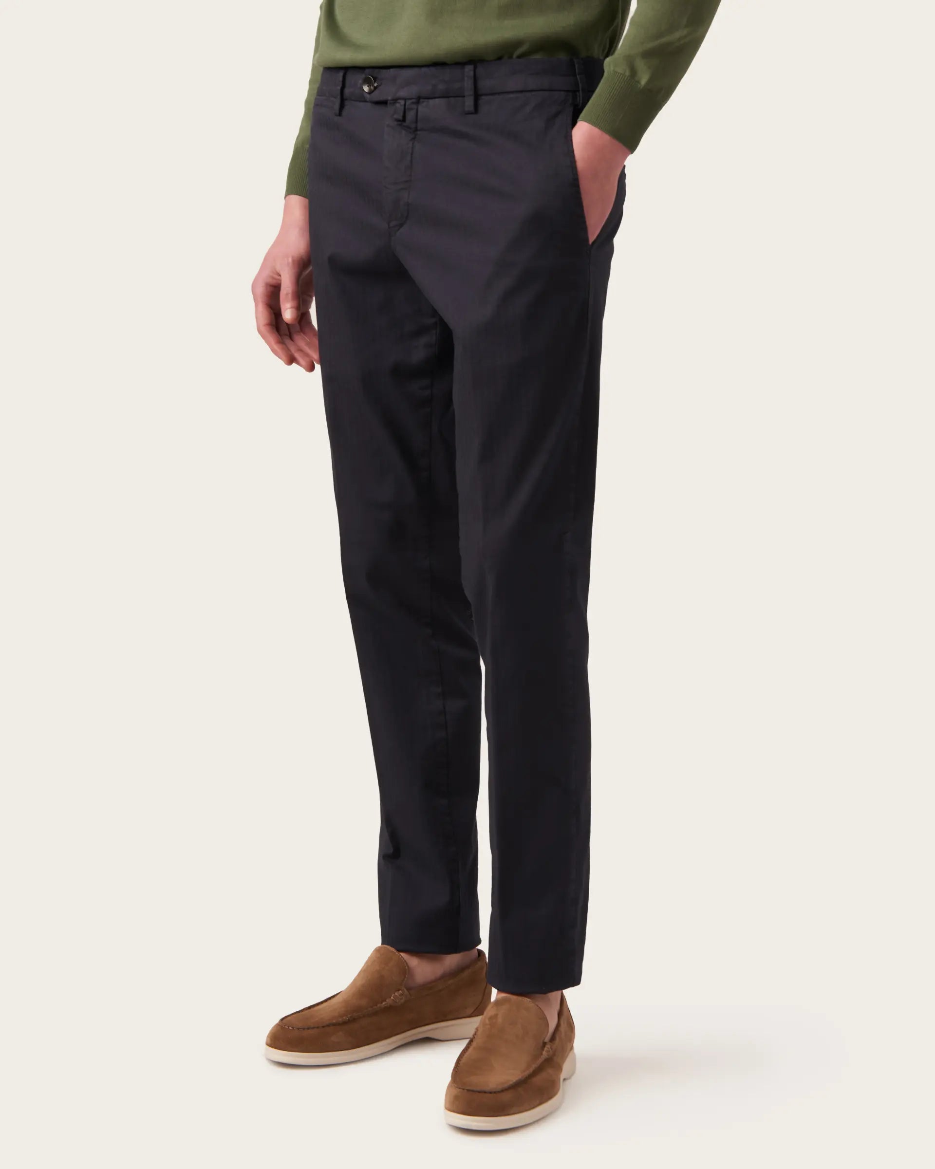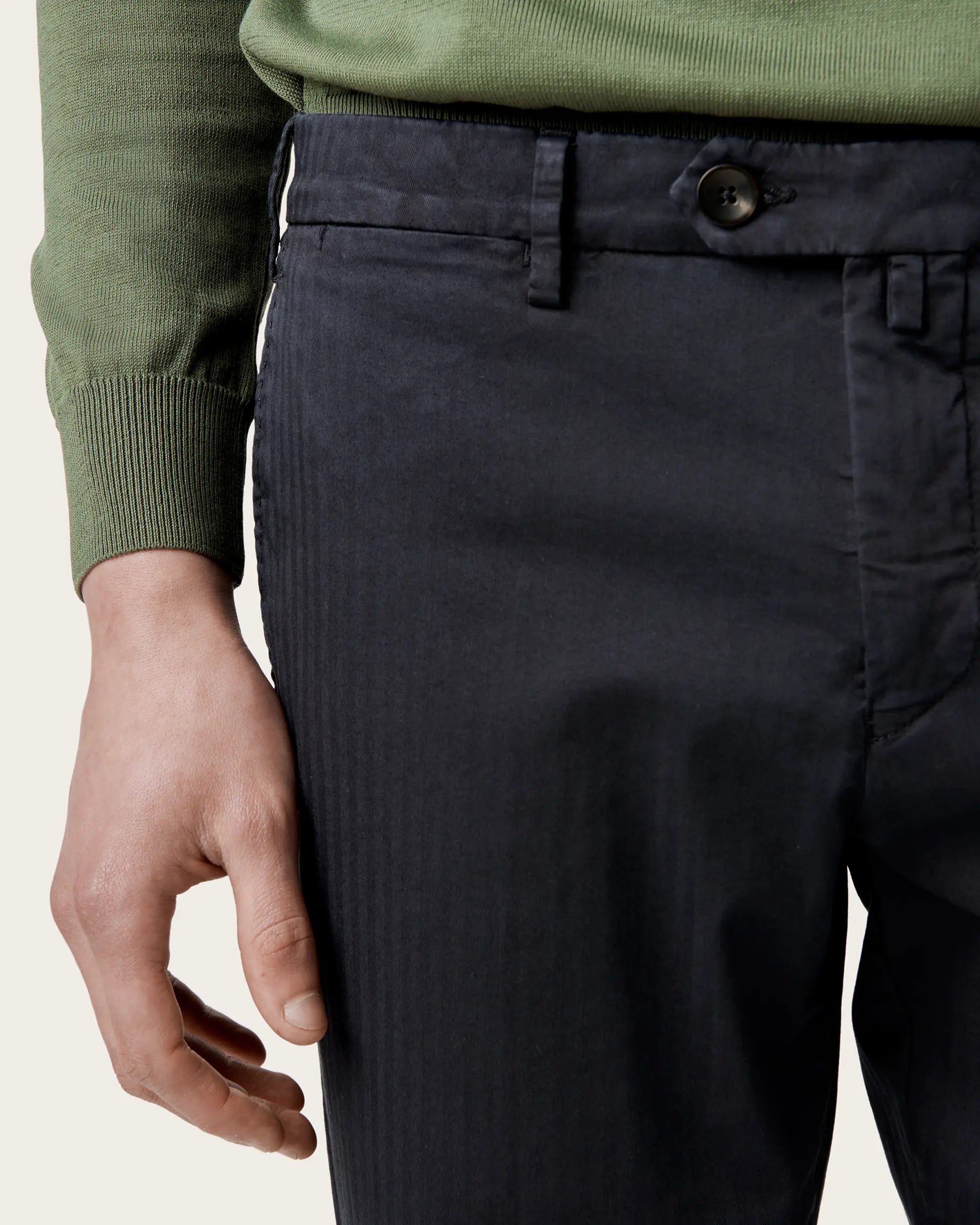 Chino trousers in stretch cotton herringbone, garment-dyed, featuring a texture with a delicate tone-on-tone design. A garment made of stretch cotton, to ensure that elegance and comfortable fit required by today's men's wardrobe. The garment dyeing adds a pleasant chromatic effect to a smart casual garment, enhancing your outfits with sobriety and elegance.