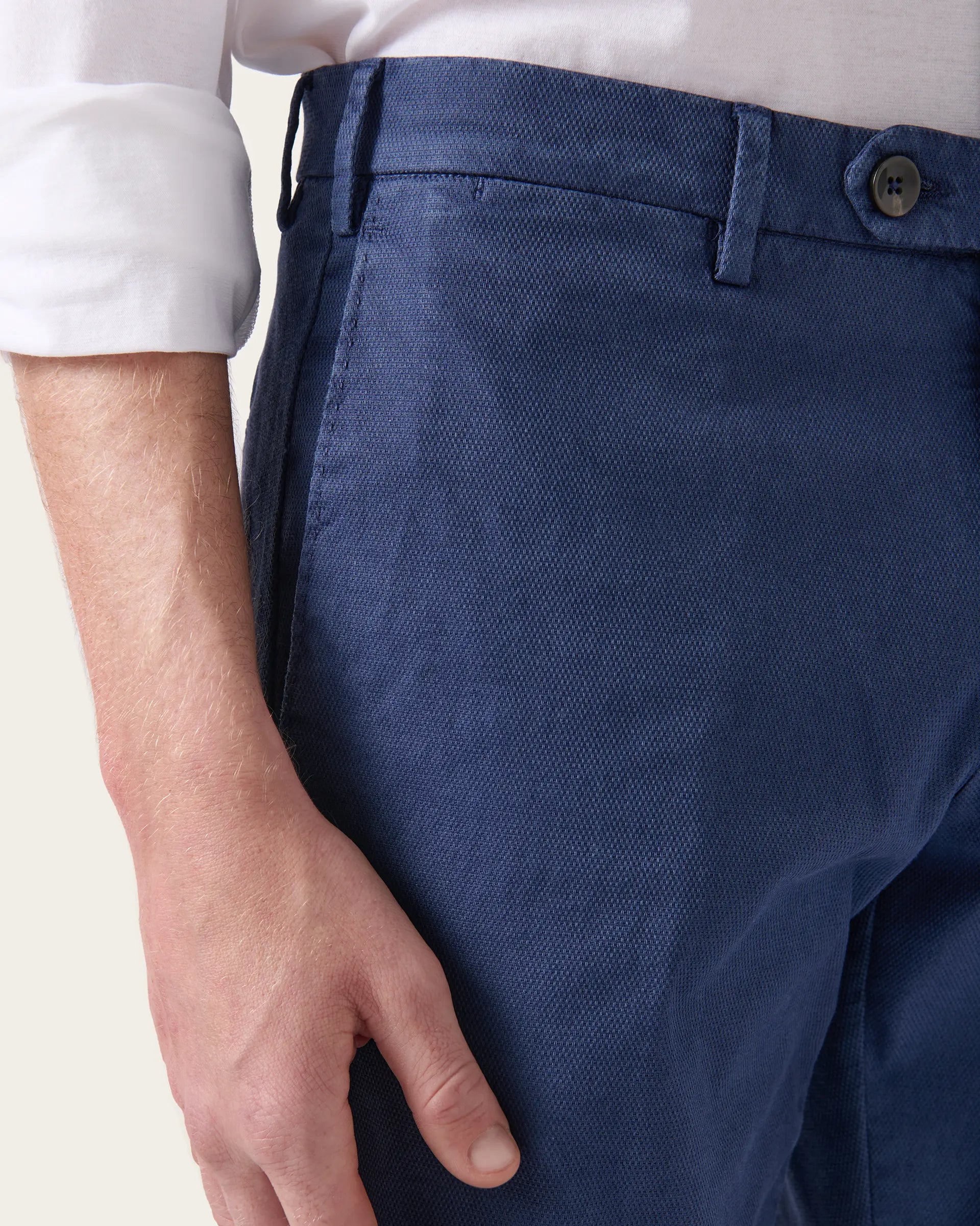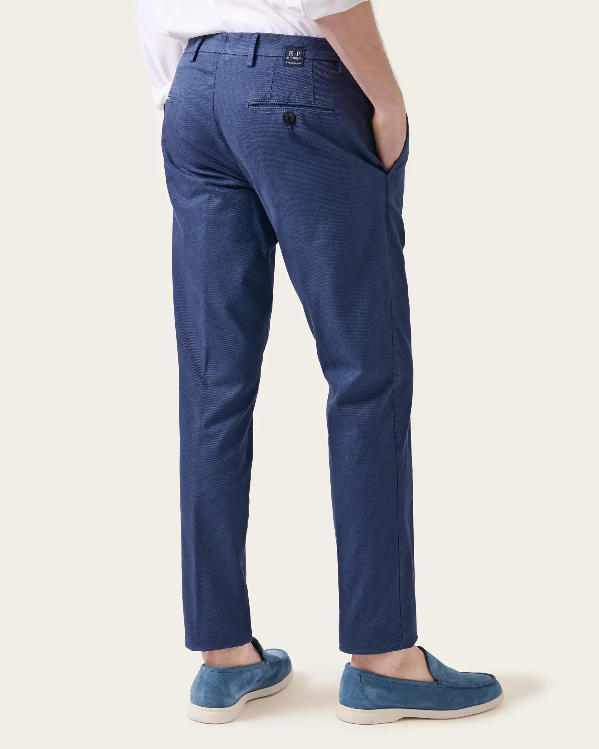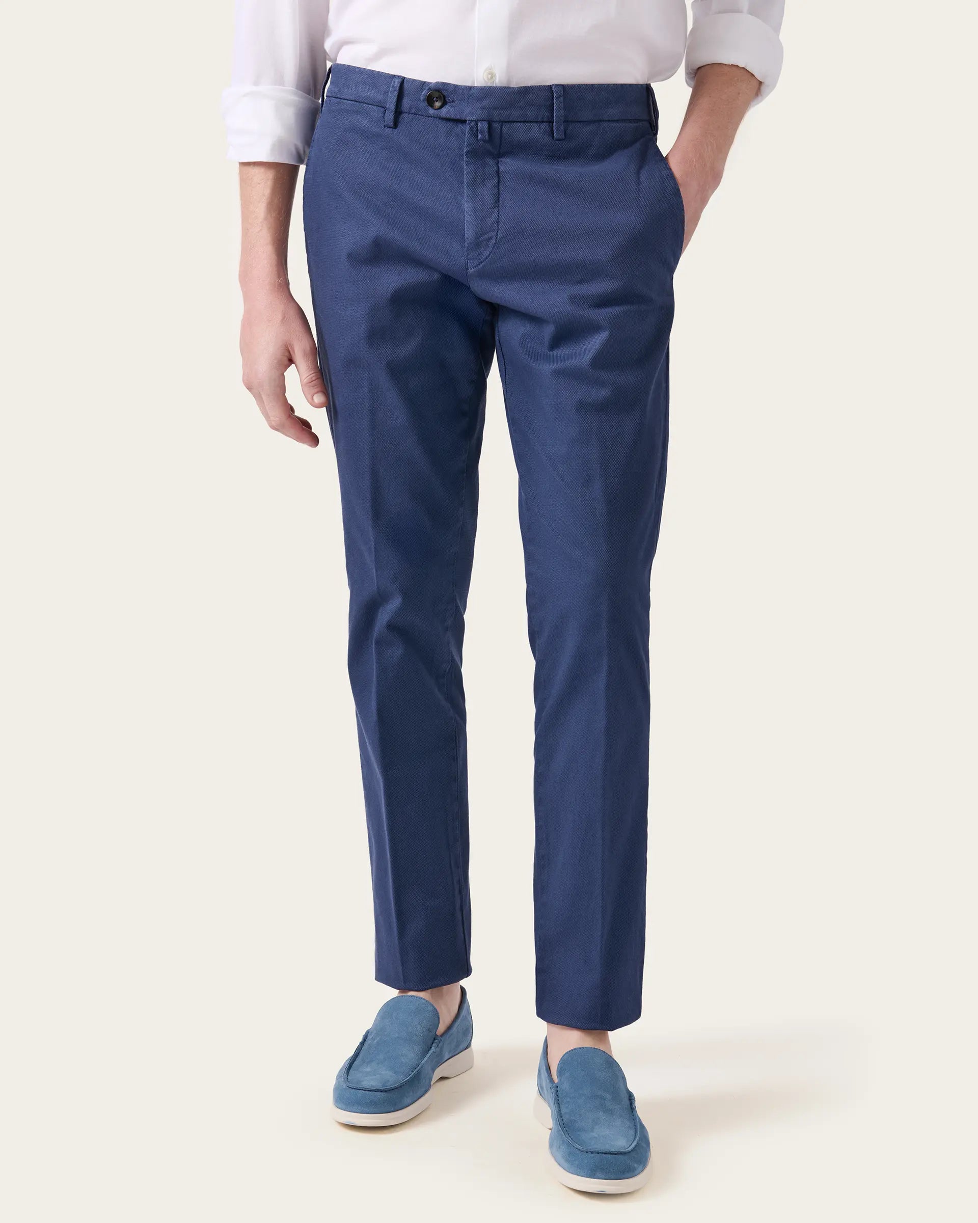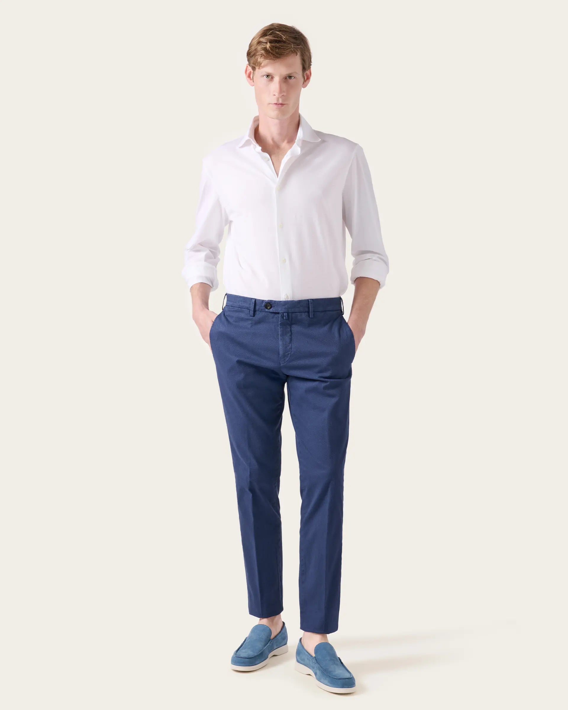 Chino trousers made of garment-dyed stretch reps cotton, characterised by a textured fabric resulting from a particular weave between the warp and the weft. The result is a fresh and sturdy pair of trousers that are particularly comfortable and practical for work and leisure. The garment dyeing adds a pleasant chromatic effect to a smart casual garment, enhancing your outfits with sobriety and elegance.