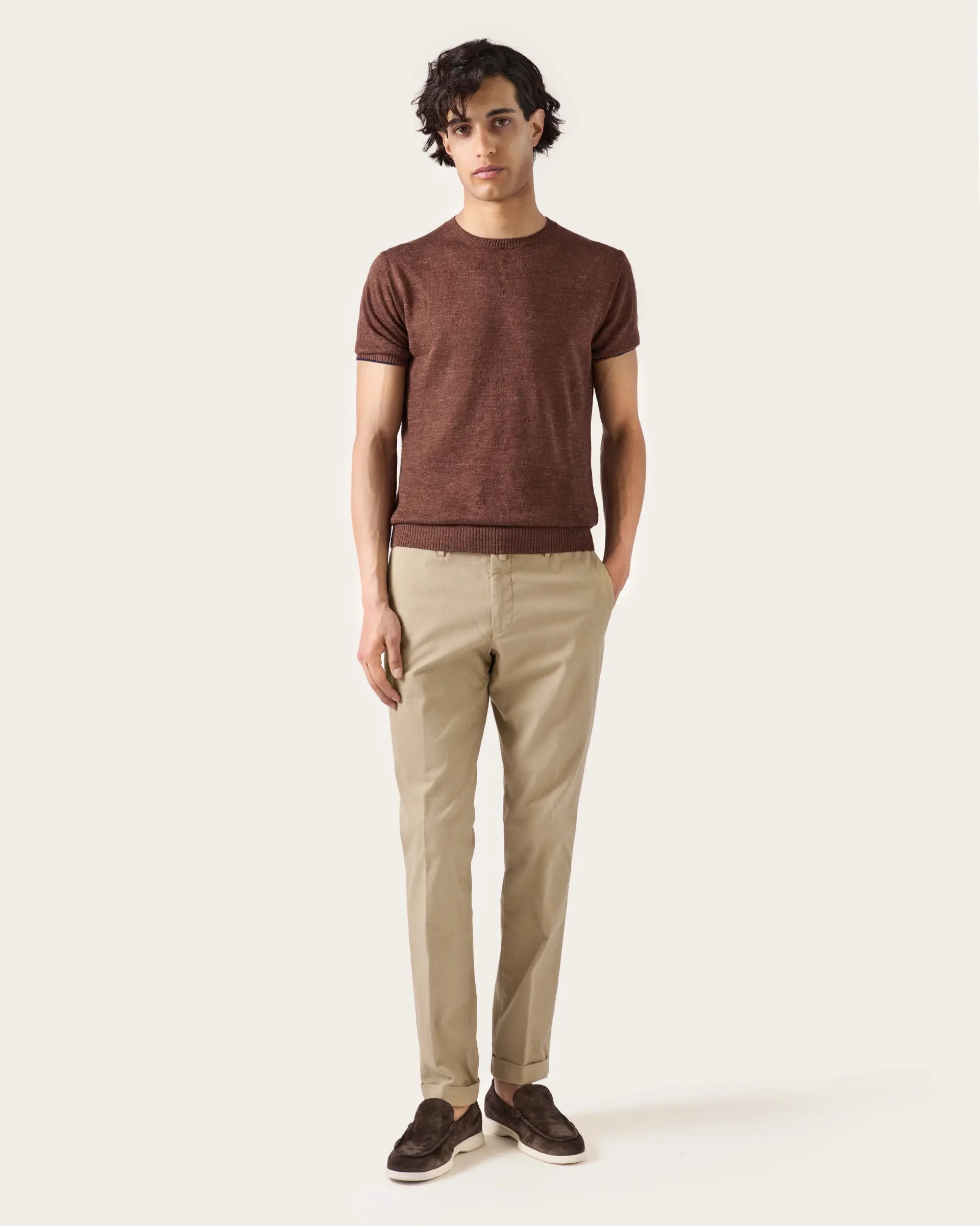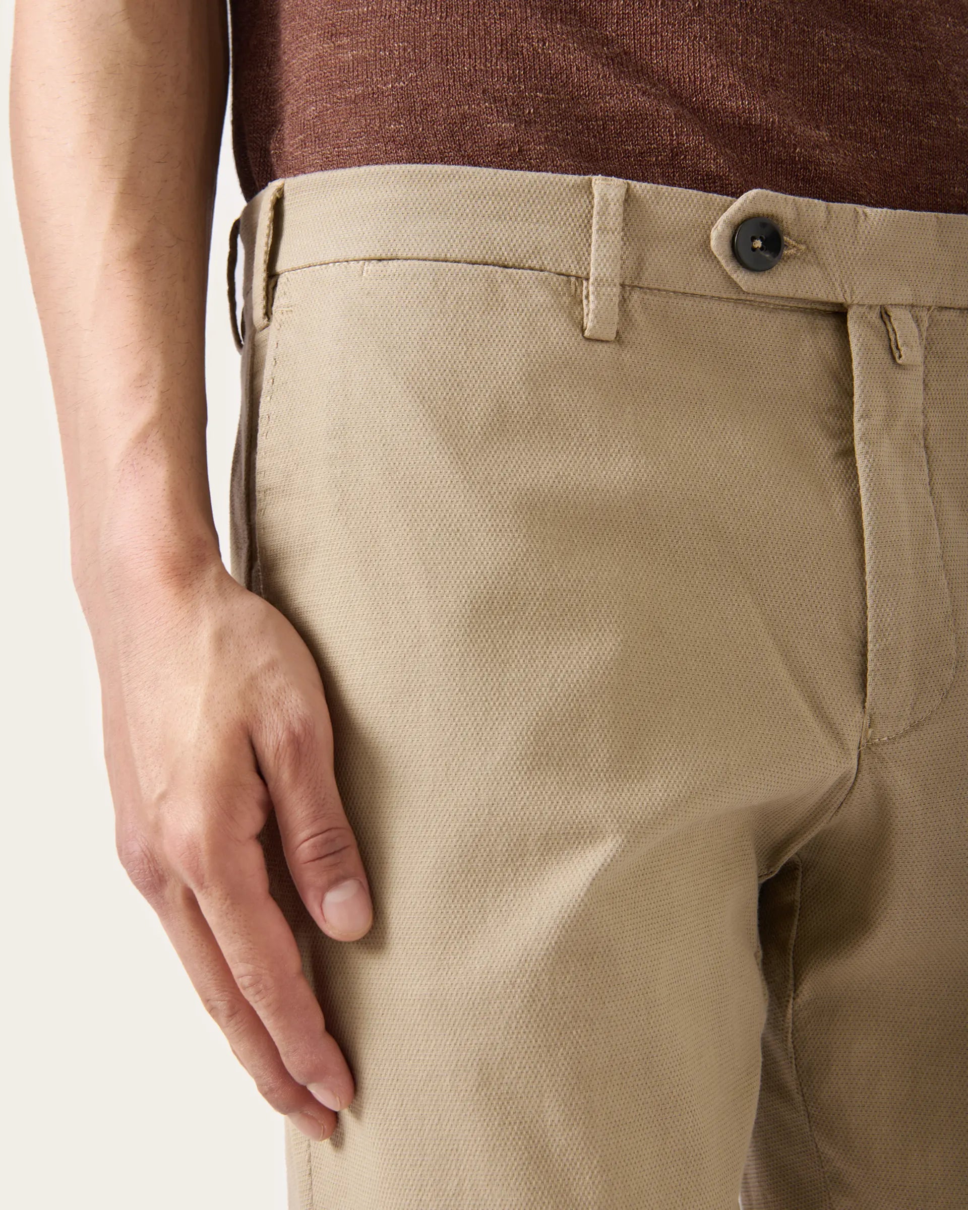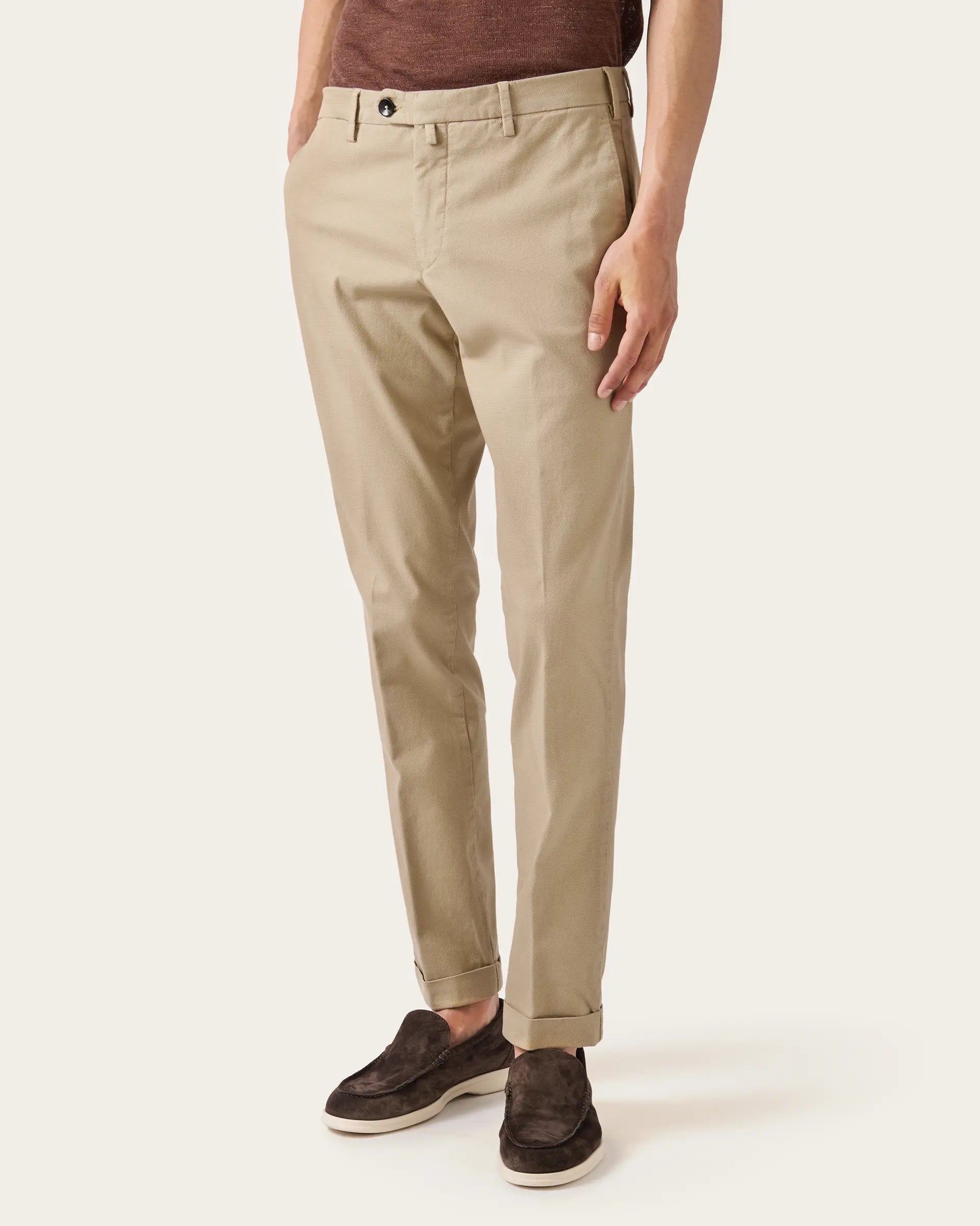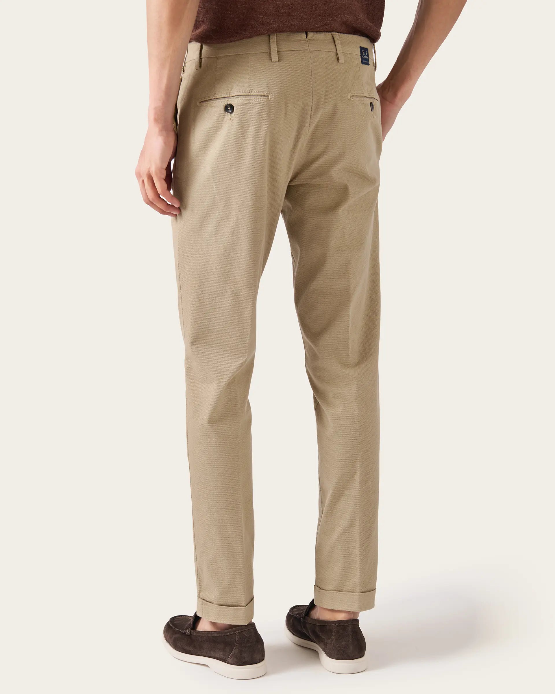 Chino trousers made of garment-dyed stretch reps cotton, characterised by a textured fabric resulting from a particular weave between the warp and the weft. The result is a fresh and sturdy pair of trousers that are particularly comfortable and practical for work and leisure. The garment dyeing adds a pleasant chromatic effect to a smart casual garment, enhancing your outfits with sobriety and elegance.