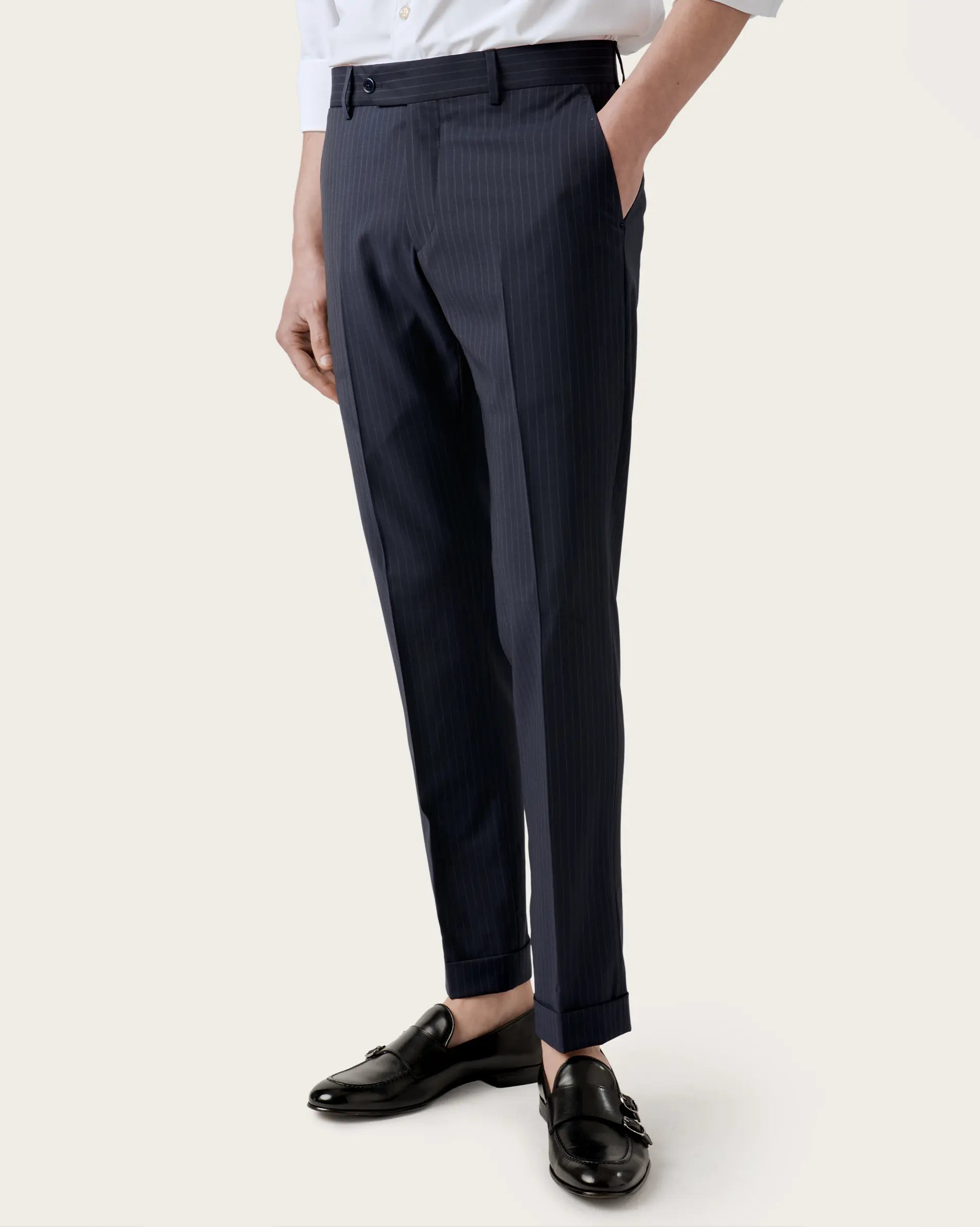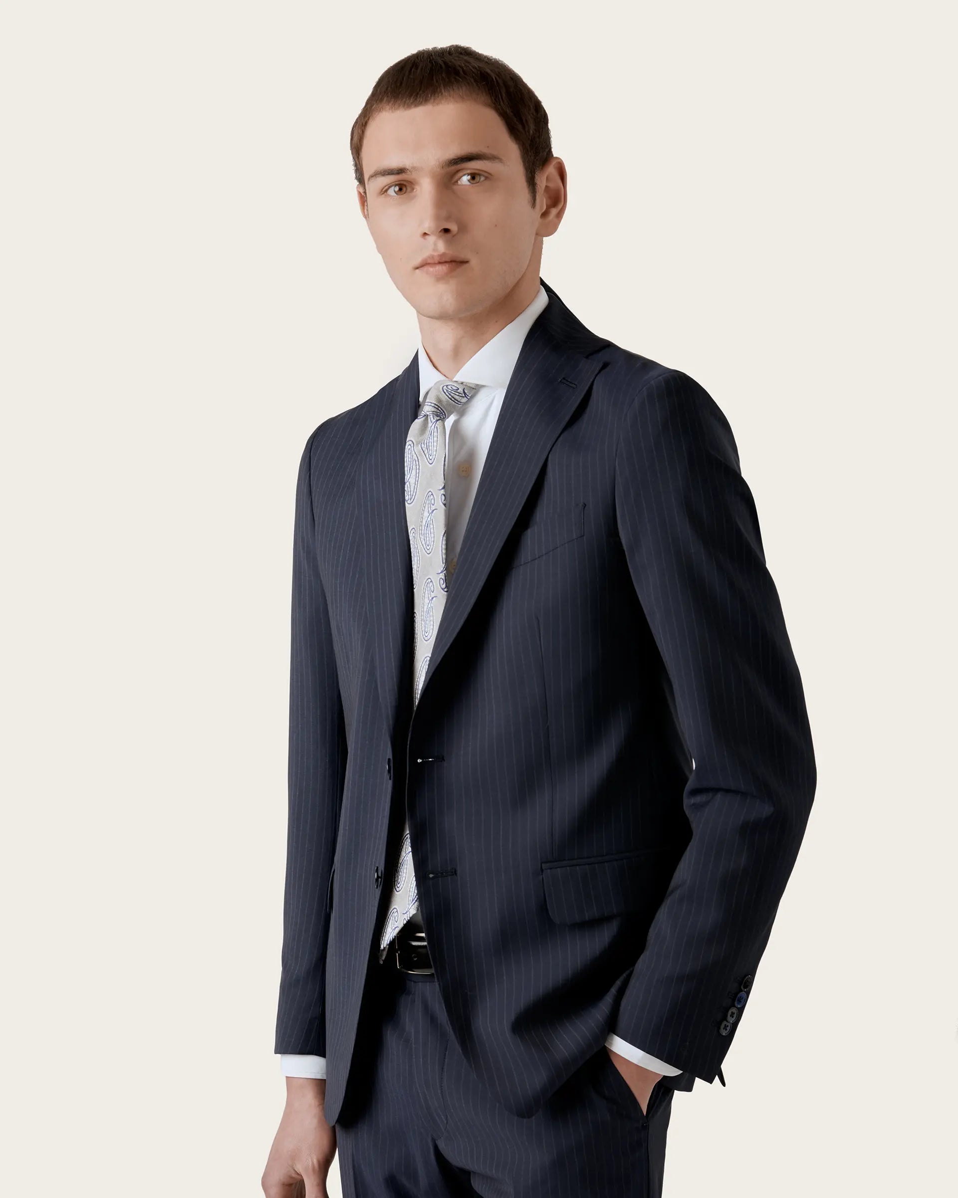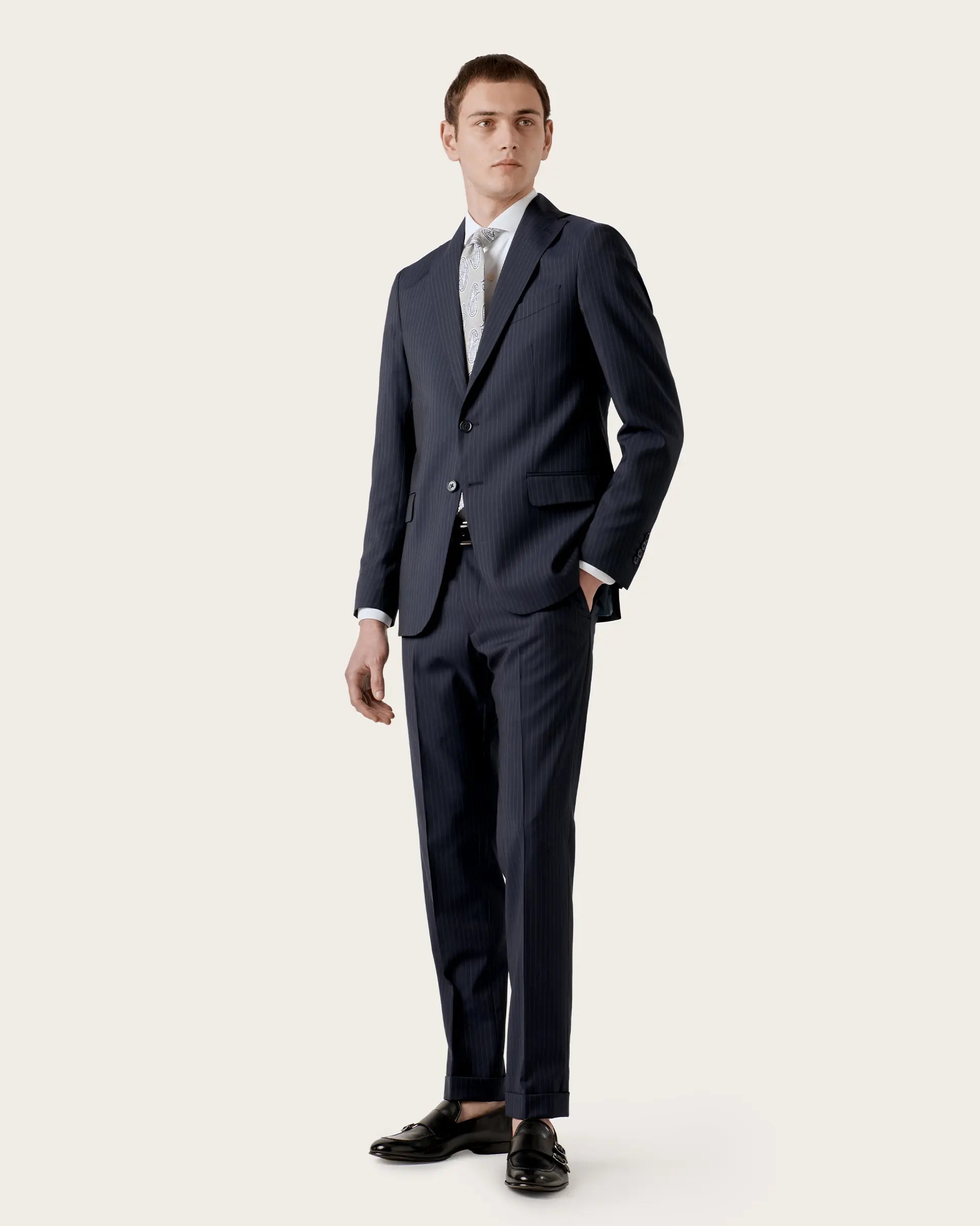 Suit with a strong sartorial accent, made in a contrasting pinstripe pattern that gives vivacity to a timeless classic with super 100 fabric from Lanificio Zignone that offers maximum levels of elasticity, resistance to creases while maintaining the natural softness of the wool intact. A must-have for the male wardrobe to customize according to your style. The lined jacket, combined with crease-free trousers, creates a perfect balance of shapes and volumes. The finishing details complete an extremely versatile and impeccable suit.