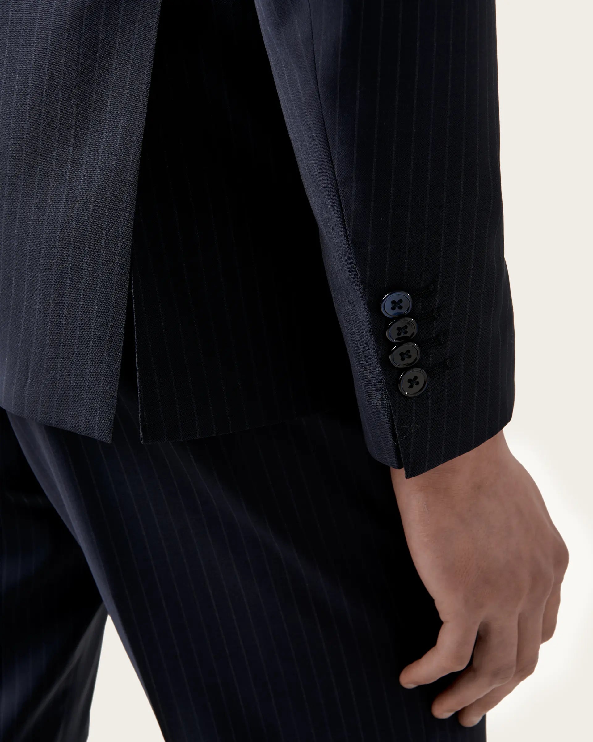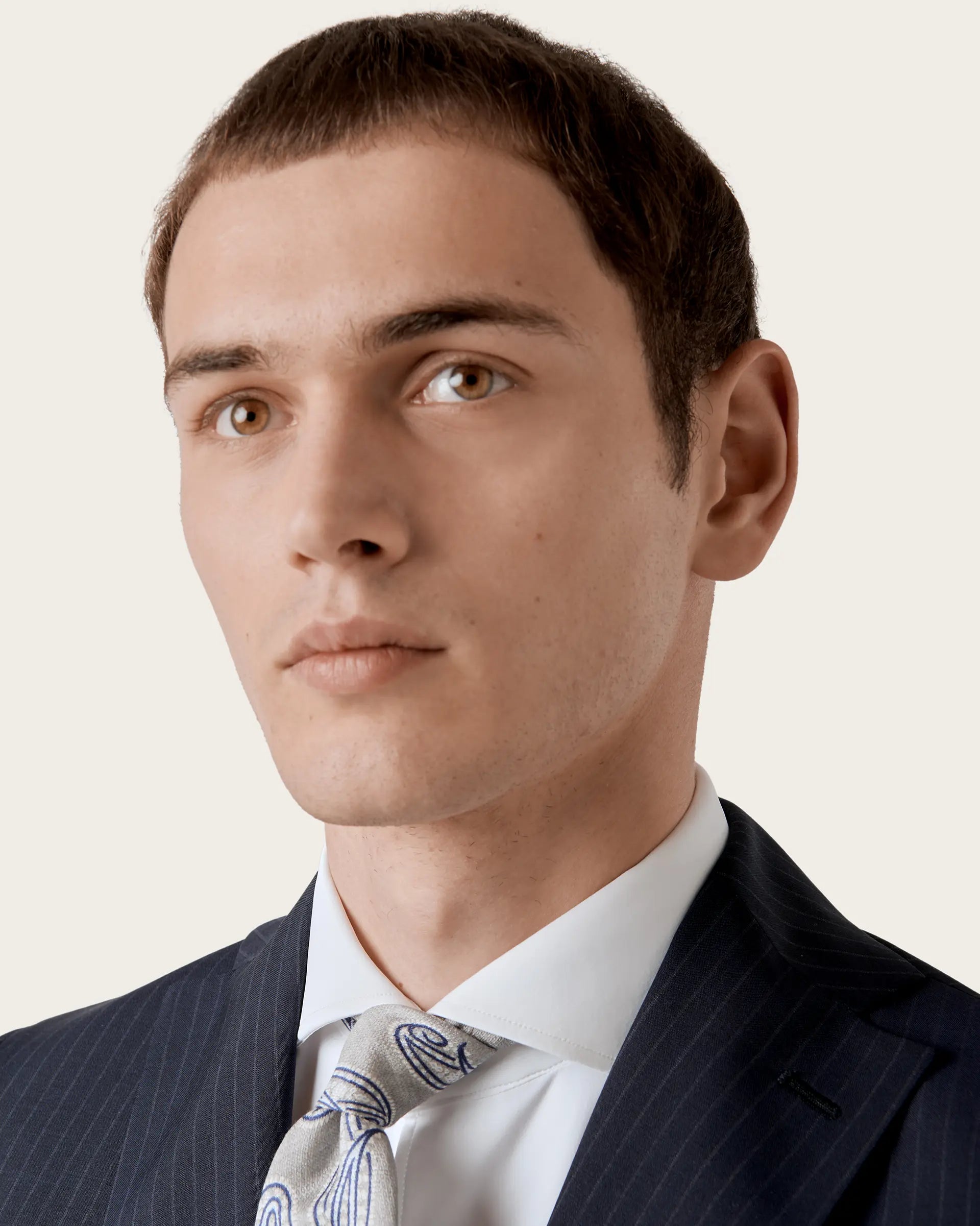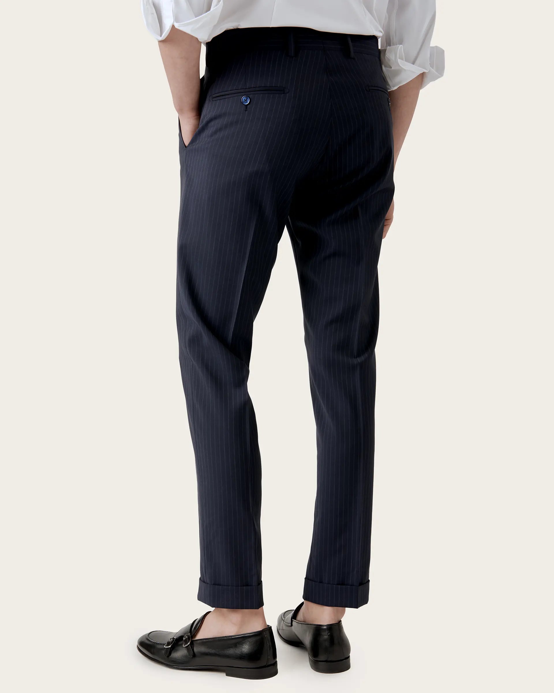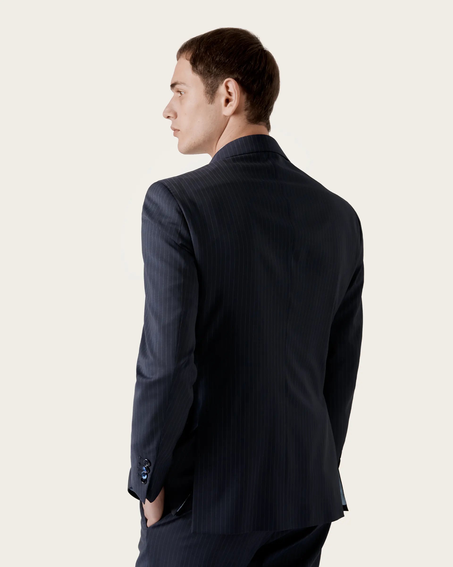 Suit with a strong sartorial accent, made in a contrasting pinstripe pattern that gives vivacity to a timeless classic with super 100 fabric from Lanificio Zignone that offers maximum levels of elasticity, resistance to creases while maintaining the natural softness of the wool intact. A must-have for the male wardrobe to customize according to your style. The lined jacket, combined with crease-free trousers, creates a perfect balance of shapes and volumes. The finishing details complete an extremely versatile and impeccable suit.