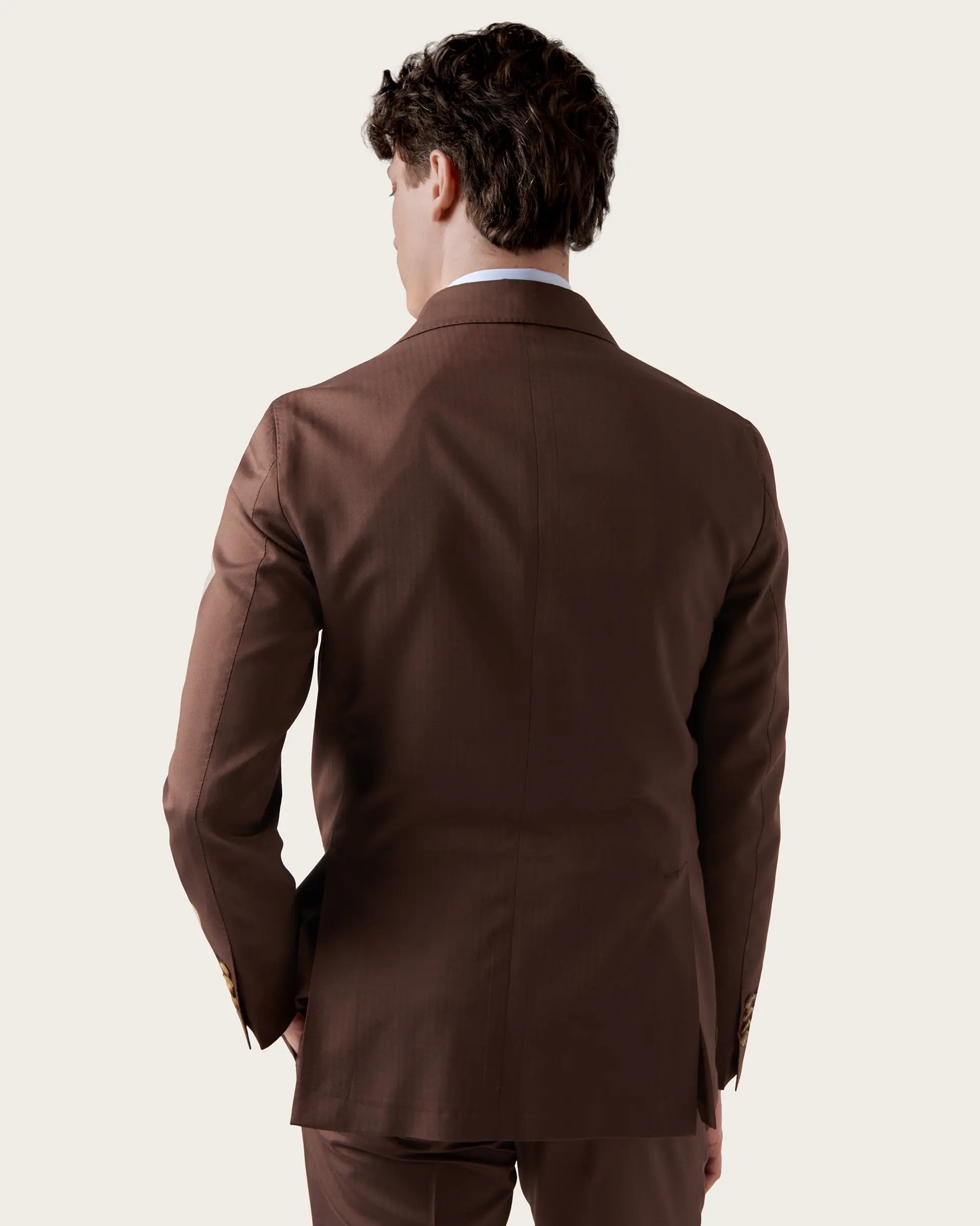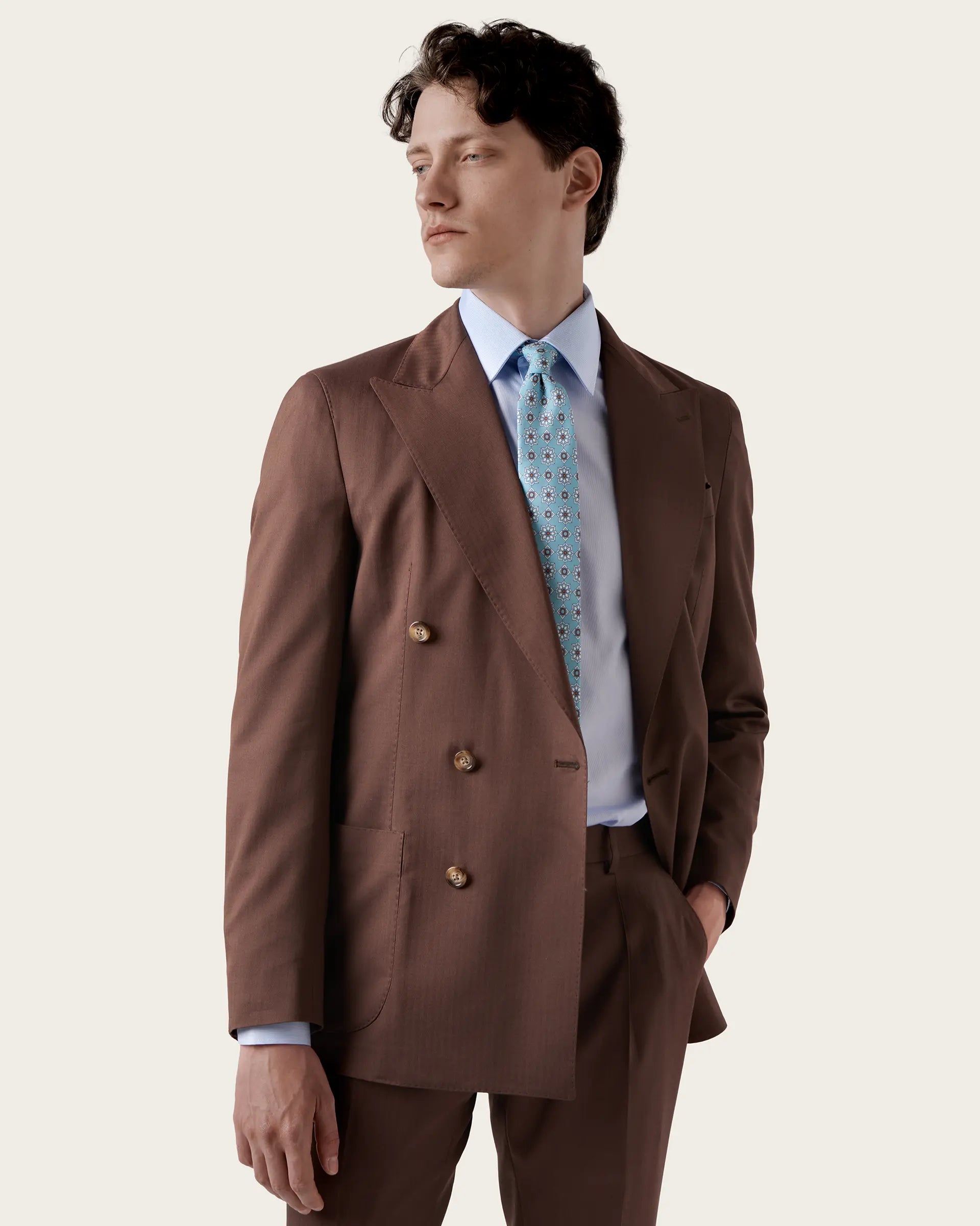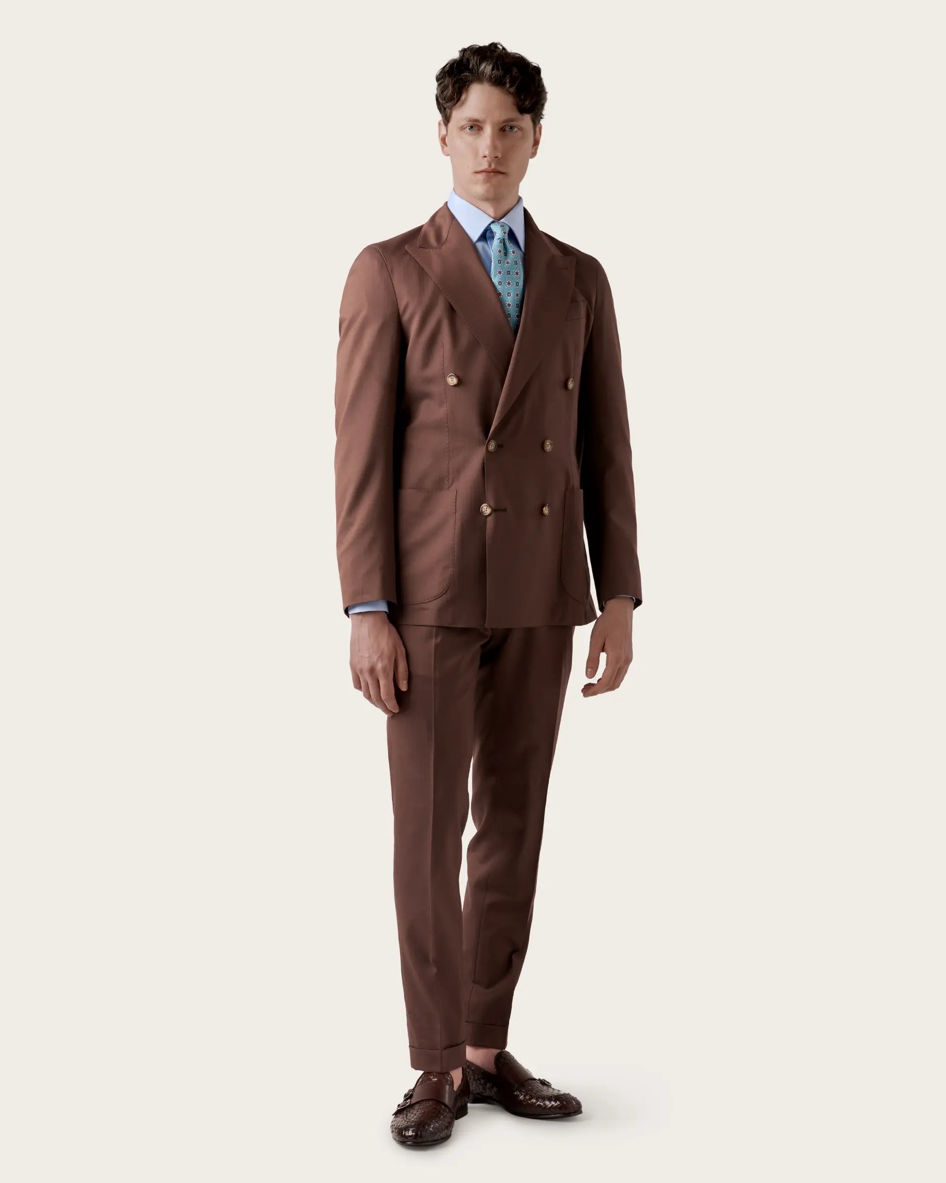 Double-breasted suit crafted from a luxurious blend of wool, cotton and silk Loro Piana Australis, extraordinarily lightweight and highly durable, it stands out for its comfort and breathability. The deconstructed and unlined jacket adapts perfectly to the silhouette thanks to its semi-canvased tailored construction and is characterised by wide peak lapels, which give the suit a touch of refinement, and patch pockets that add a touch of practicality without compromising the refined style of the jacket. Single-pleated trousers complete the ensemble, offering a contemporary cut and unparalleled comfort.