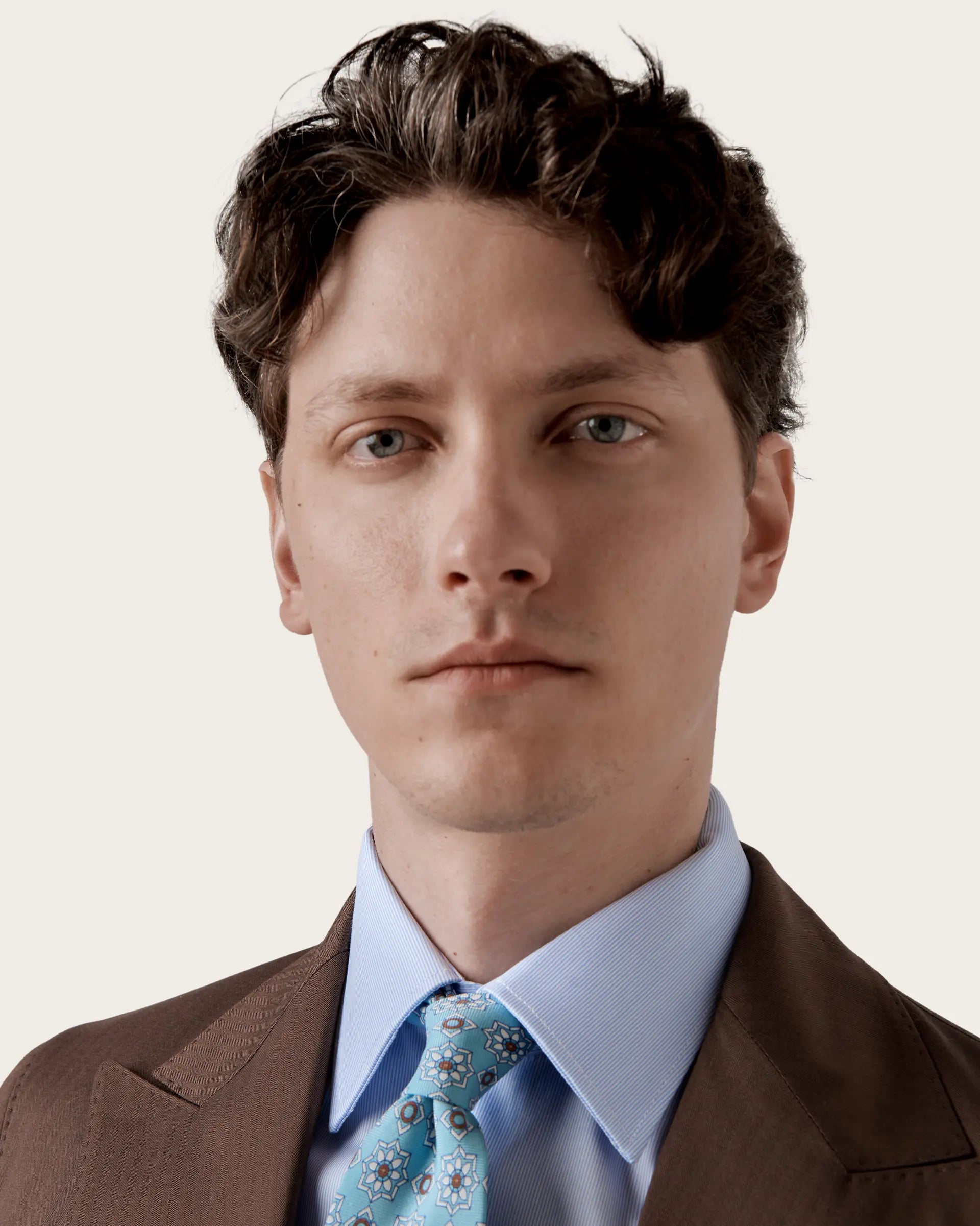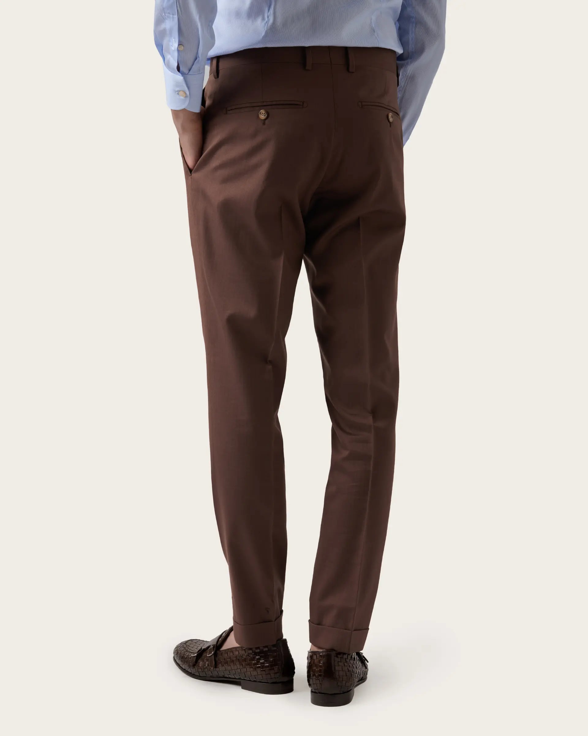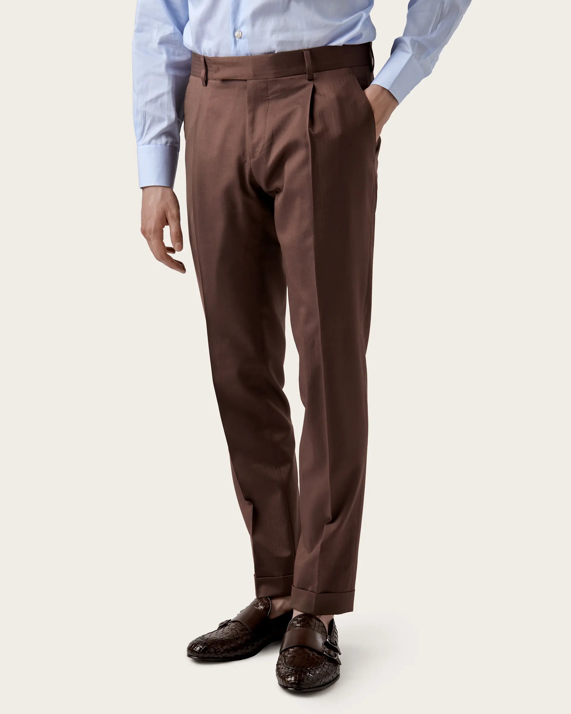 Double-breasted suit crafted from a luxurious blend of wool, cotton and silk Loro Piana Australis, extraordinarily lightweight and highly durable, it stands out for its comfort and breathability. The deconstructed and unlined jacket adapts perfectly to the silhouette thanks to its semi-canvased tailored construction and is characterised by wide peak lapels, which give the suit a touch of refinement, and patch pockets that add a touch of practicality without compromising the refined style of the jacket. Single-pleated trousers complete the ensemble, offering a contemporary cut and unparalleled comfort.