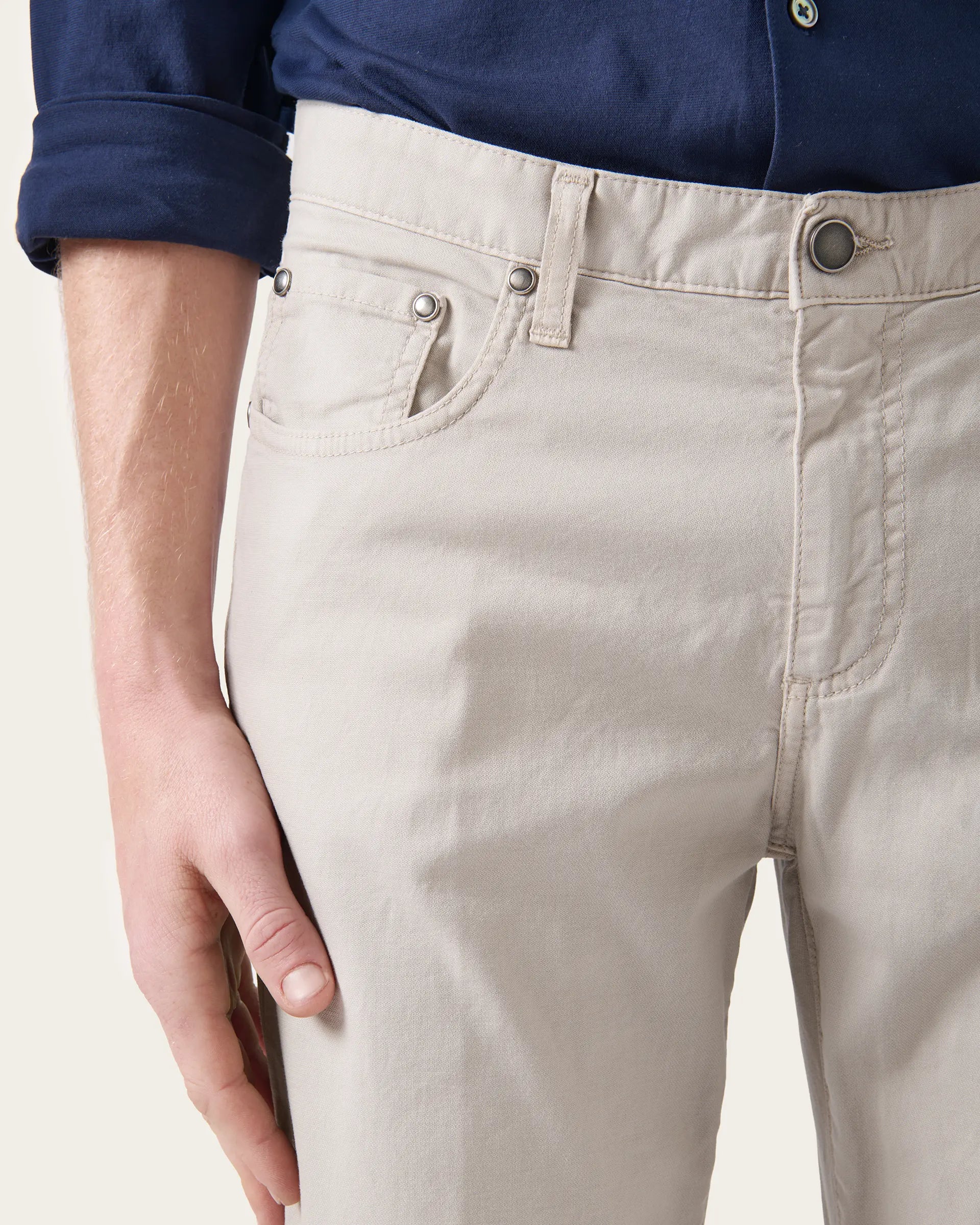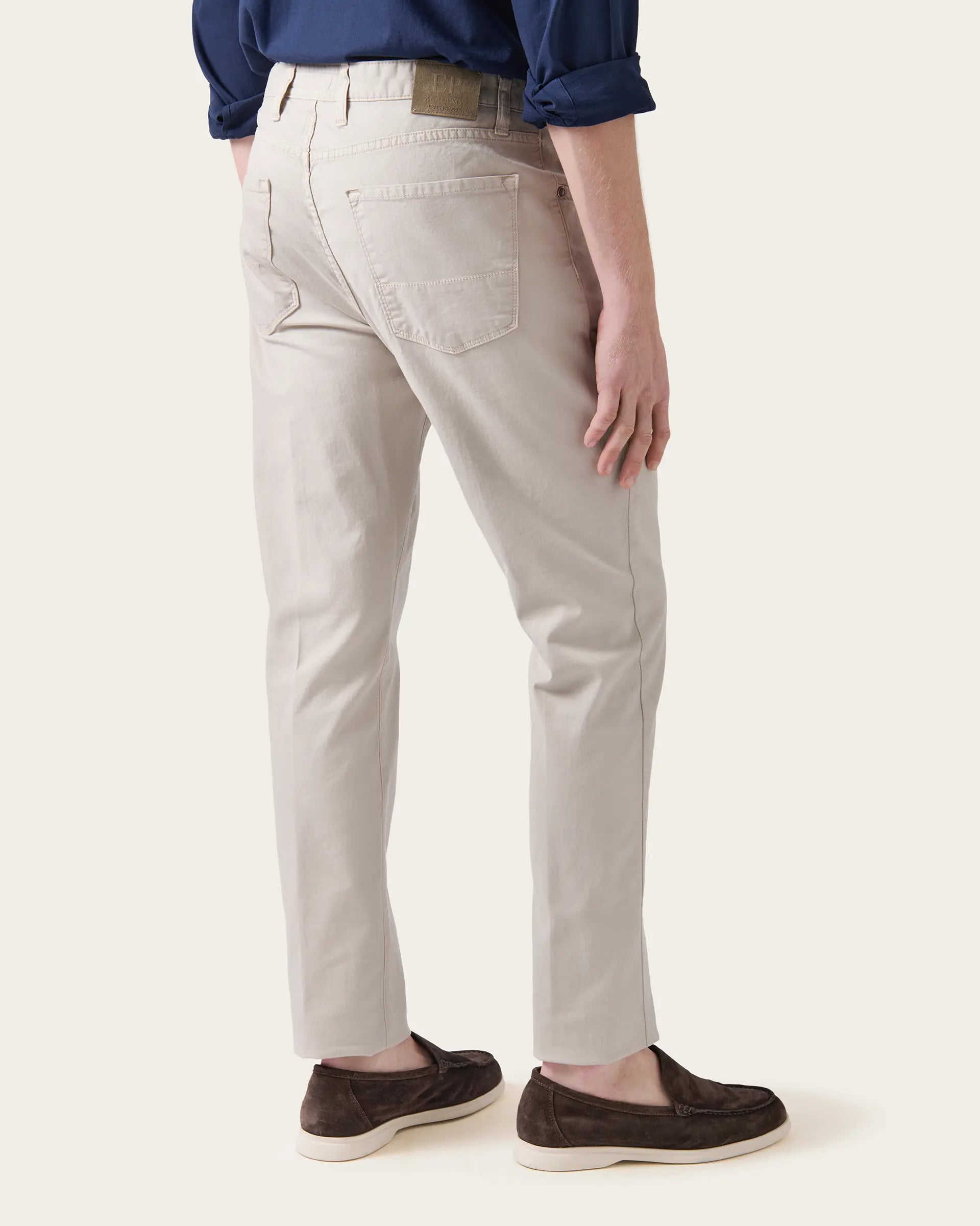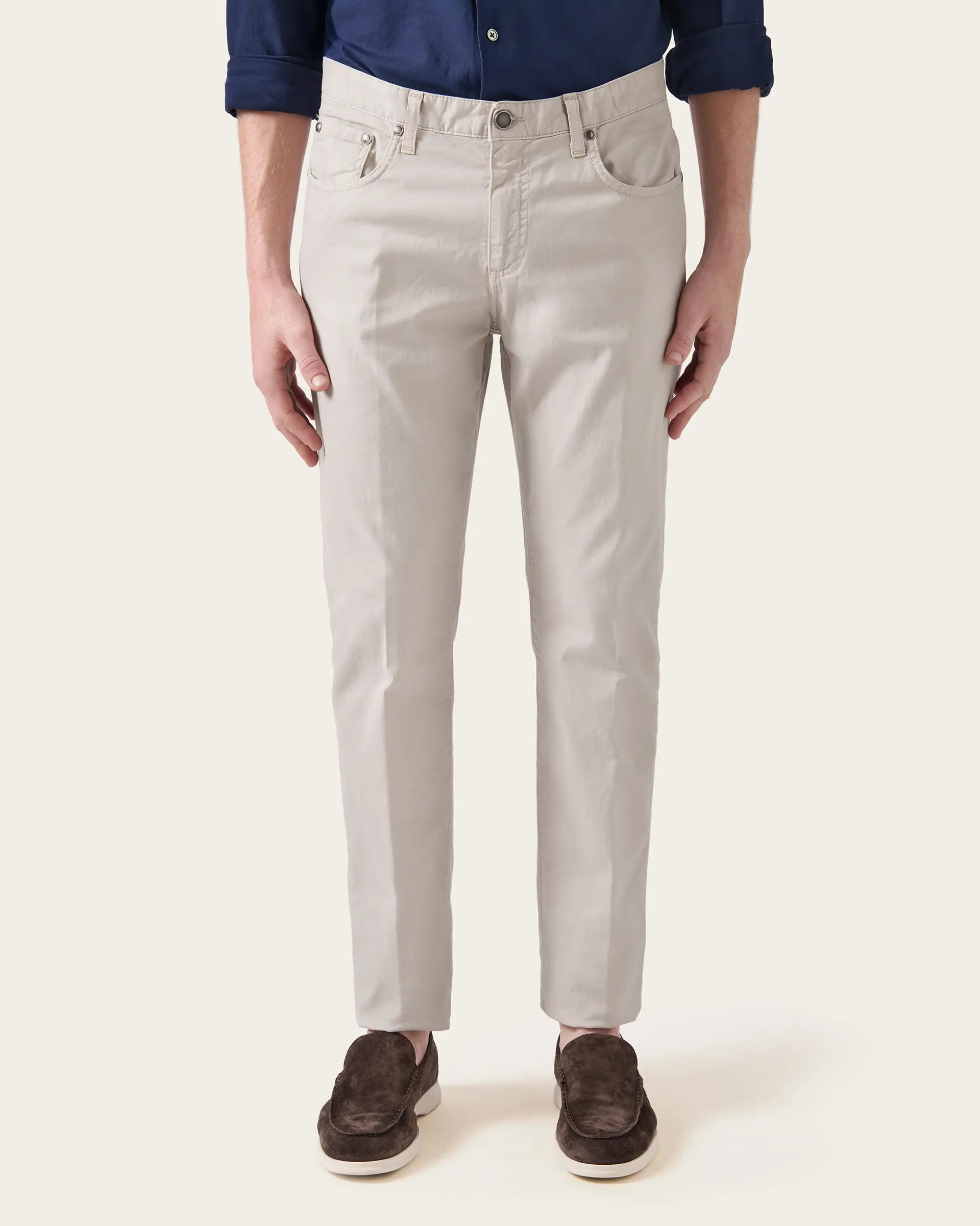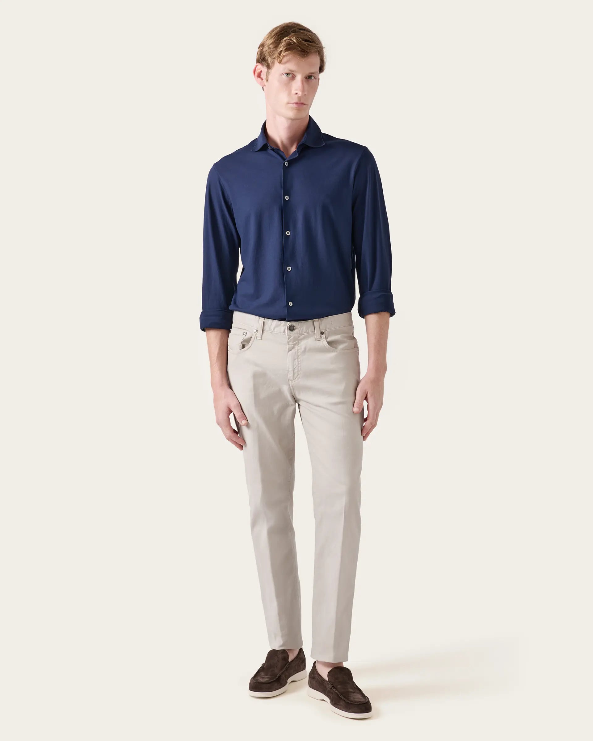 The informal and sporty character of the five-pocket trousers is enriched by the value and charm of sartorial care. The structure of the fabric guarantees the garment a high resistance to wear and washing while the garment dyeing process guarantees unique shades of color and gives softness to the trousers. The 5-pocket trousers are the essential garment with which to create infinite combinations of outfits ranging from refined sporty to a gritty classic with strong style characteristics.