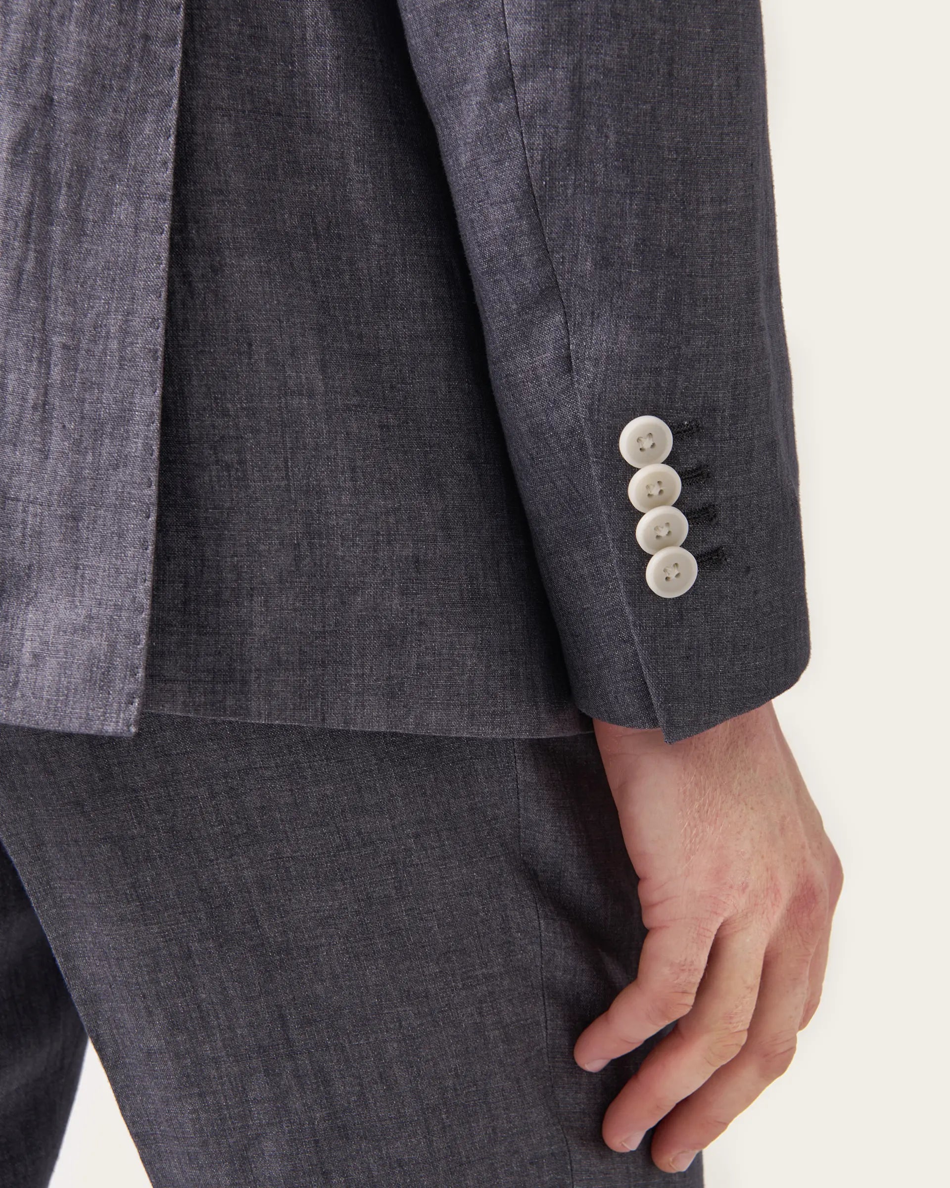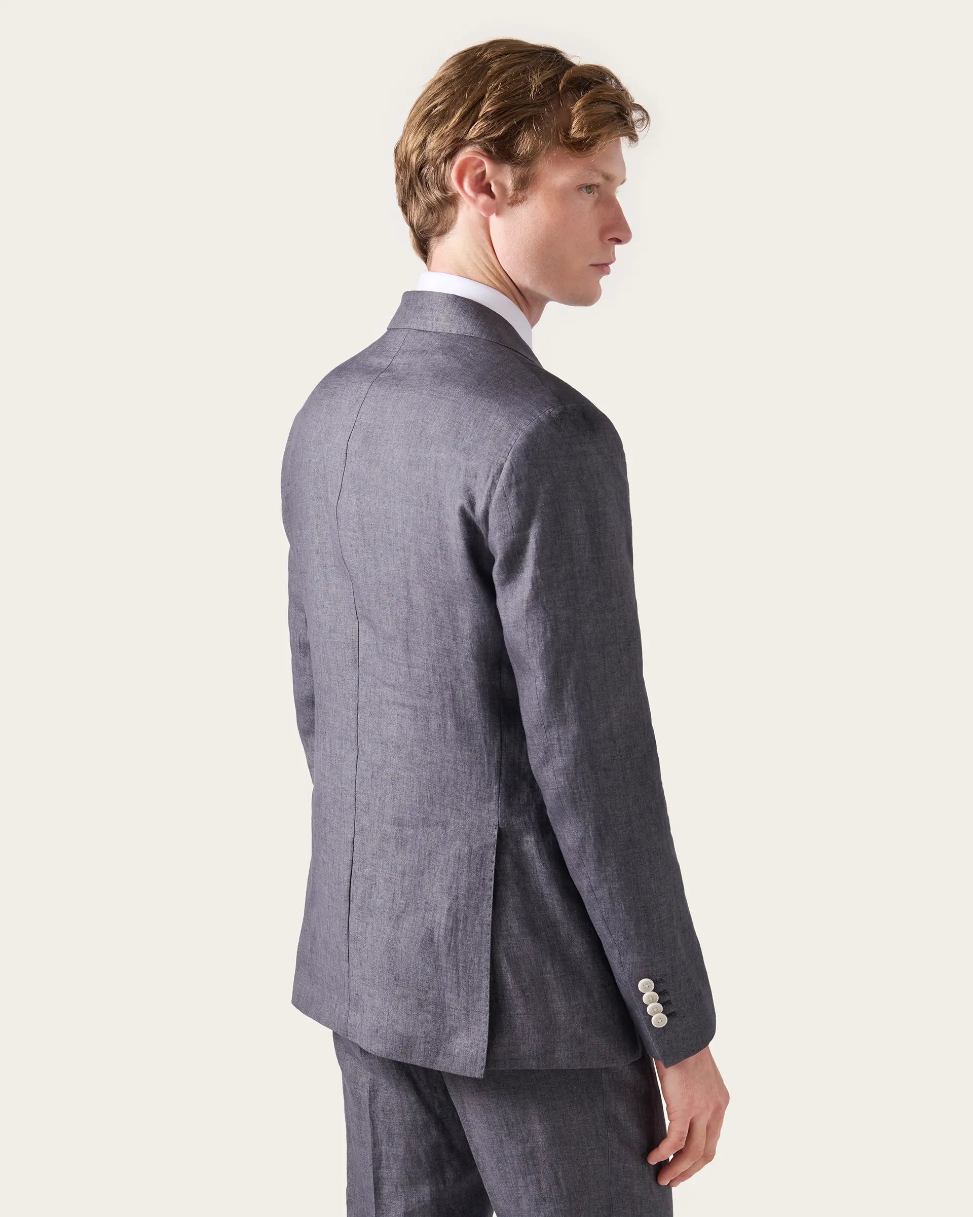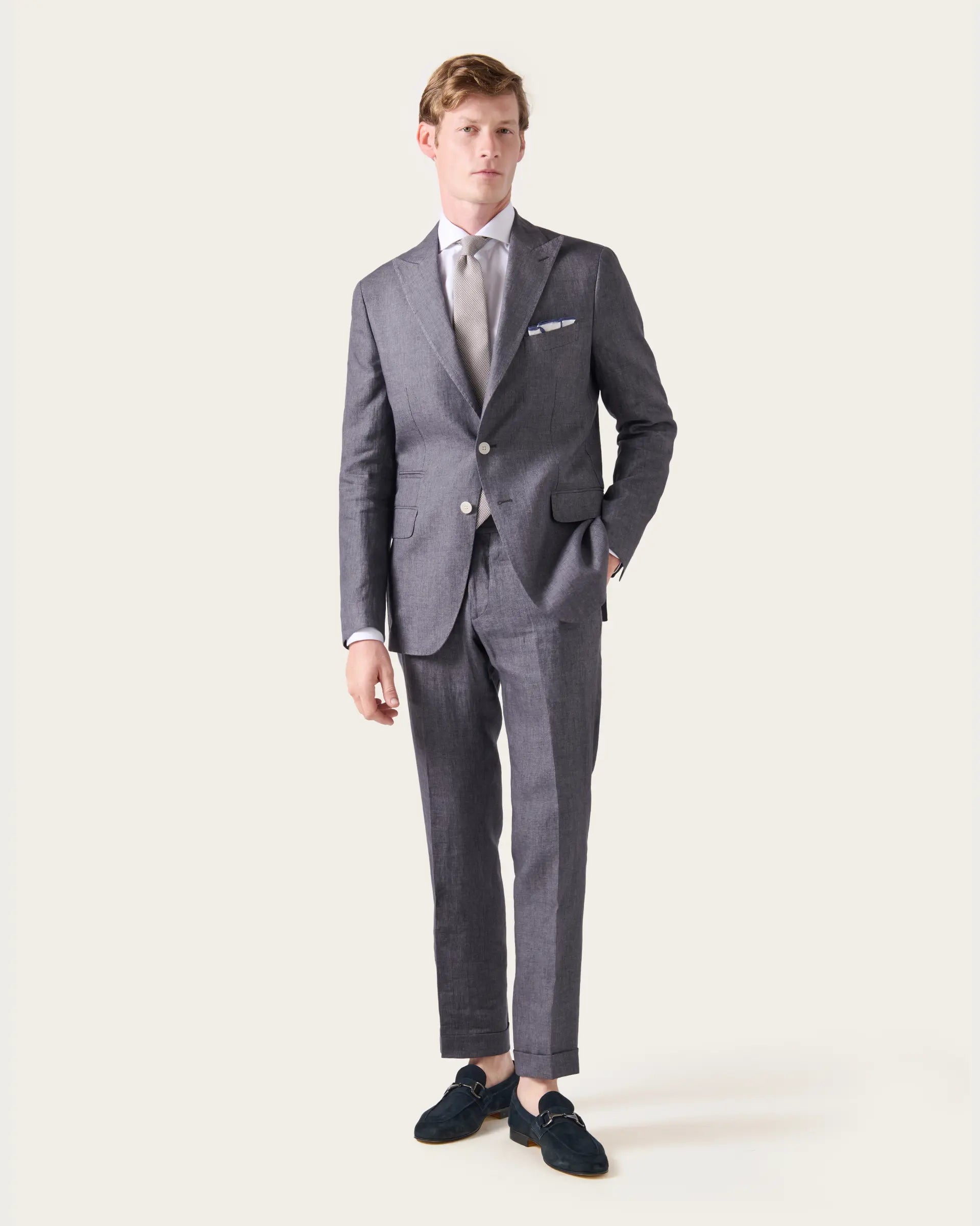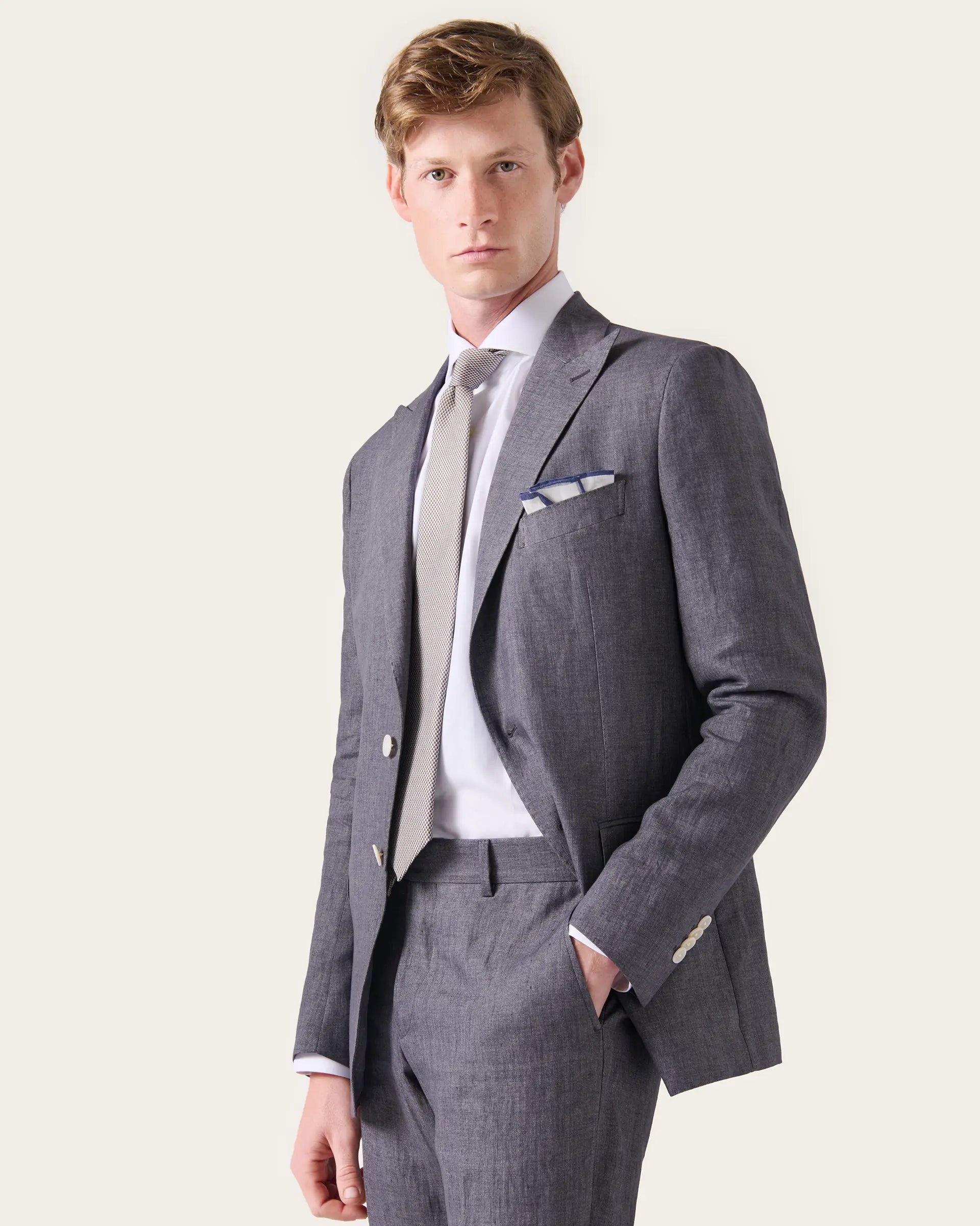 Tailored suit made of pure linen, a fabric with natural properties of resistance and thermoregulation in the name of lightness and softness particularly suitable for the warmer season. The unlined jacket is accompanied by trousers without pleats in front and is characterized by important peak lapels and a ticket pocket. The melange effect of the fabric and the attention to detail make this garment perfect for those who want to combine aesthetics, lightness and elegance even on hot summer days.
