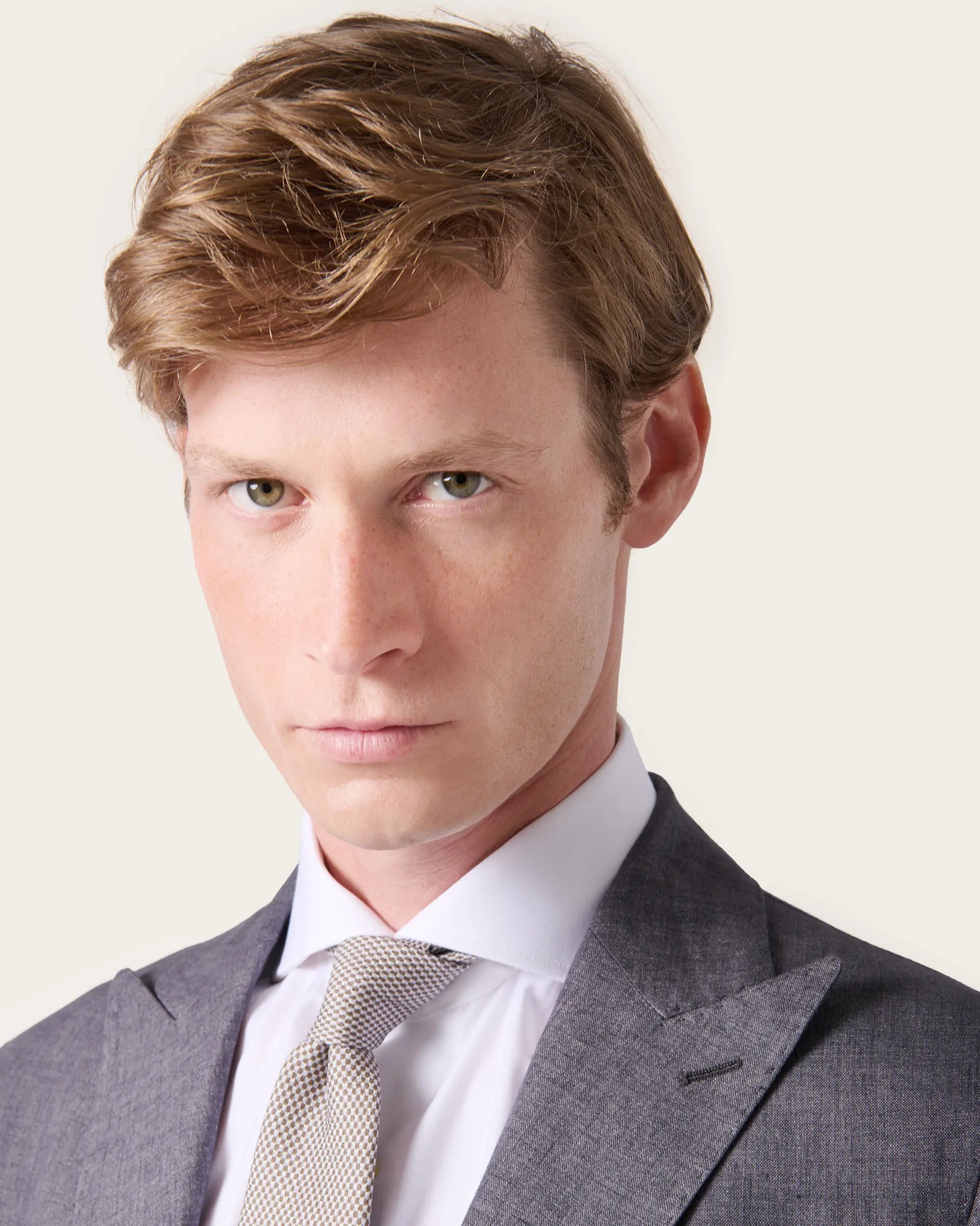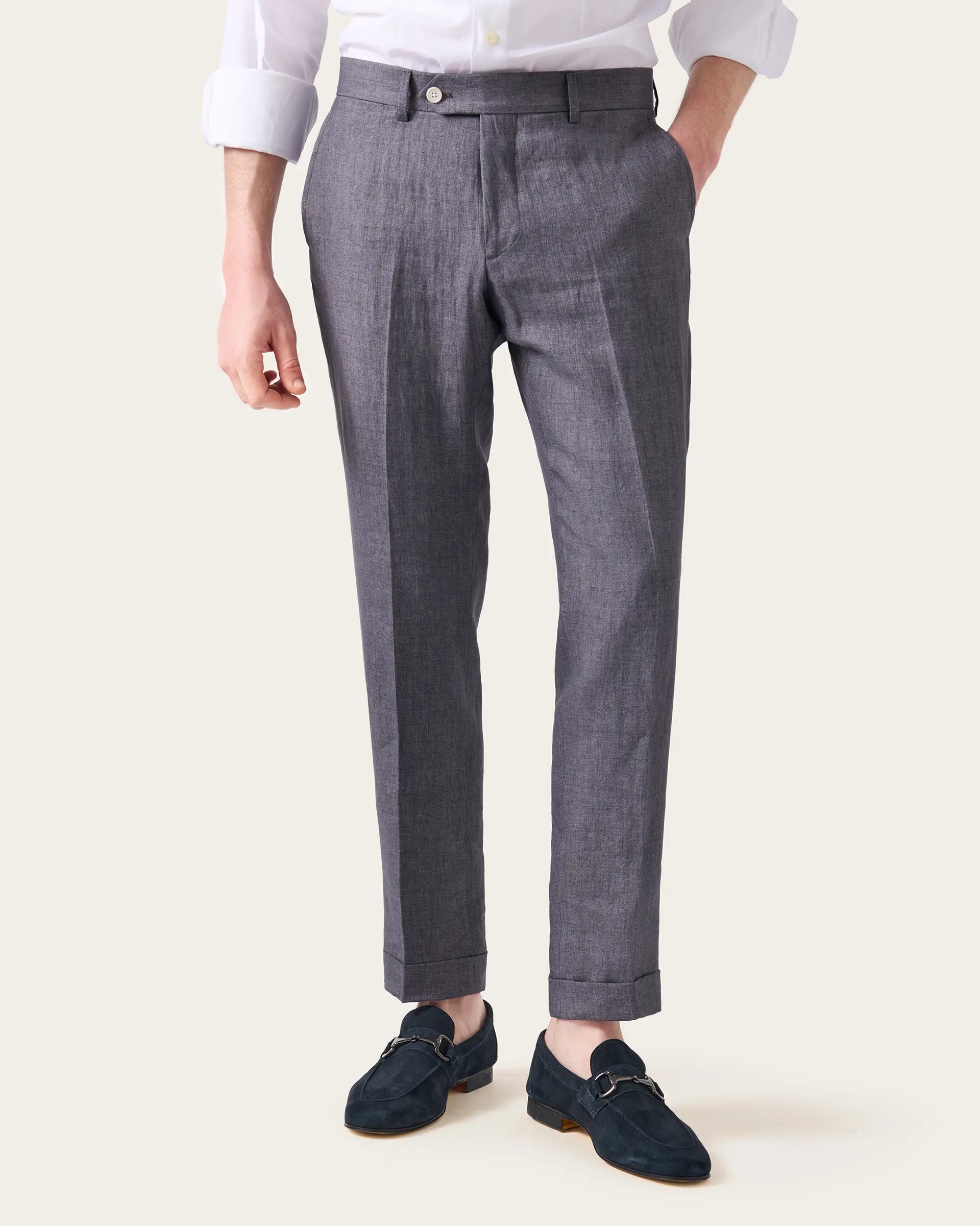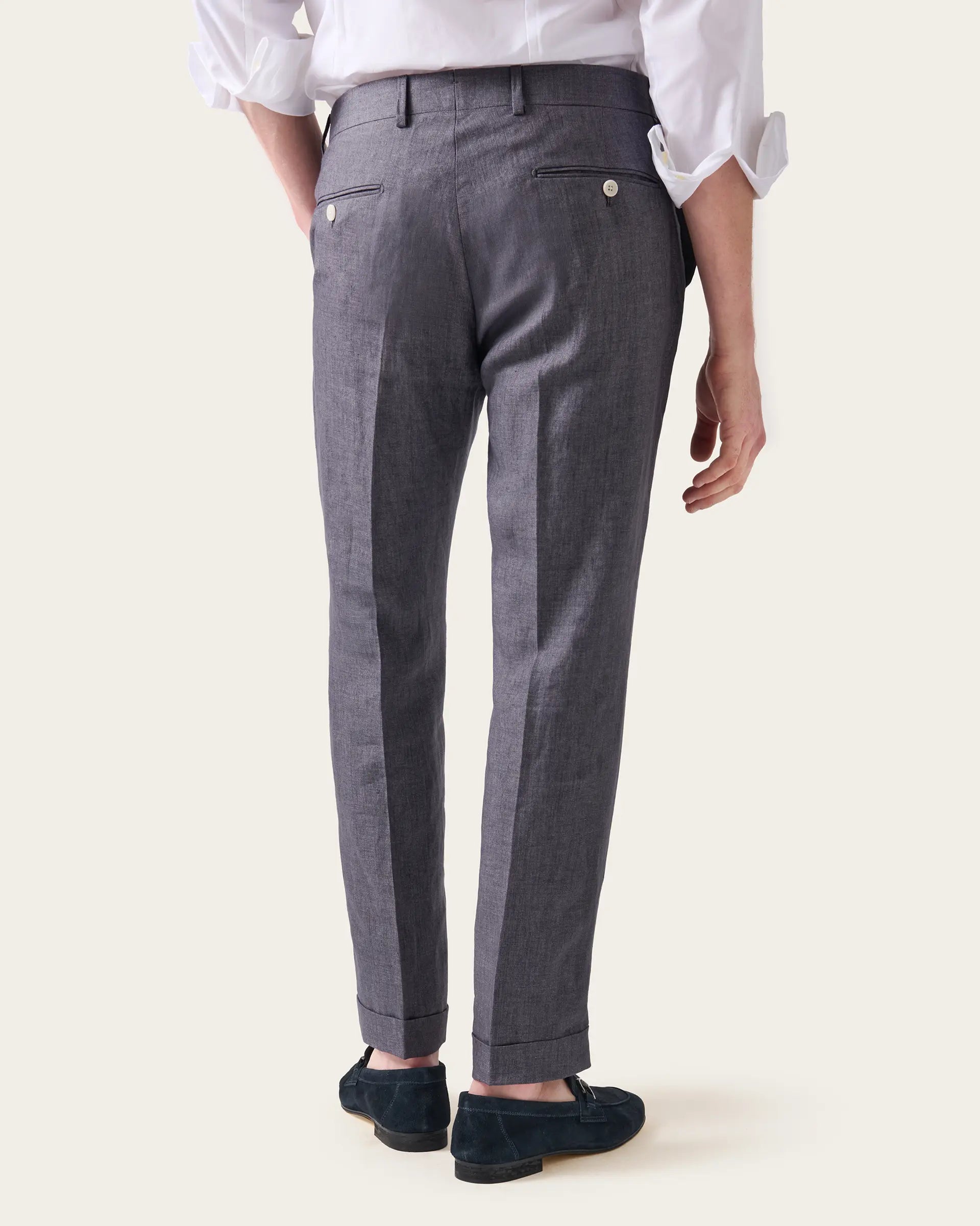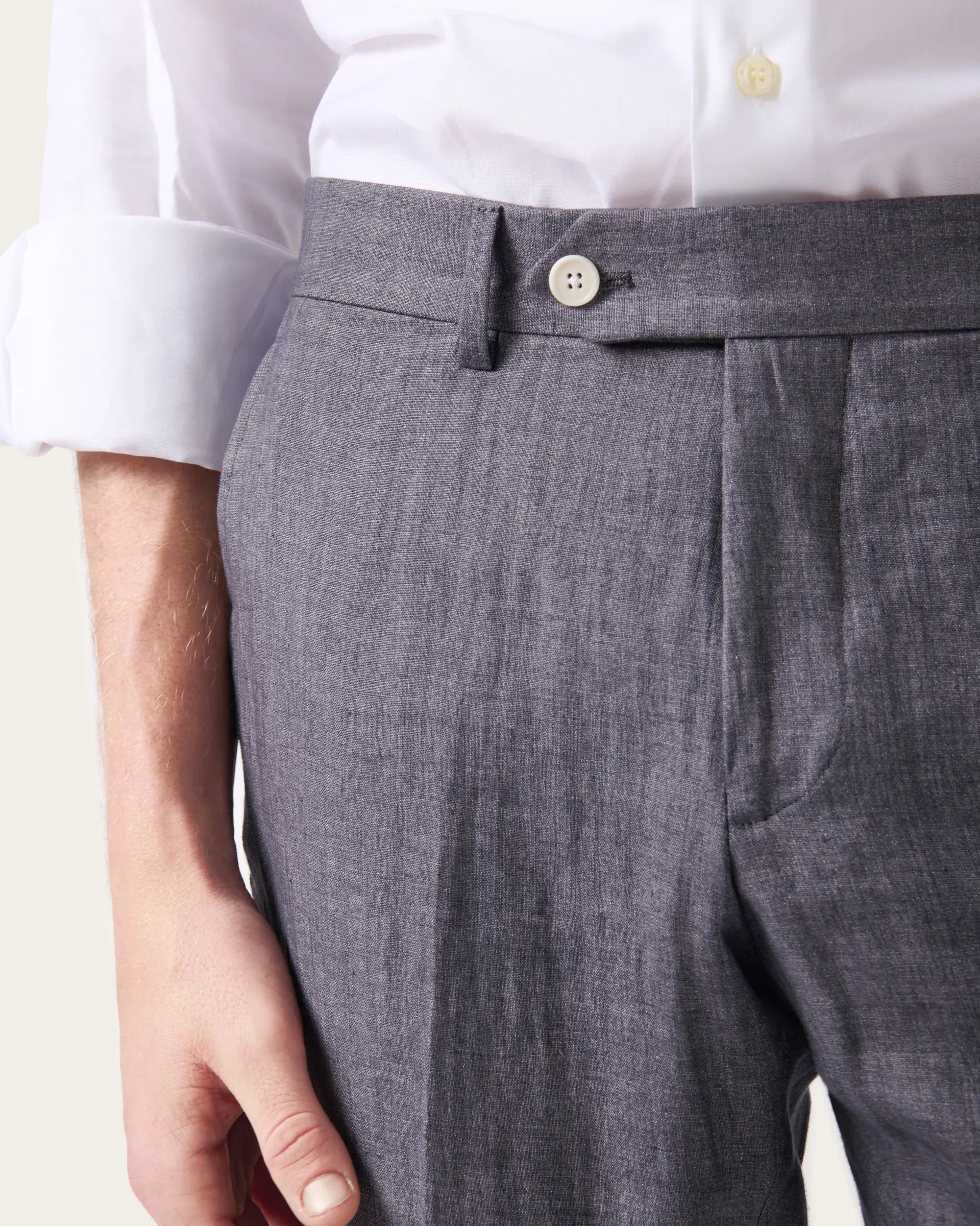 Tailored suit made of pure linen, a fabric with natural properties of resistance and thermoregulation in the name of lightness and softness particularly suitable for the warmer season. The unlined jacket is accompanied by trousers without pleats in front and is characterized by important peak lapels and a ticket pocket. The melange effect of the fabric and the attention to detail make this garment perfect for those who want to combine aesthetics, lightness and elegance even on hot summer days.