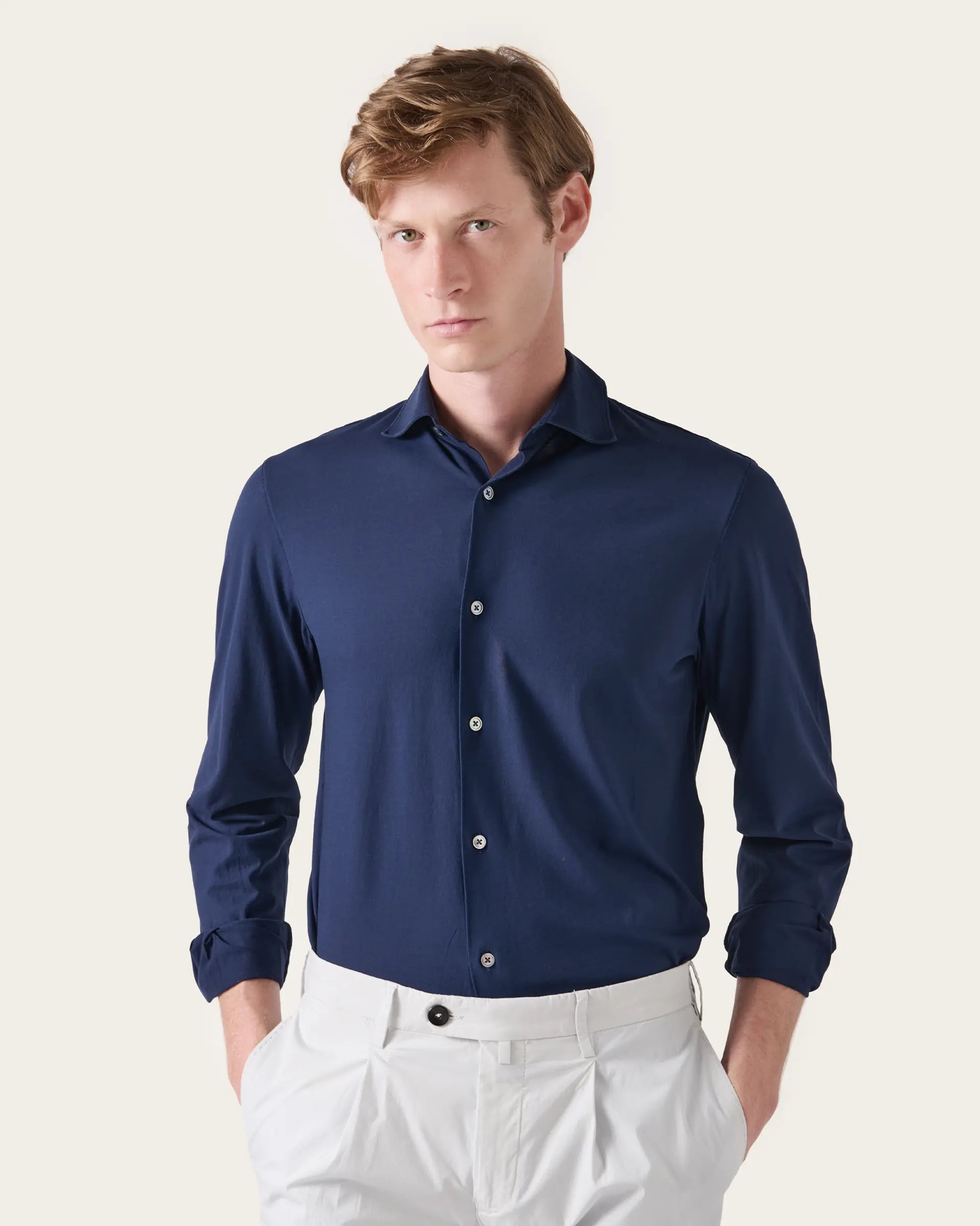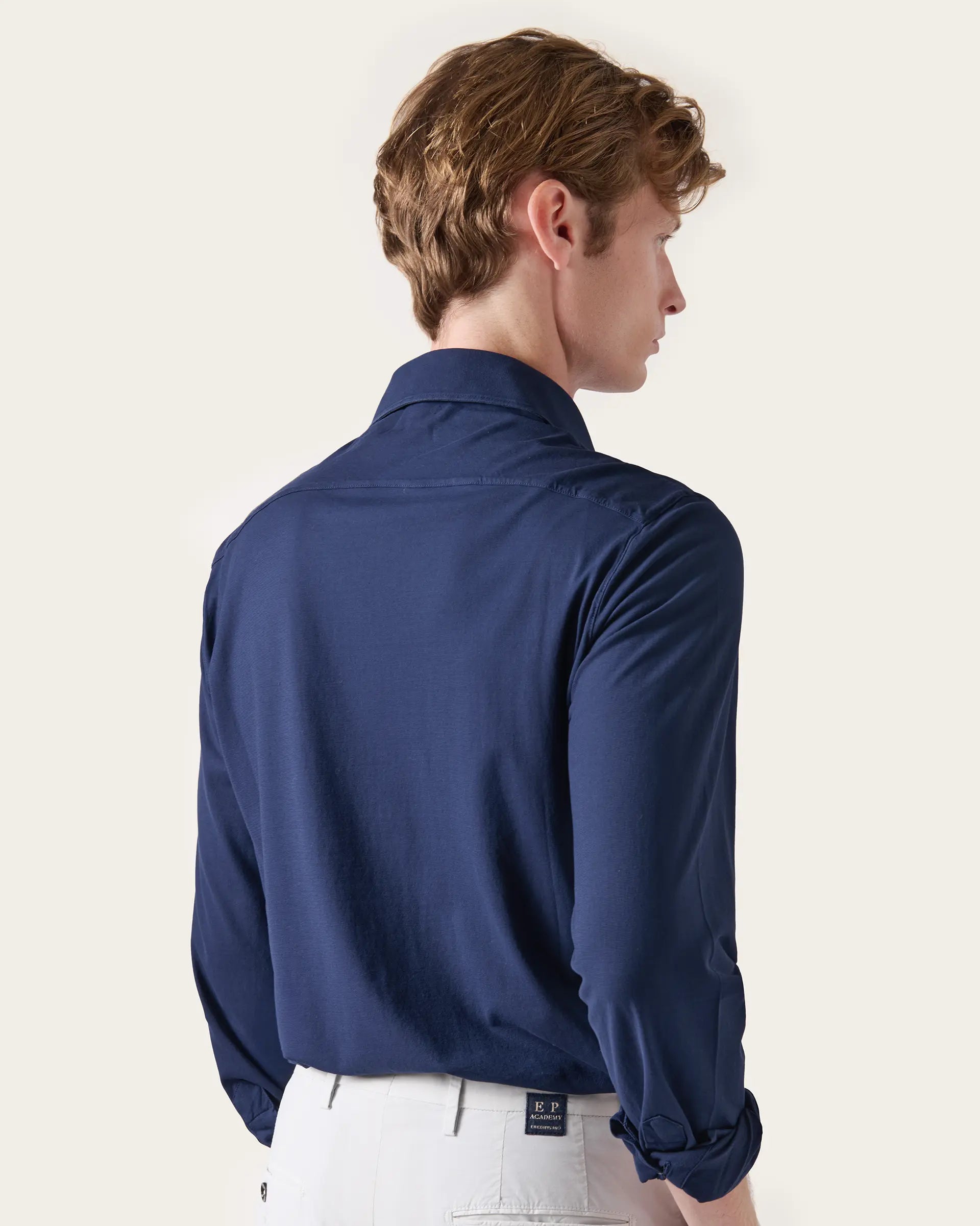 An alternative and seasonal interpretation of the classic shirt, it is made of high-quality pure cotton jersey in a comfortable cut and semi-fitted design. The shirt-style cuffs and collar add a touch of refinement while maintaining a sporty aesthetic, making it perfect to be worn even under a jacket.