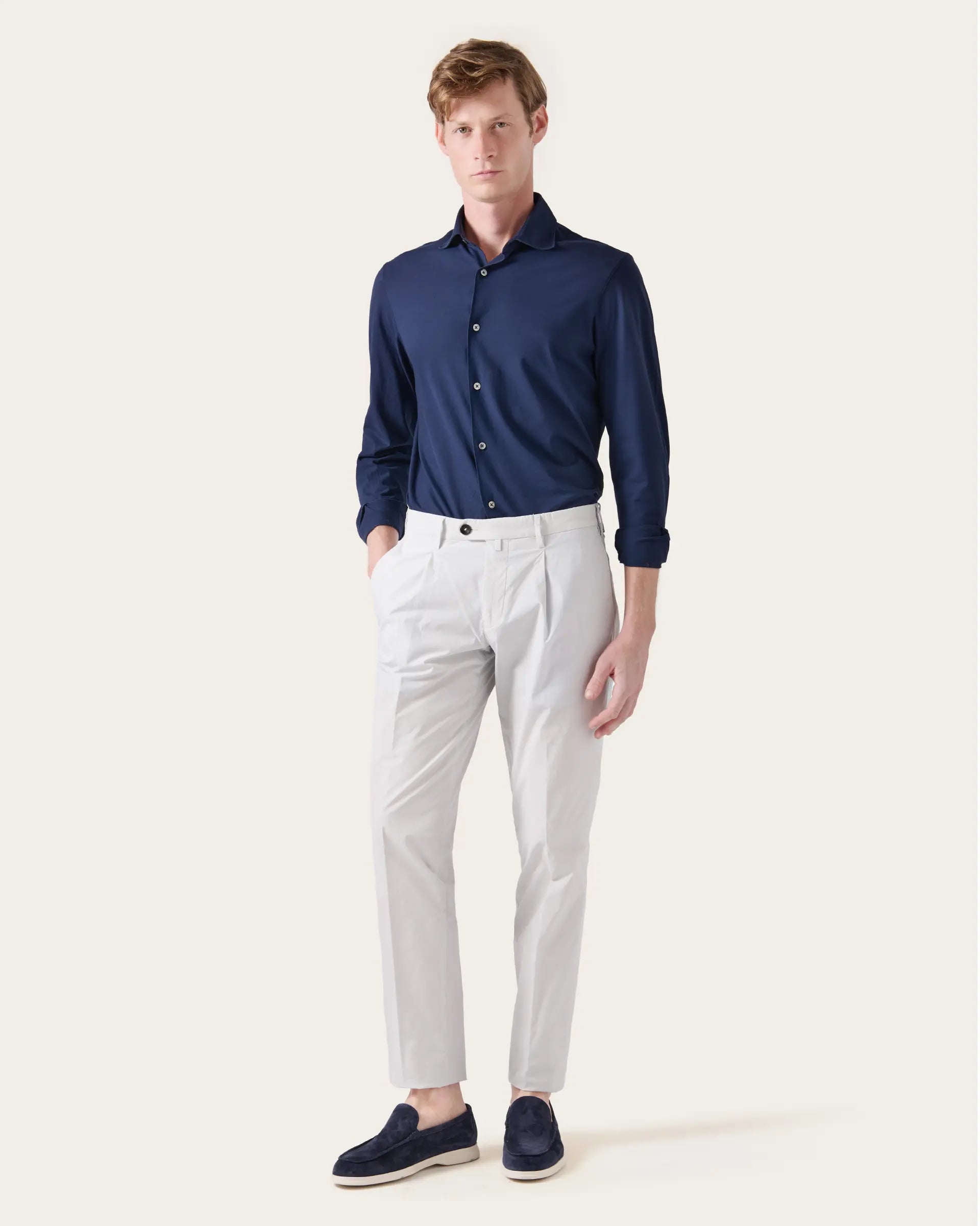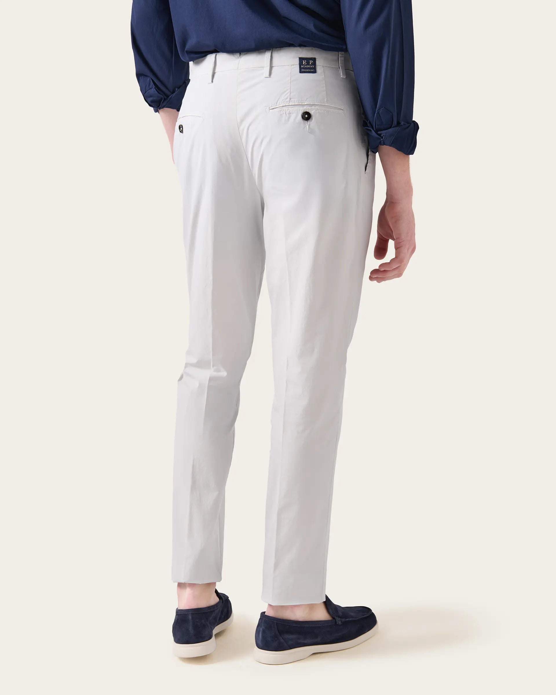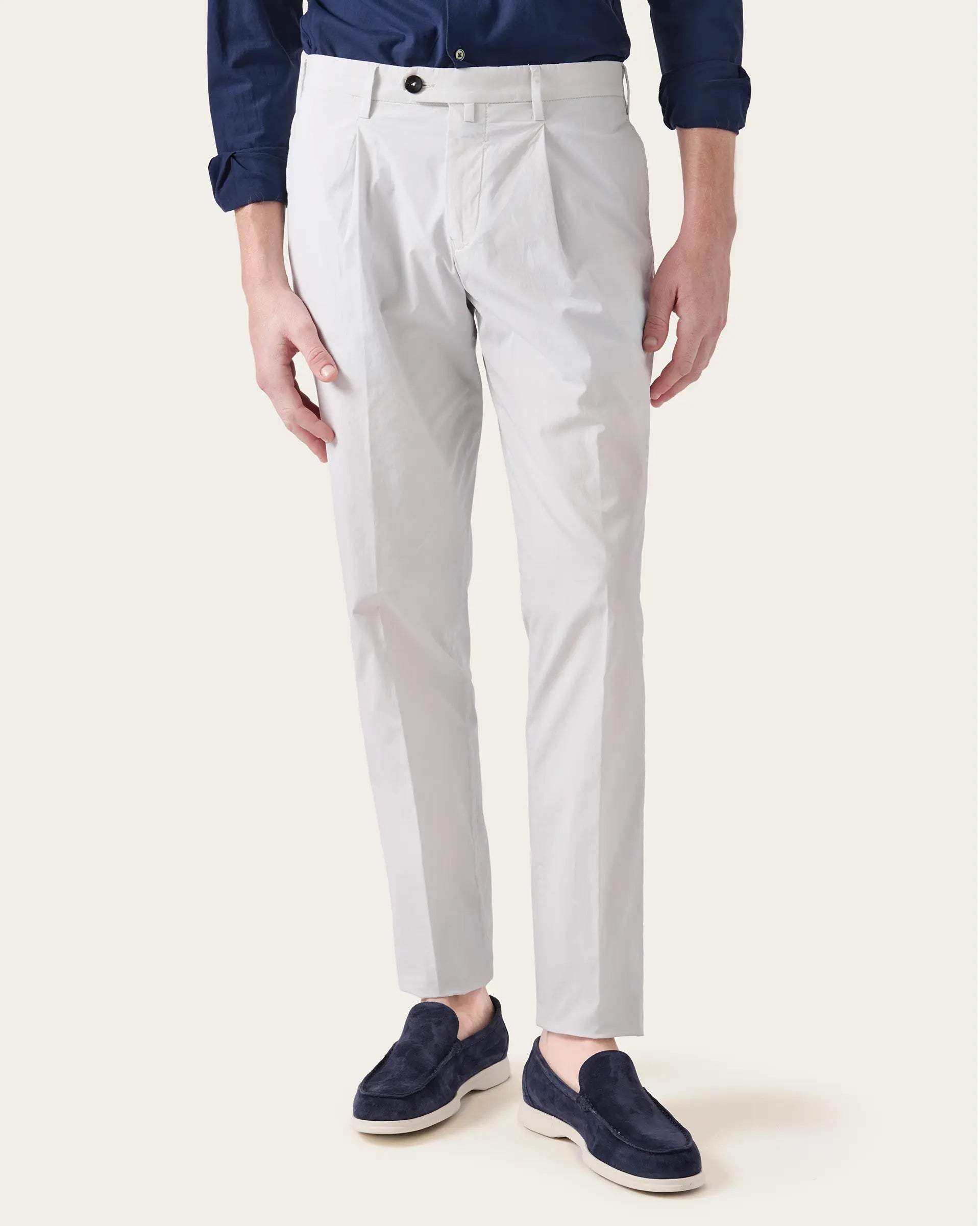 Chino trousers with pleats made of stretch cotton poplin, a soft and fresh but at the same time resistant fabric. The combination with elastane guarantees exceptional comfort all day long, proving to be a comfortable garment to wear as well as extremely versatile. The garment dyeing adds a pleasant chromatic effect to a leisure garment with a modern and refined style.