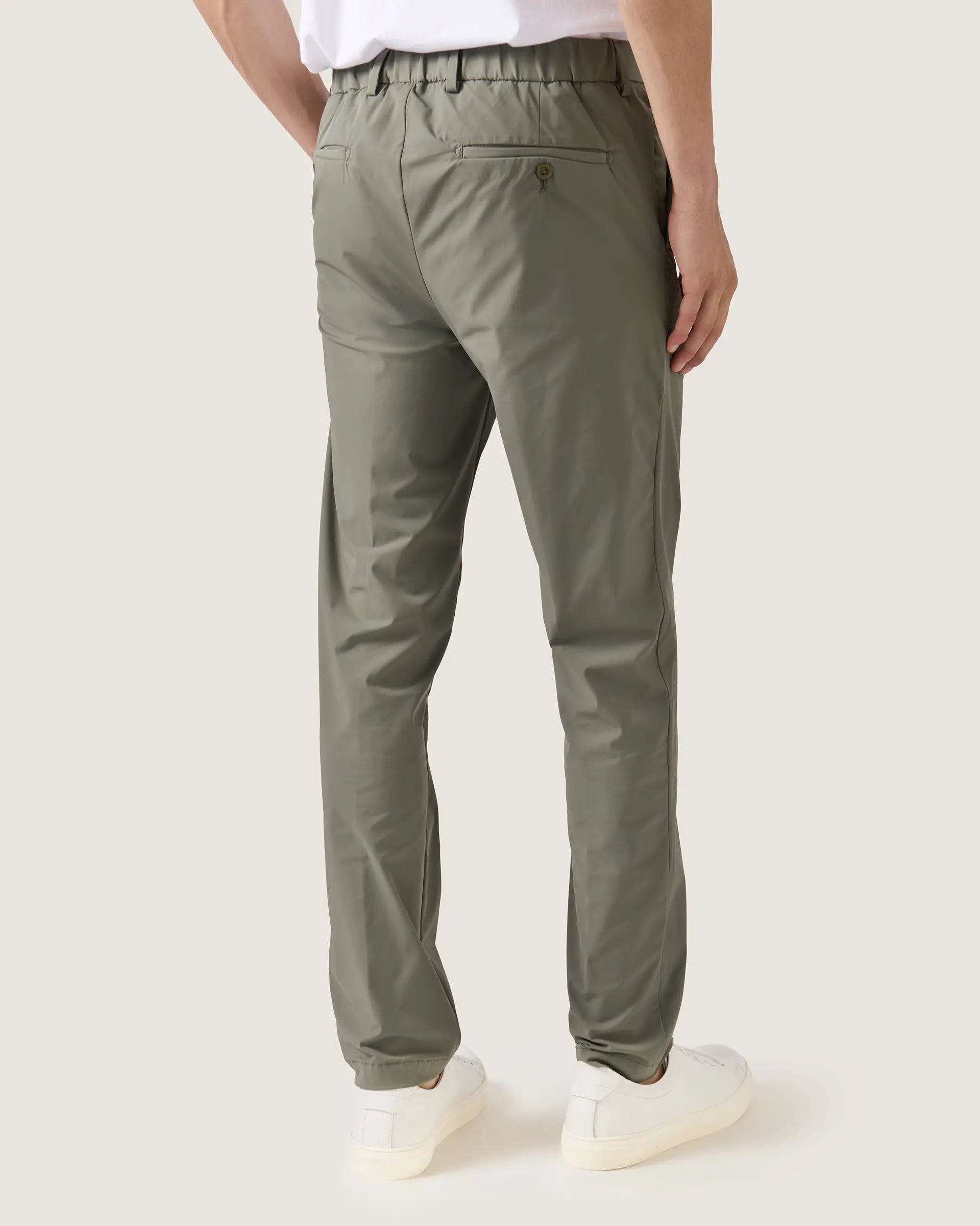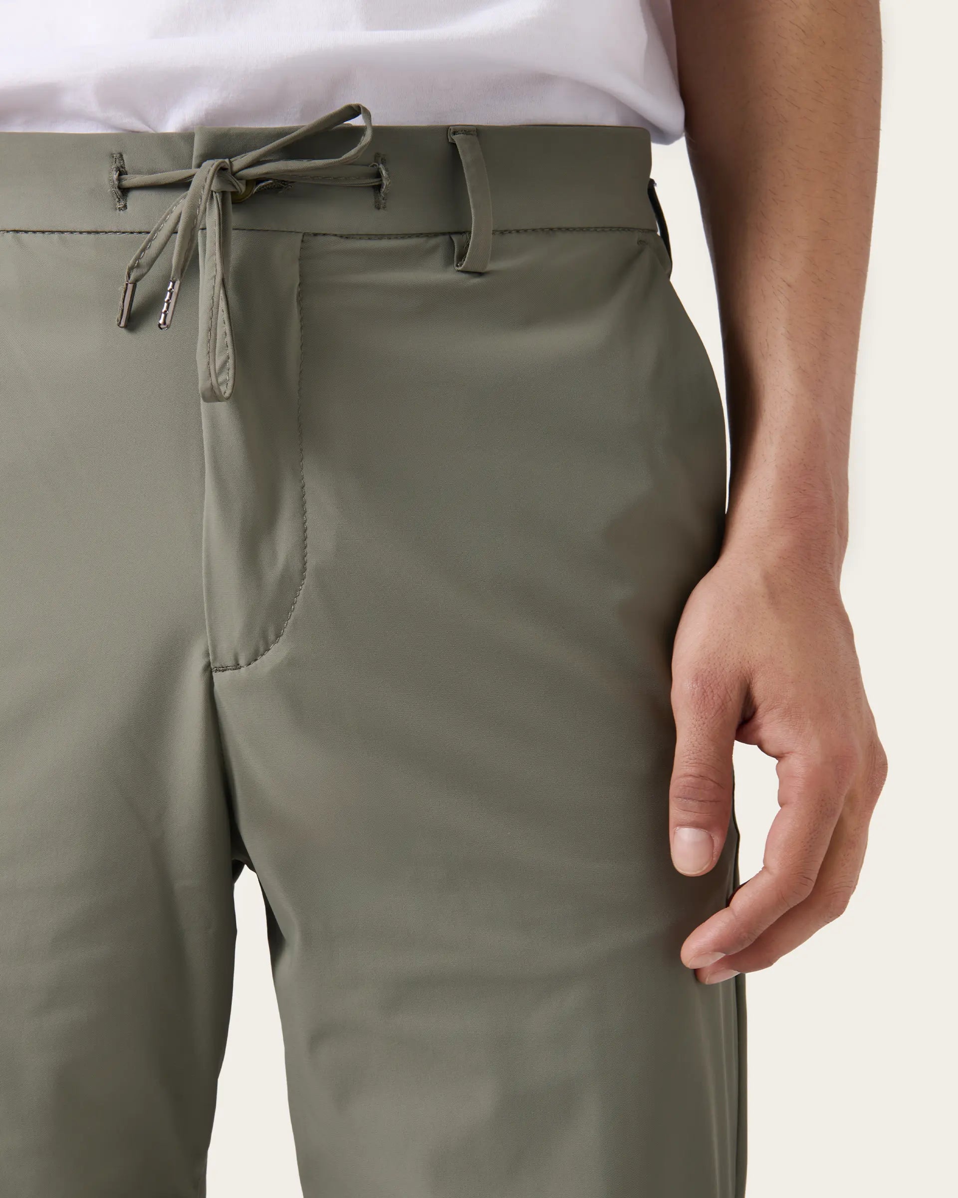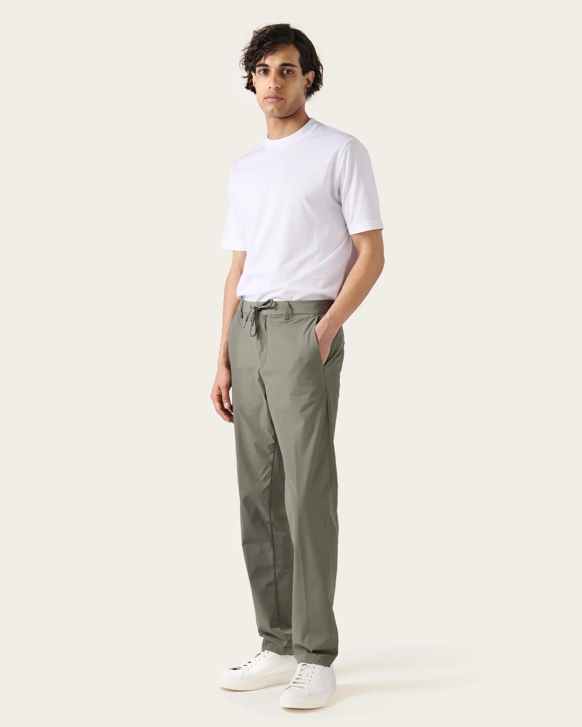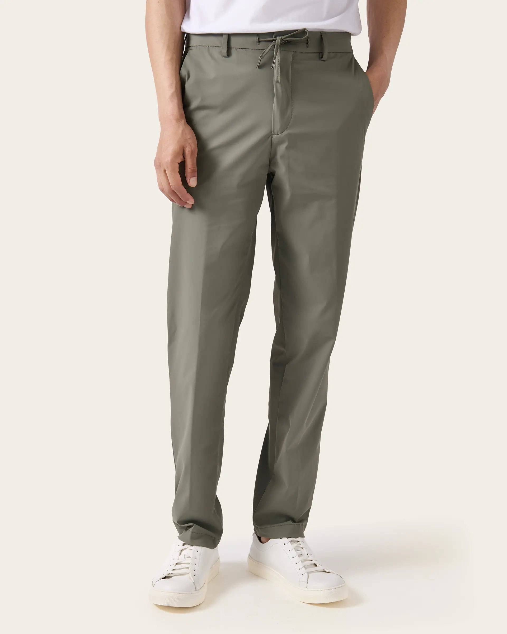 Trousers designed to meet the needs of a life divided between work and free time, made in a virtuous blend of high-performance technical fibers. The composition of the fabric makes it extremely light, quick drying, comfortable and pleasant to the touch. The waistband with elastic band and drawstring guarantee the garment superior comfort while maintaining its sartorial essence.