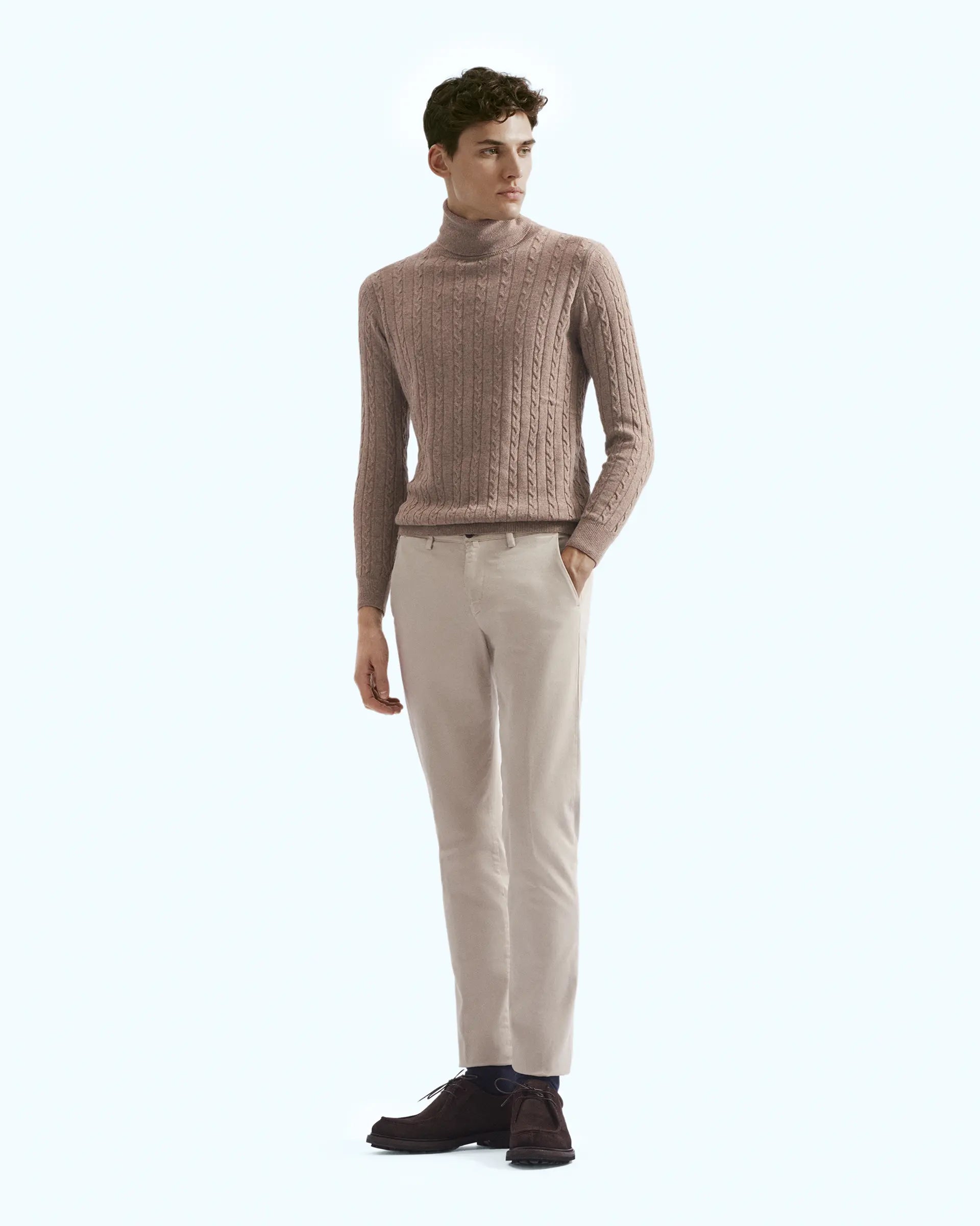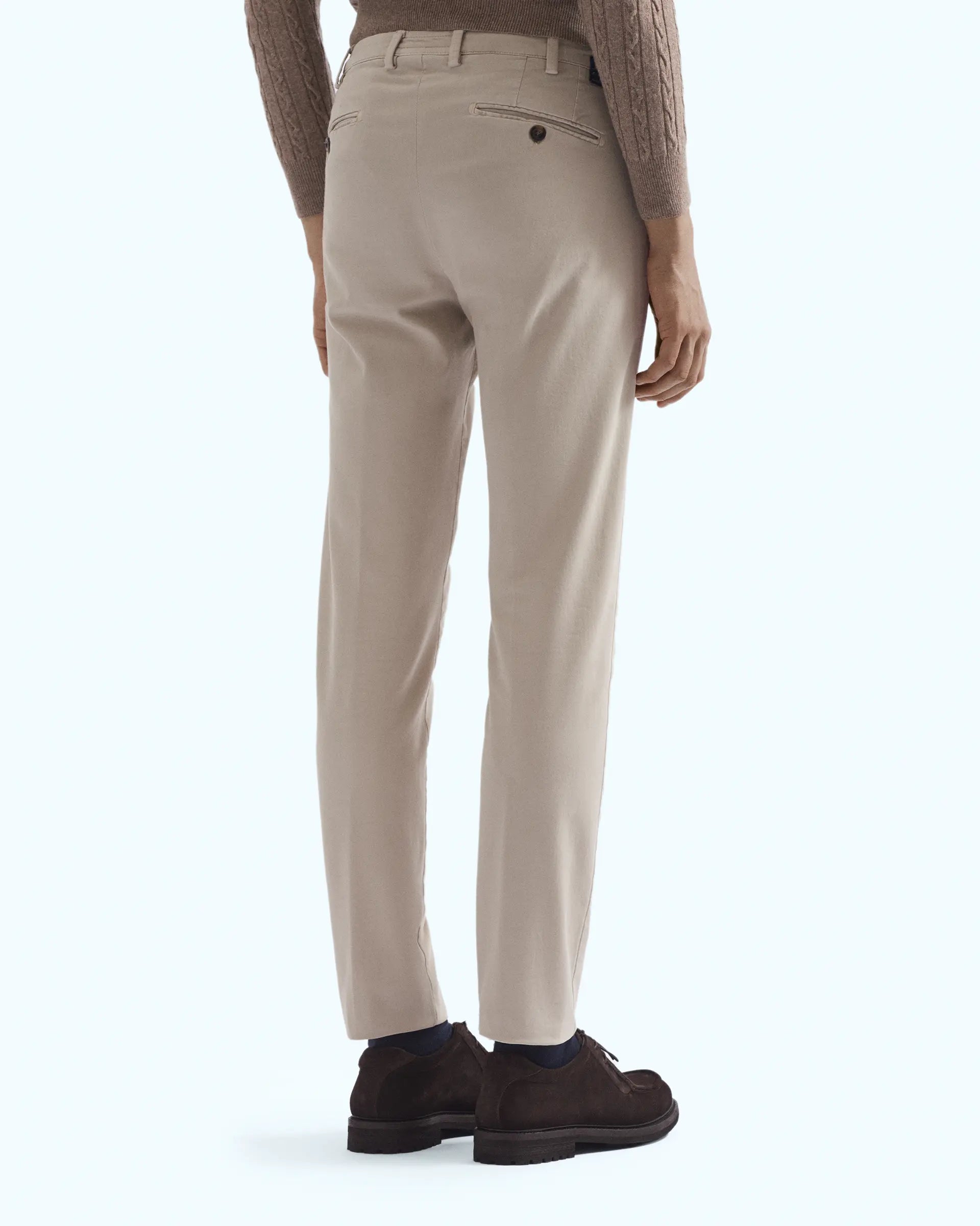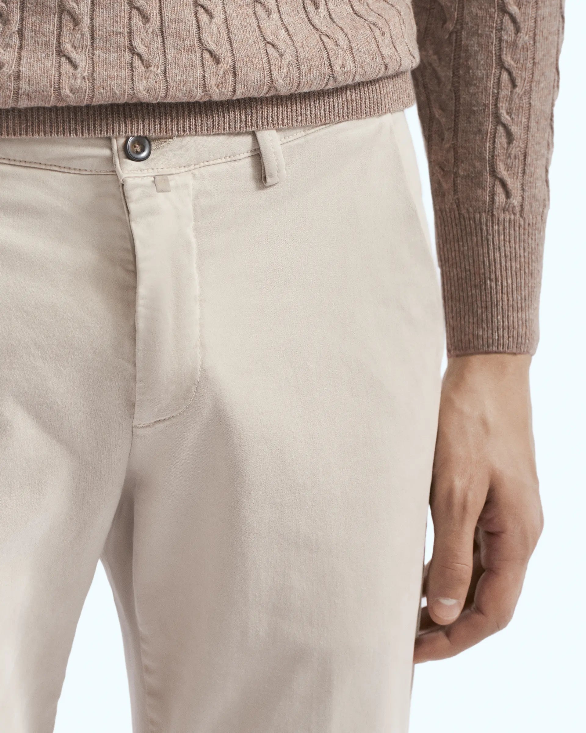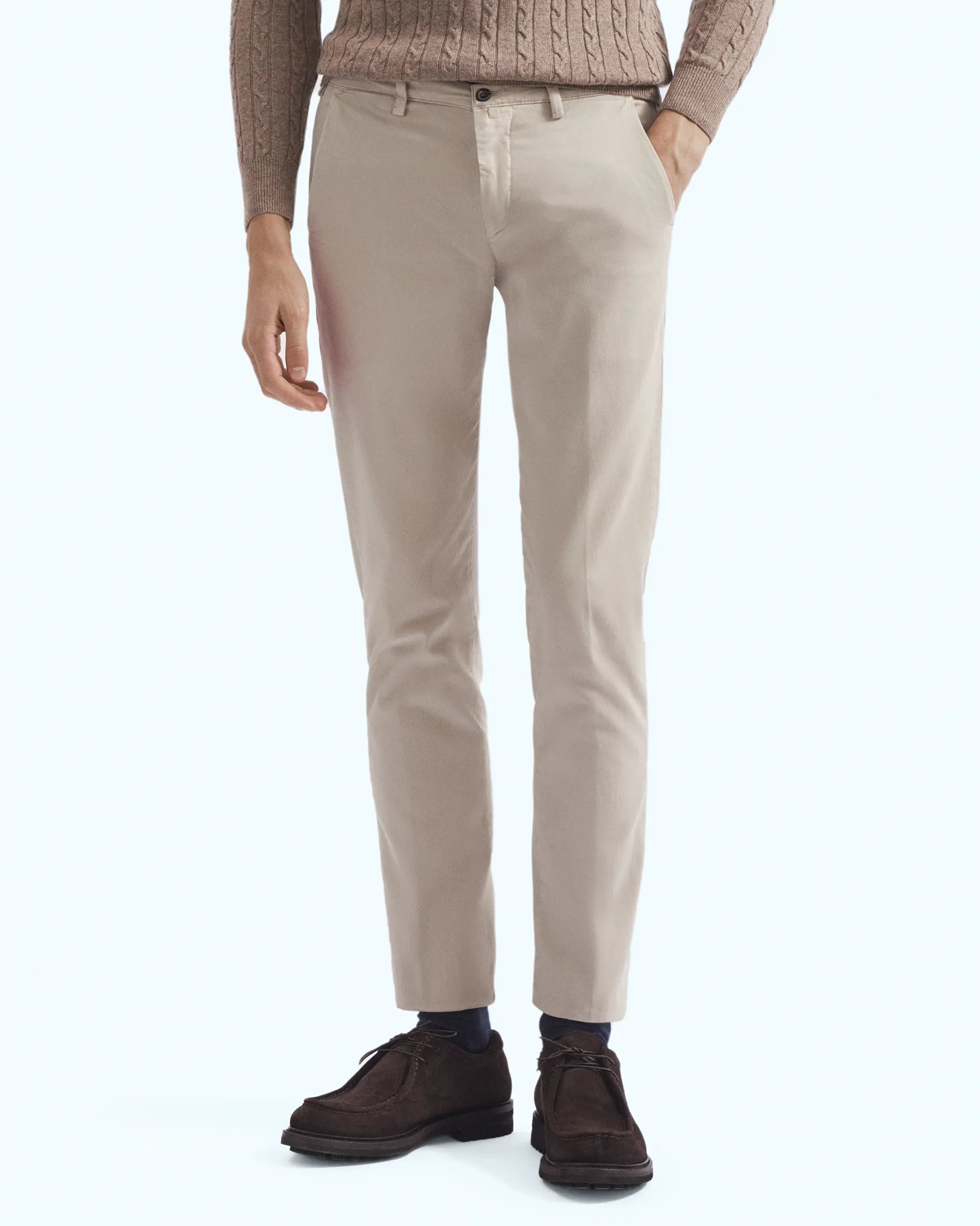 Chino trousers in stretch cotton presented in a delicate microcheck pattern which is enriched with a special garment dyeing technique. The comfortable, high-performance and casual style of the trousers combines with the typical British-inspired tailoring design to create an original and highly valuable garment.