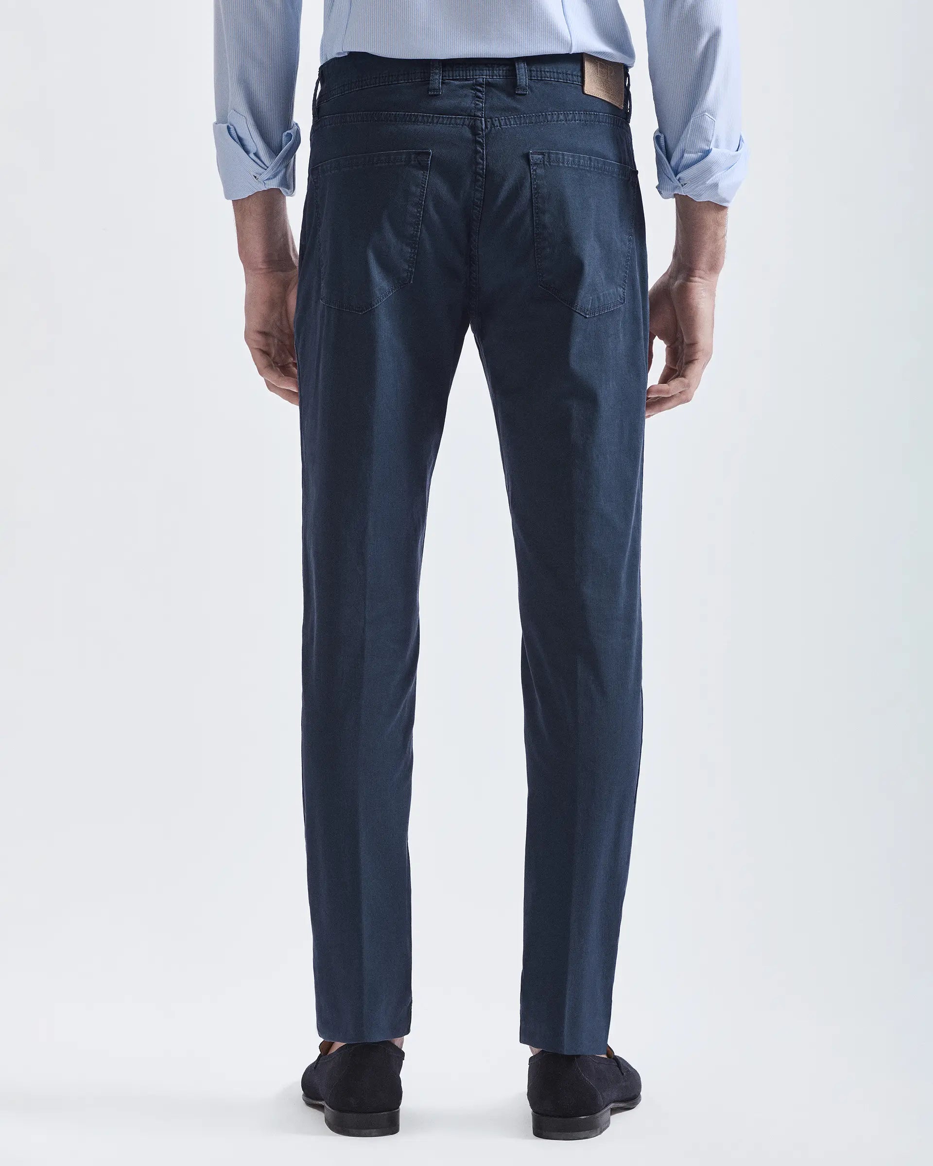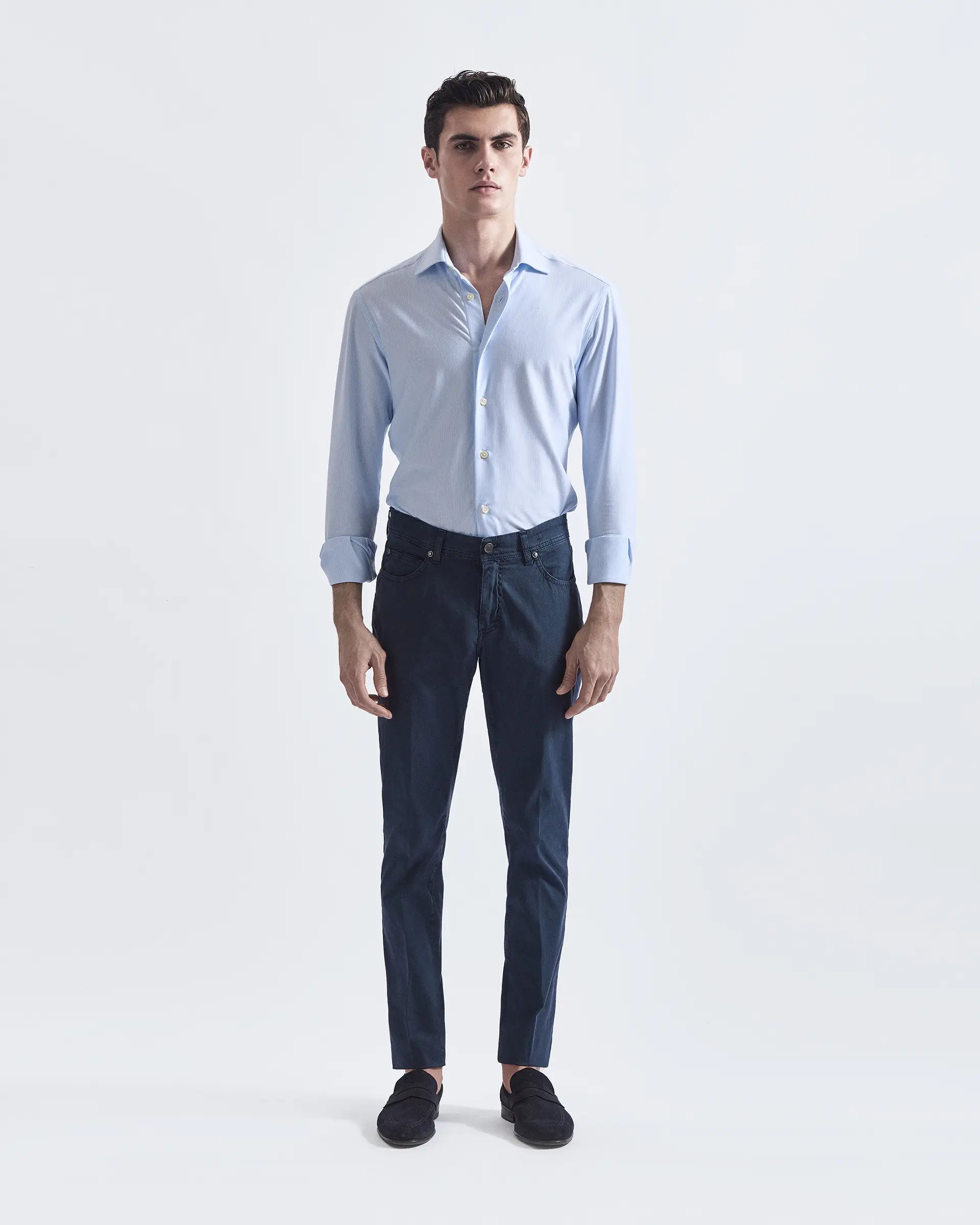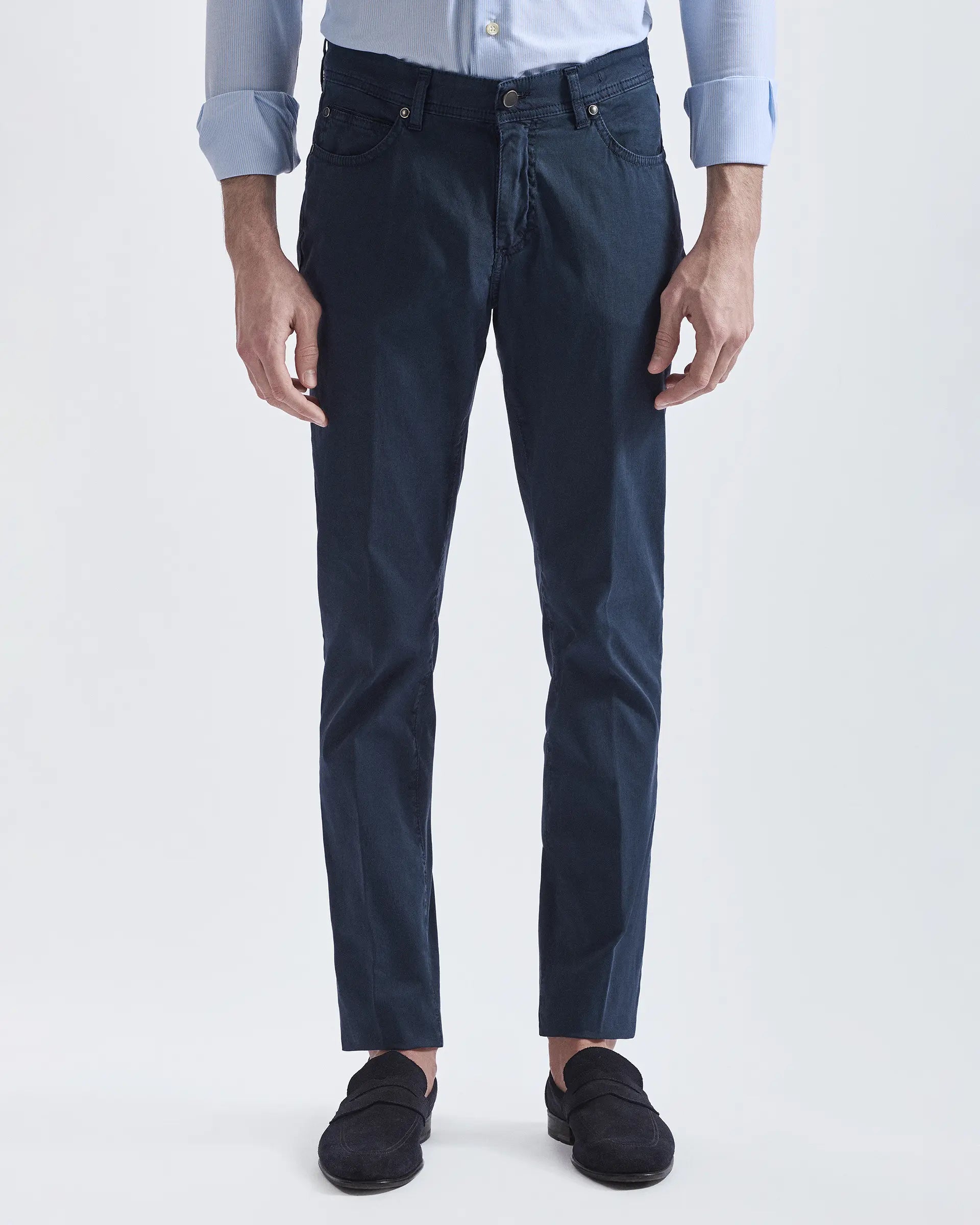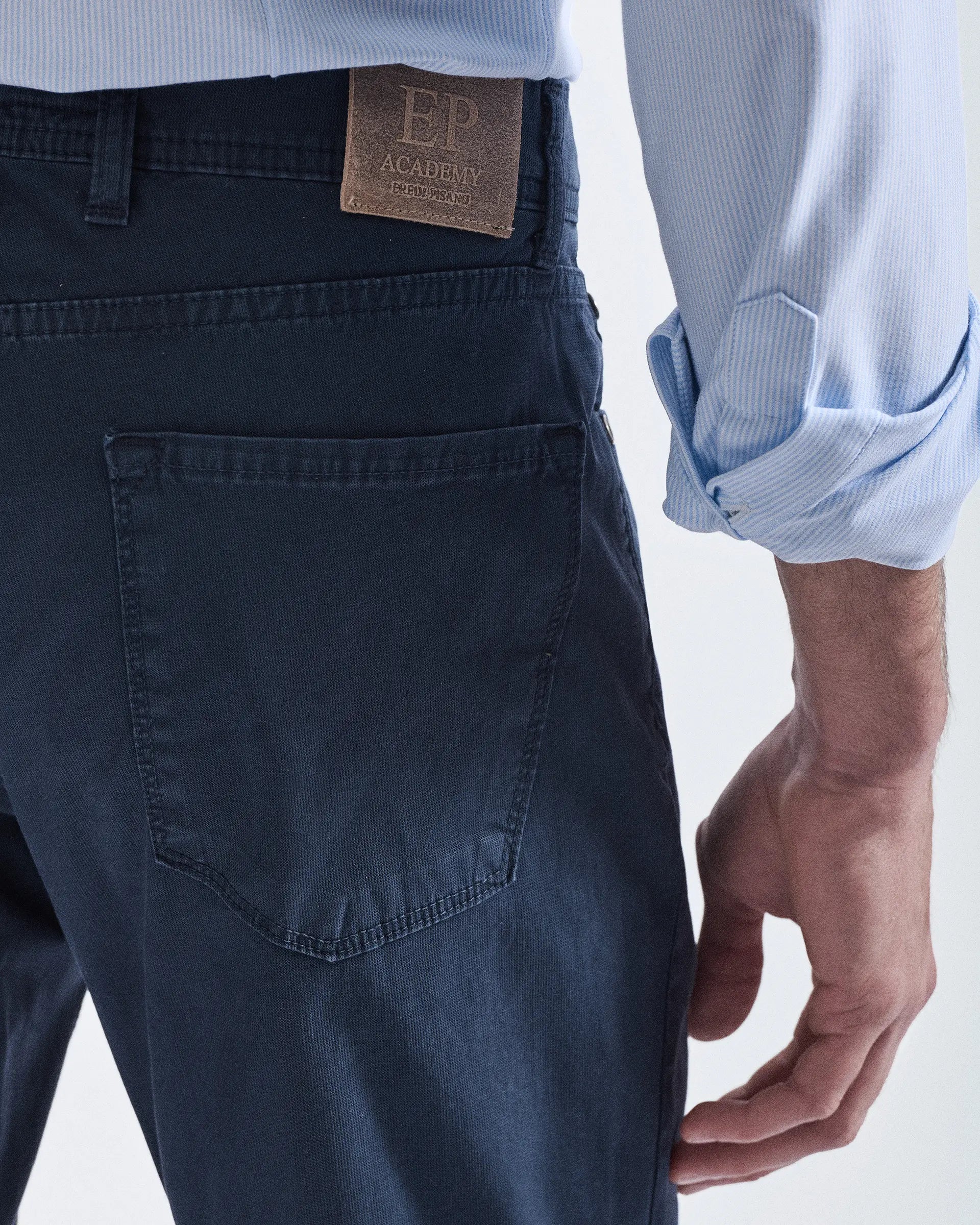 The informal and sporty character of the five-pocket trousers is embellished with the value and charm of careful tailoring. The structure of the fabric guarantees the garment high resistance to wear and washing. The 5-pocket trousers are the essential garment with which to create infinite combinations of outfits ranging from refined sportswear to a bold classic with strong style characteristics.
