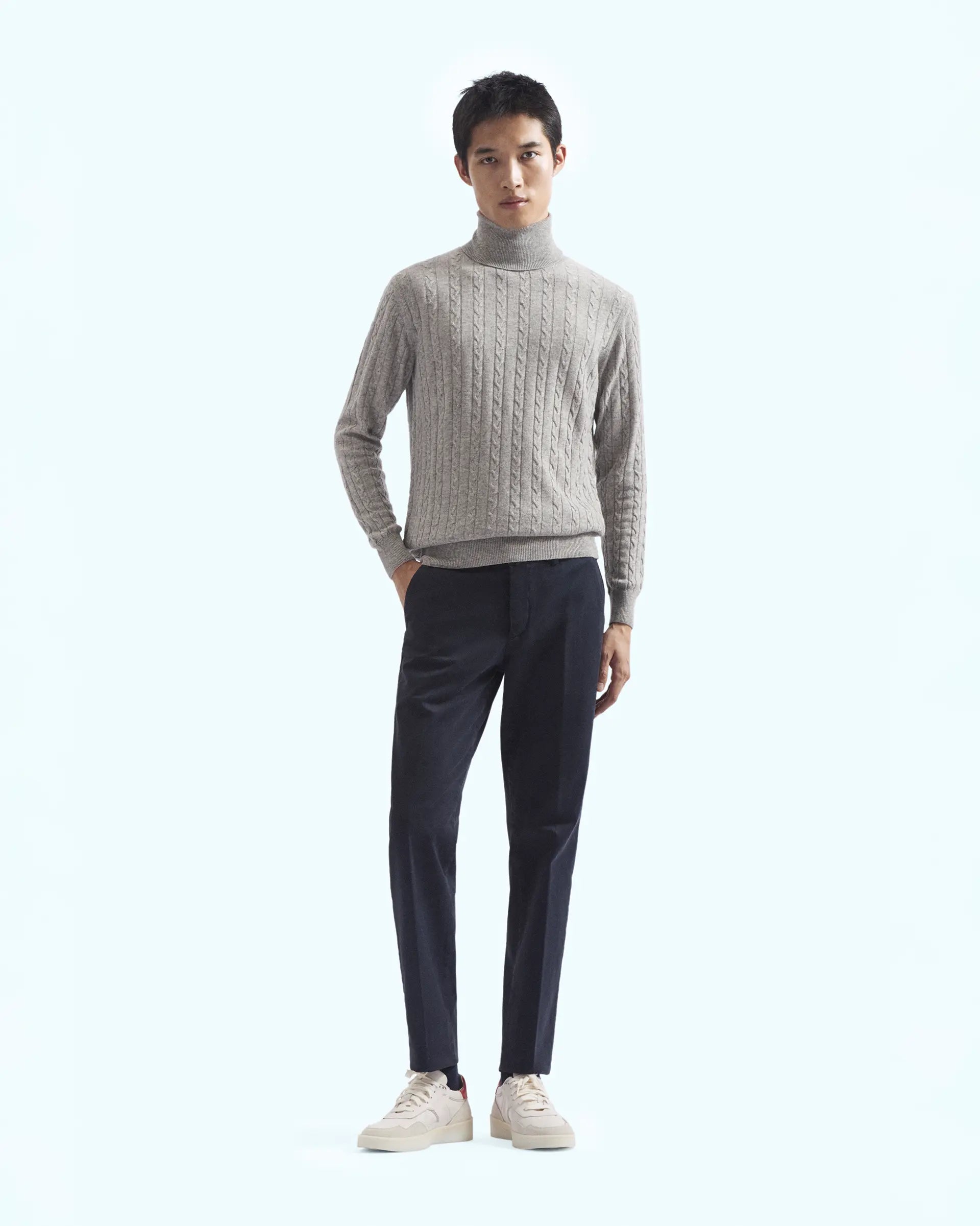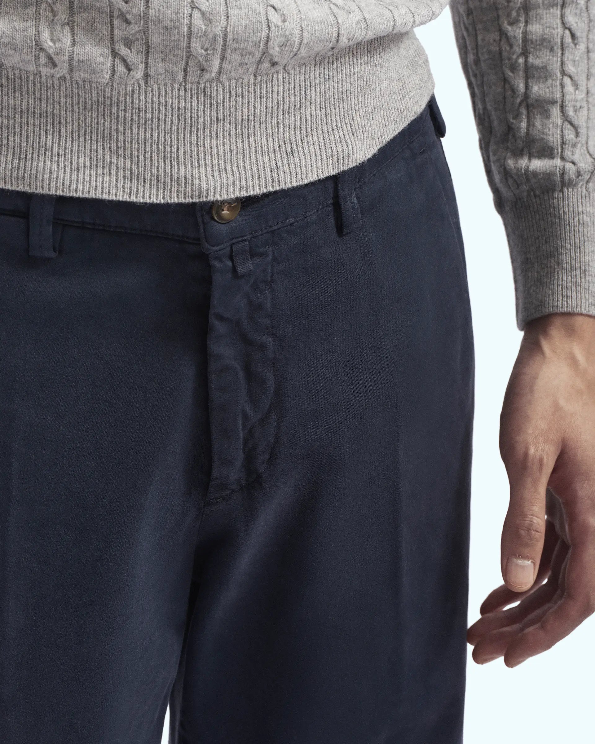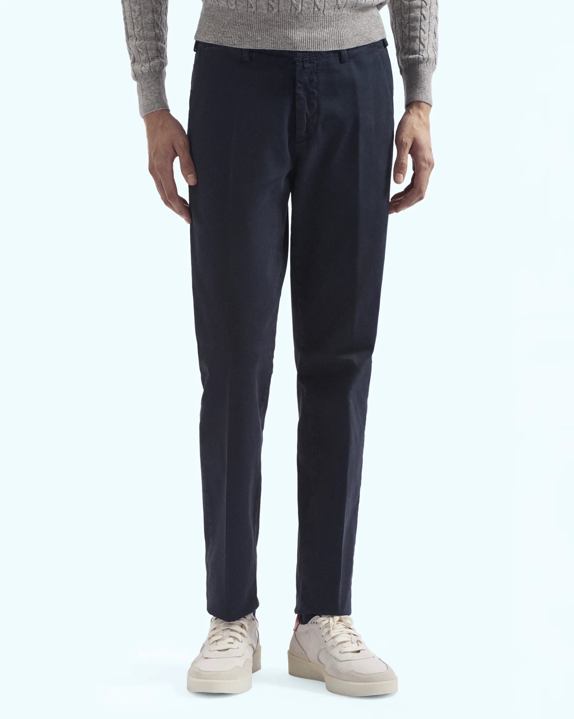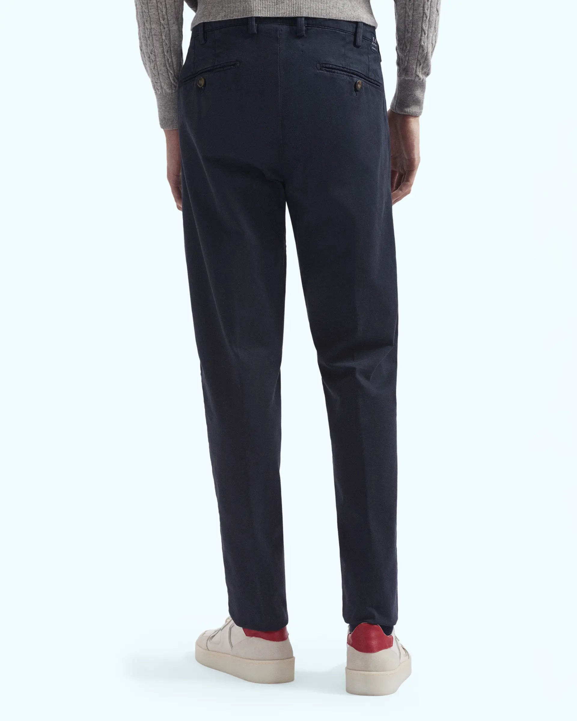 Chino trousers in stretch cotton presented in a delicate microcheck pattern which is enriched with a special garment dyeing technique. The comfortable, high-performance and casual style of the trousers combines with the typical British-inspired tailoring design to create an original and highly valuable garment.