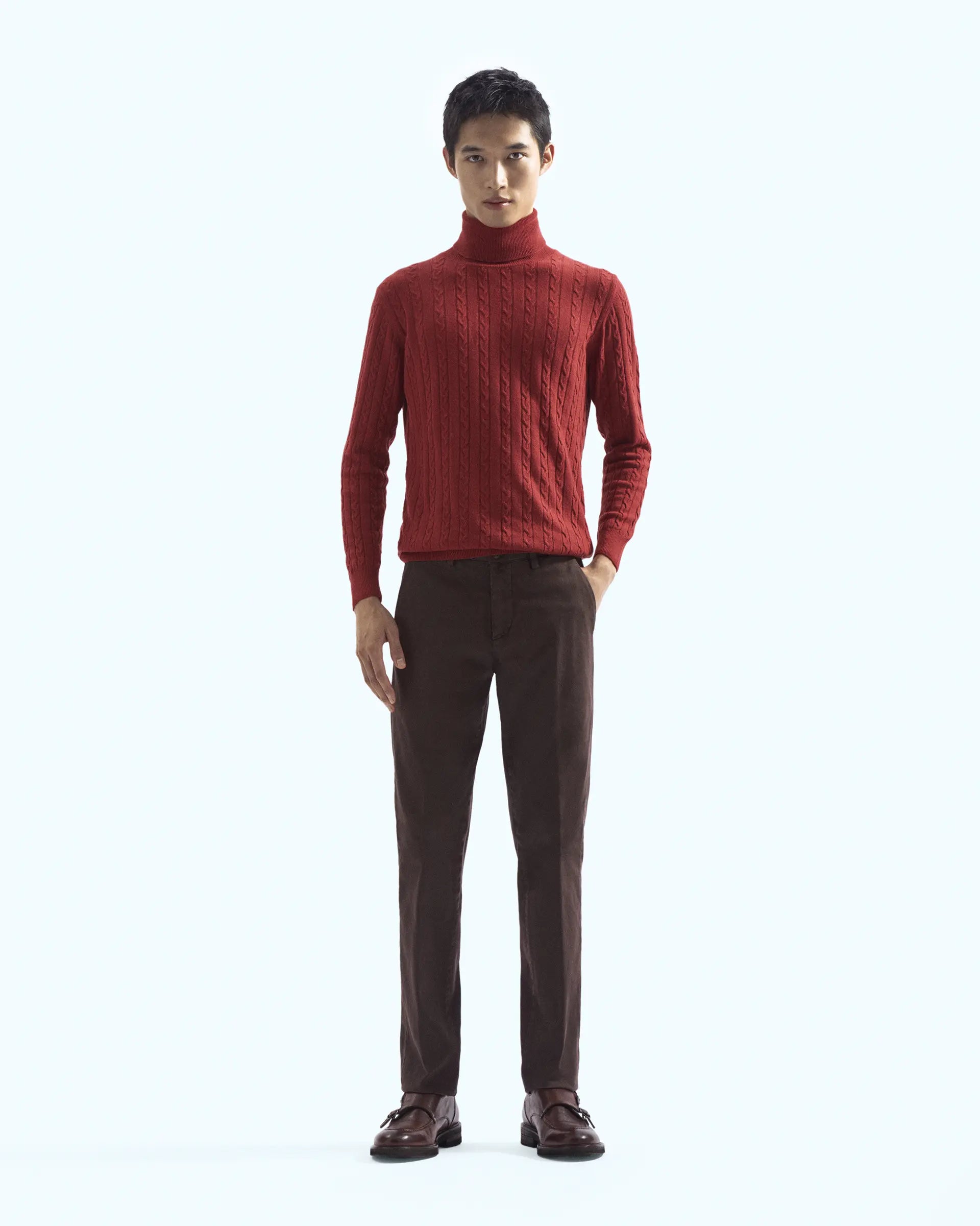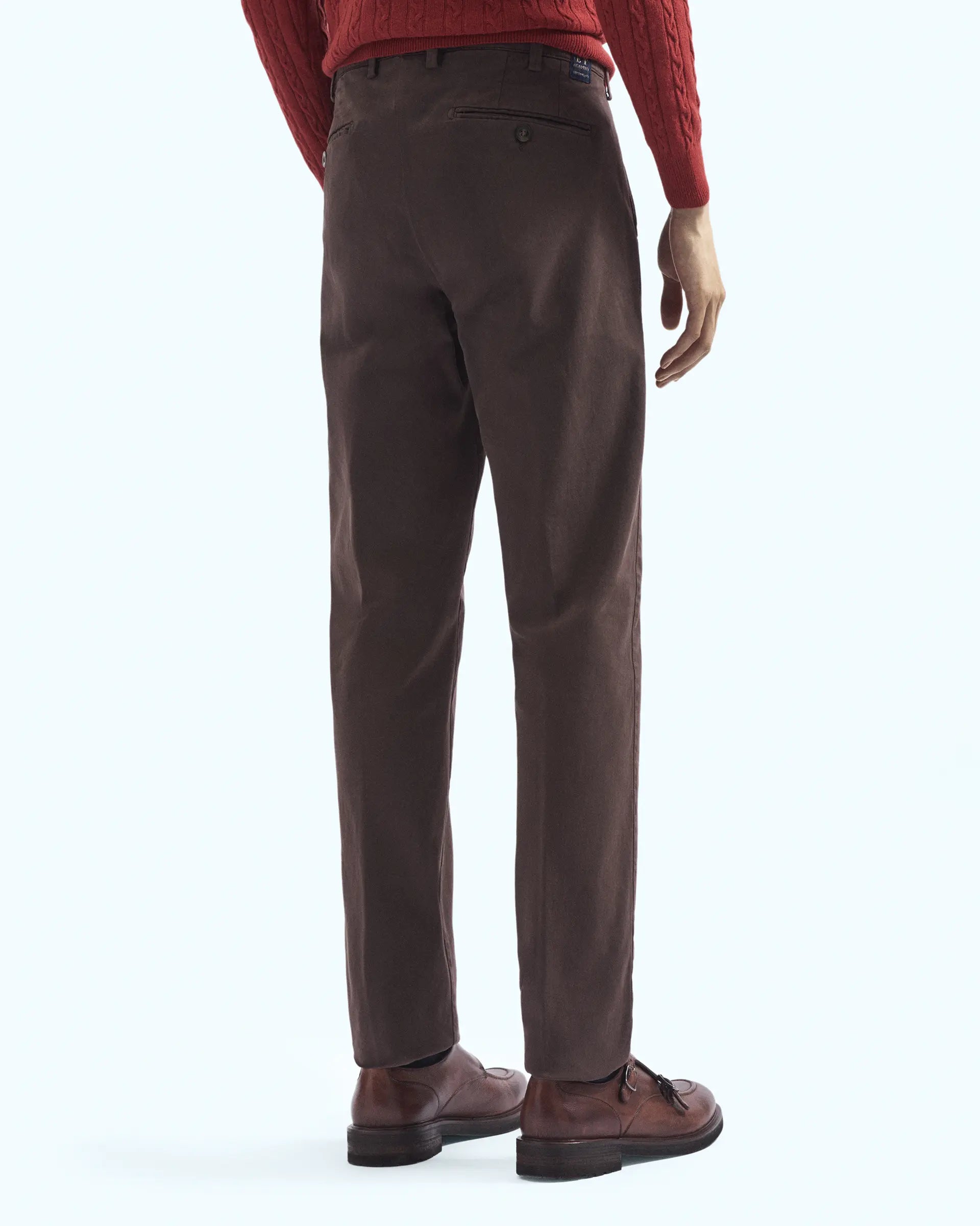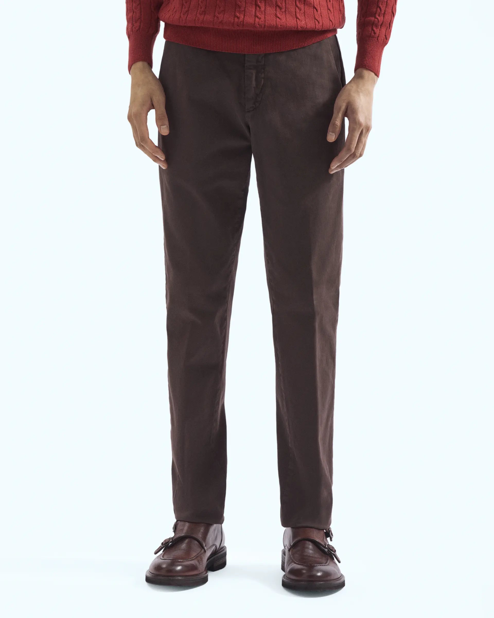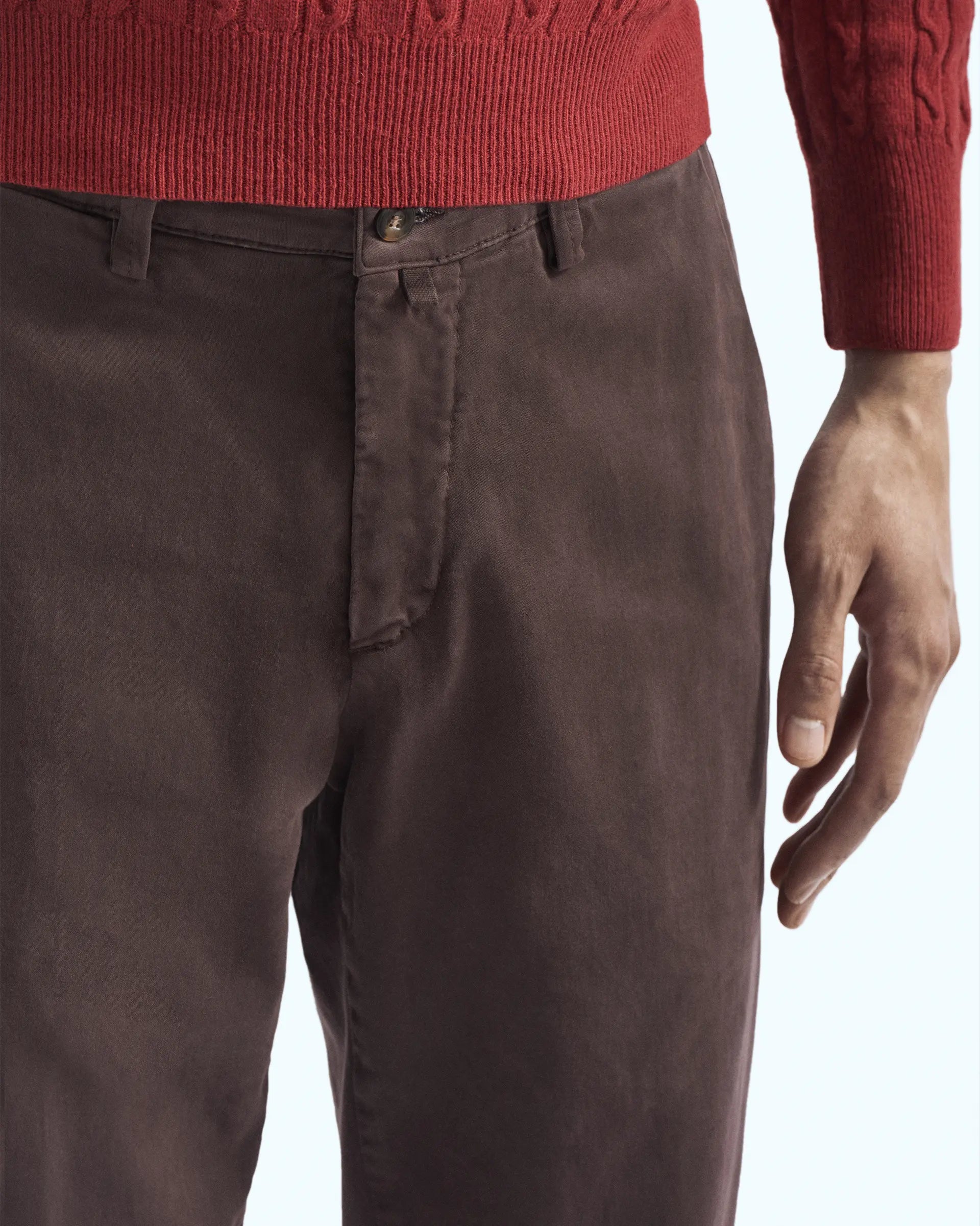 Chino trousers in stretch cotton presented in a delicate microcheck pattern which is enriched with a special garment dyeing technique. The comfortable, high-performance and casual style of the trousers combines with the typical British-inspired tailoring design to create an original and highly valuable garment.