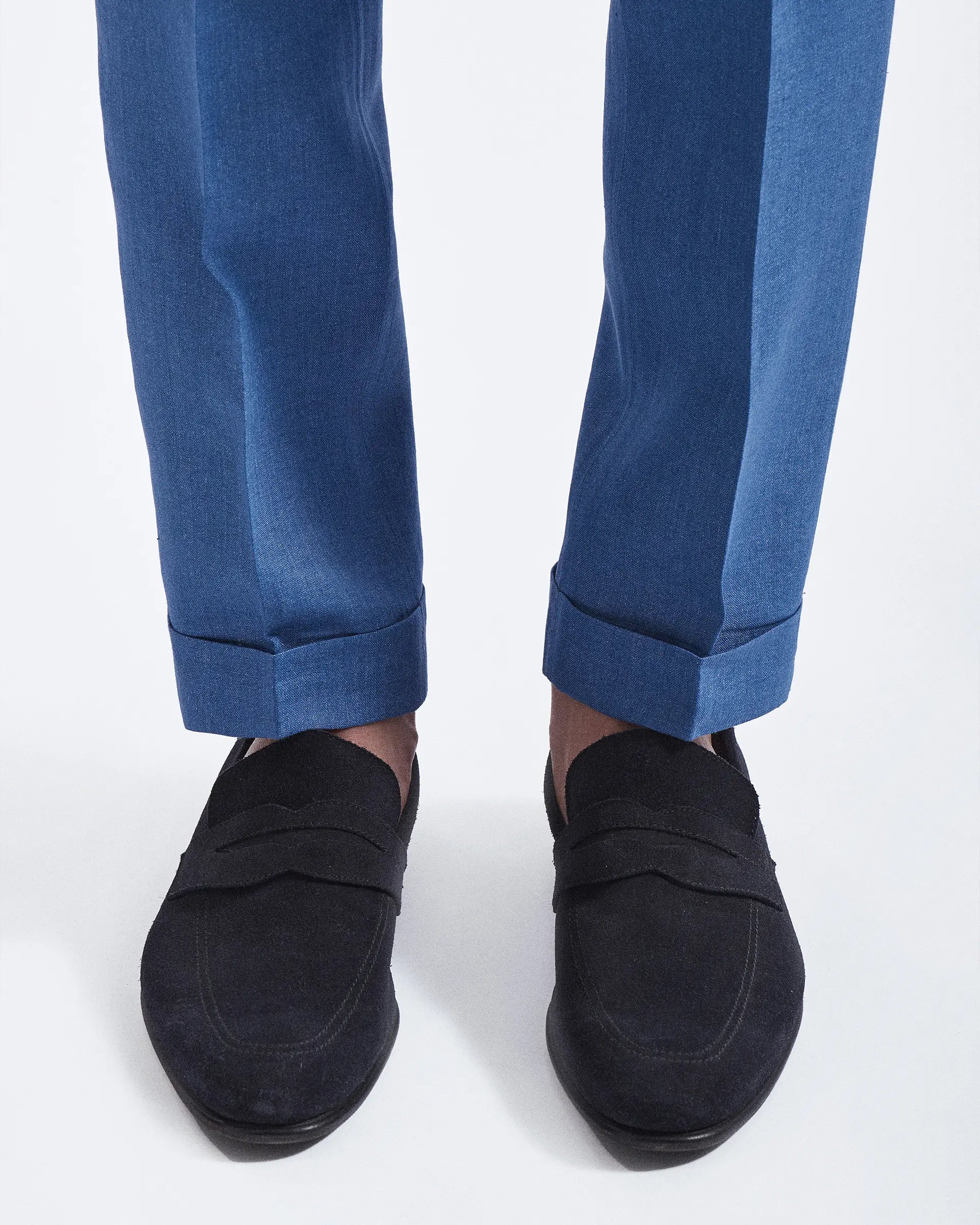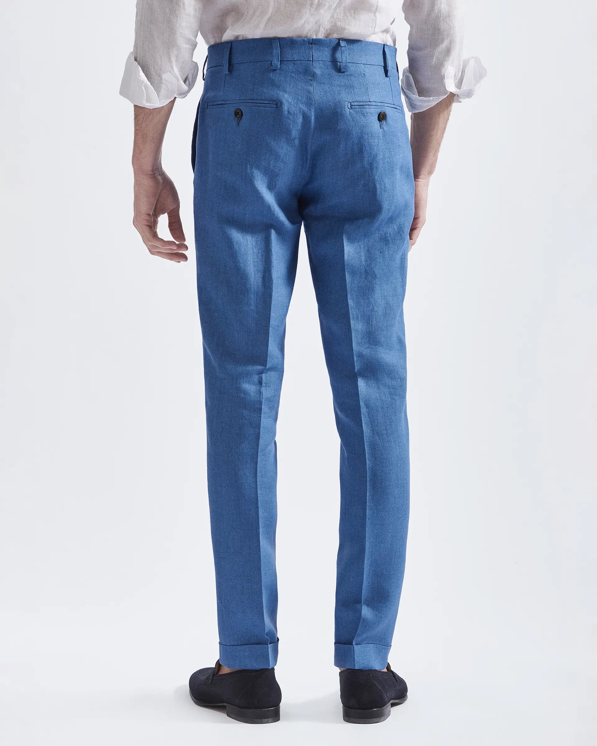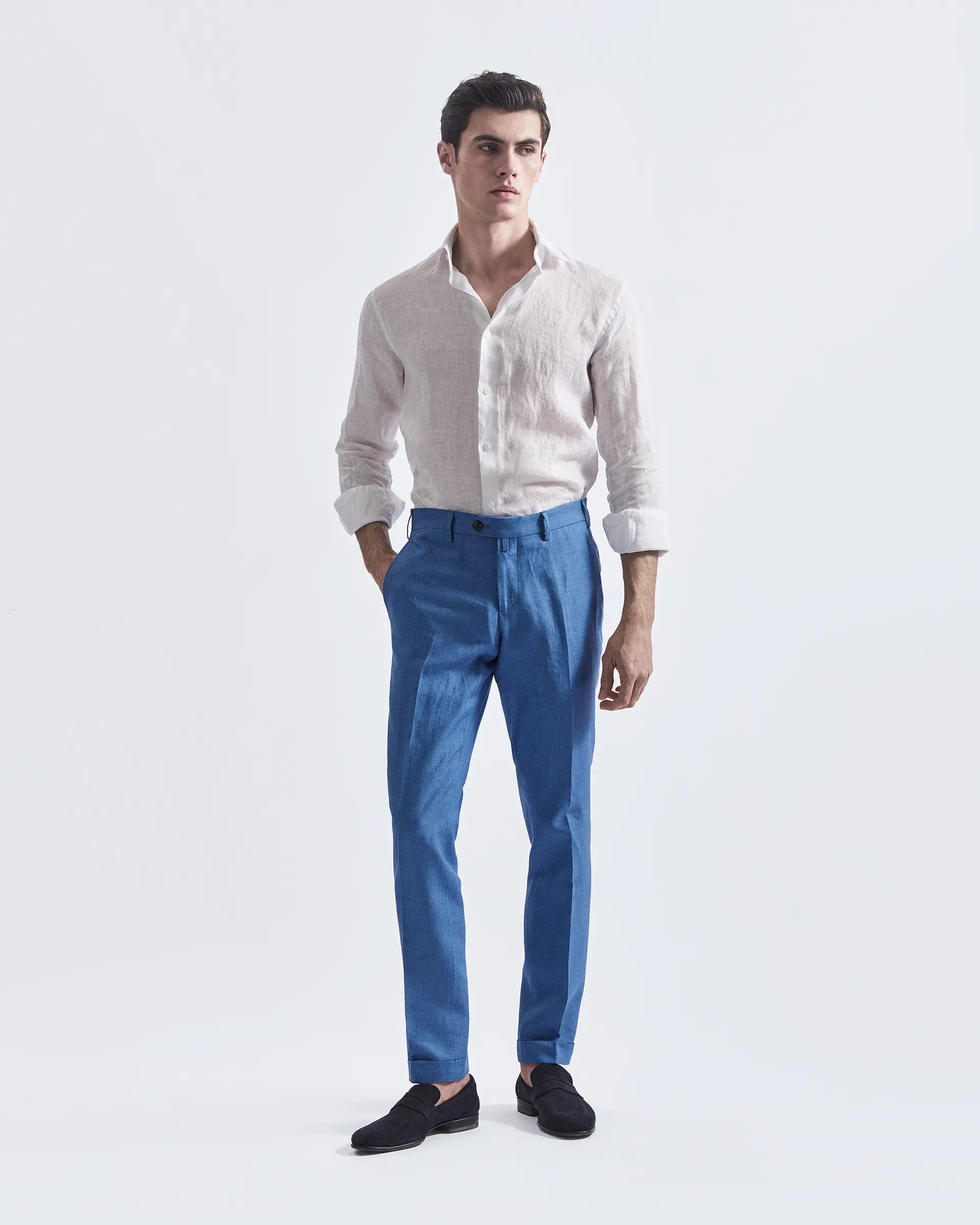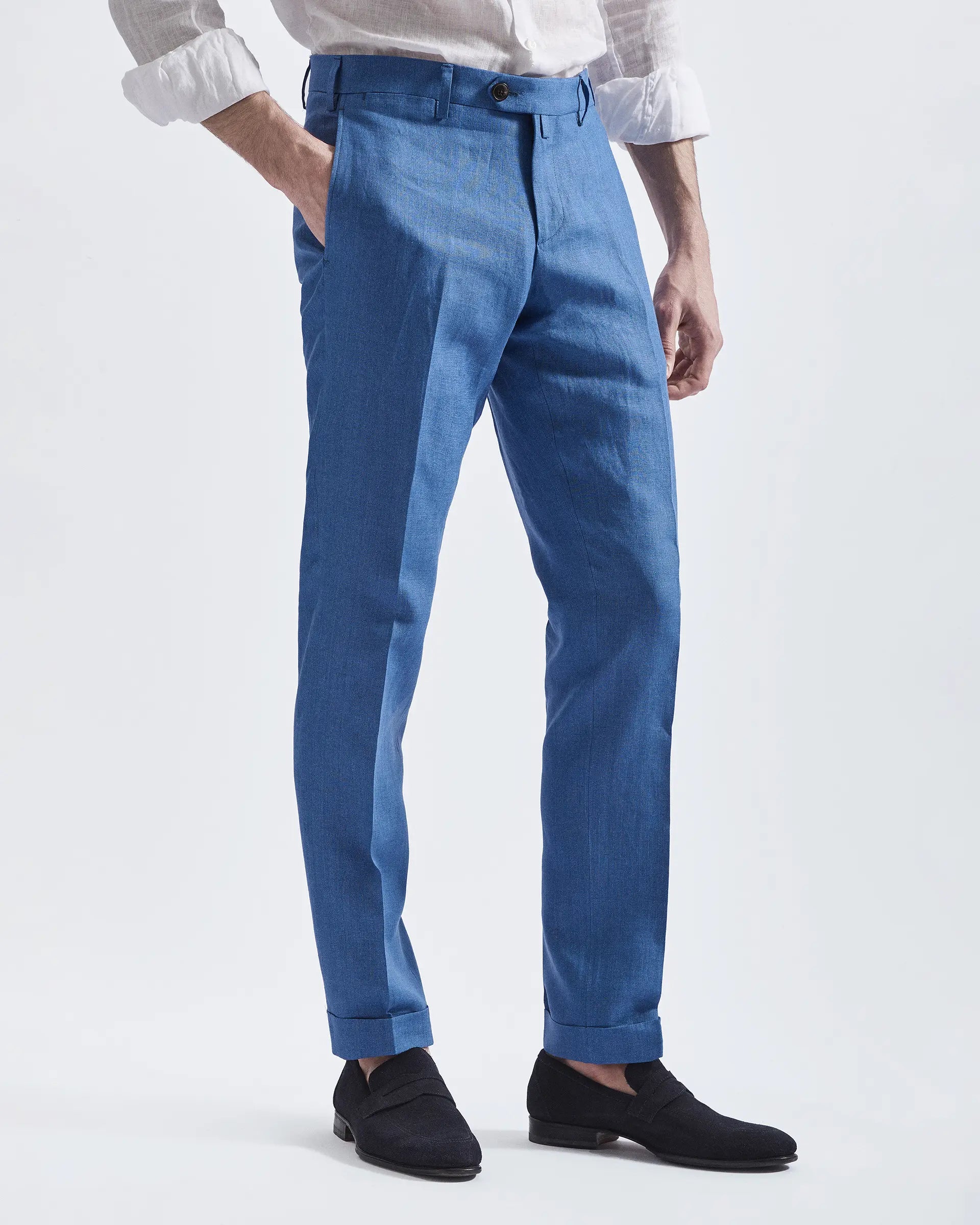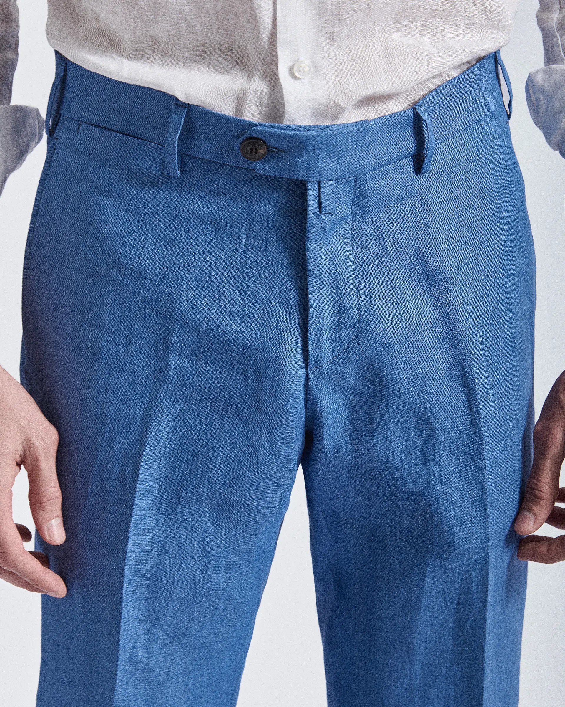 fabric a distinctive chromatic effect that enhances the freshness and lightness typical of the natural fibre. The refined details combined with the practical flat-stomach design give the trousers a refined touch and make them perfect on the hottest days