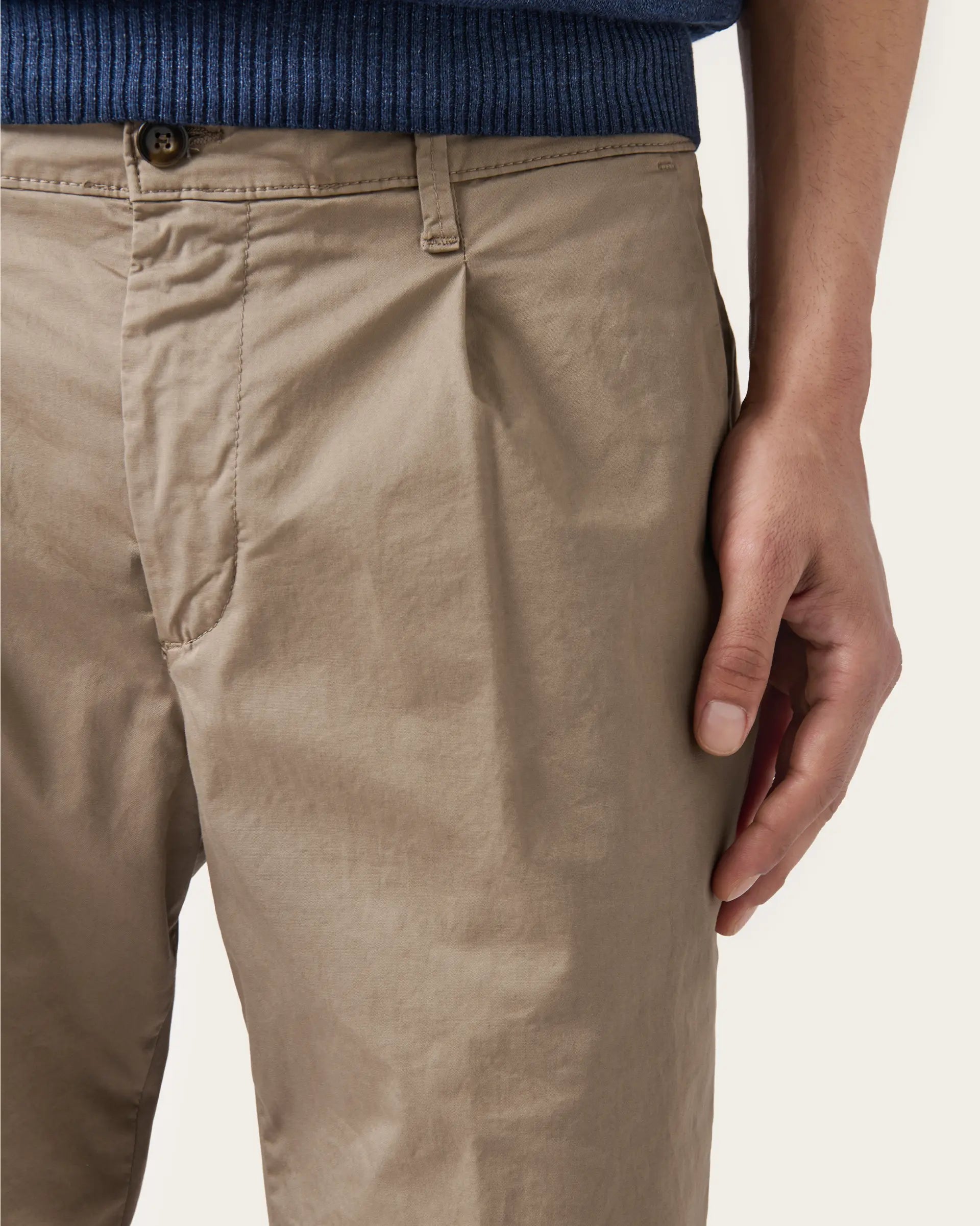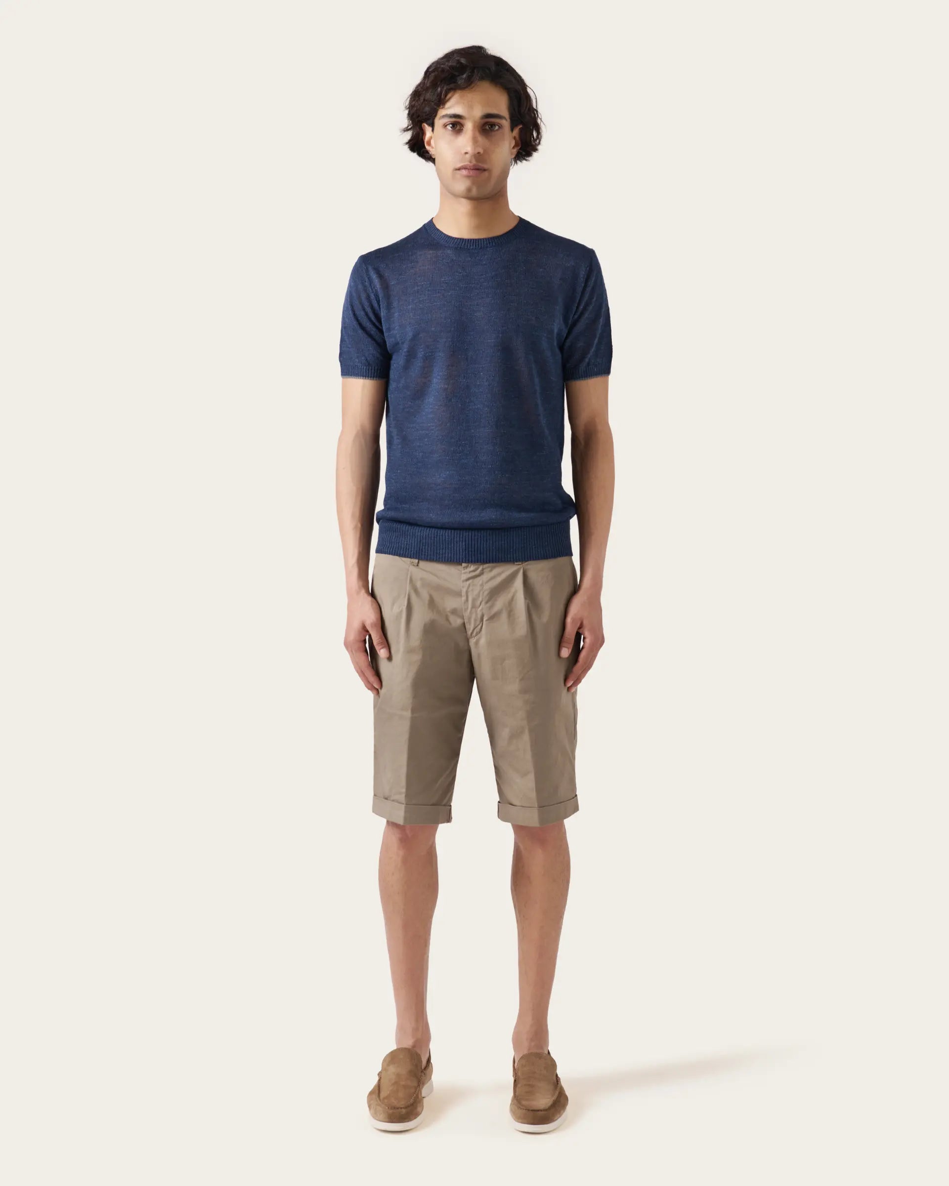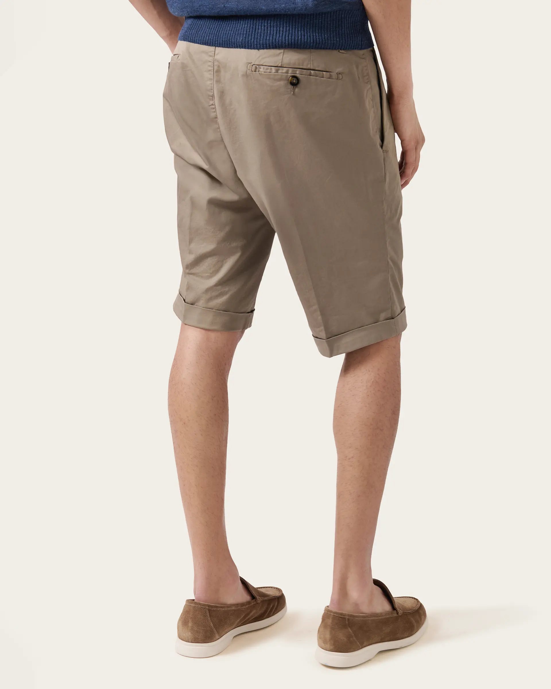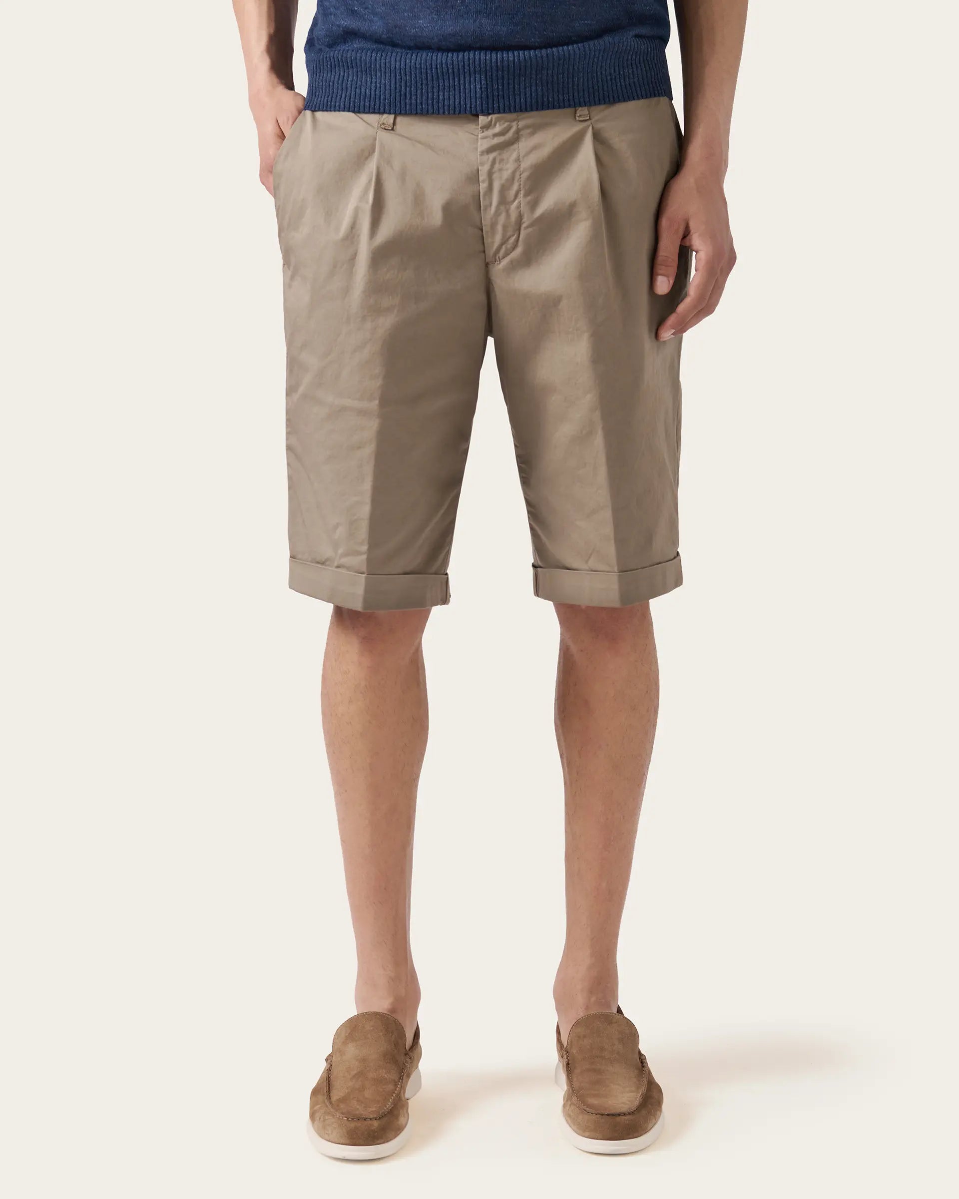 A versatile piece to best interpret your sporty look on hot summer days. Made of a light stretch cotton gabardine, it is presented in the version with pleats to guarantee superior comfort and to make you feel at ease without sacrificing style even in your free time or on holiday. The garment dyeing characterizes the seasonal color nuances while the relaxed volumes accompany the informal attitude of the piece.