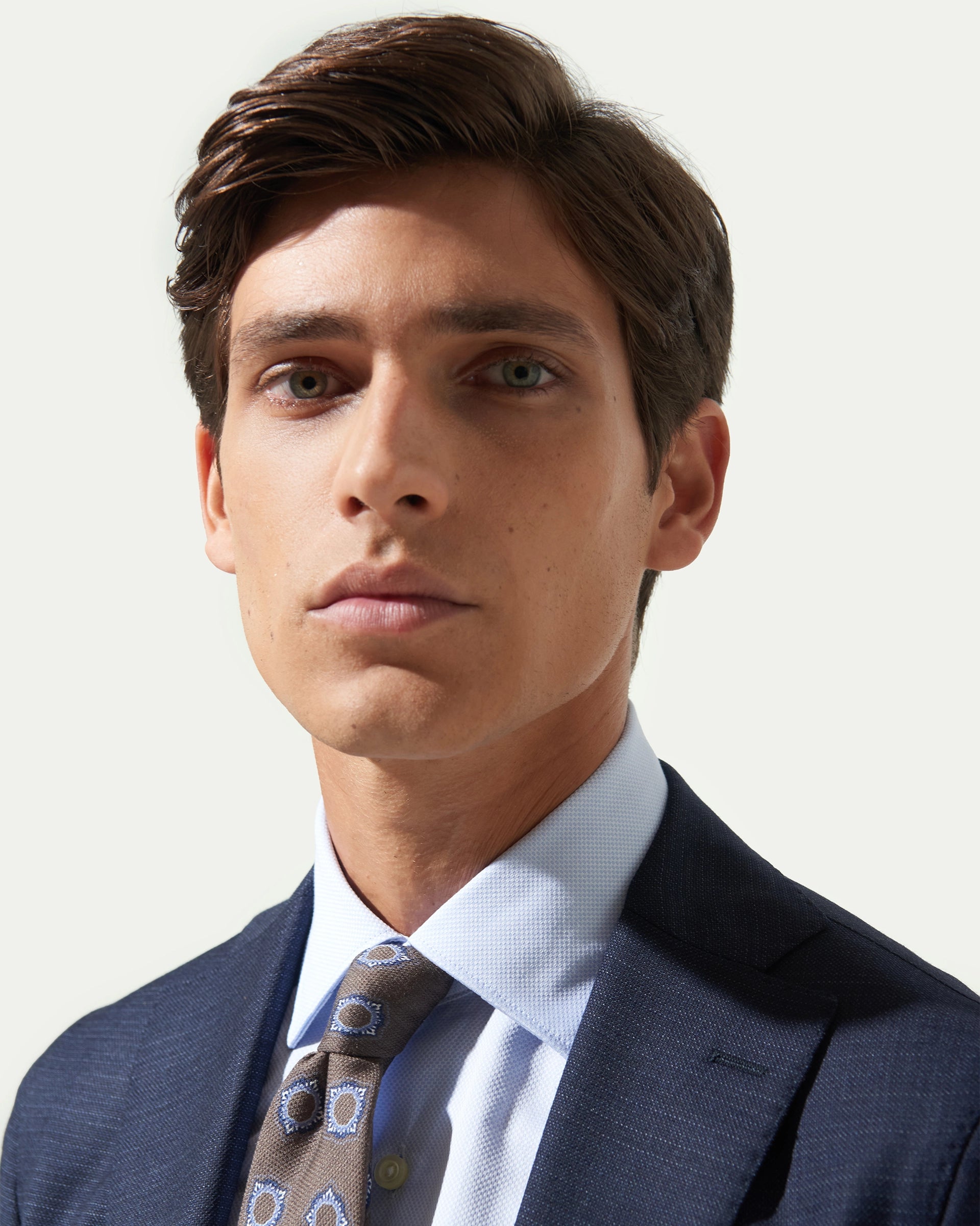 A suit with a strong sartorial accent, crafted in a contrasting pinstripe pattern that adds vivacity to a timeless classic. A men's wardrobe essential, customizable to suit your style. The lined jacket, paired with flat-front trousers, creates a perfect balance of shape and volume. The refined details complete this extremely versatile and impeccable suit.