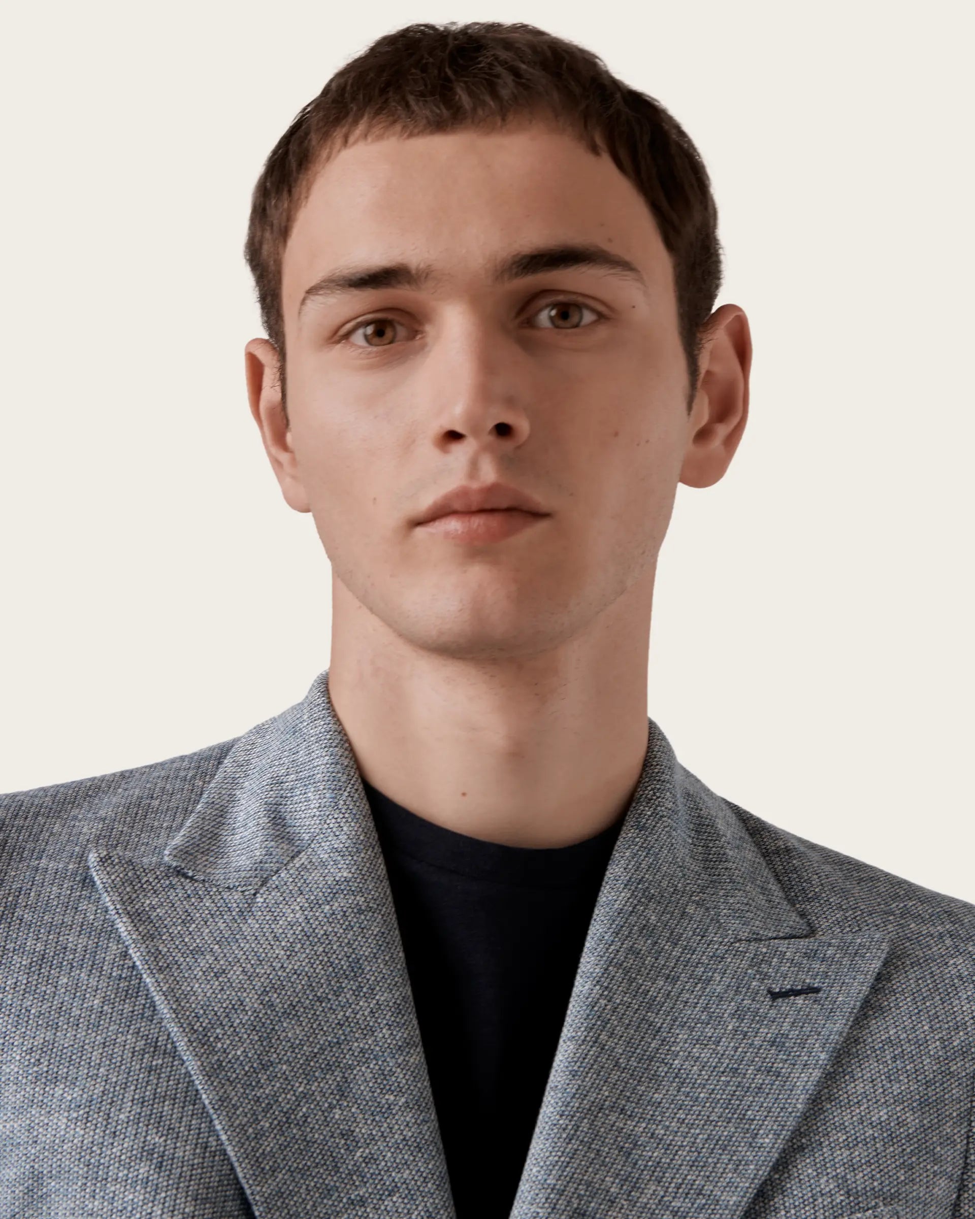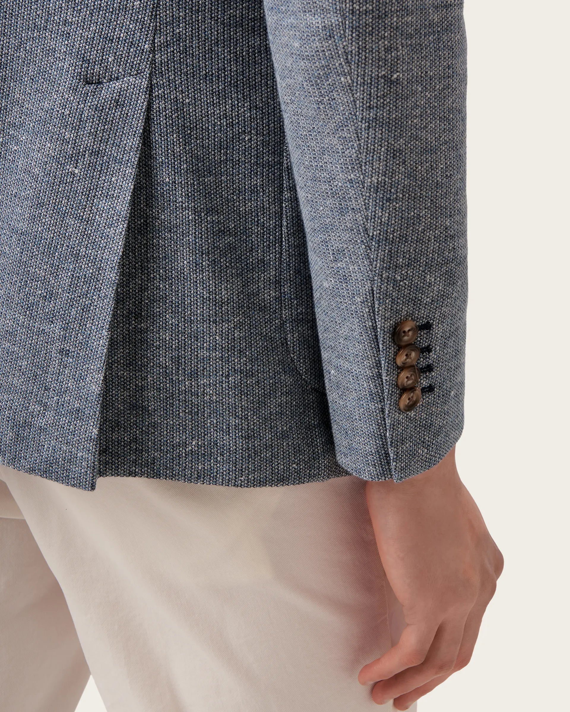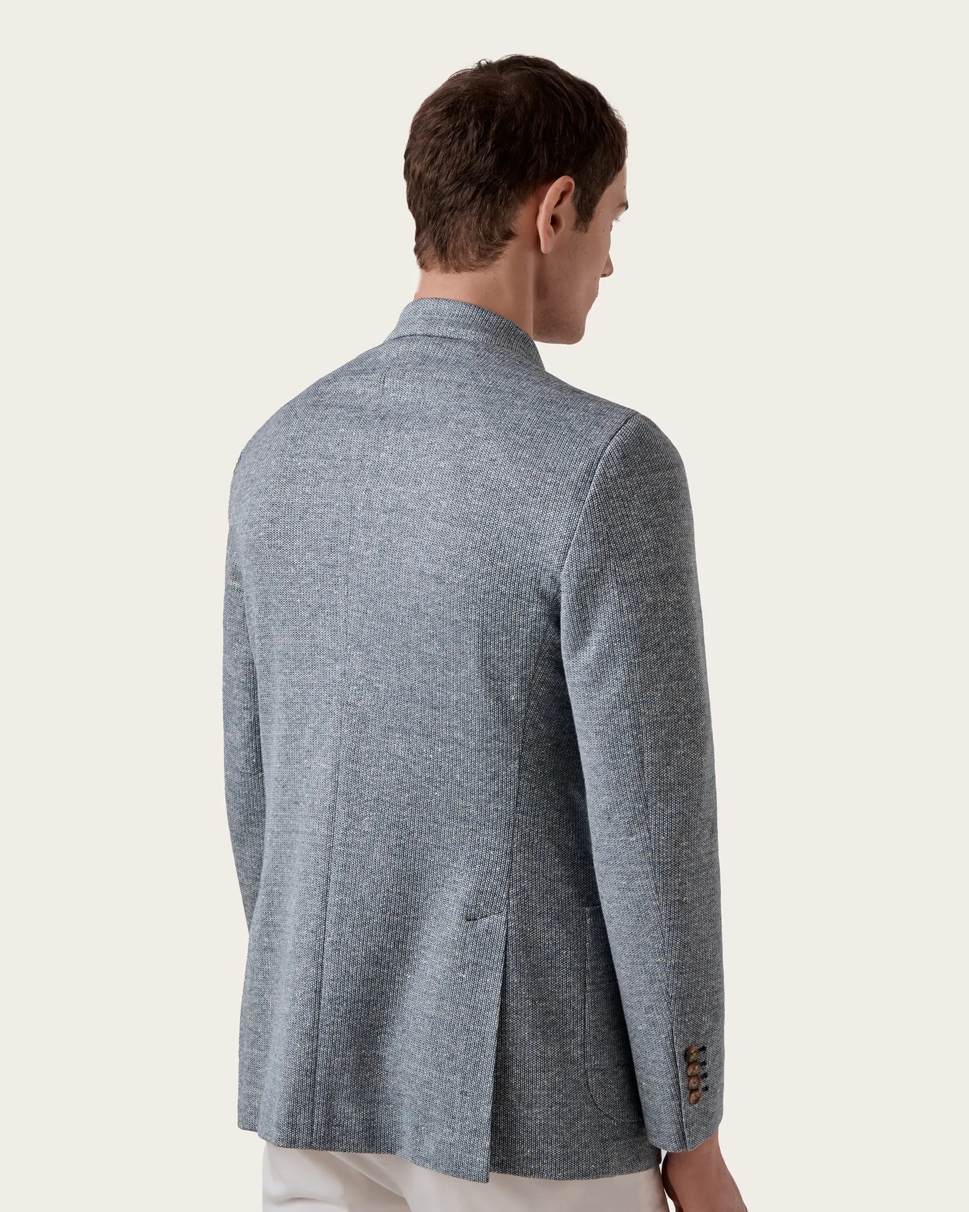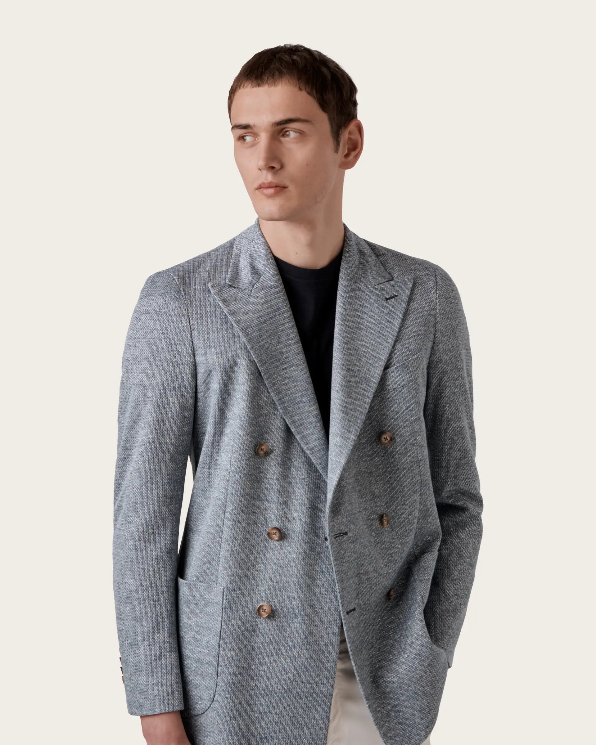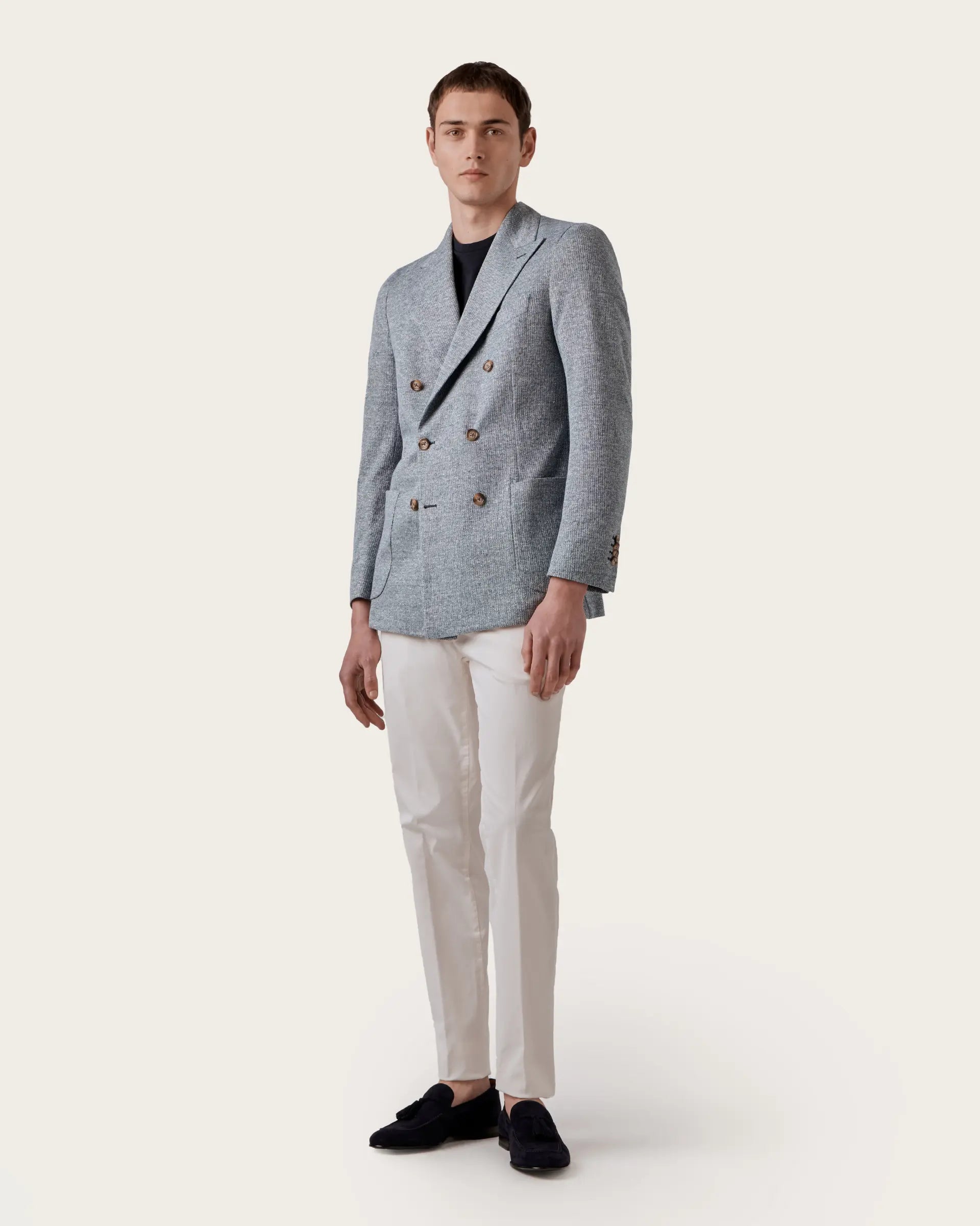 Unlined double-breasted jacket made of linen and cotton in a classic seasonal nuance. The soft fabric and tricot-effect workmanship guarantee maximum comfort, enhancing the tailored and deconstructed look in contrast with the idea of ??the formal model. The peak lapels and patch pockets reconcile modernity with the charm of the timeless garment.