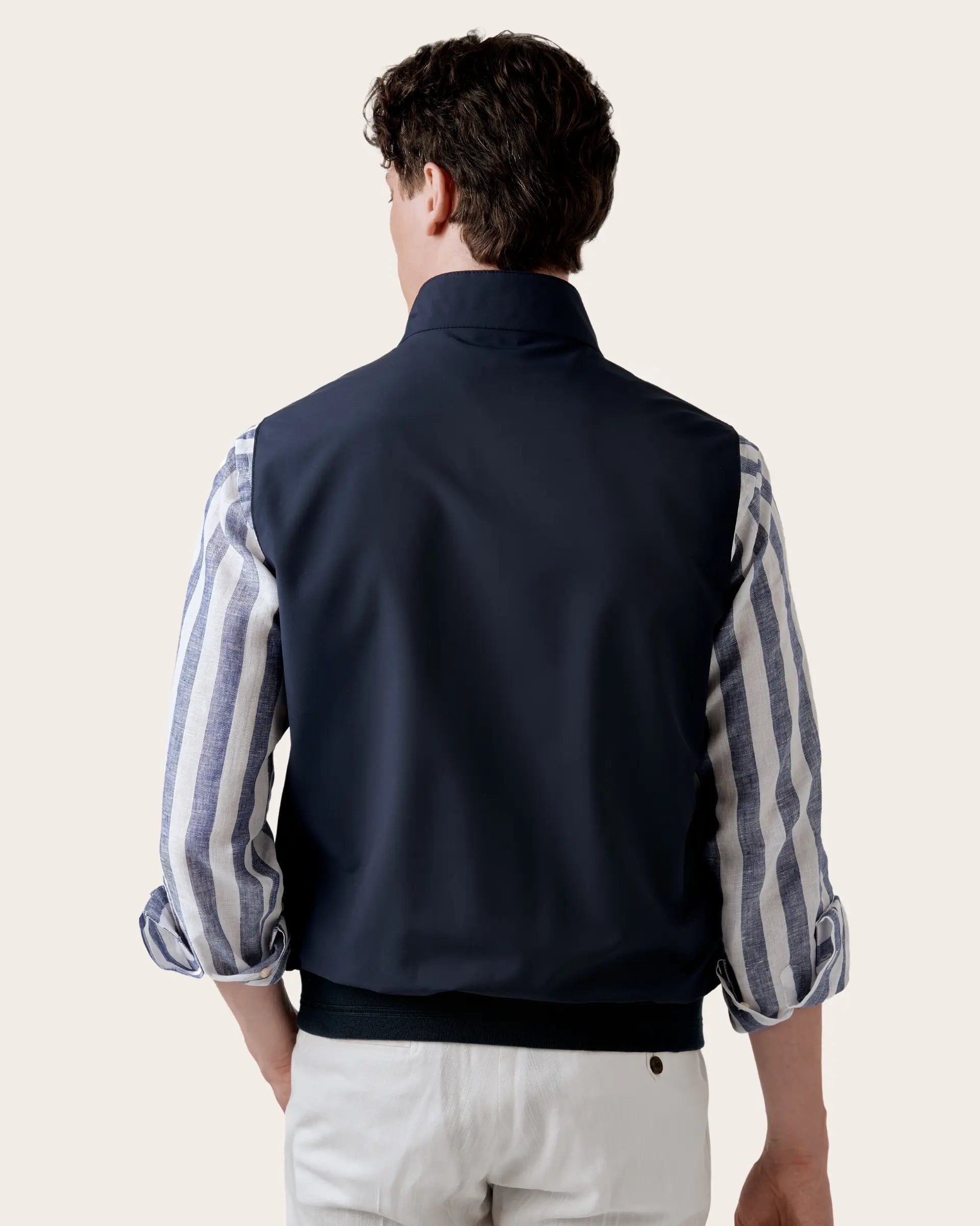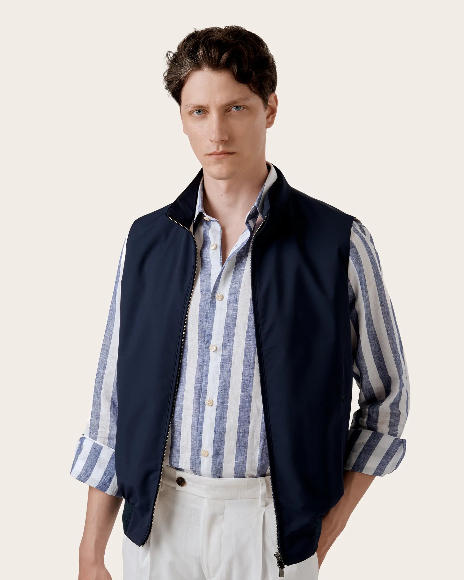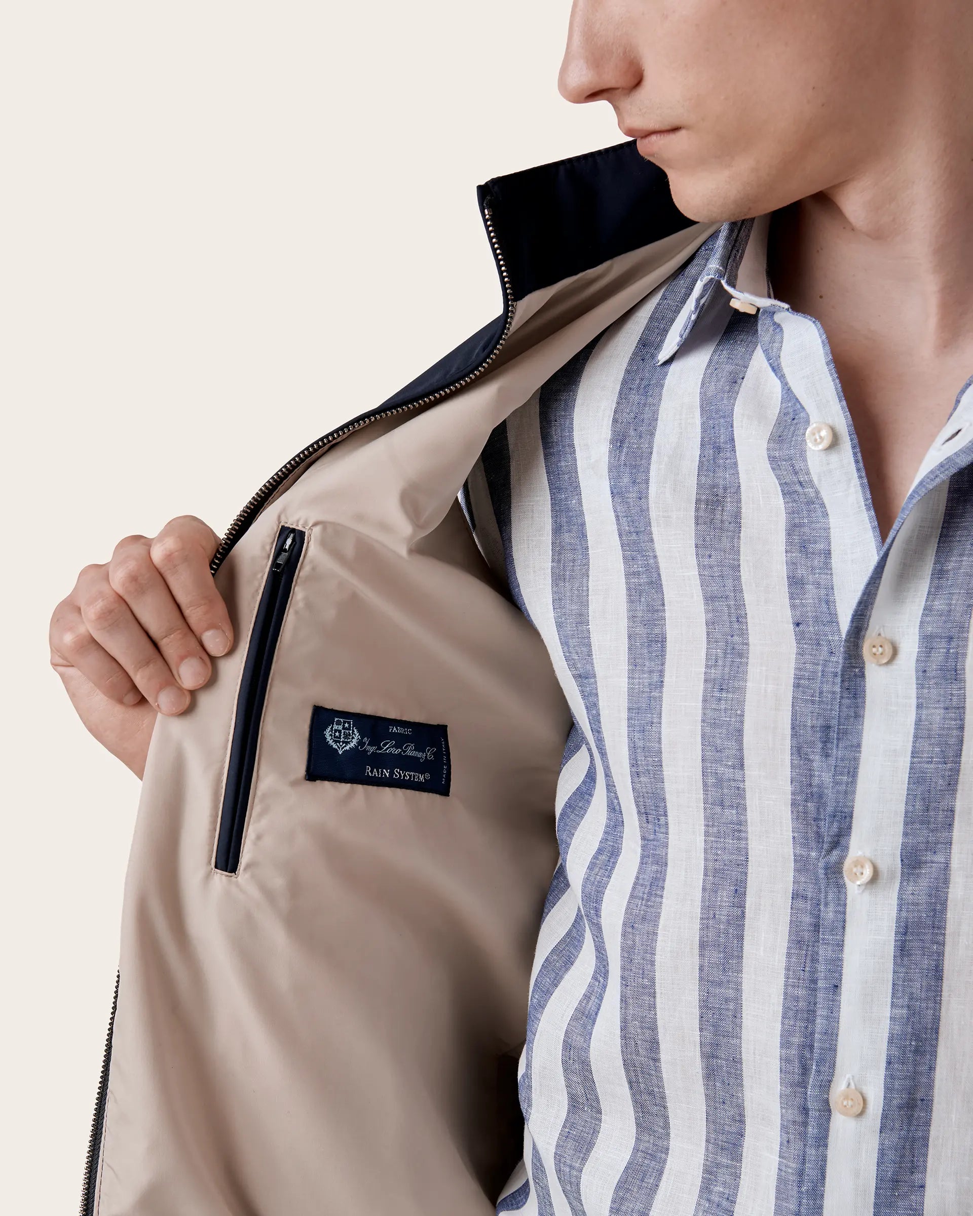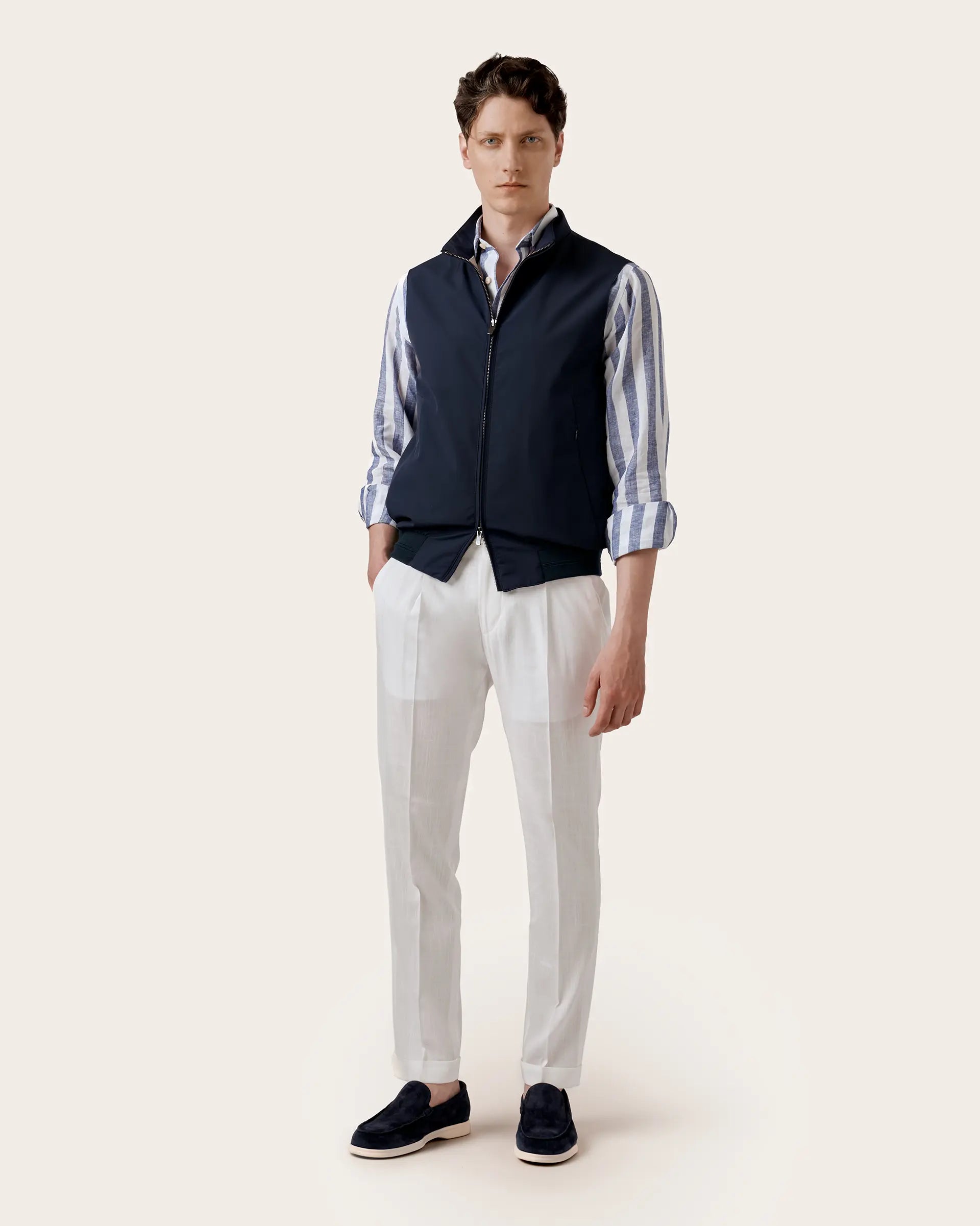 Outdoor garment with a sporty mood embellished with high-quality breathable and water-repellent fabric from the Loro Piana wool mill with a light lining in technical fabric. Made in a versatile and timeless color, it is enhanced by refined details such as the double-slider zip and the slanted pockets with concealed zips. The contrasting details make it perfect for the metropolitan look and for refined layering.