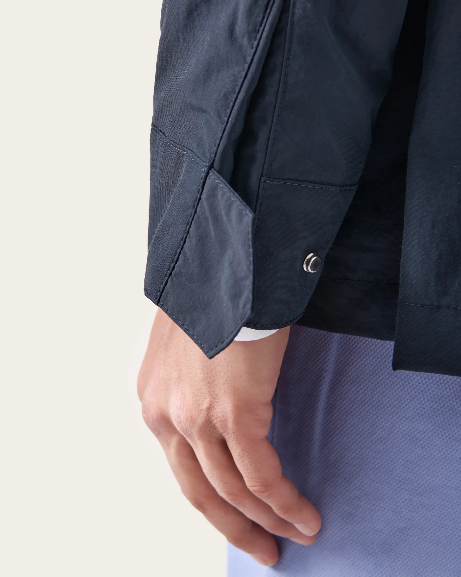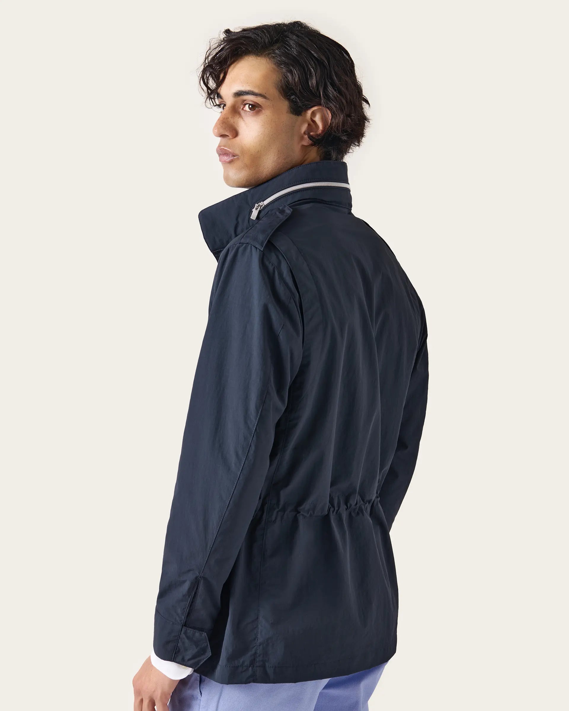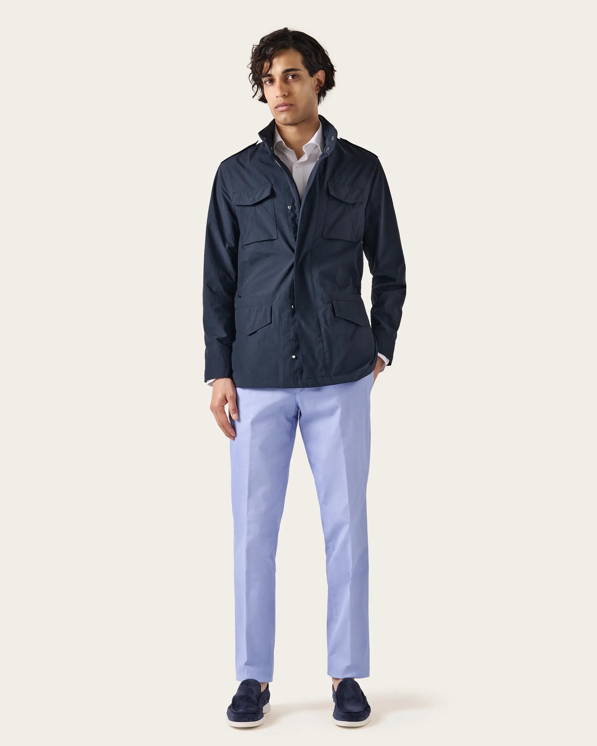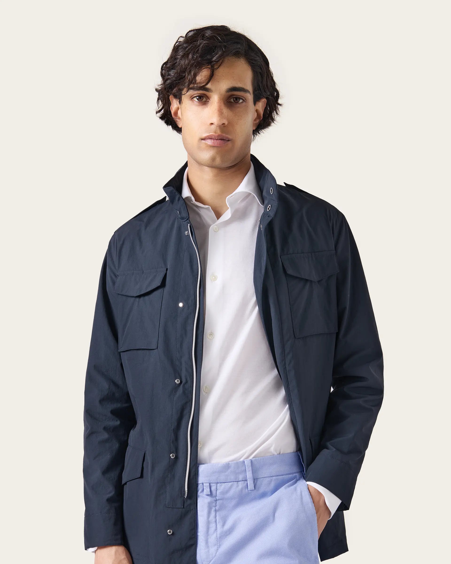 Multi-pocket field jacket made of cotton gabardine made unique by the water-repellent and windproof treatment that characterizes Olmetex fabrics. A classic of outdoor adventures that becomes an essential of the metropolitan wardrobe because it combines a functional construction with fine materials. It is completed with practical pockets, a concealed rain hood and an internal drawstring at the waist to adjust the fit.