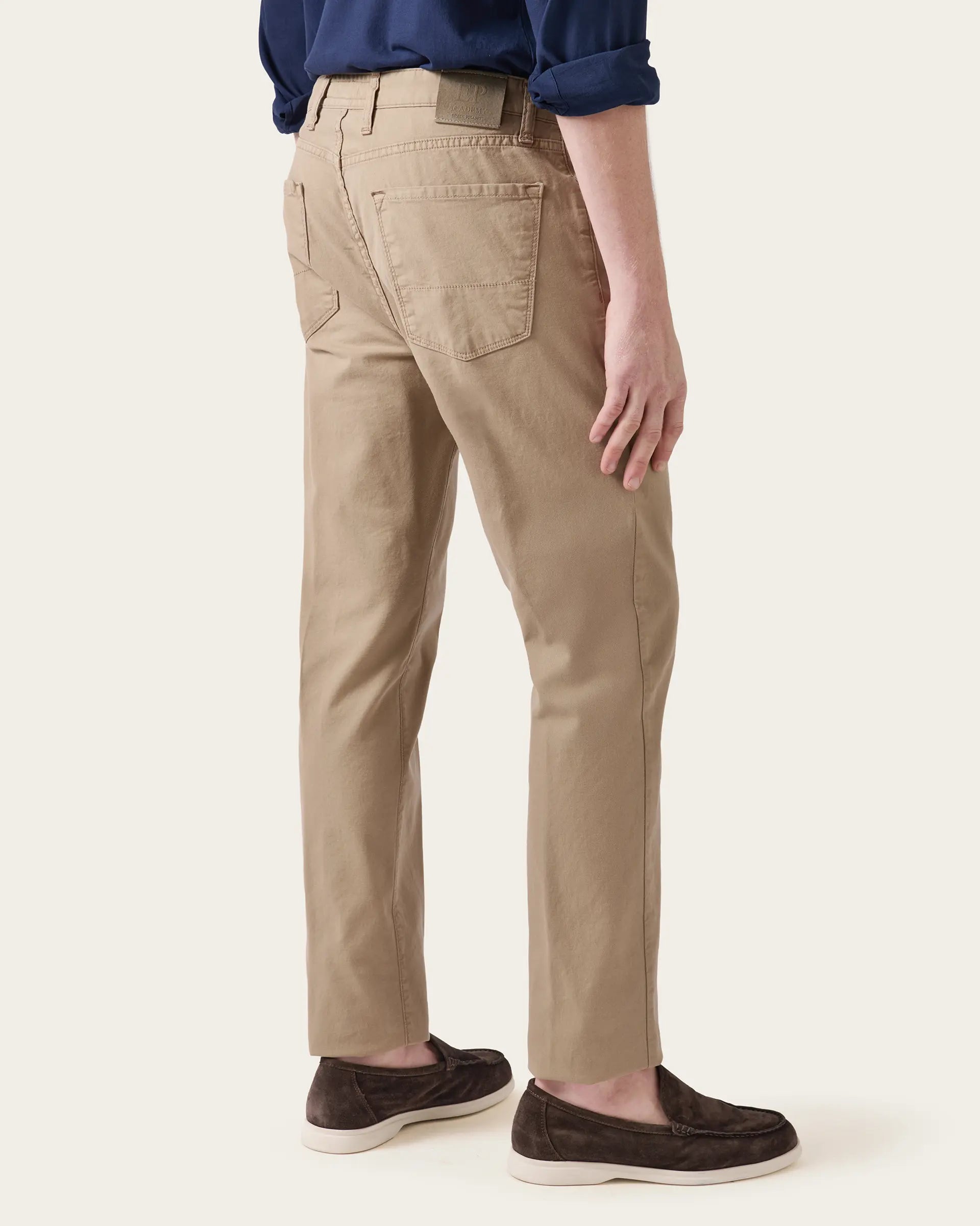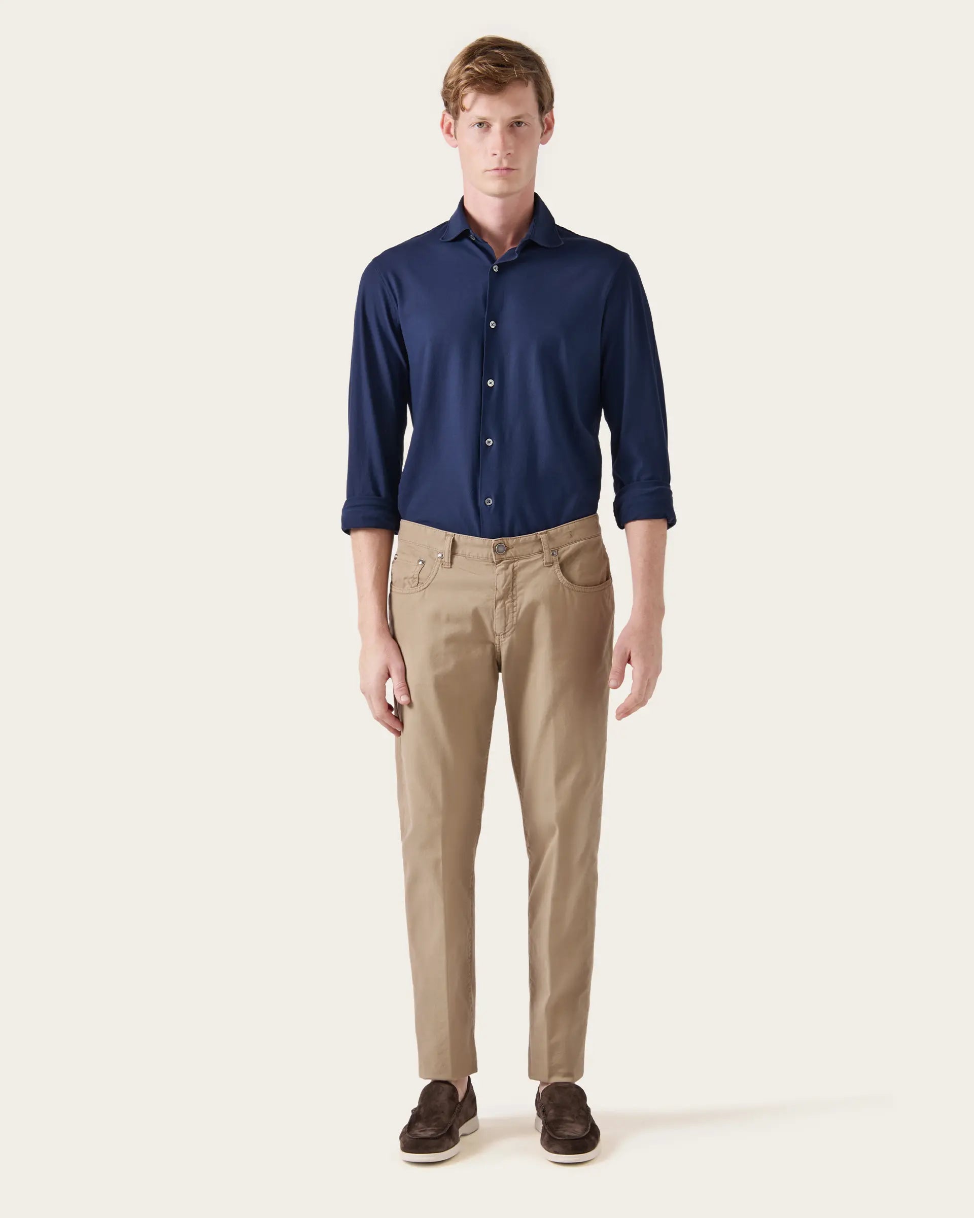 The informal and sporty character of the five-pocket trousers is enriched by the value and charm of sartorial care. The structure of the fabric guarantees the garment a high resistance to wear and washing while the garment dyeing process guarantees unique shades of color and gives softness to the trousers. The 5-pocket trousers are the essential garment with which to create infinite combinations of outfits ranging from refined sporty to a gritty classic with strong style characteristics.